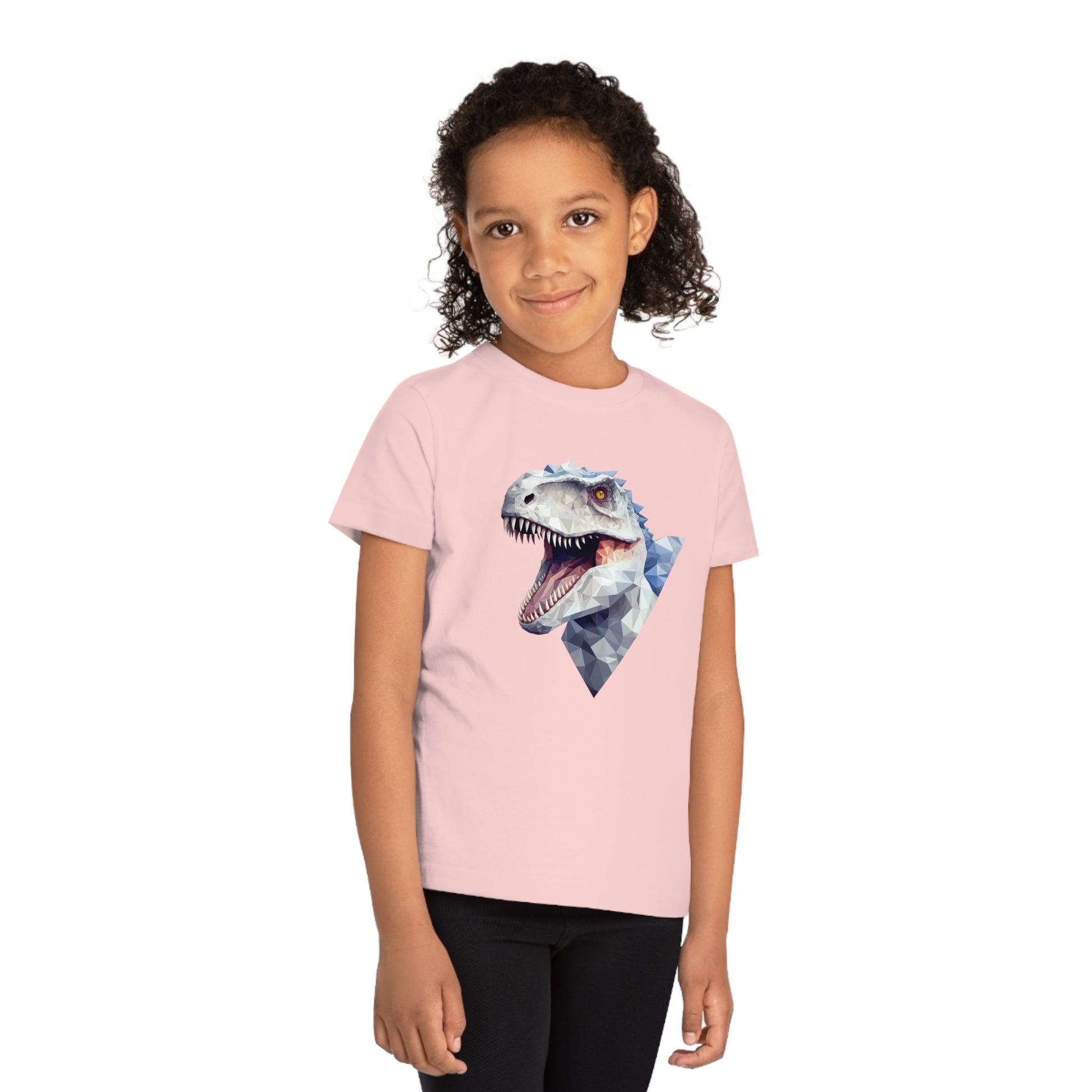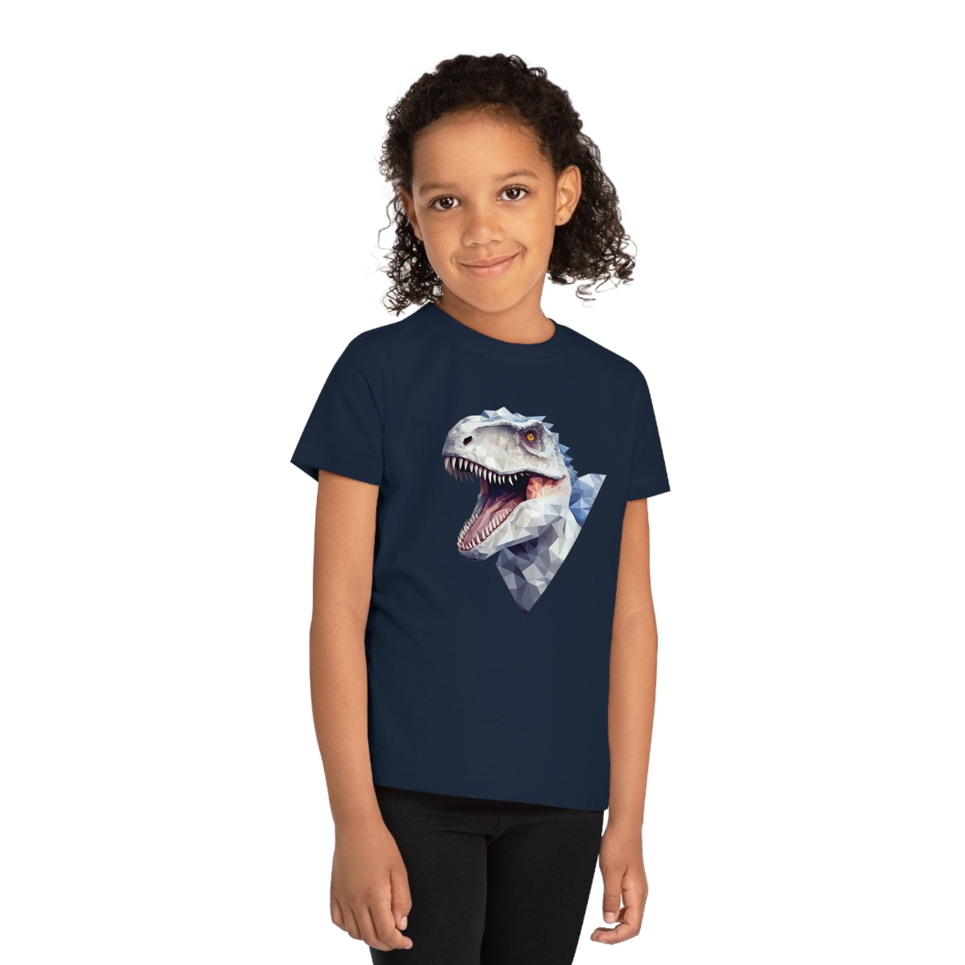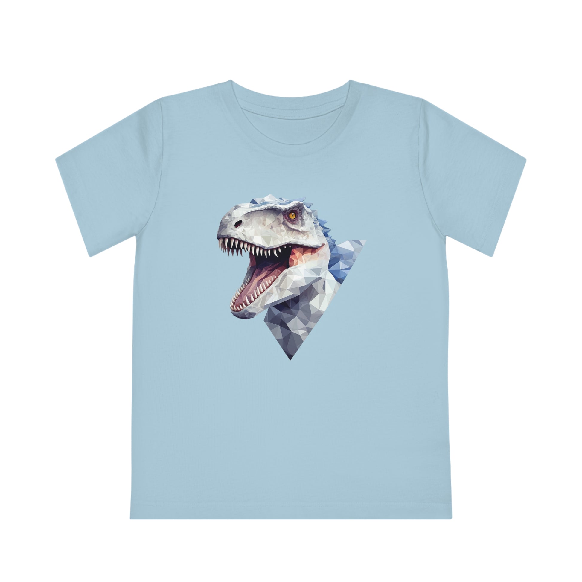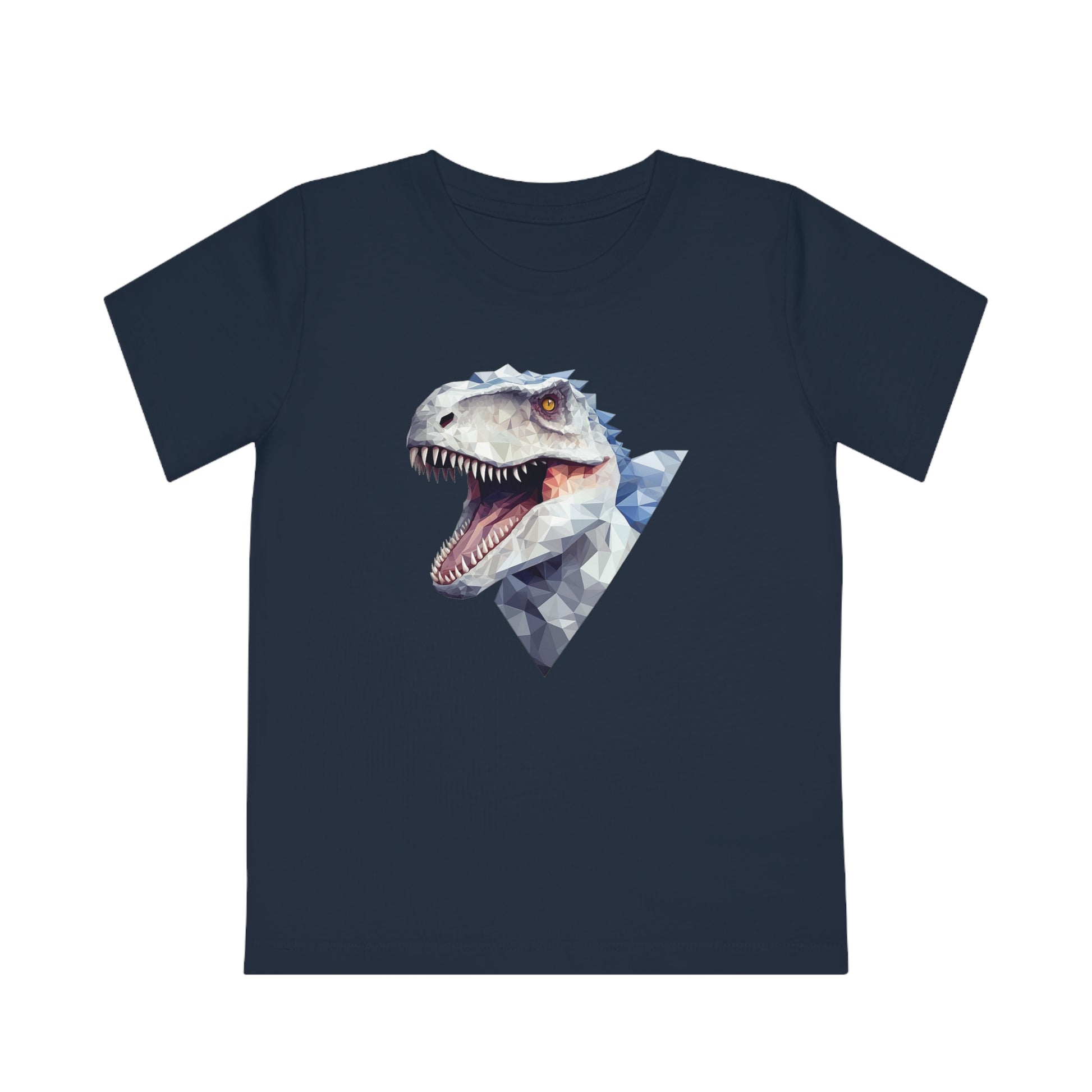 Keywords: Indominus Rex kids t-shirt, polygonal geometric style, eco-friendly materials, Jurassic adventure, fierce design, unique style, dinosaur fan, sustainable fashion.