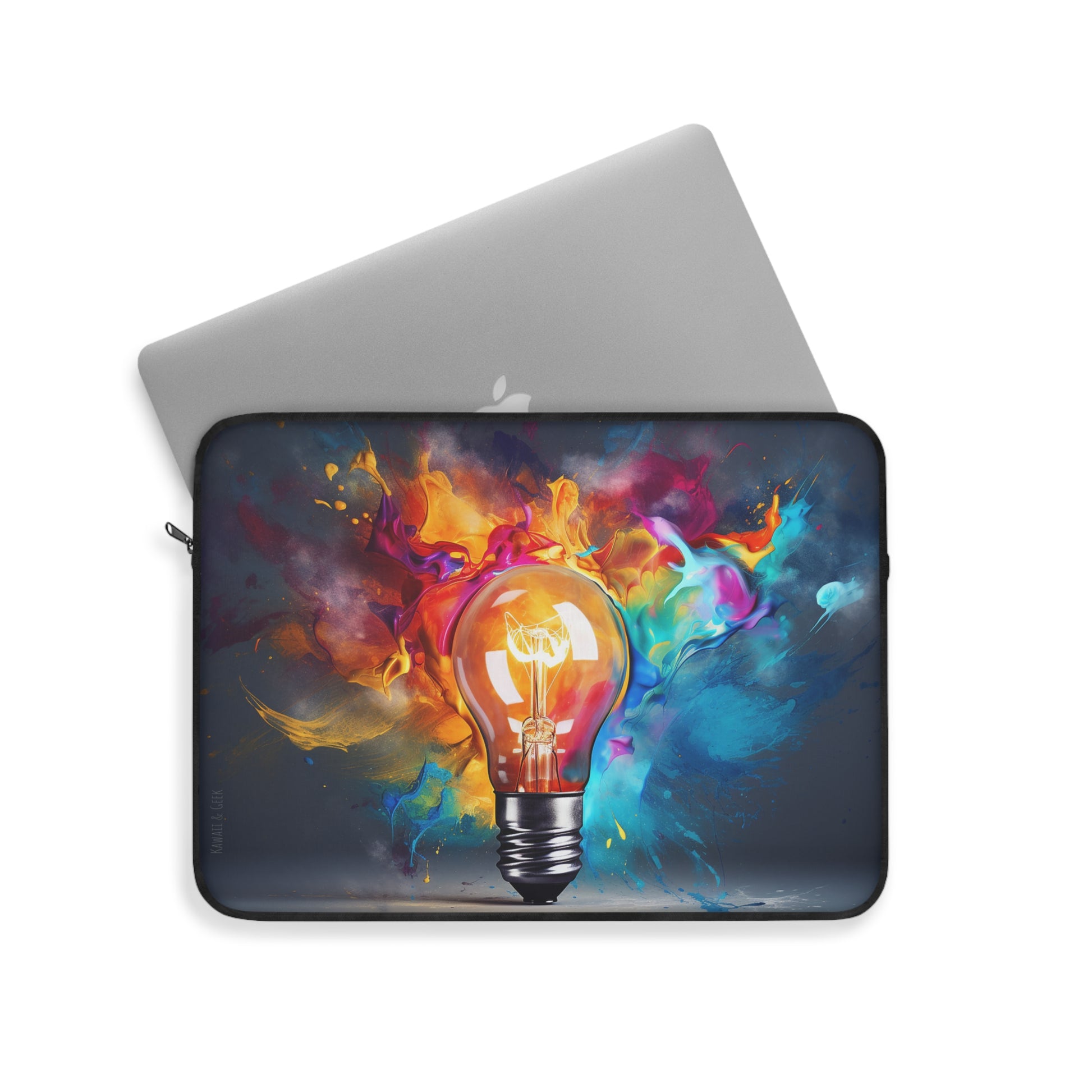 Lightbulb Design, Paint Explosion, Innovative Sleeve, Color Burst, Creativity Cover, Eureka Moment, Idea Symbol, Laptop Protection, Artistic Design, Tech Accessory, Brilliant Idea, Colorful Cover, Painted Lightbulb.