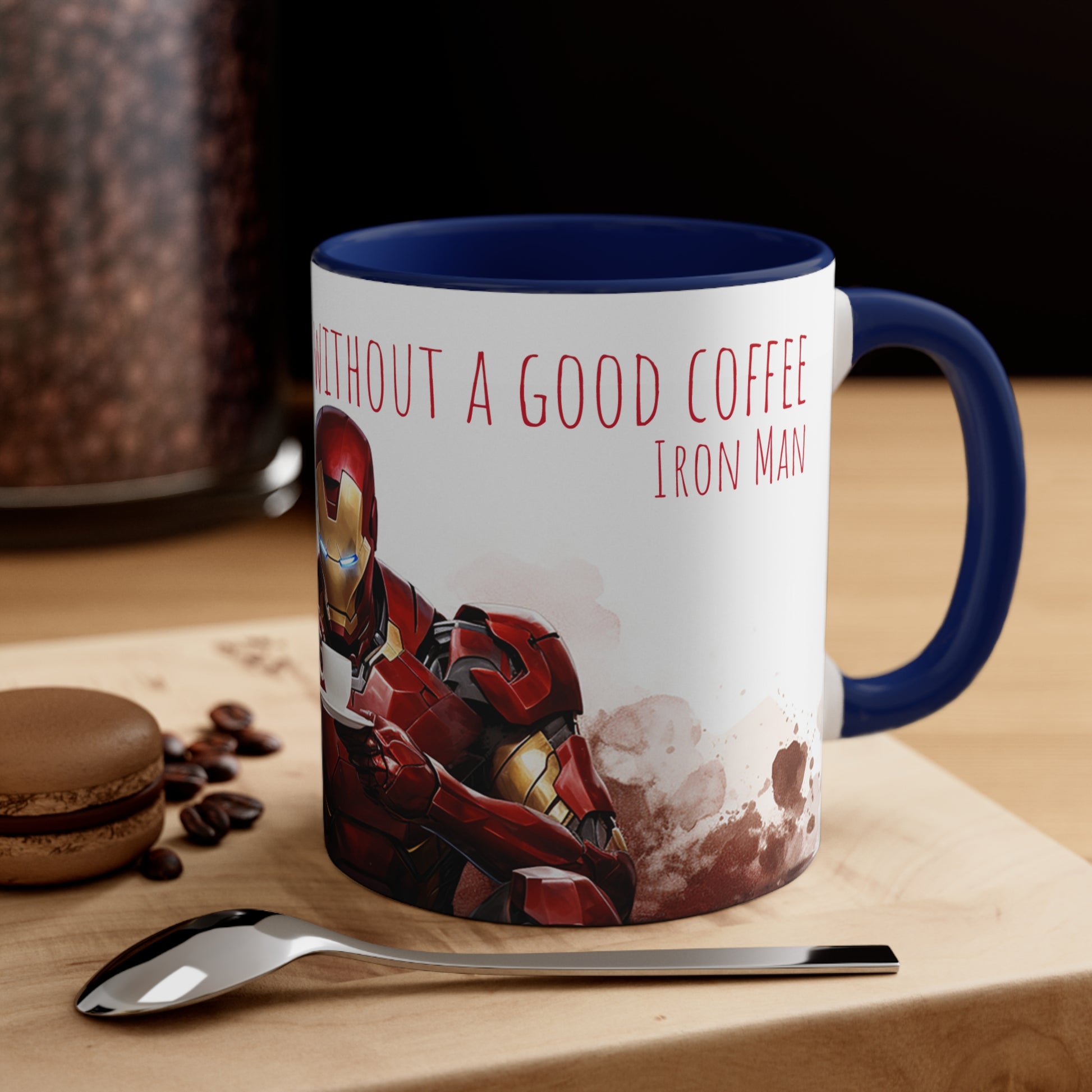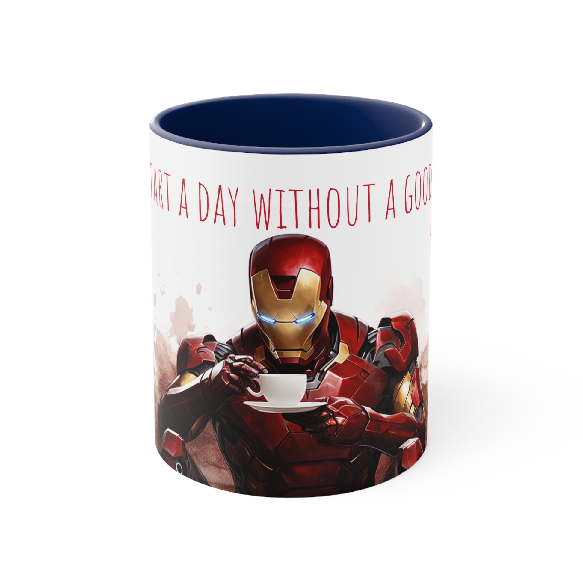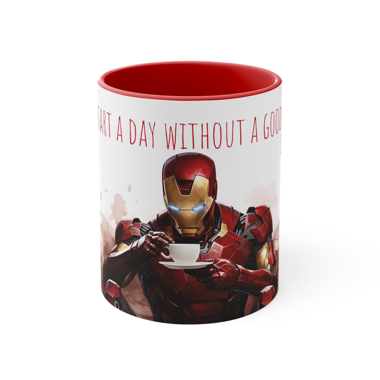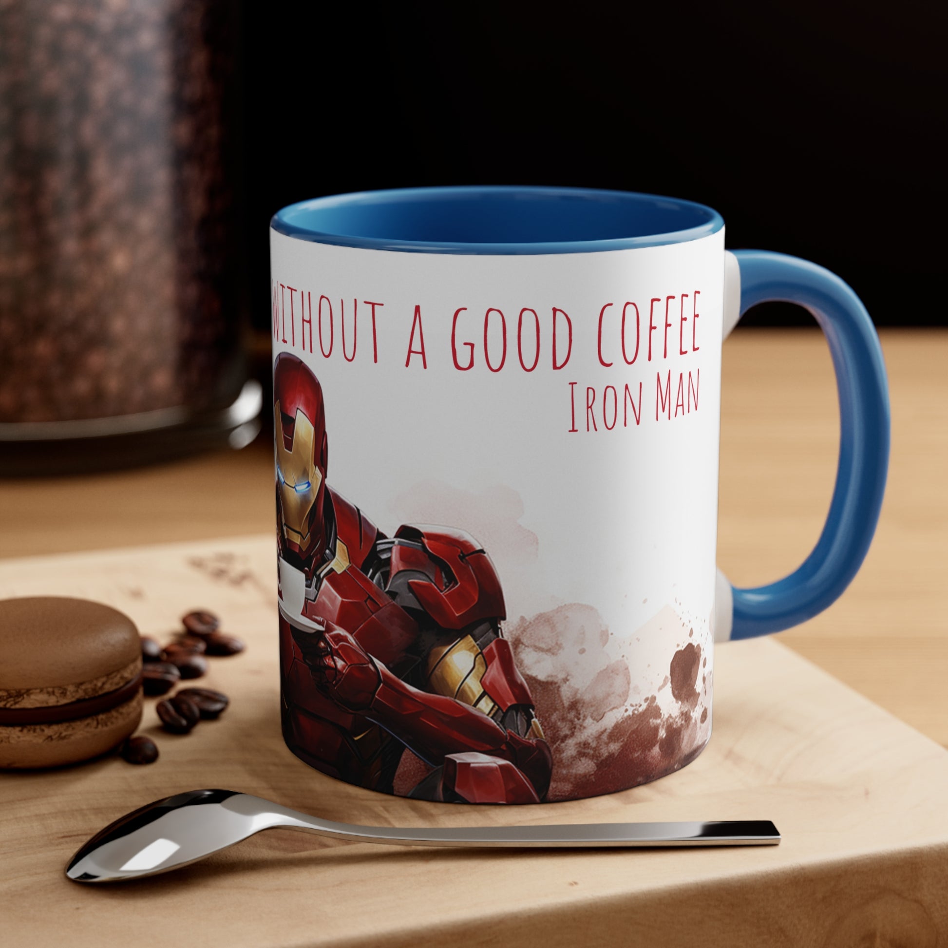 Iron Man, coffee mug, Marvel, Tony Stark, superhero, morning routine, coffee lover, stylish design, high-quality materials, 11 oz bicolor, fuel up, embrace the superhero, good coffee.