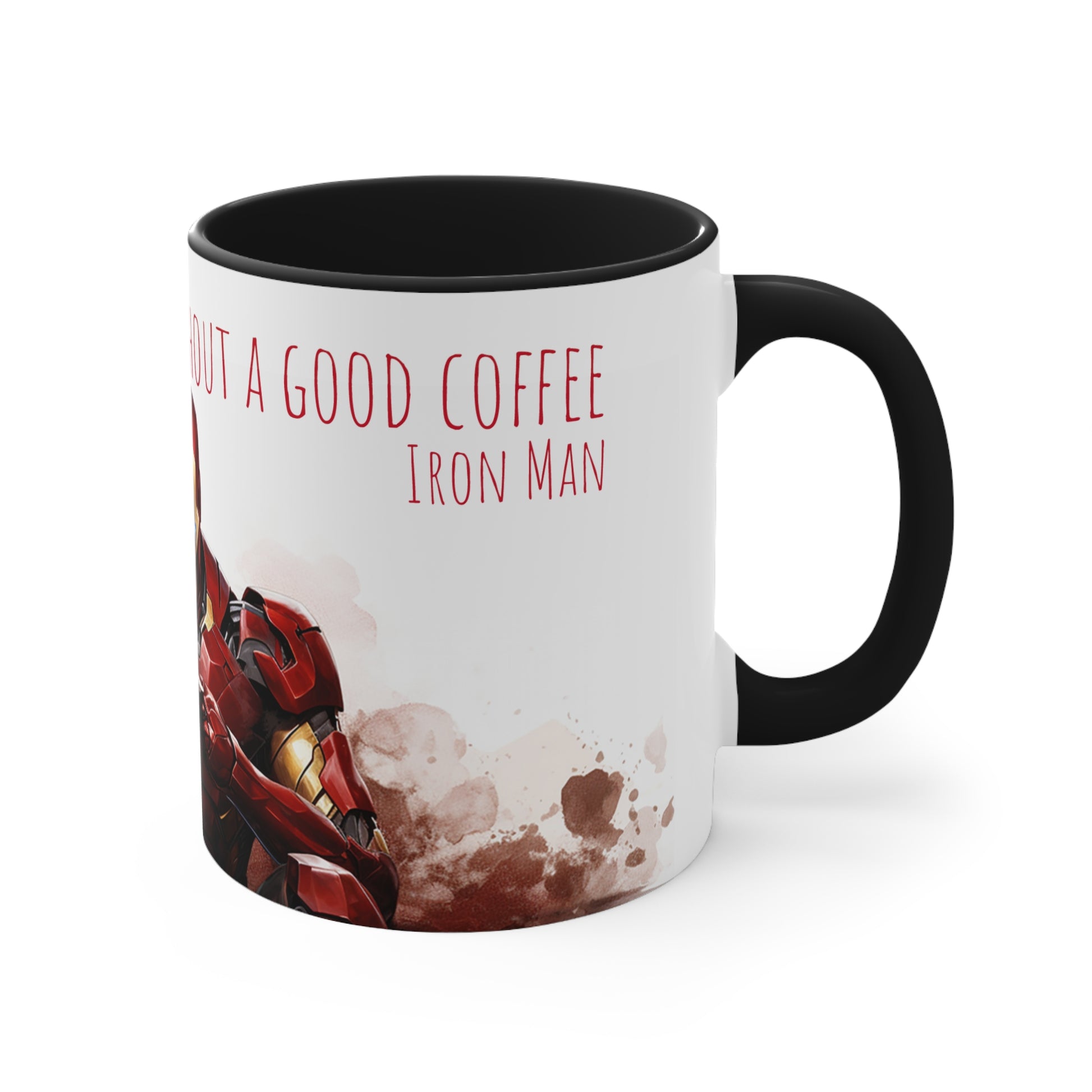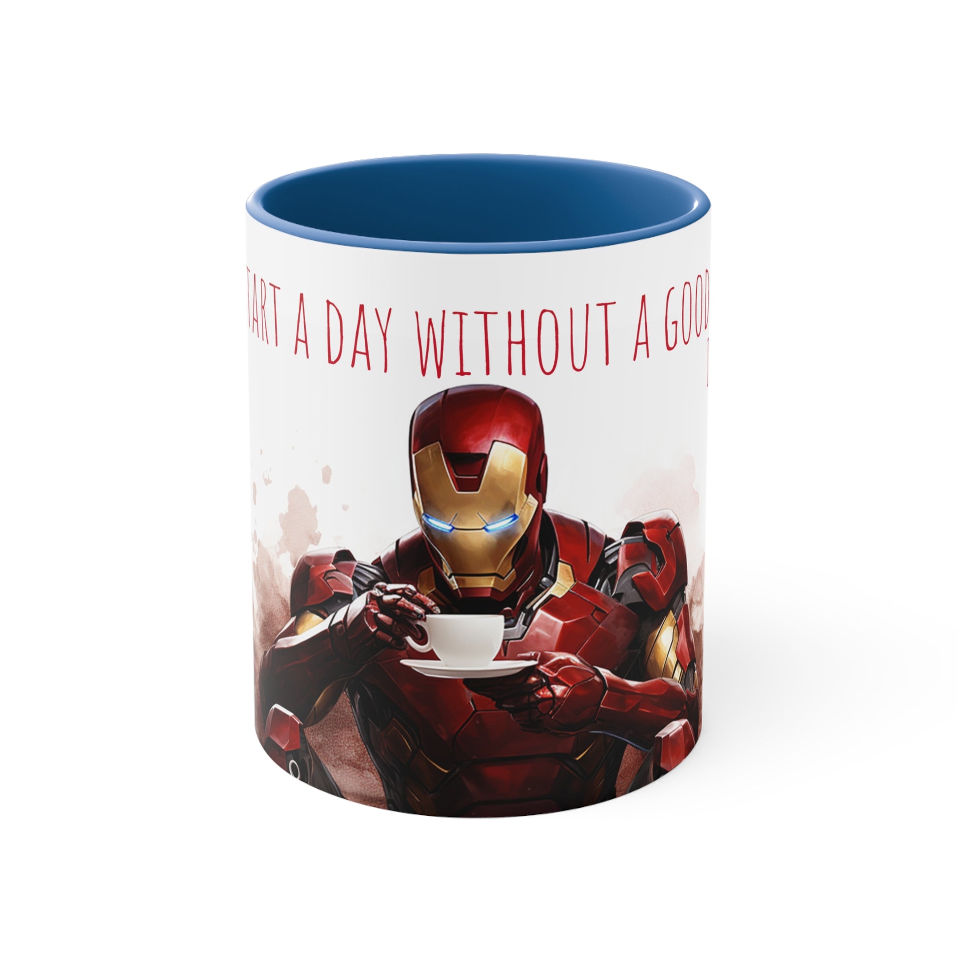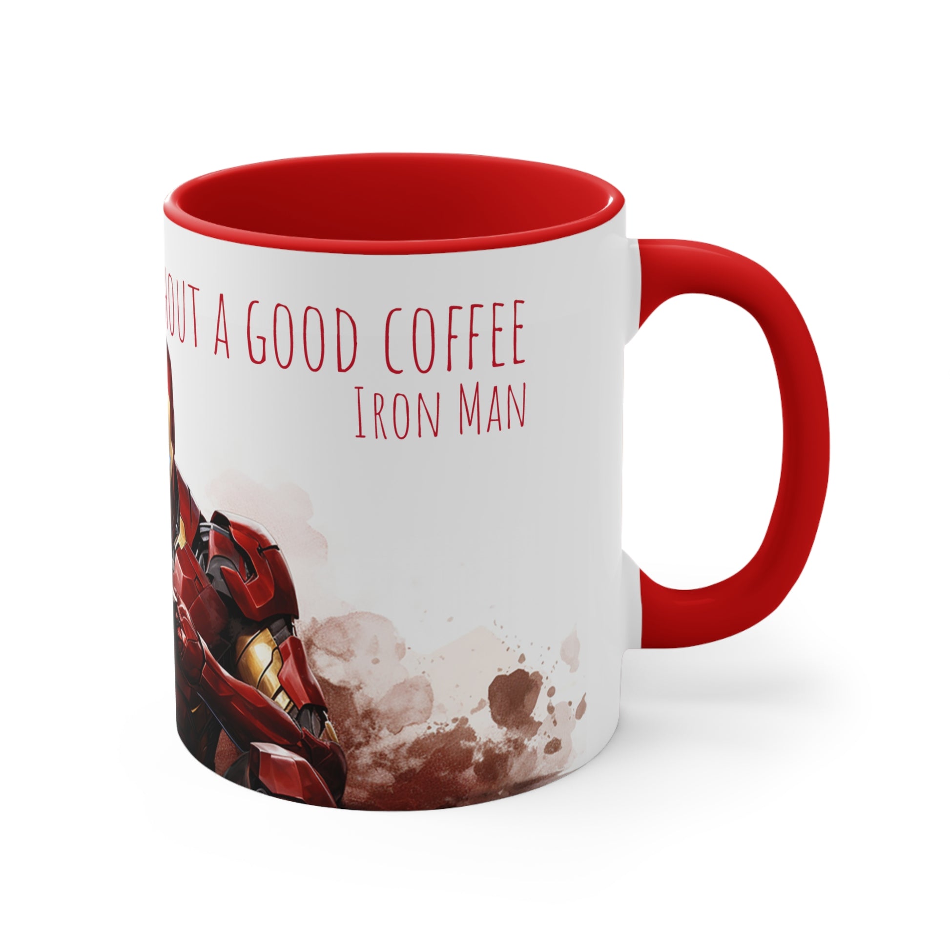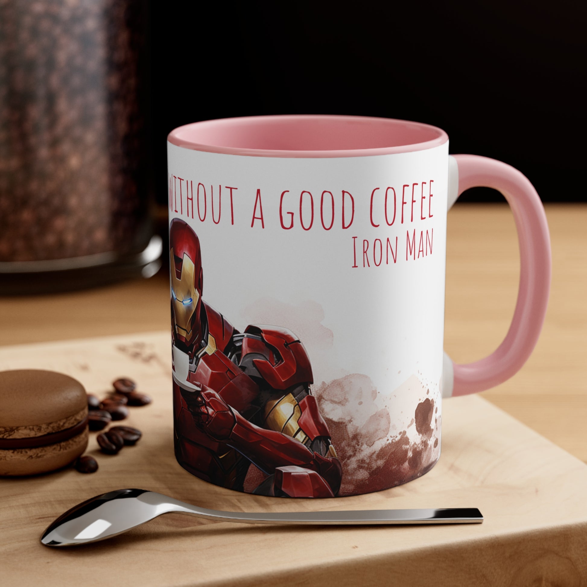 Iron Man, coffee mug, Marvel, Tony Stark, superhero, morning routine, coffee lover, stylish design, high-quality materials, 11 oz bicolor, fuel up, embrace the superhero, good coffee.
