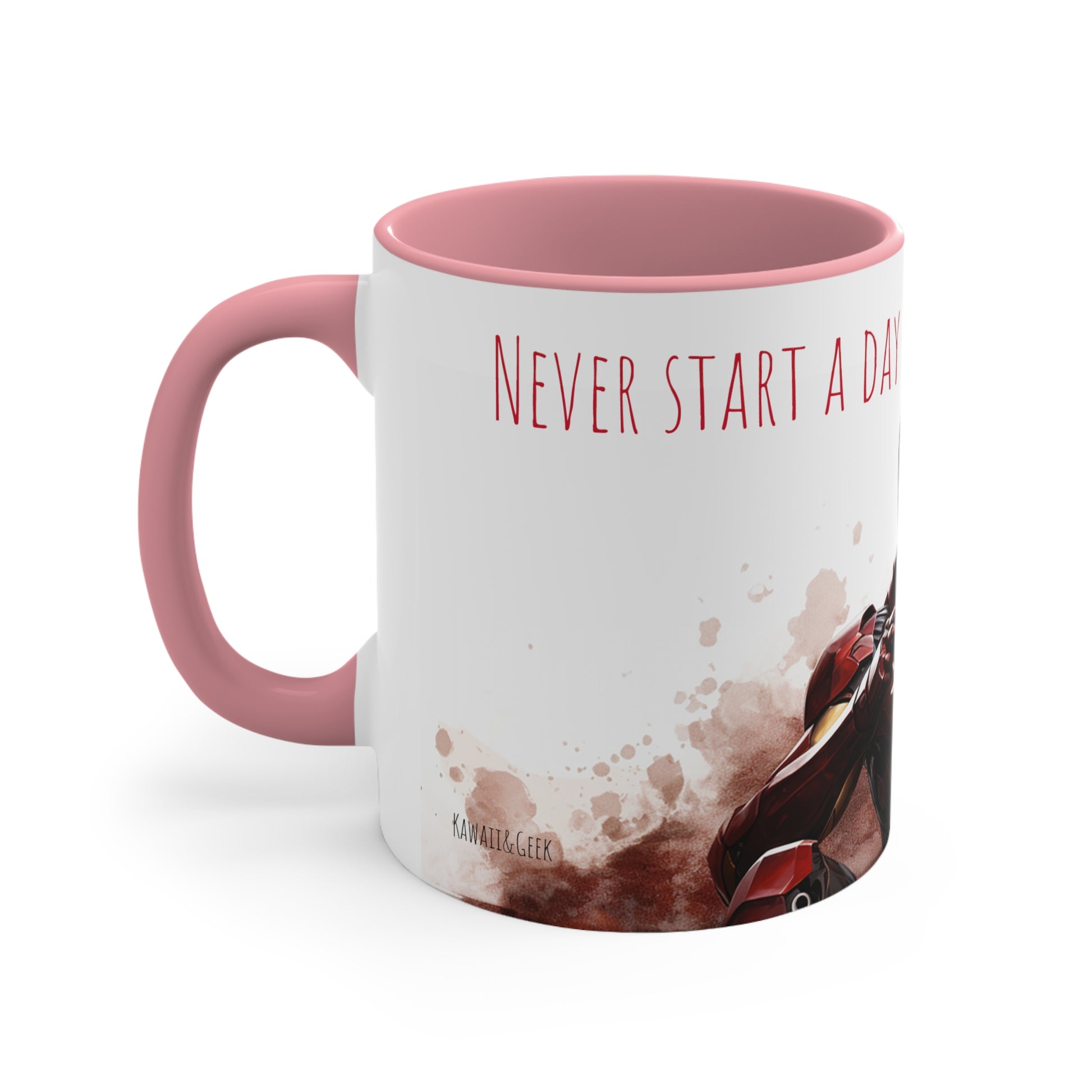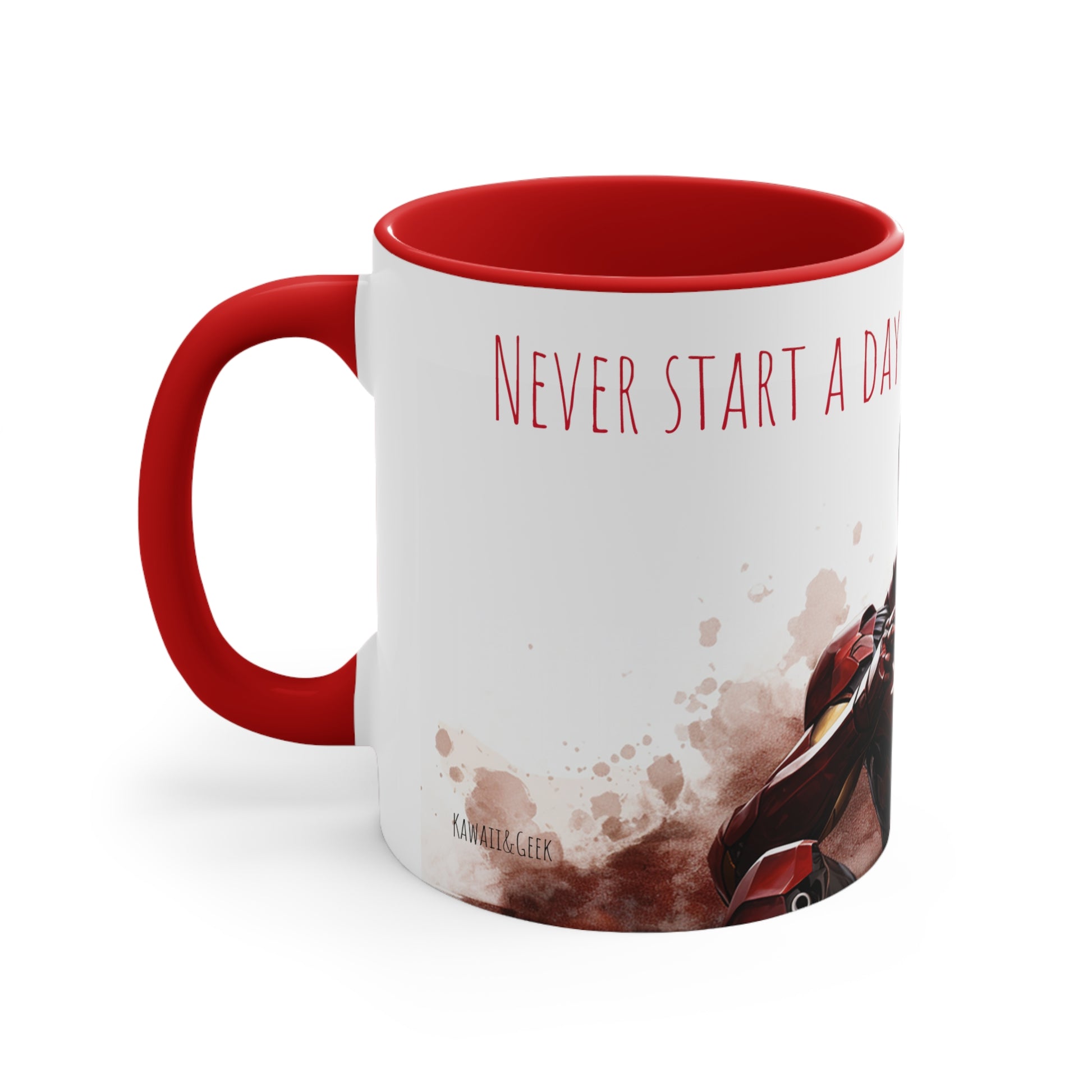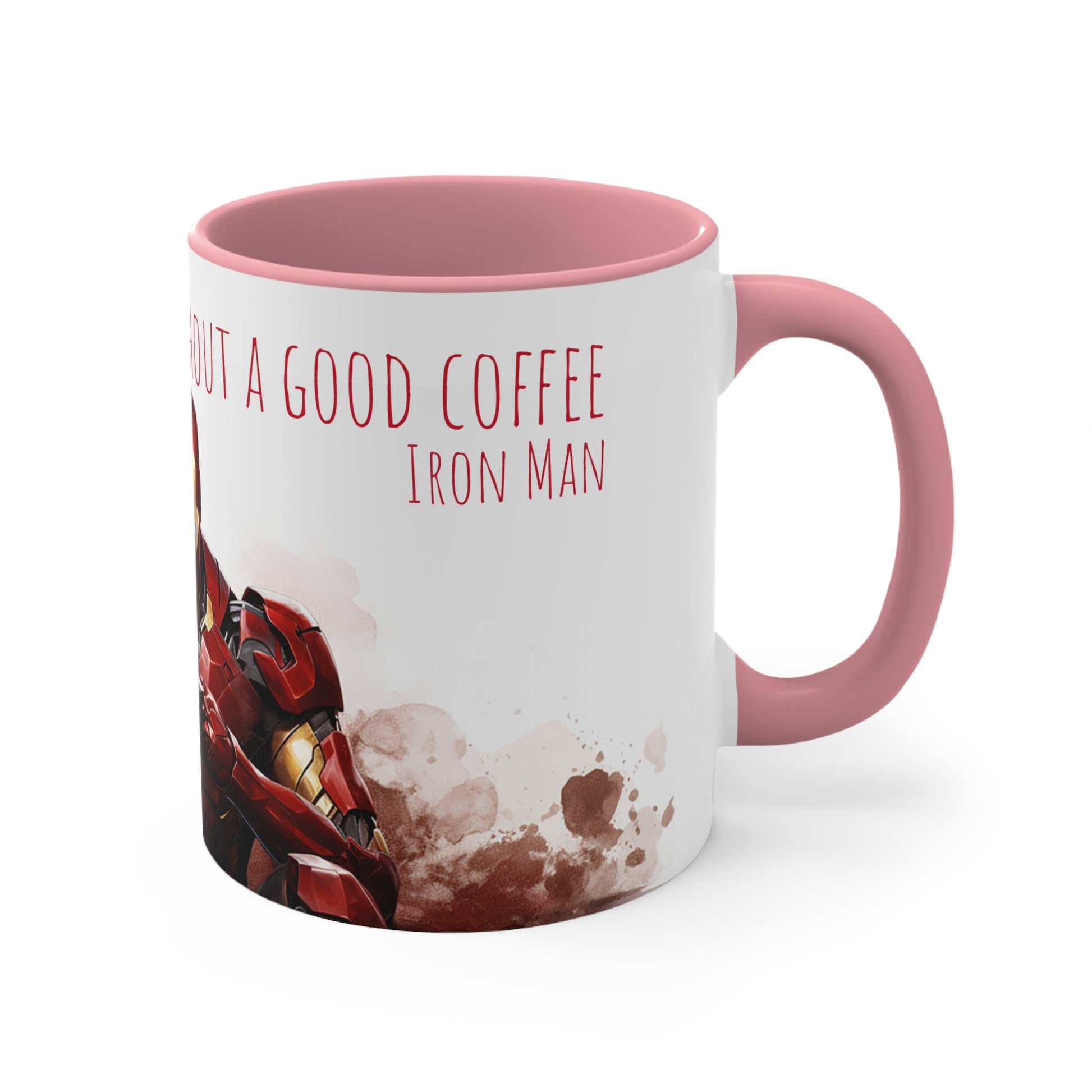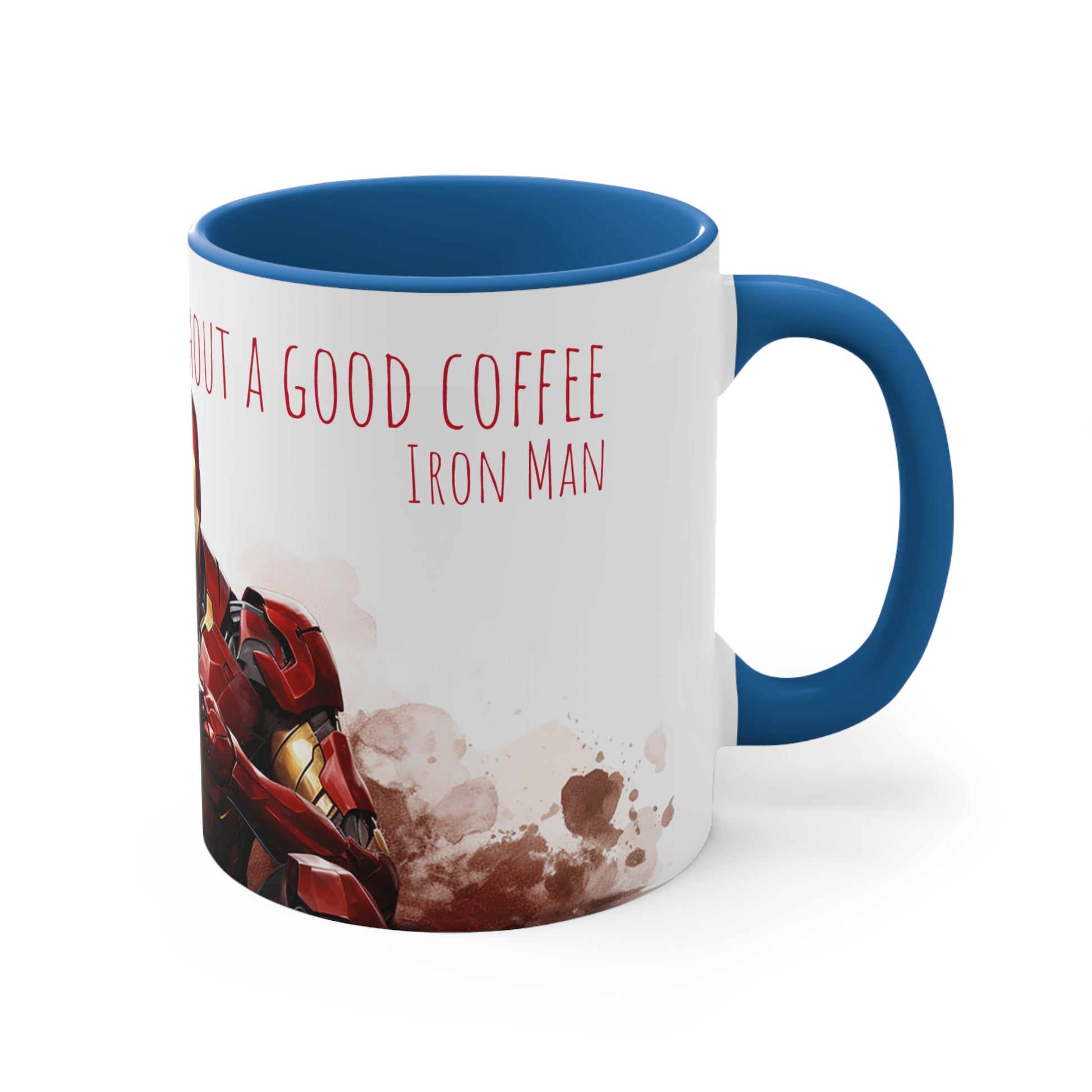 Iron Man, coffee mug, Marvel, Tony Stark, superhero, morning routine, coffee lover, stylish design, high-quality materials, 11 oz bicolor, fuel up, embrace the superhero, good coffee.