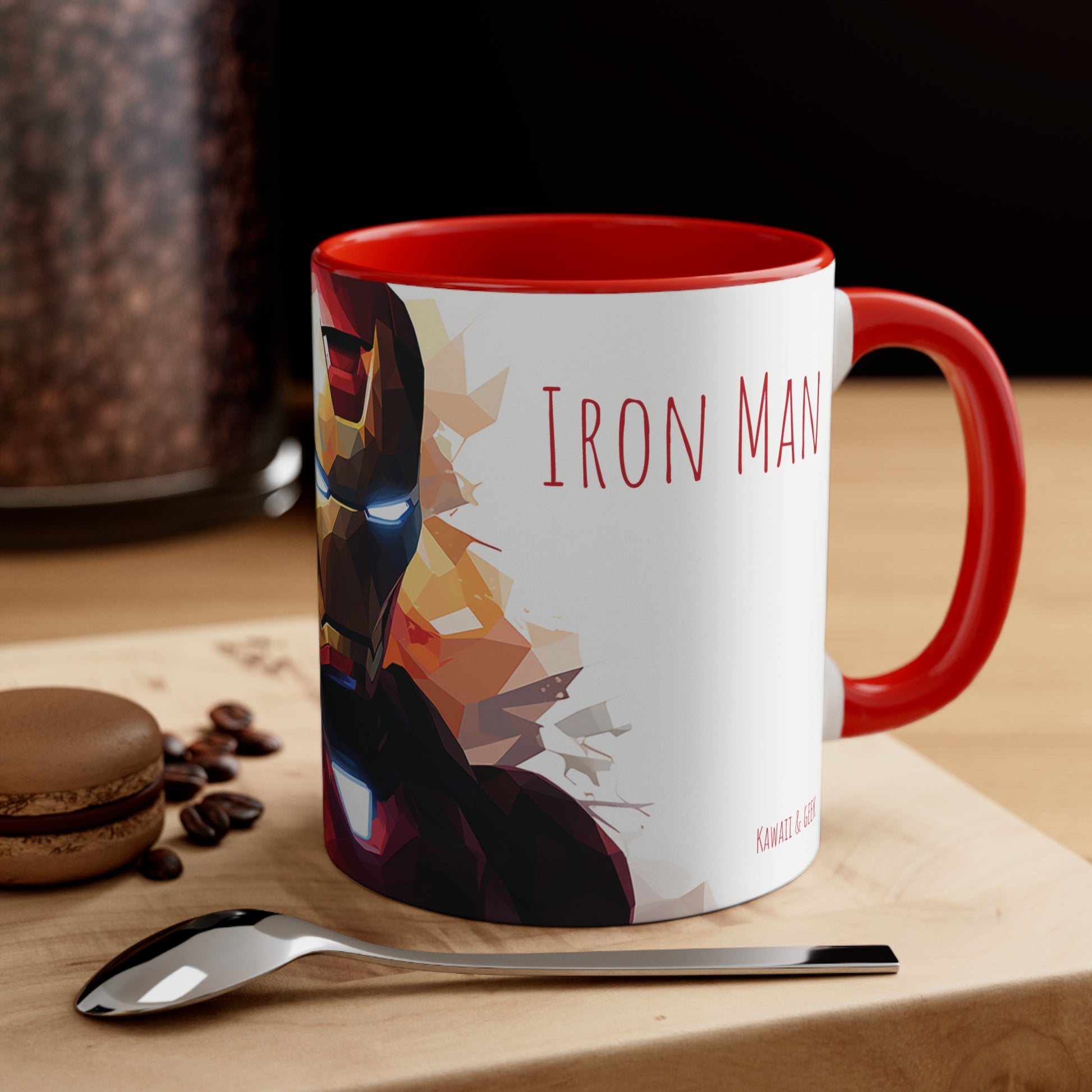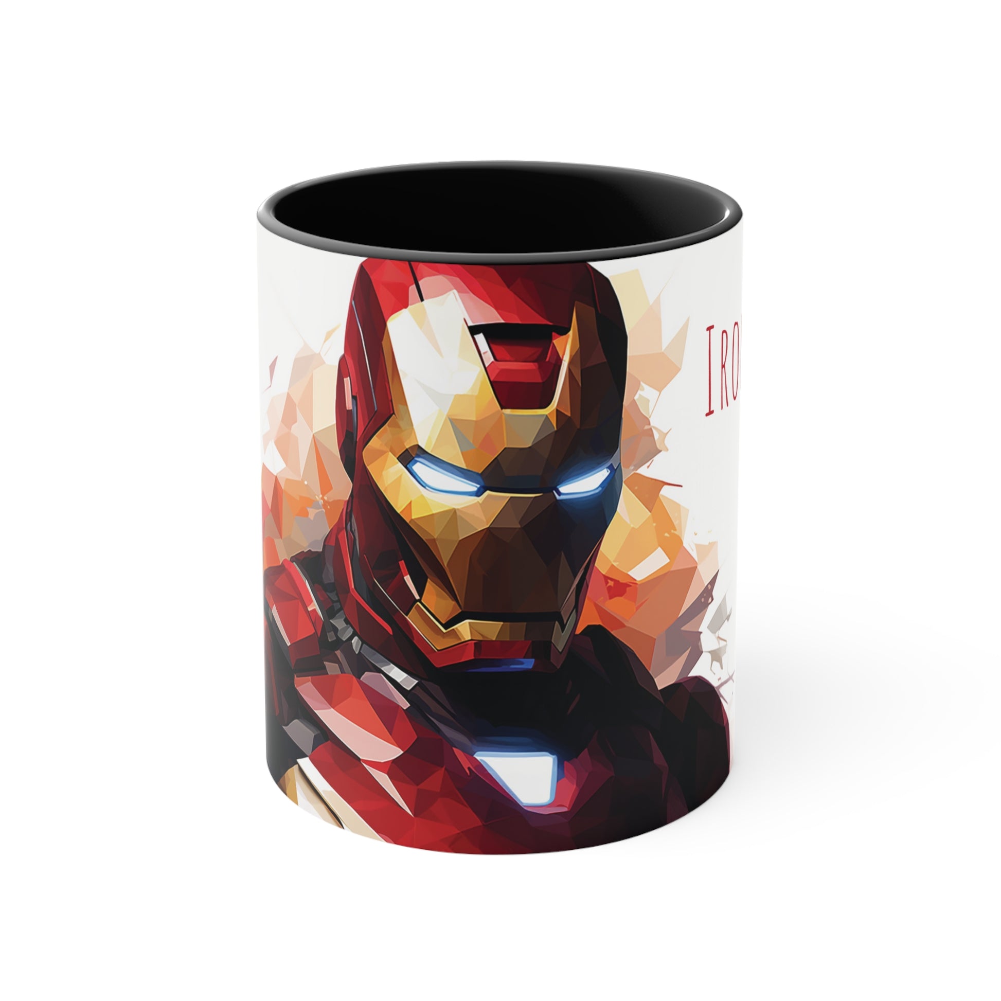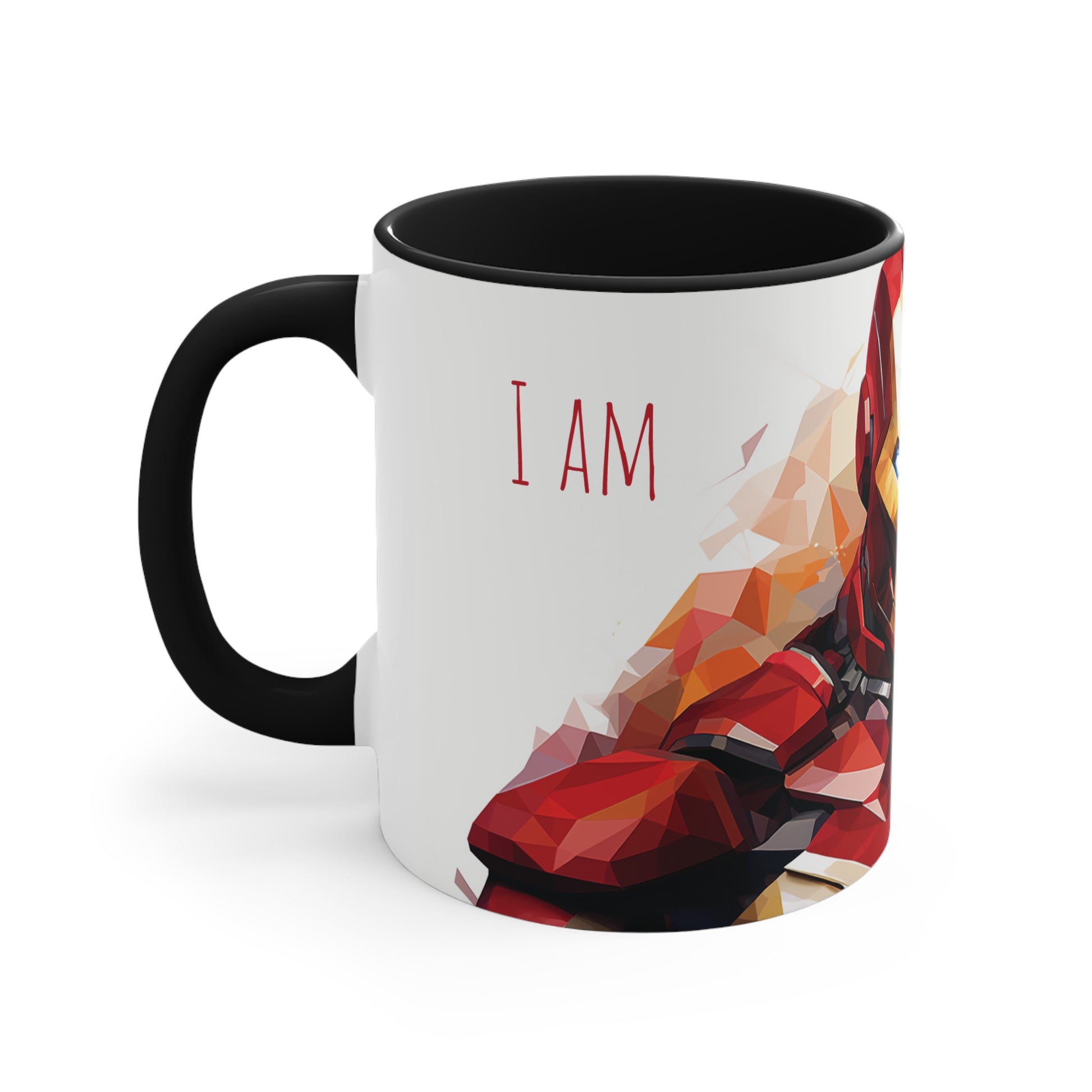 Keywords: Iron Man mug, Geometric style, Bicolor design, I am Iron Man, Superhero power, Iconic character, Modern twist, Heroism, Avengers, Marvel, Coffee or tea, Superhero vibes, Drinkware collectible.
