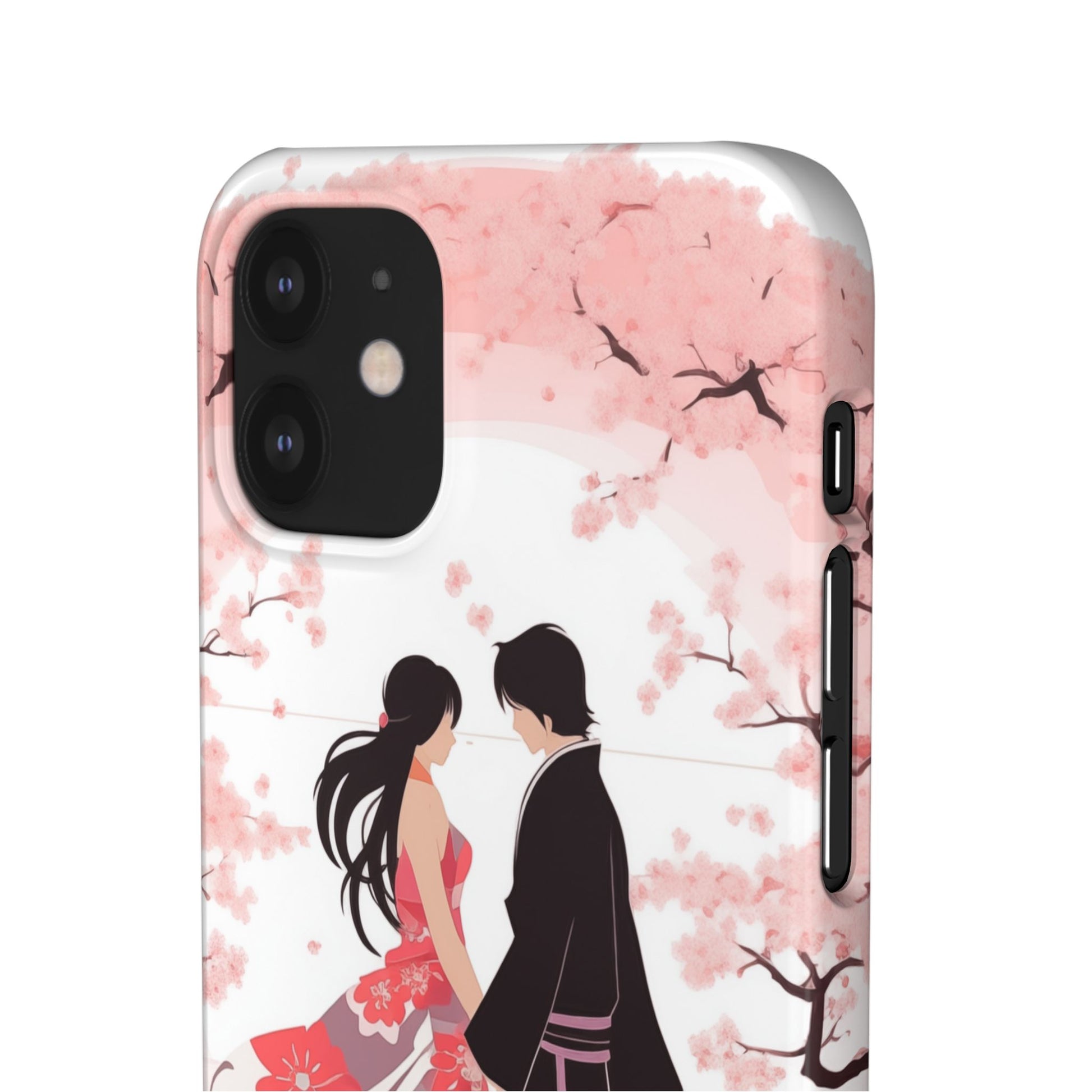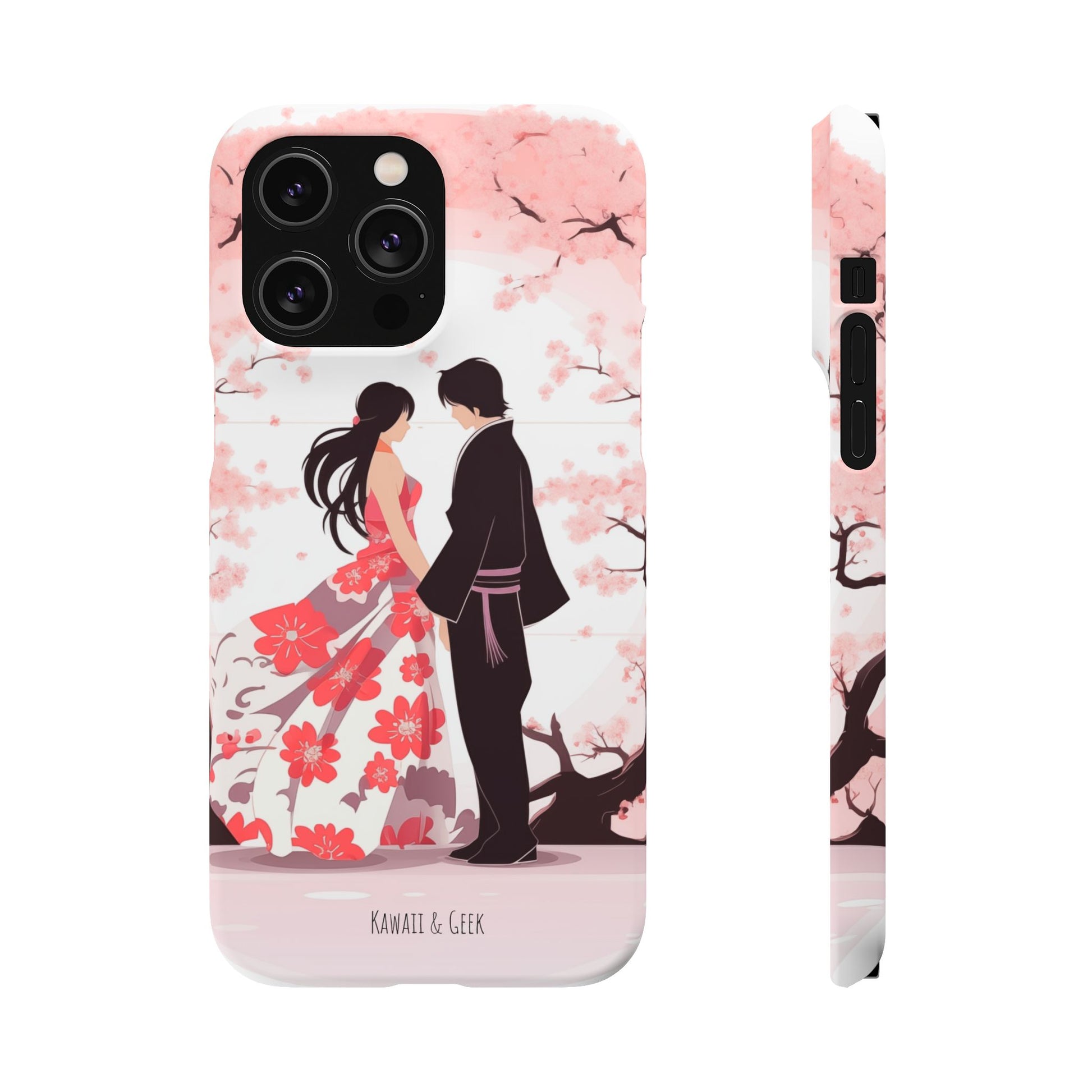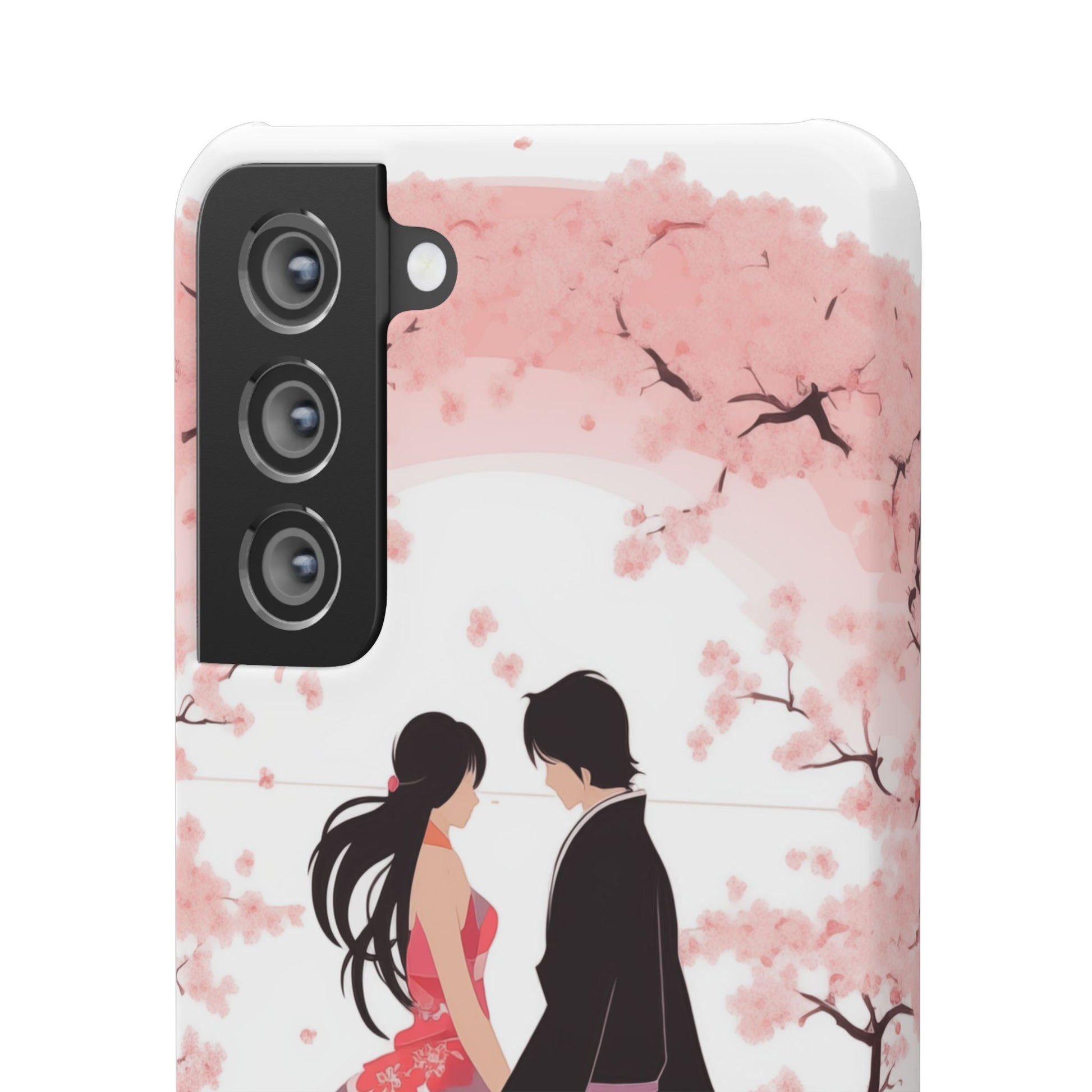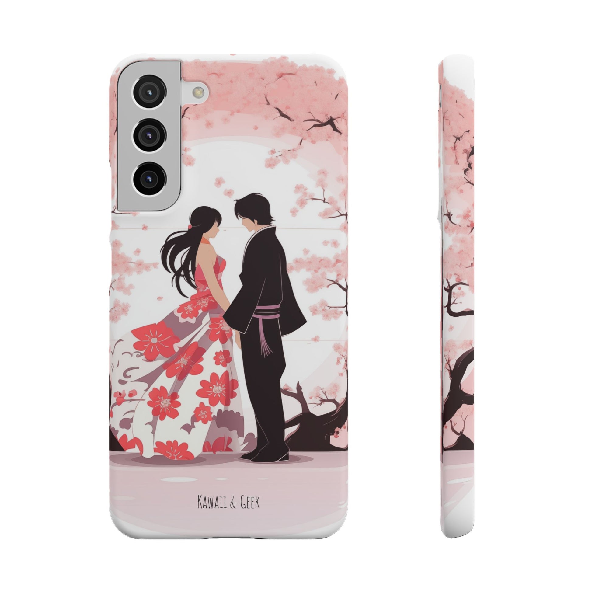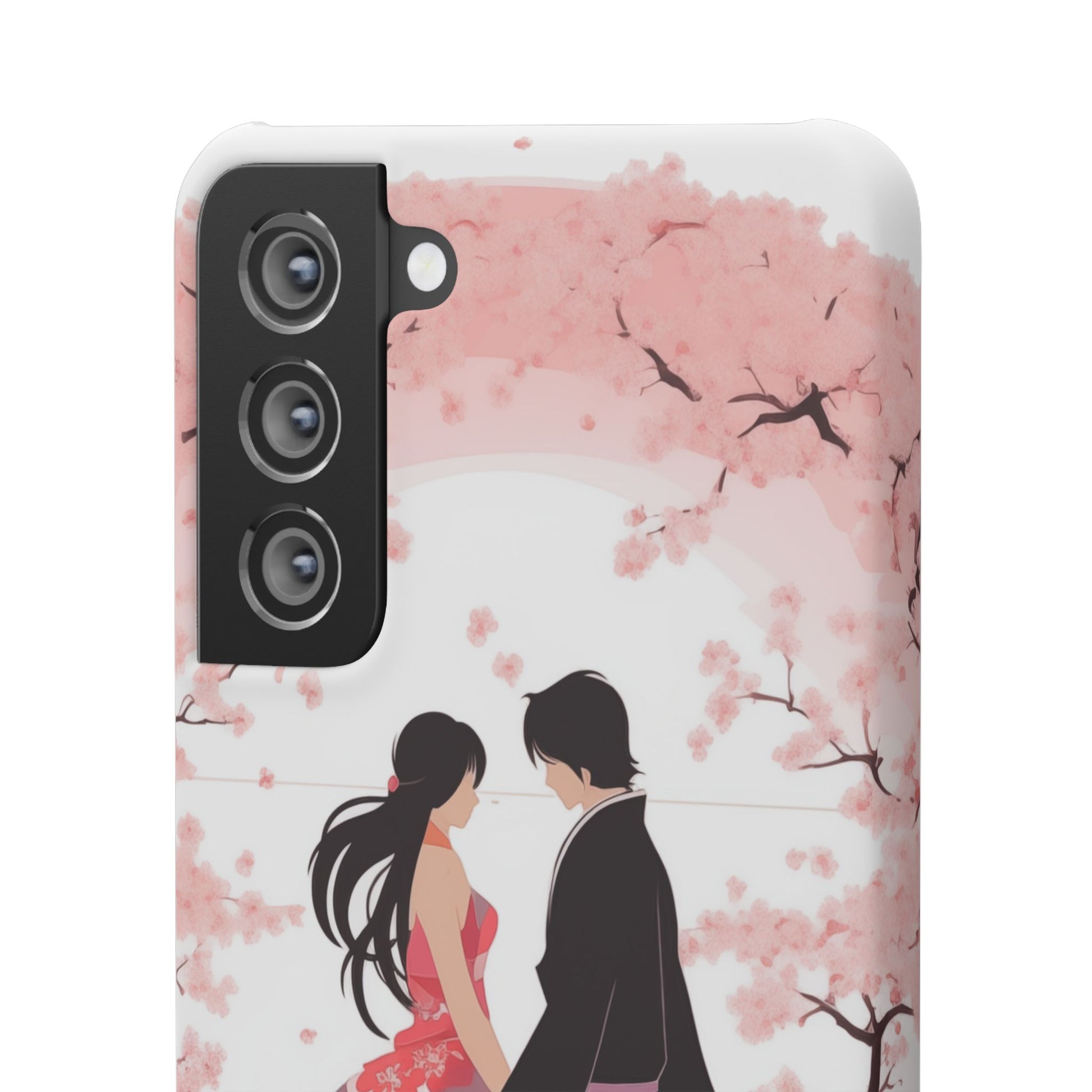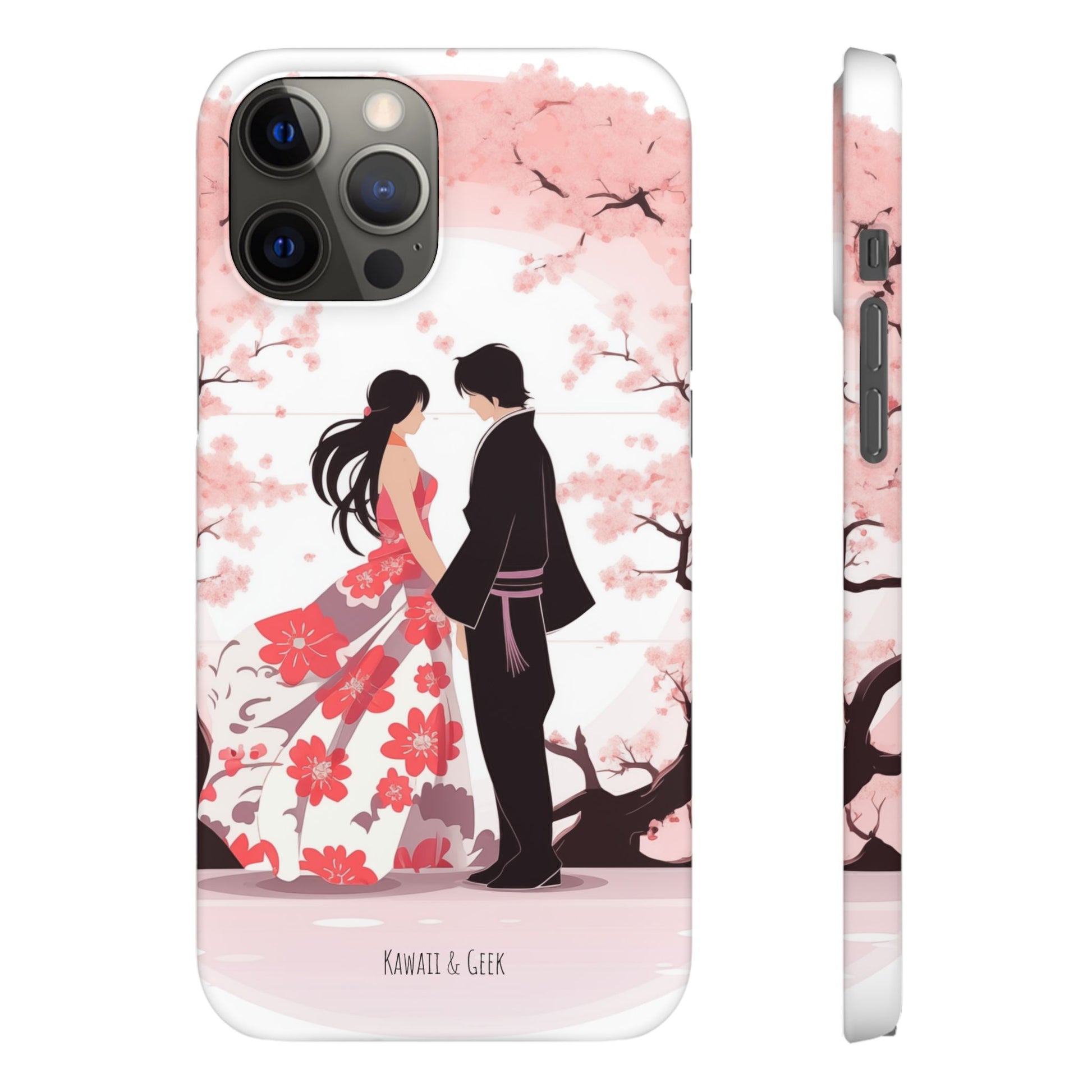 Immerse in the romantic elegance of Japan with our 'Japanese Blossom Love Phone Case', a Valentine's Day special. This exquisite case features a beautifully illustrated cute couple in Japanese-style, tenderly placed under blossoming cherry trees. The vibrant and detailed artwork brings the magic of cherry blossoms, or 'sakura', to your phone, symbolizing love and renewal. Designed to protect your device while adding a touch of artistic charm, this case combines functionality with beauty. Its durable material ensures your phone stays safe from daily wear and tear, while the slim profile maintains its sleek appearance. Perfect for those who appreciate the delicate allure of Japanese aesthetics and the spirit of Valentine's Day, this phone case is a wonderful blend of kawaii culture and timeless romance."