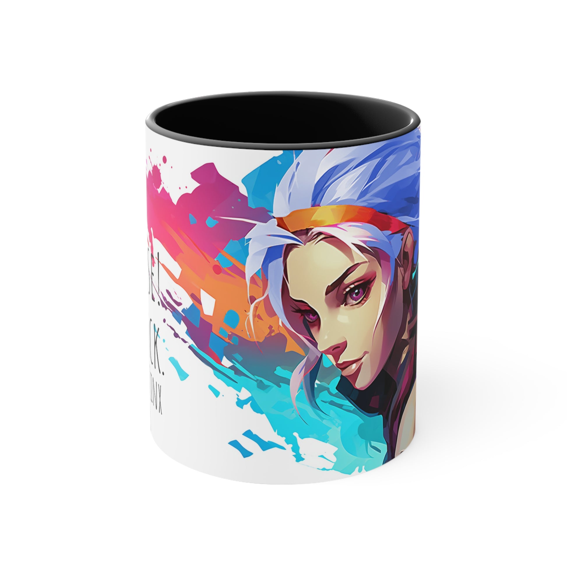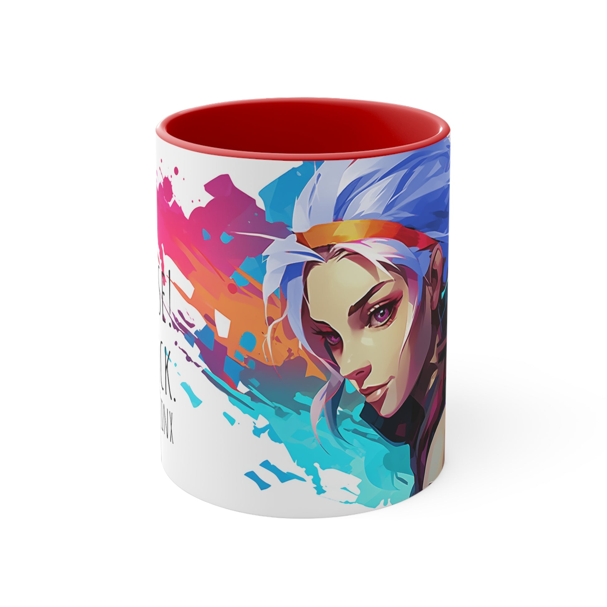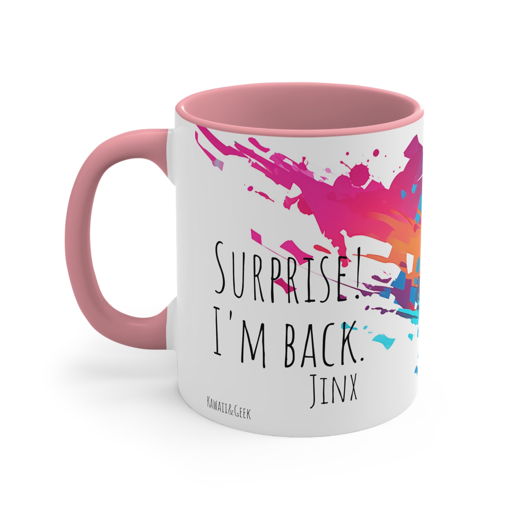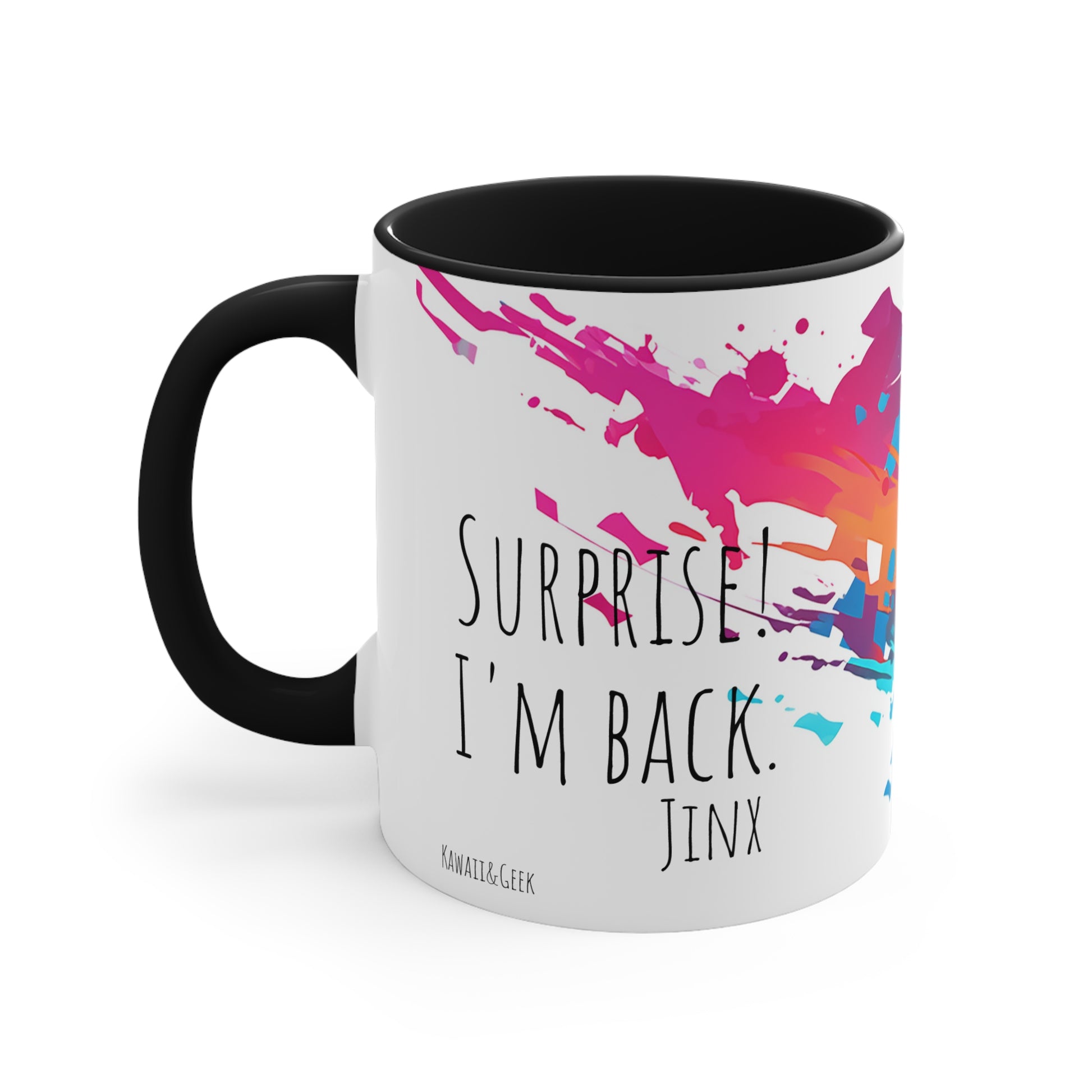 Get ready to embrace the unpredictable and mischievous spirit of Jinx with this 11 oz bicolor mug. Featuring a captivating geometric design, this mug showcases Jinx's vibrant personality and her iconic phrase, "Surprise! I'm back." Whether you're a fan of League of Legends or simply love Jinx's chaotic energy, this mug is a must-have for your collection. Start your day with a touch of unpredictability and let Jinx inspire you to embrace the unexpected. Add a splash of color and chaos to your mornings with the Jinx Geometric Bicolor Mug. Keywords: Jinx mug, Geometric style, Bicolor design, League of Legends, Surprise, Vibrant personality, Mischievous, Unpredictable, Chaotic energy, Collectible drinkware, League of Legends fan, Gaming merchandise, Start your day right, Embrace the unexpected. Add some color to your routine with this two-tone, custom accent coffee mug. This 11oz mug features an accented C-Handle that is comfortable to use, as well as an accented interior to add more contrast and character. With your design on this mug, you get an instant winner of a product. .: White ceramic with colored interior and handle .: C-handle .: Eye-catching color contrast .: Lead and BPA-free