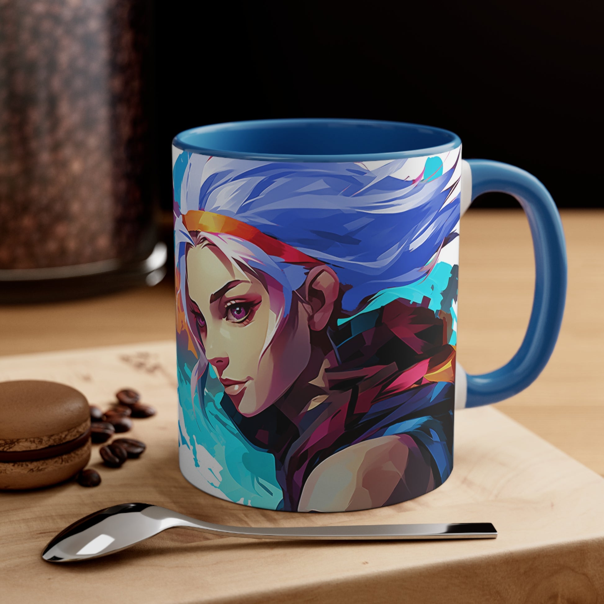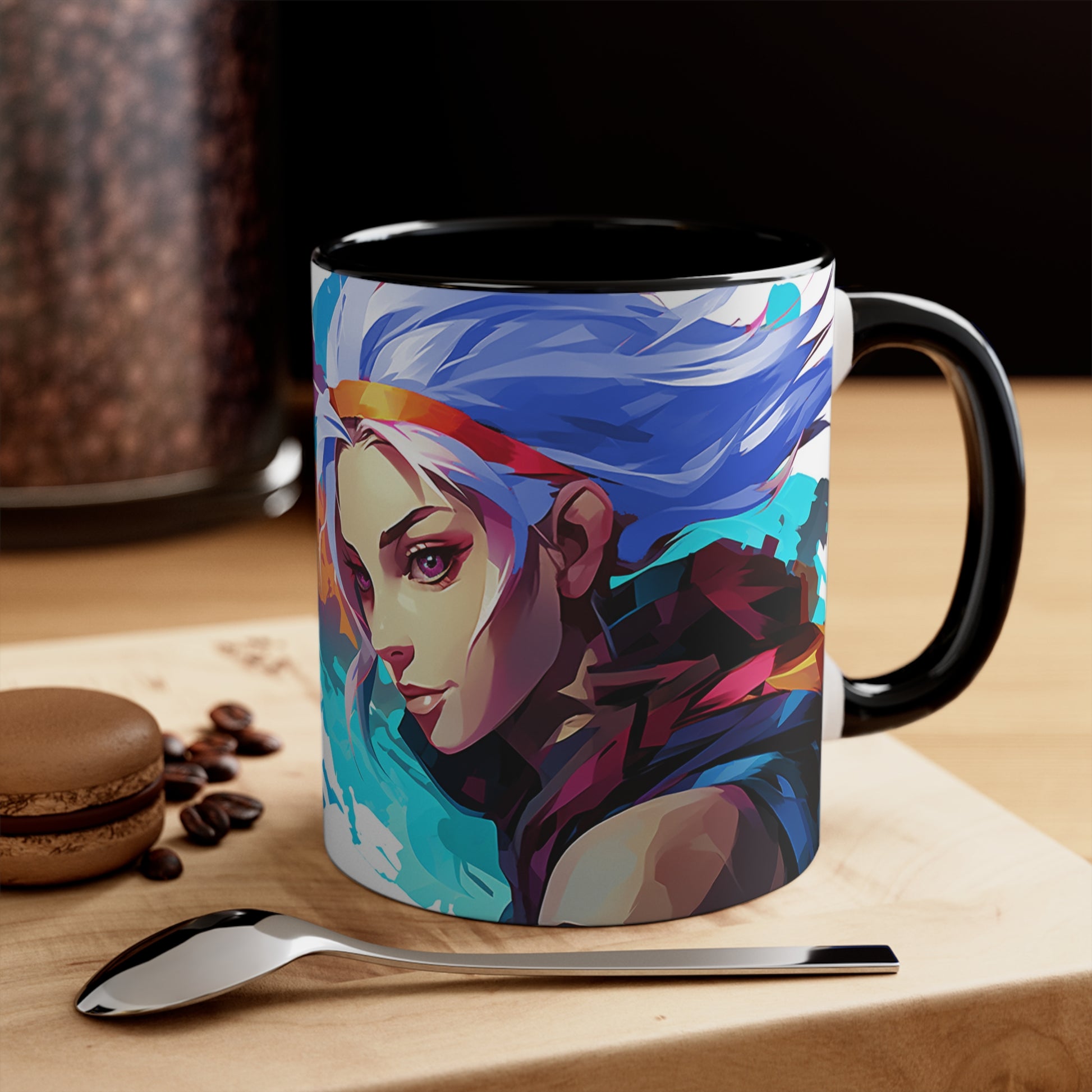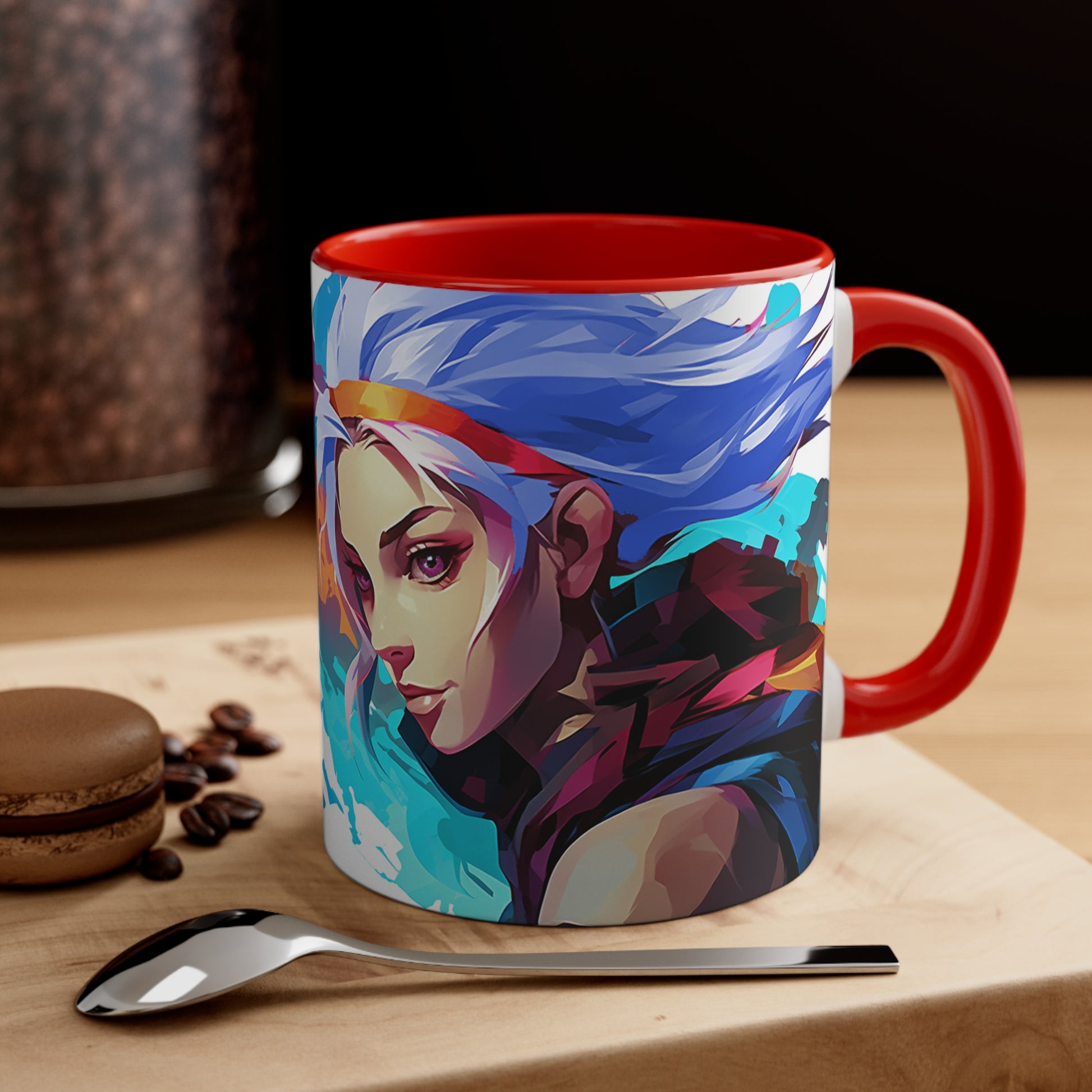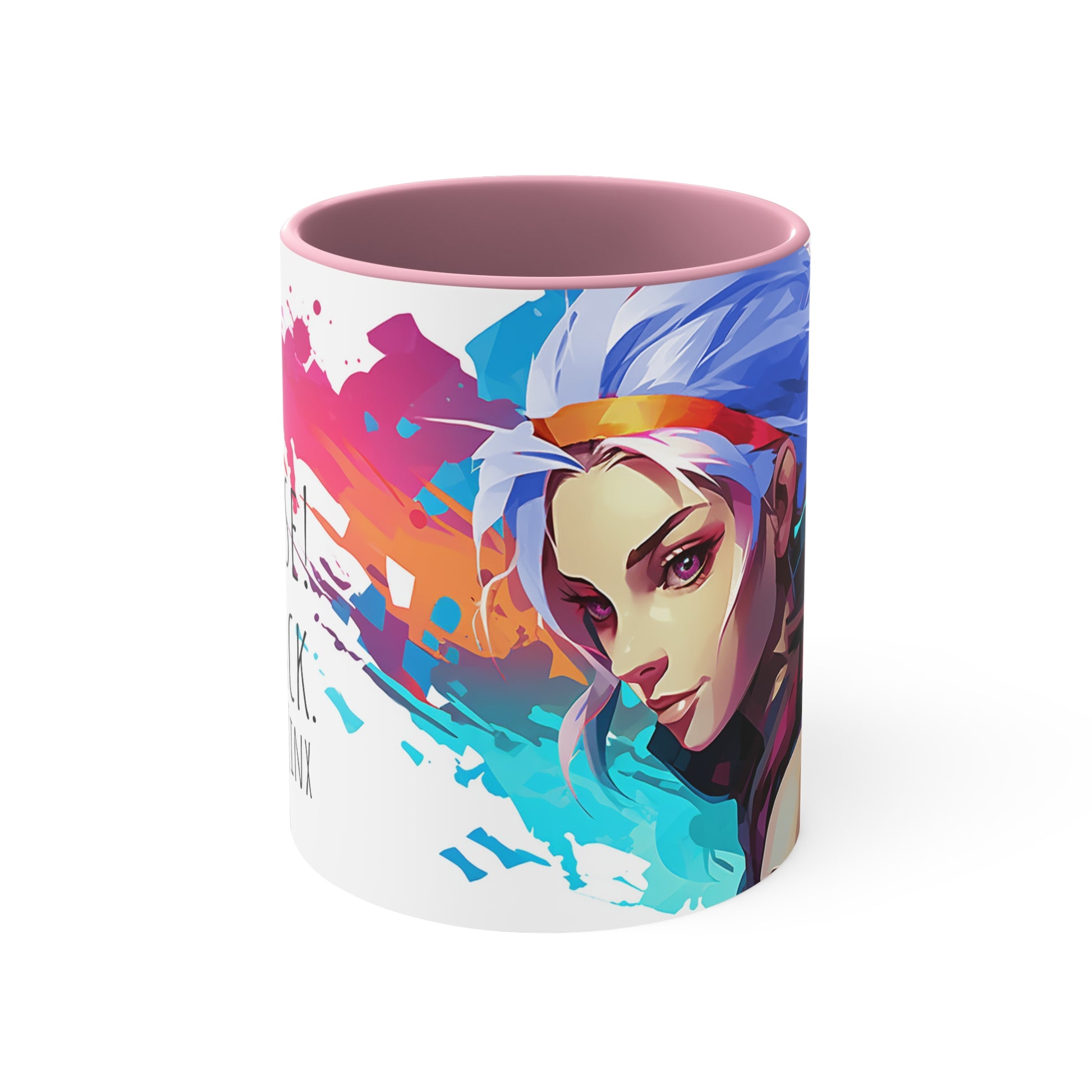 Get ready to embrace the unpredictable and mischievous spirit of Jinx with this 11 oz bicolor mug. Featuring a captivating geometric design, this mug showcases Jinx's vibrant personality and her iconic phrase, "Surprise! I'm back." Whether you're a fan of League of Legends or simply love Jinx's chaotic energy, this mug is a must-have for your collection. Start your day with a touch of unpredictability and let Jinx inspire you to embrace the unexpected. Add a splash of color and chaos to your mornings with the Jinx Geometric Bicolor Mug. Keywords: Jinx mug, Geometric style, Bicolor design, League of Legends, Surprise, Vibrant personality, Mischievous, Unpredictable, Chaotic energy, Collectible drinkware, League of Legends fan, Gaming merchandise, Start your day right, Embrace the unexpected. Add some color to your routine with this two-tone, custom accent coffee mug. This 11oz mug features an accented C-Handle that is comfortable to use, as well as an accented interior to add more contrast and character. With your design on this mug, you get an instant winner of a product. .: White ceramic with colored interior and handle .: C-handle .: Eye-catching color contrast .: Lead and BPA-free
