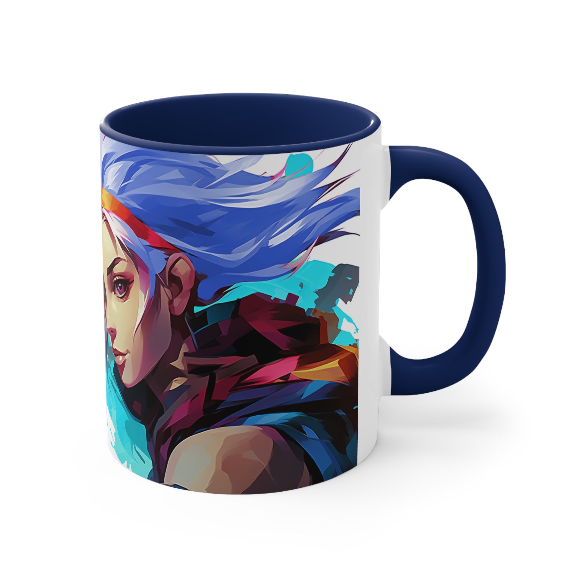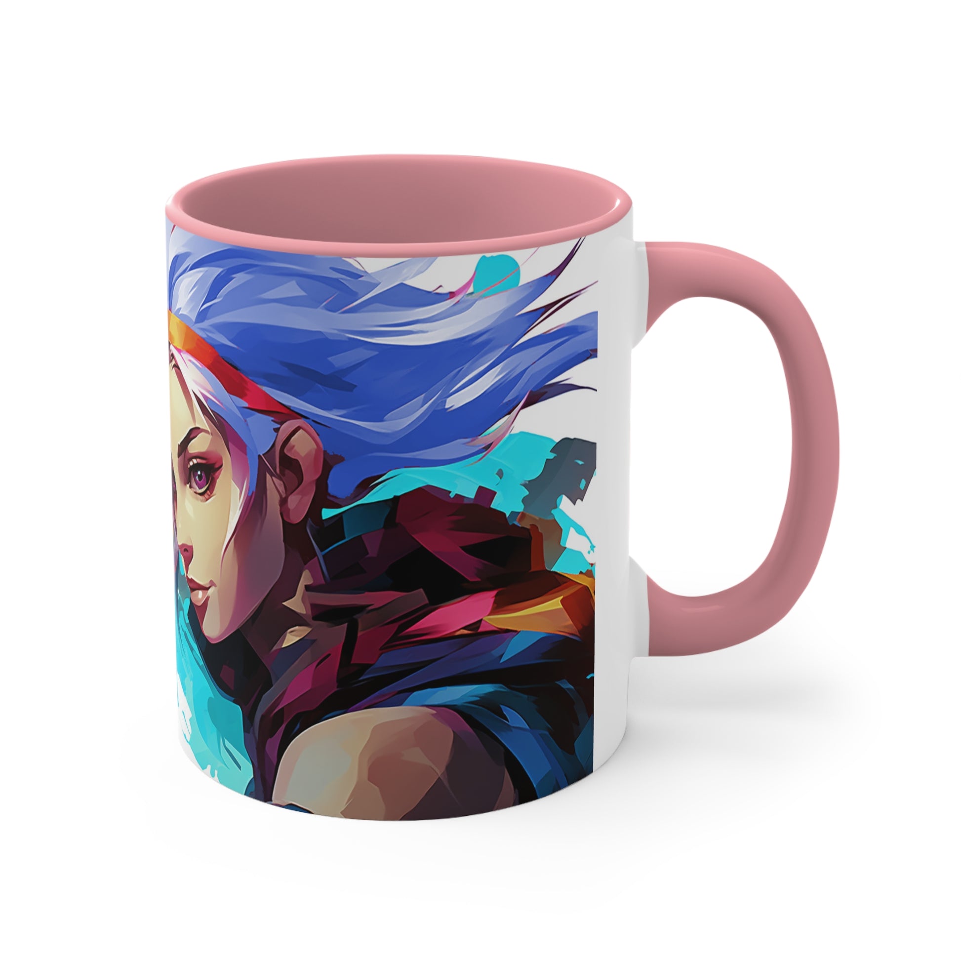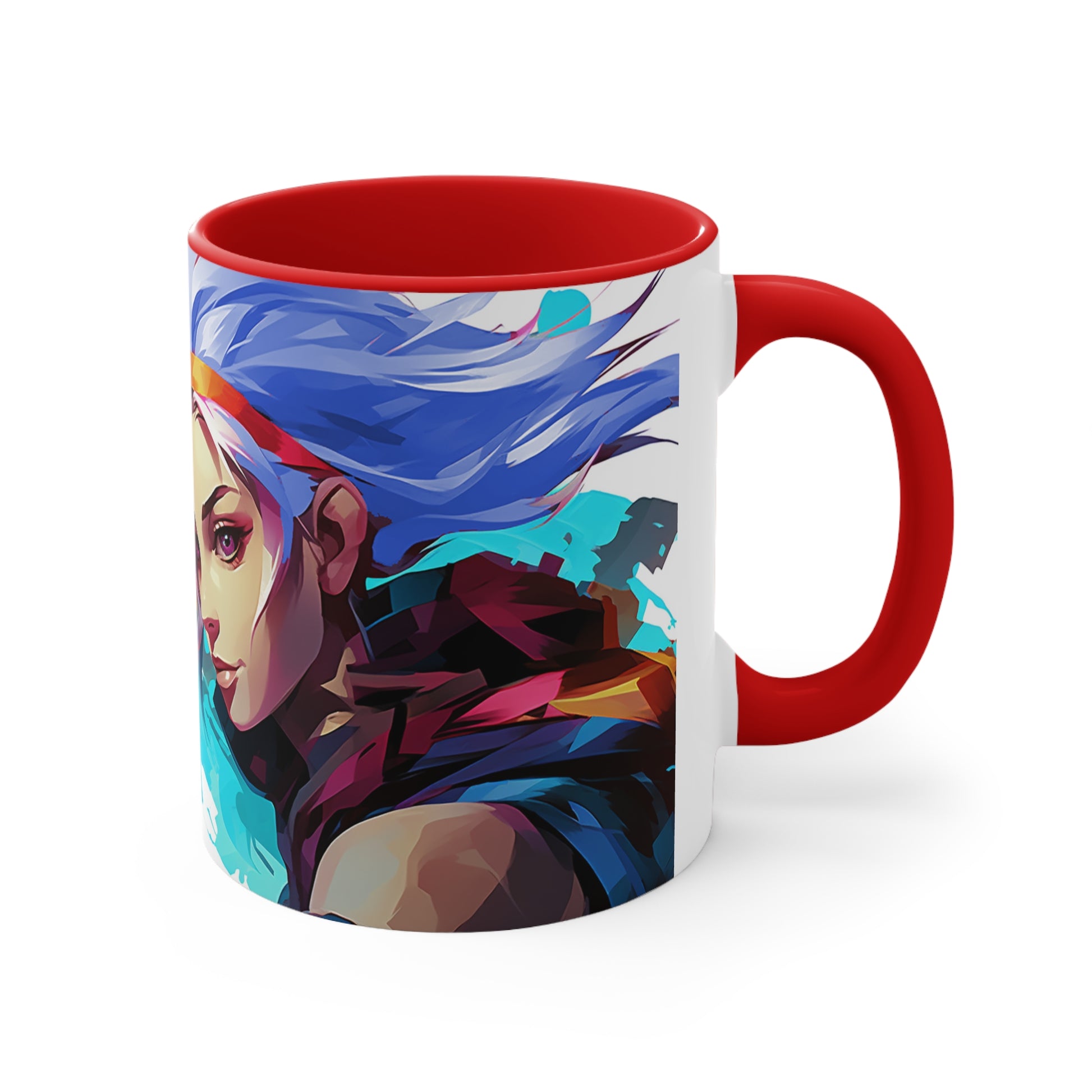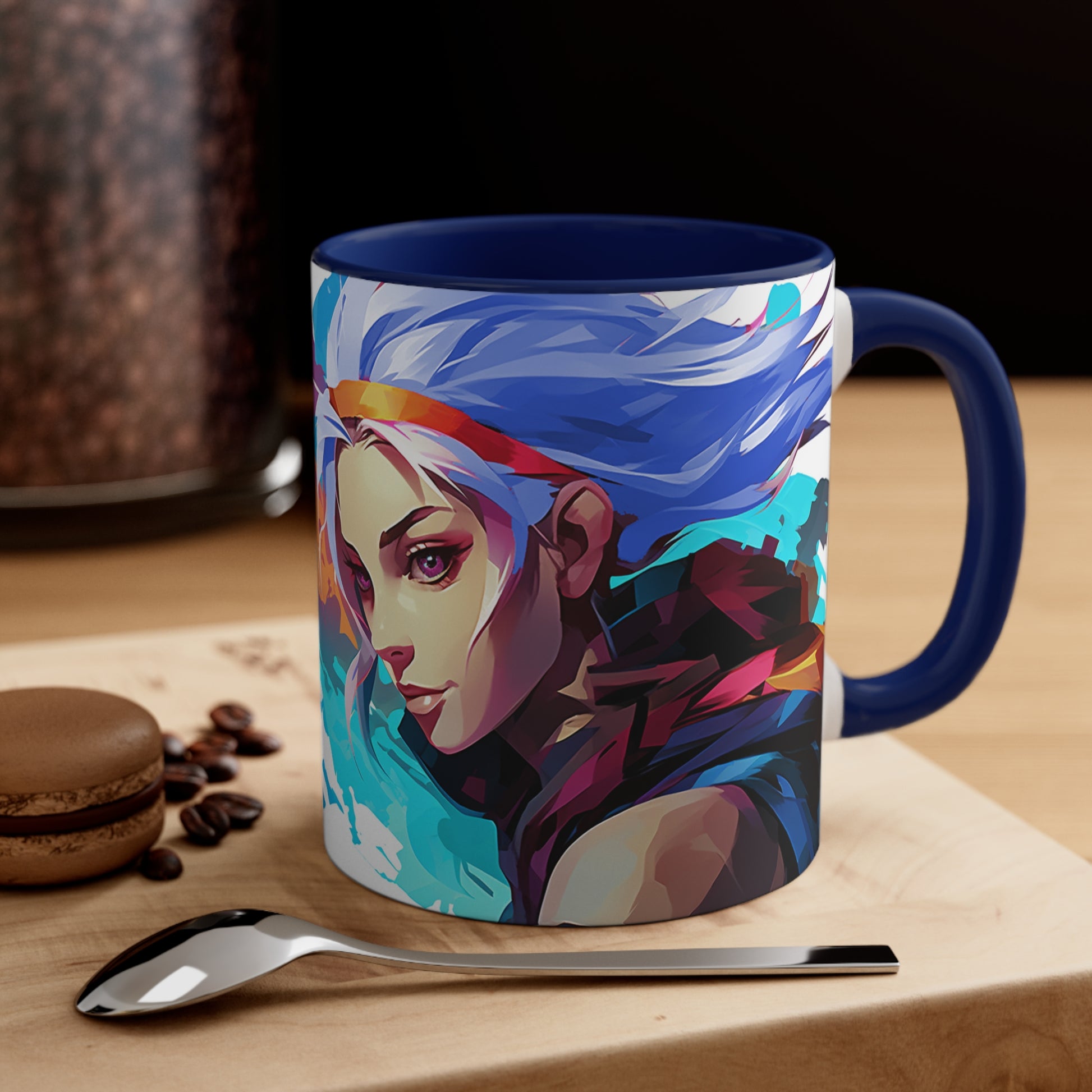 Get ready to embrace the unpredictable and mischievous spirit of Jinx with this 11 oz bicolor mug. Featuring a captivating geometric design, this mug showcases Jinx's vibrant personality and her iconic phrase, "Surprise! I'm back." Whether you're a fan of League of Legends or simply love Jinx's chaotic energy, this mug is a must-have for your collection. Start your day with a touch of unpredictability and let Jinx inspire you to embrace the unexpected. Add a splash of color and chaos to your mornings with the Jinx Geometric Bicolor Mug. Keywords: Jinx mug, Geometric style, Bicolor design, League of Legends, Surprise, Vibrant personality, Mischievous, Unpredictable, Chaotic energy, Collectible drinkware, League of Legends fan, Gaming merchandise, Start your day right, Embrace the unexpected. Add some color to your routine with this two-tone, custom accent coffee mug. This 11oz mug features an accented C-Handle that is comfortable to use, as well as an accented interior to add more contrast and character. With your design on this mug, you get an instant winner of a product. .: White ceramic with colored interior and handle .: C-handle .: Eye-catching color contrast .: Lead and BPA-free