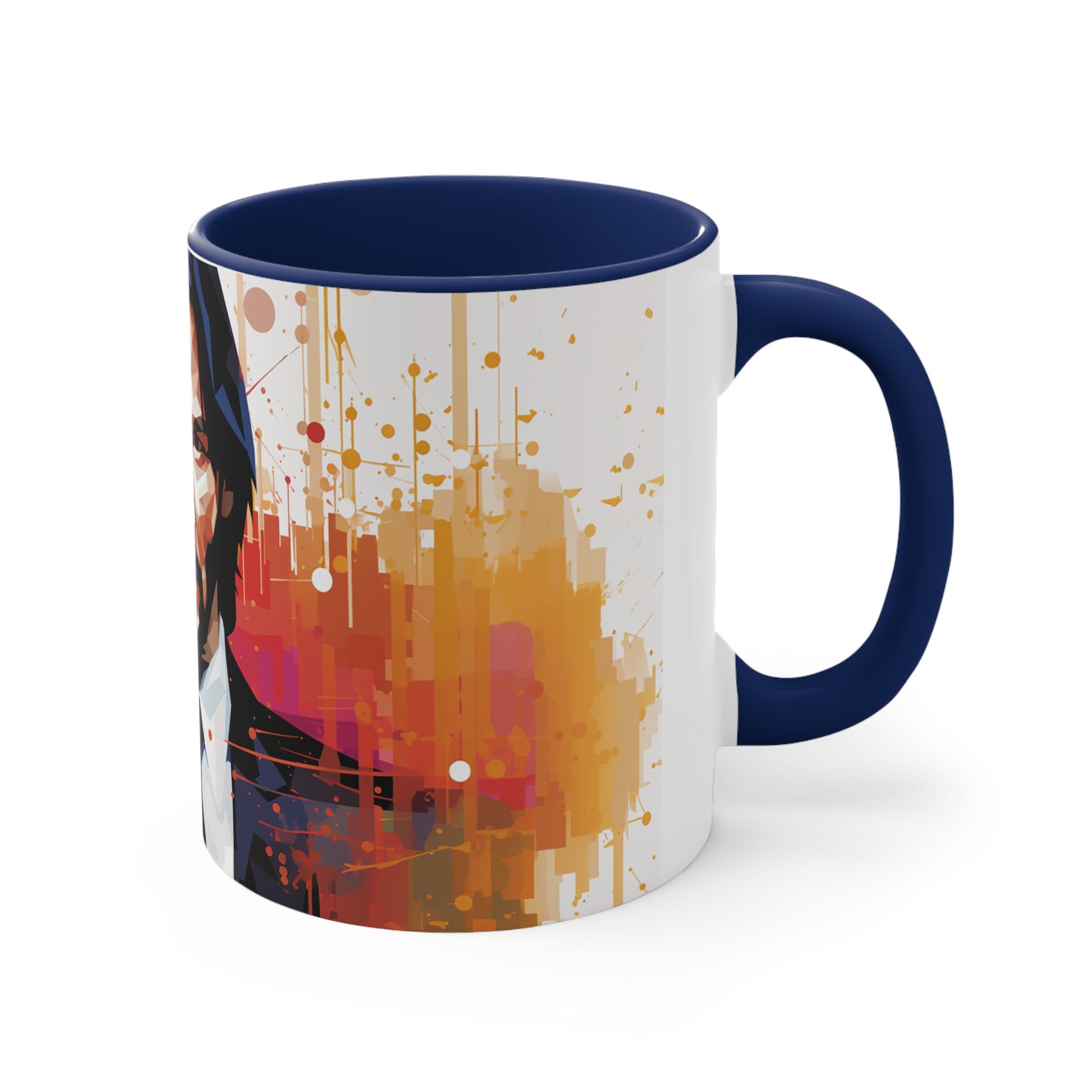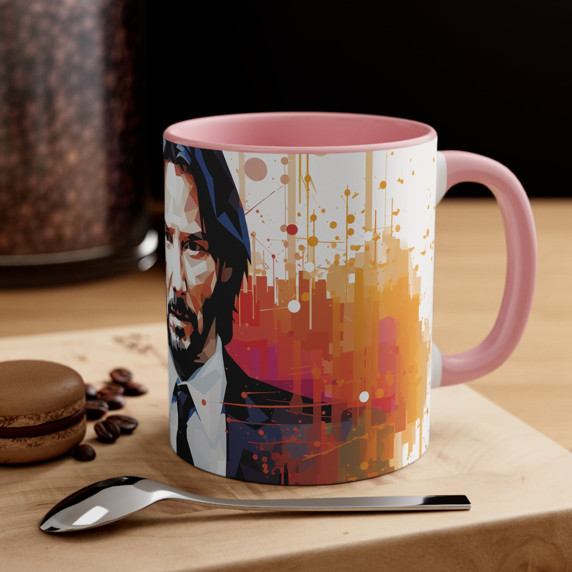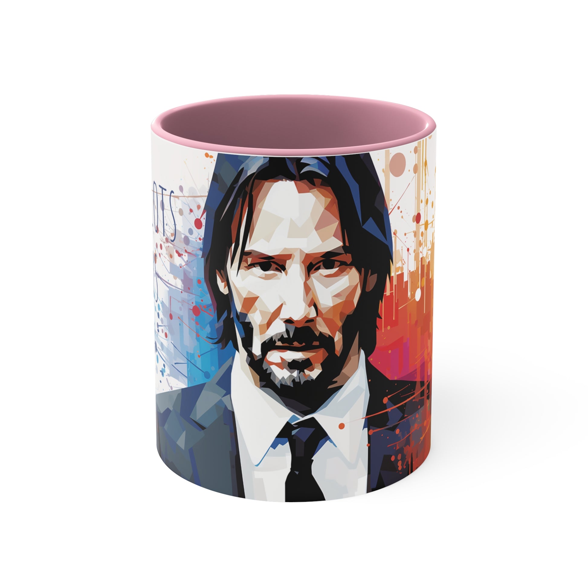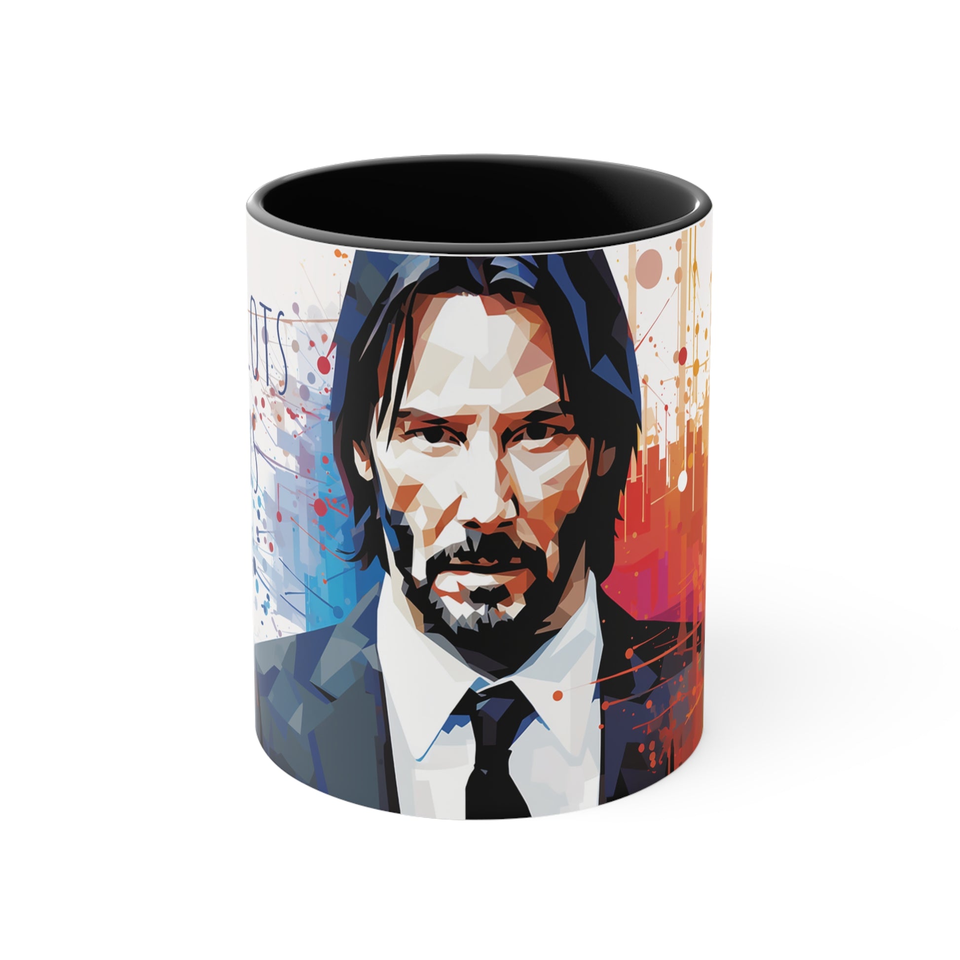 Keywords: John Wick mug, Geometric style, Bicolor design, Guns. Lots of Guns, Legendary assassin, Relentless pursuit, Power and intensity, Favorite beverage, Action-packed vibes, Movie fan, Coffee or tea, Drinkware collectible, Action lover vibes.
