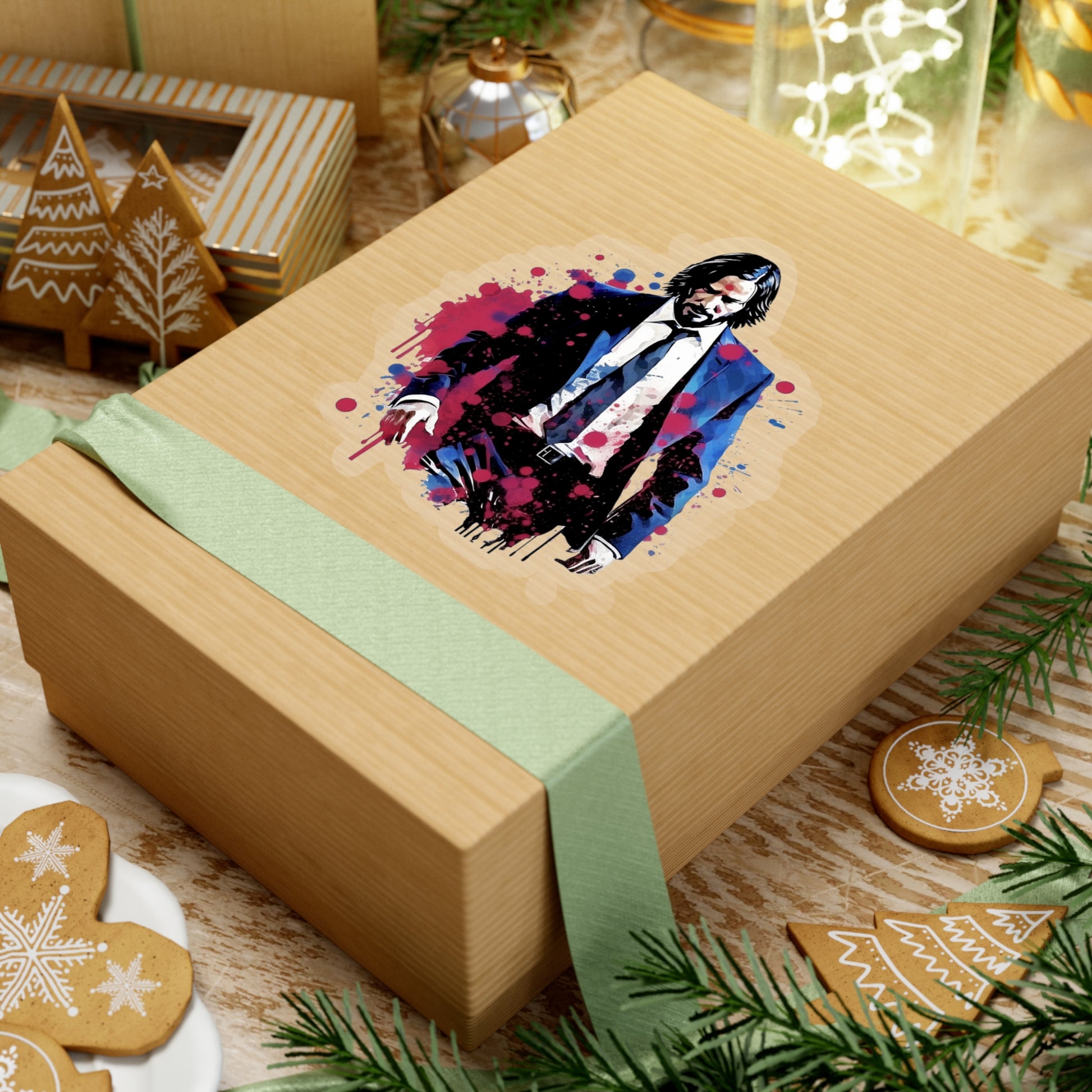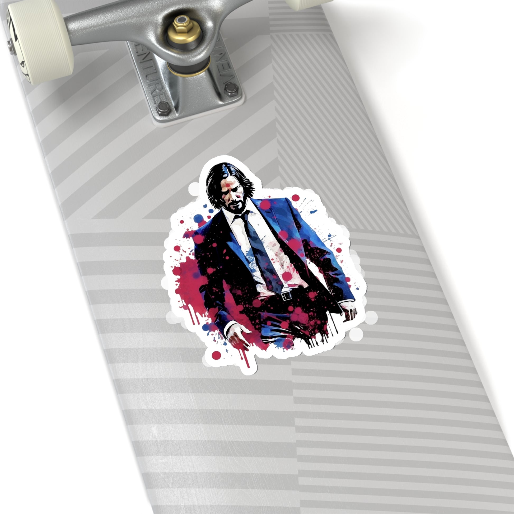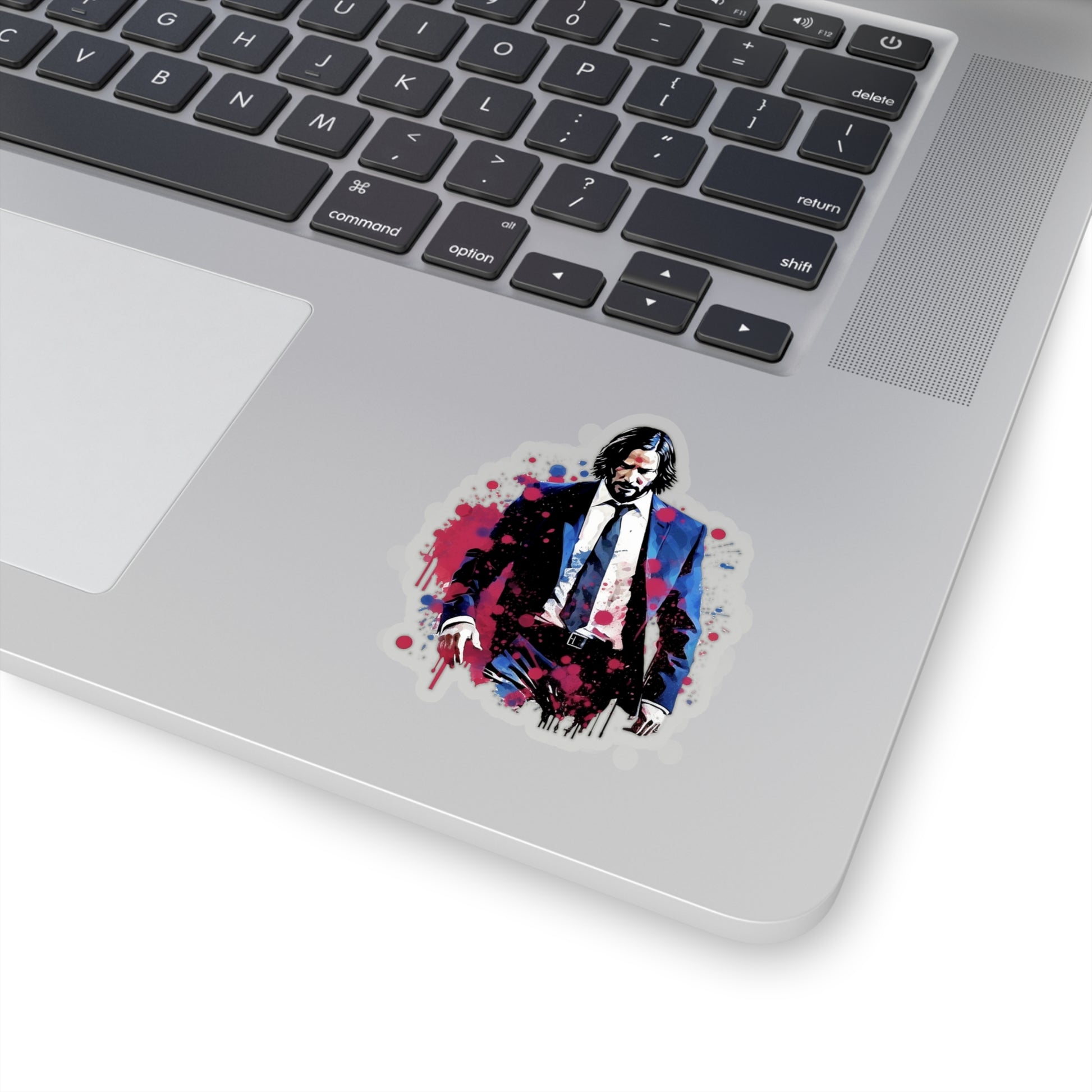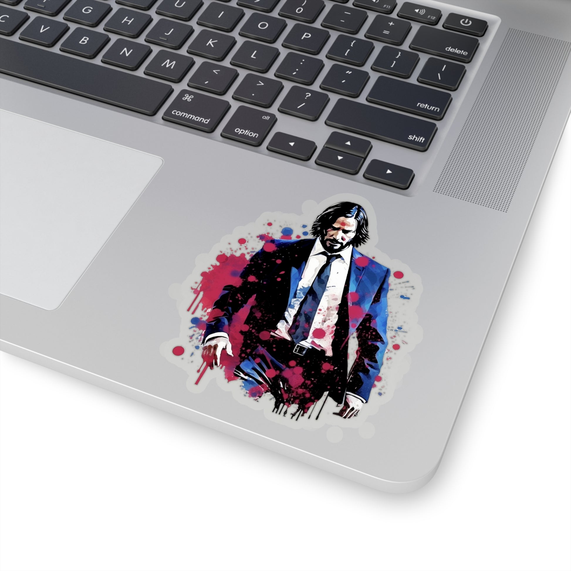 Keywords: John Wick sticker, watercolors style, high-quality design, iconic character, artistic flair, visually striking, laptop sticker, water bottle sticker, unique artwork.