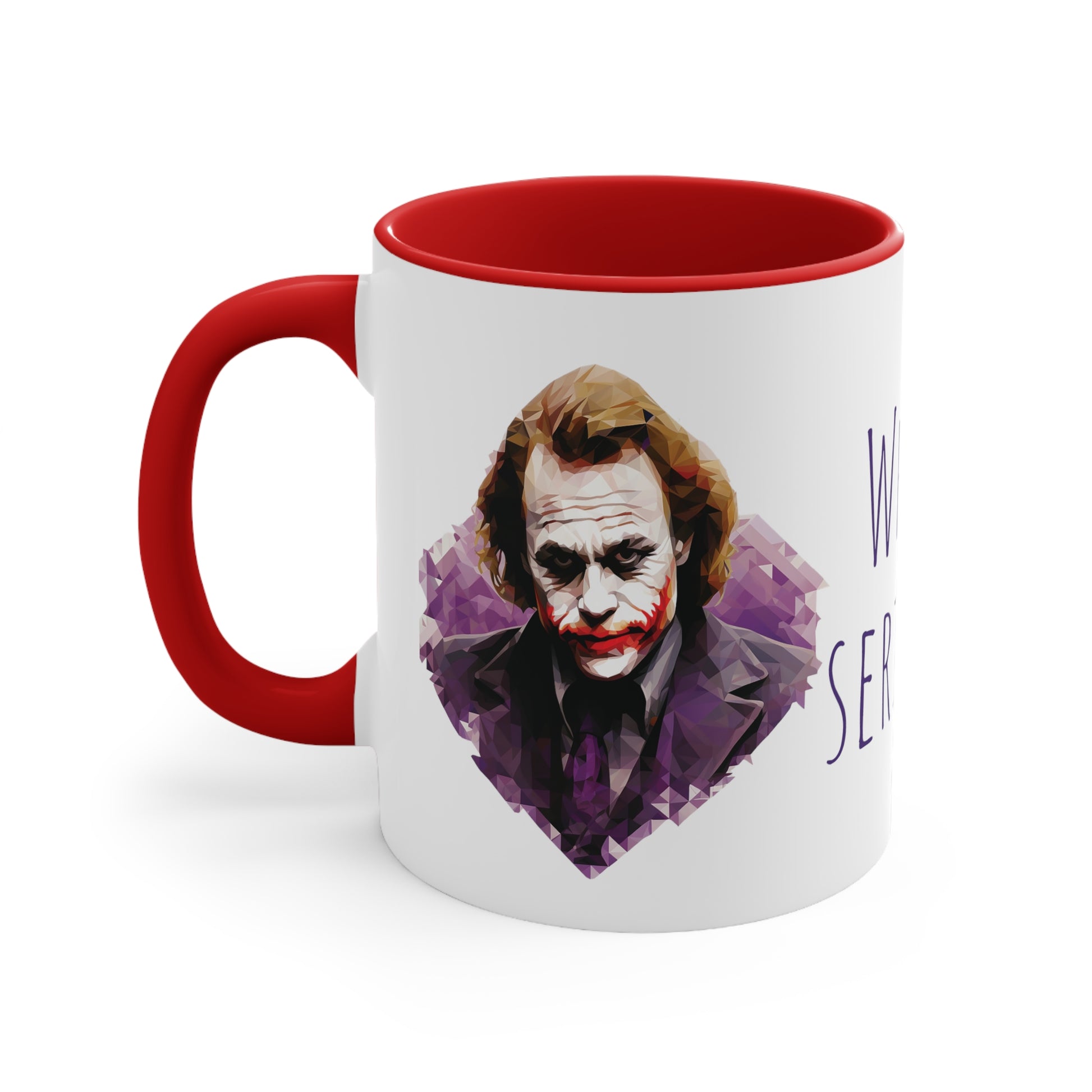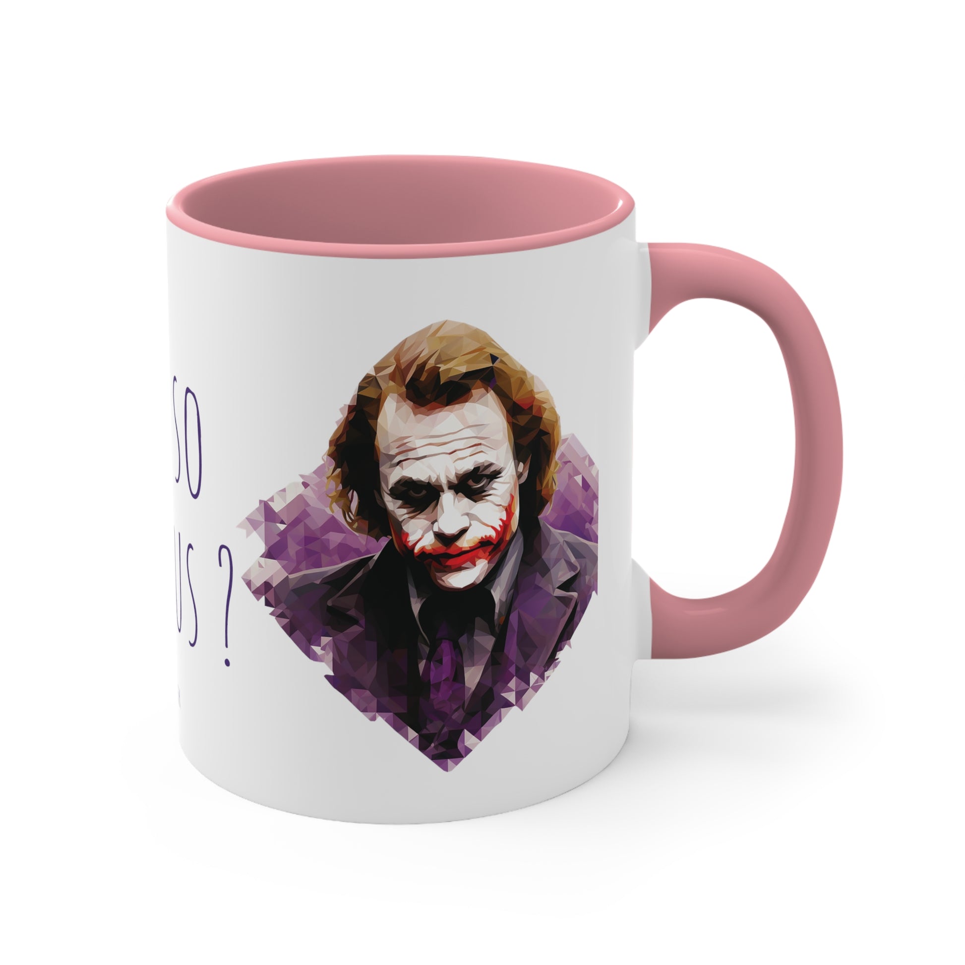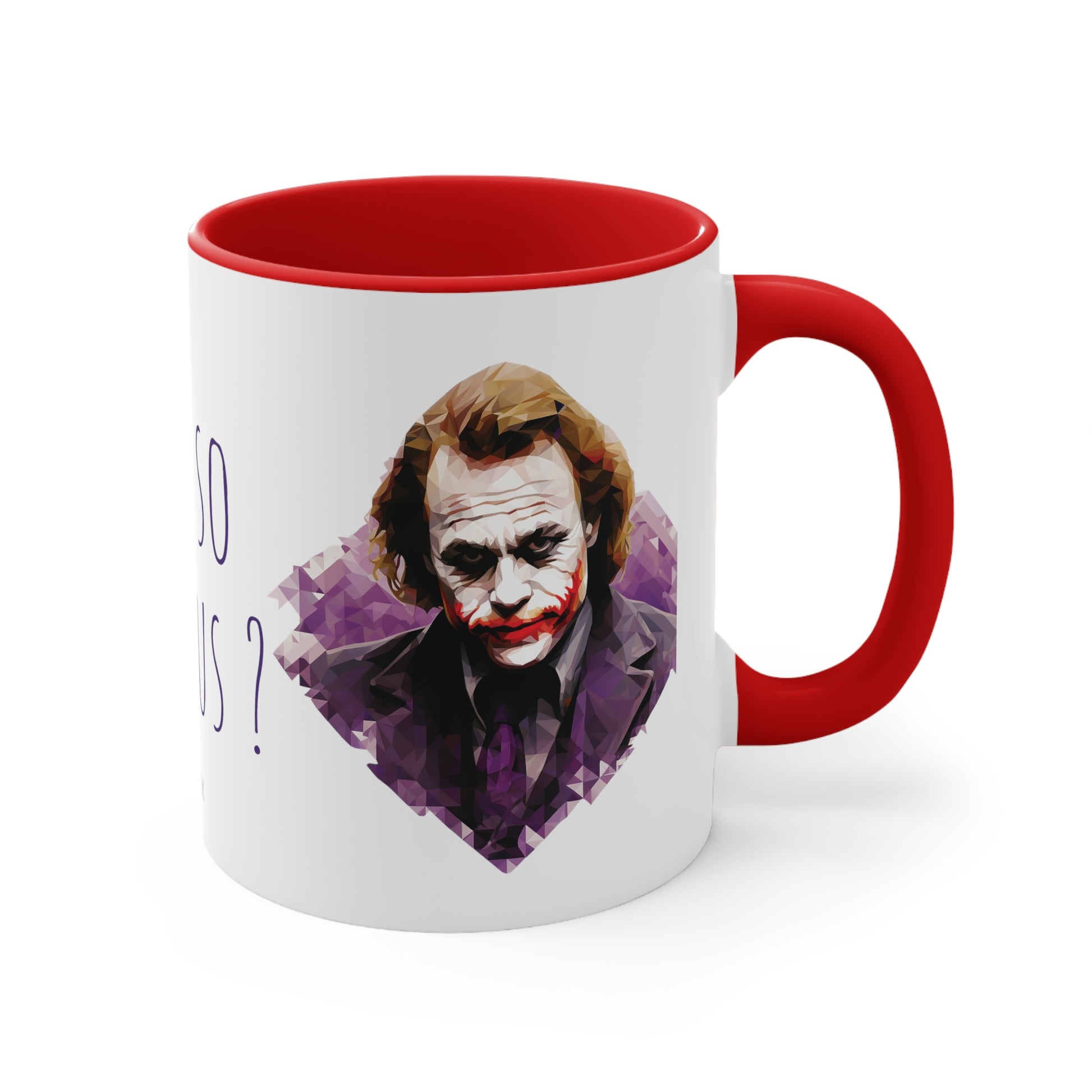 Keywords: Joker mug, Why so serious, Geometric style, Bicolor design, Quirky charm, Unique design, Enigmatic character, Bold colors, Coffee break, Tea time, Eccentricity, Beverage enjoyment, Collectible mug.