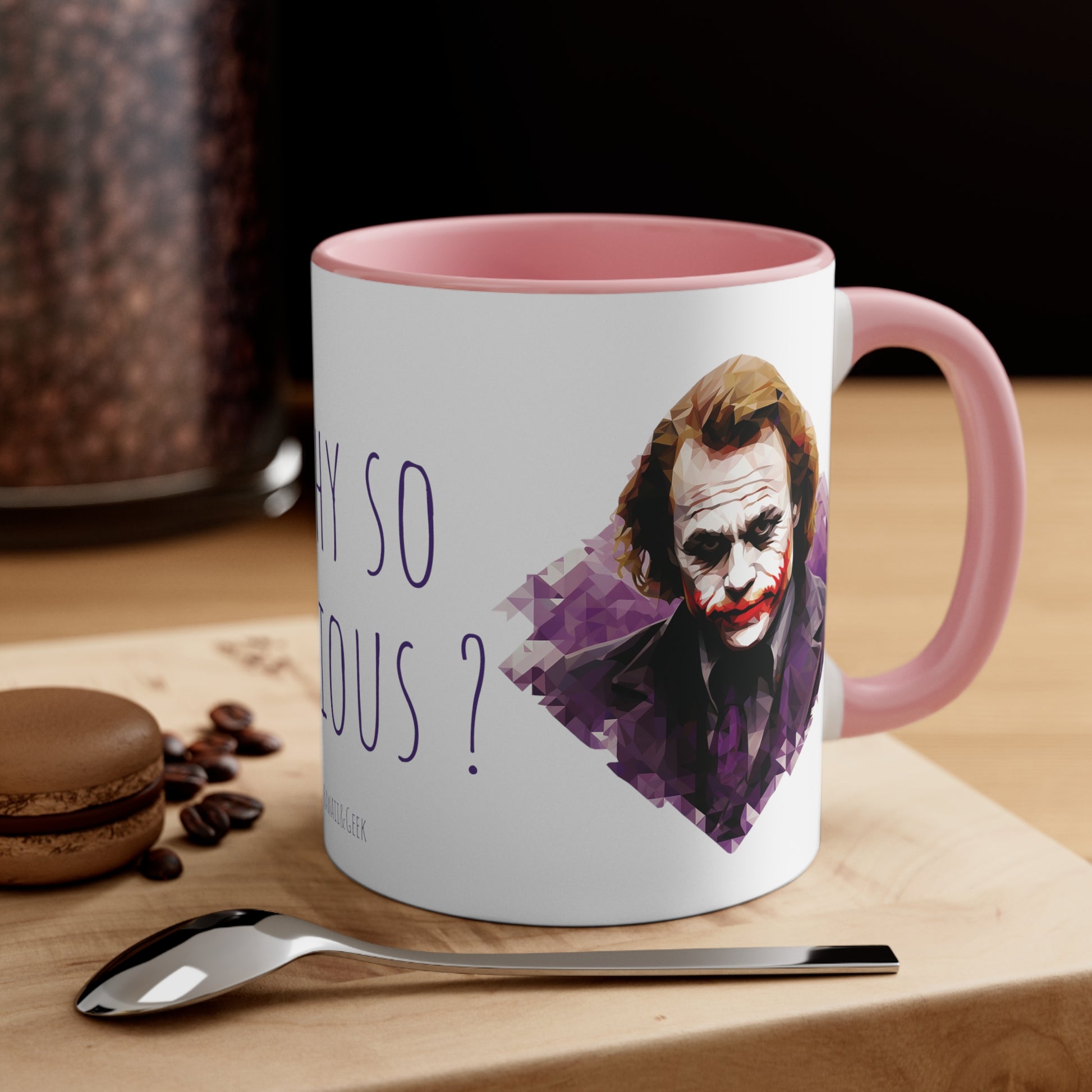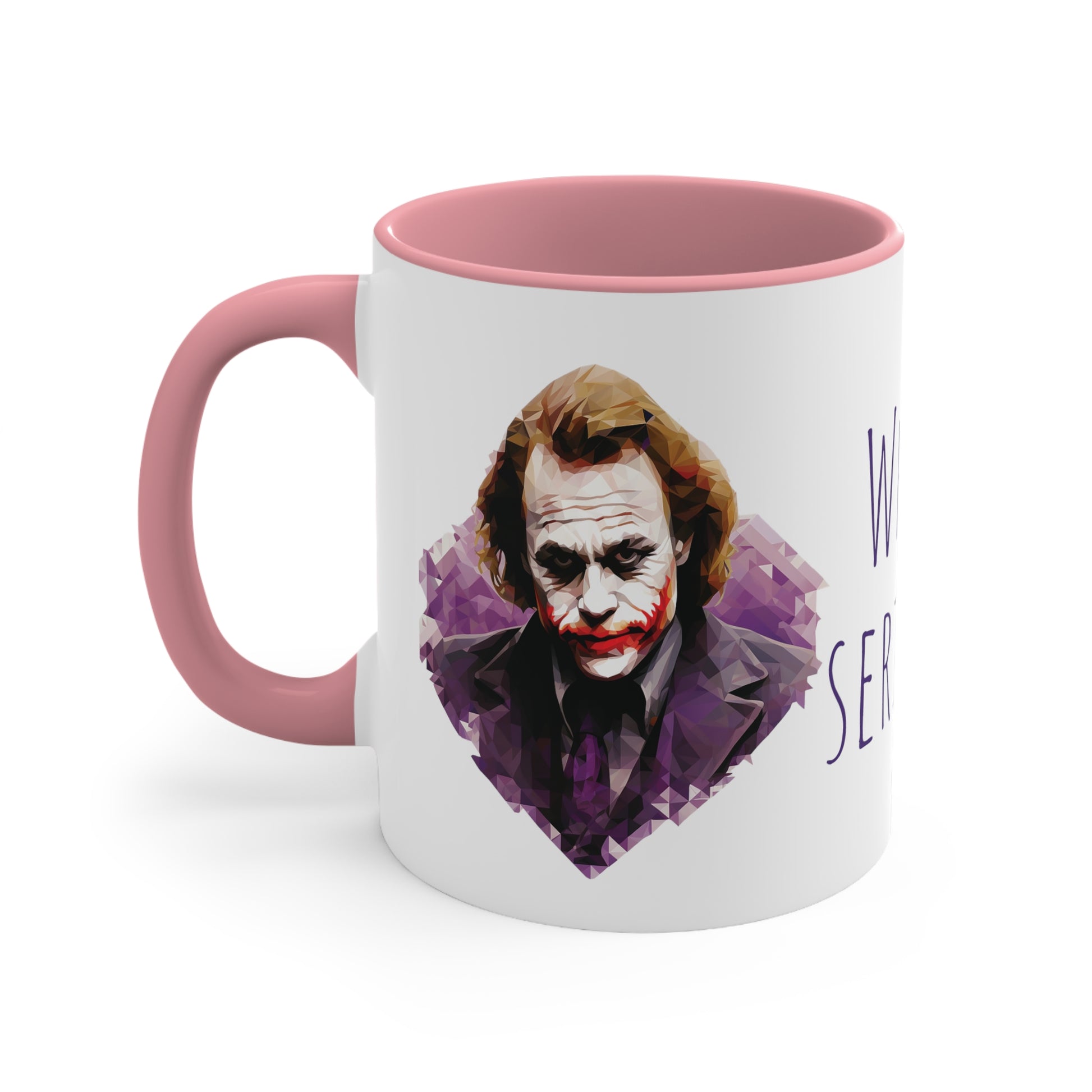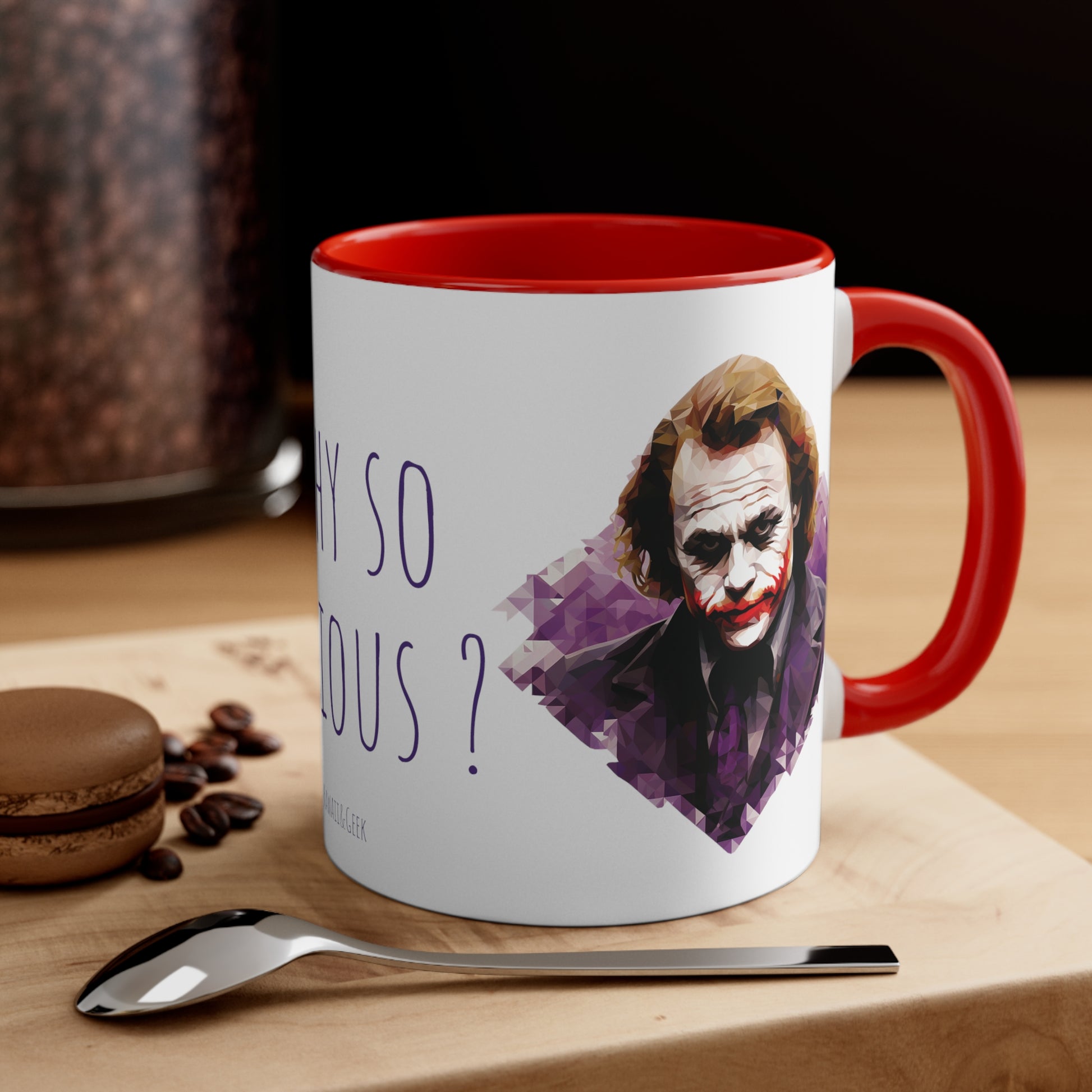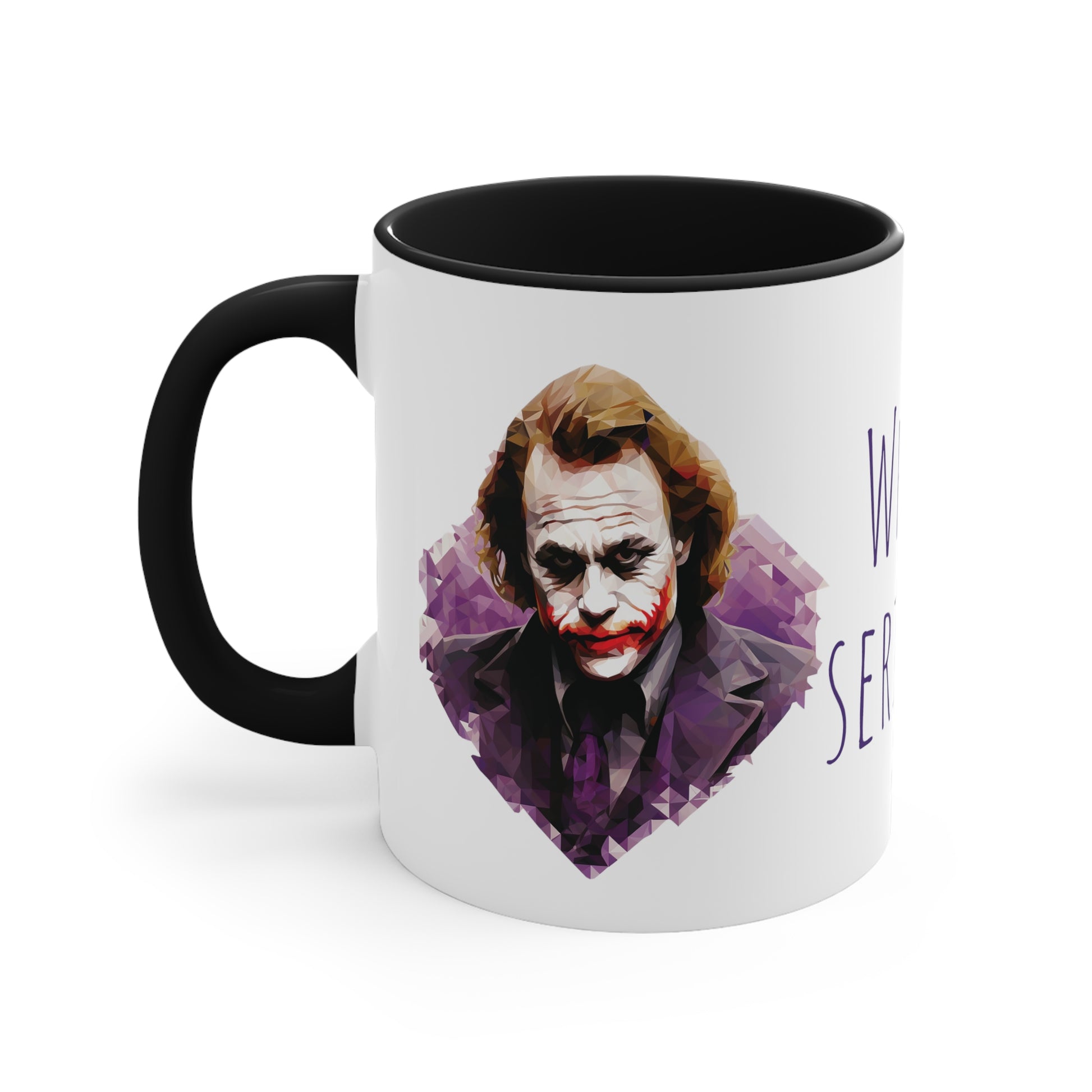 Keywords: Joker mug, Why so serious, Geometric style, Bicolor design, Quirky charm, Unique design, Enigmatic character, Bold colors, Coffee break, Tea time, Eccentricity, Beverage enjoyment, Collectible mug.