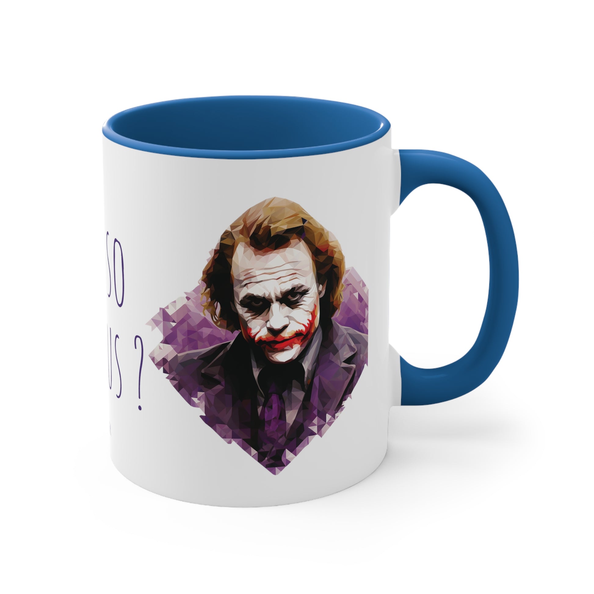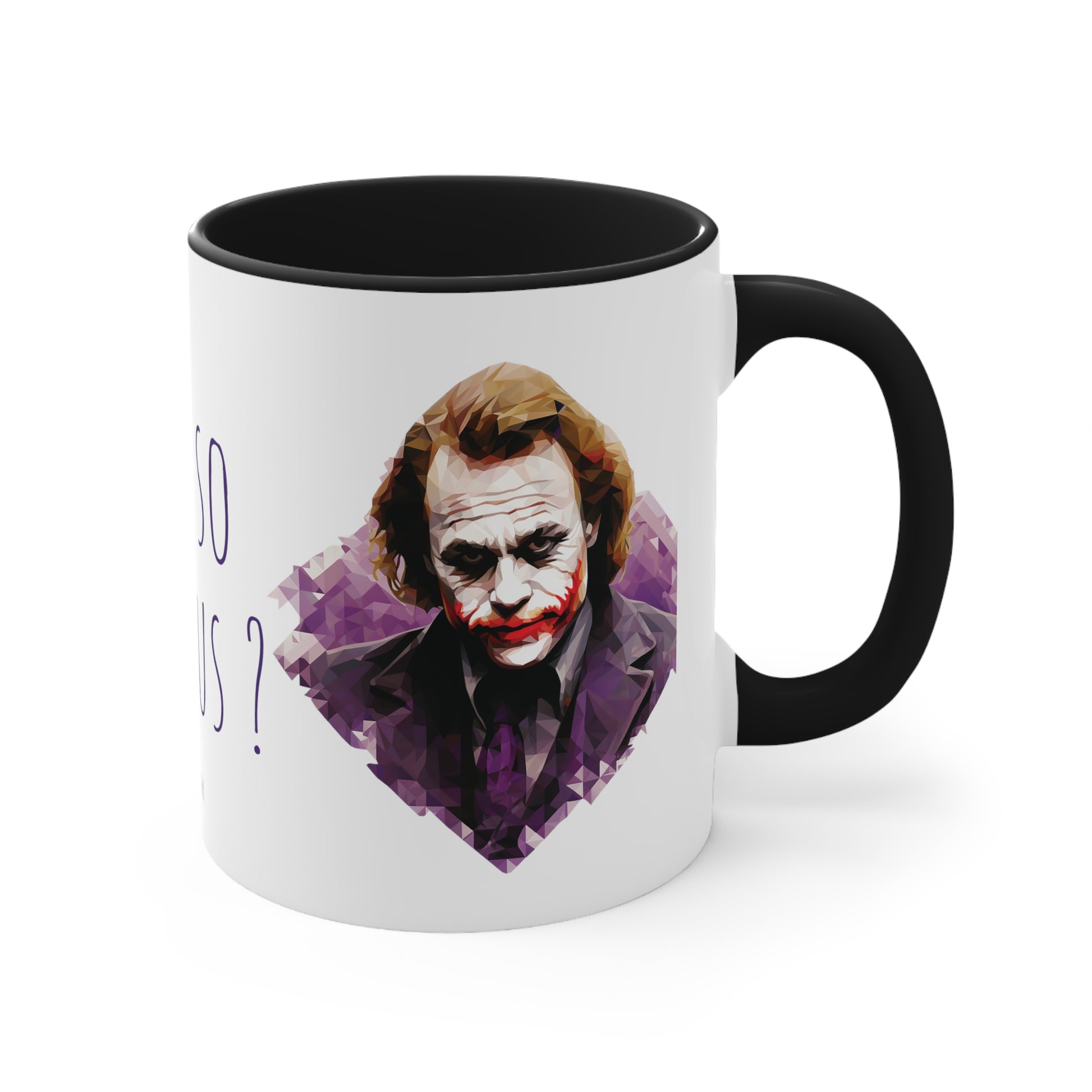Unleash your quirky side with every sip from this 11 oz bicolor mug featuring The Joker in a mesmerizing geometric style and the iconic "Why so serious" words. Let the unique design and bold colors bring a touch of enigmatic charm to your coffee or tea breaks. Get your Geometric Joker Why So Serious Bicolor Mug today and add a dash of eccentricity to your beverage enjoyment.