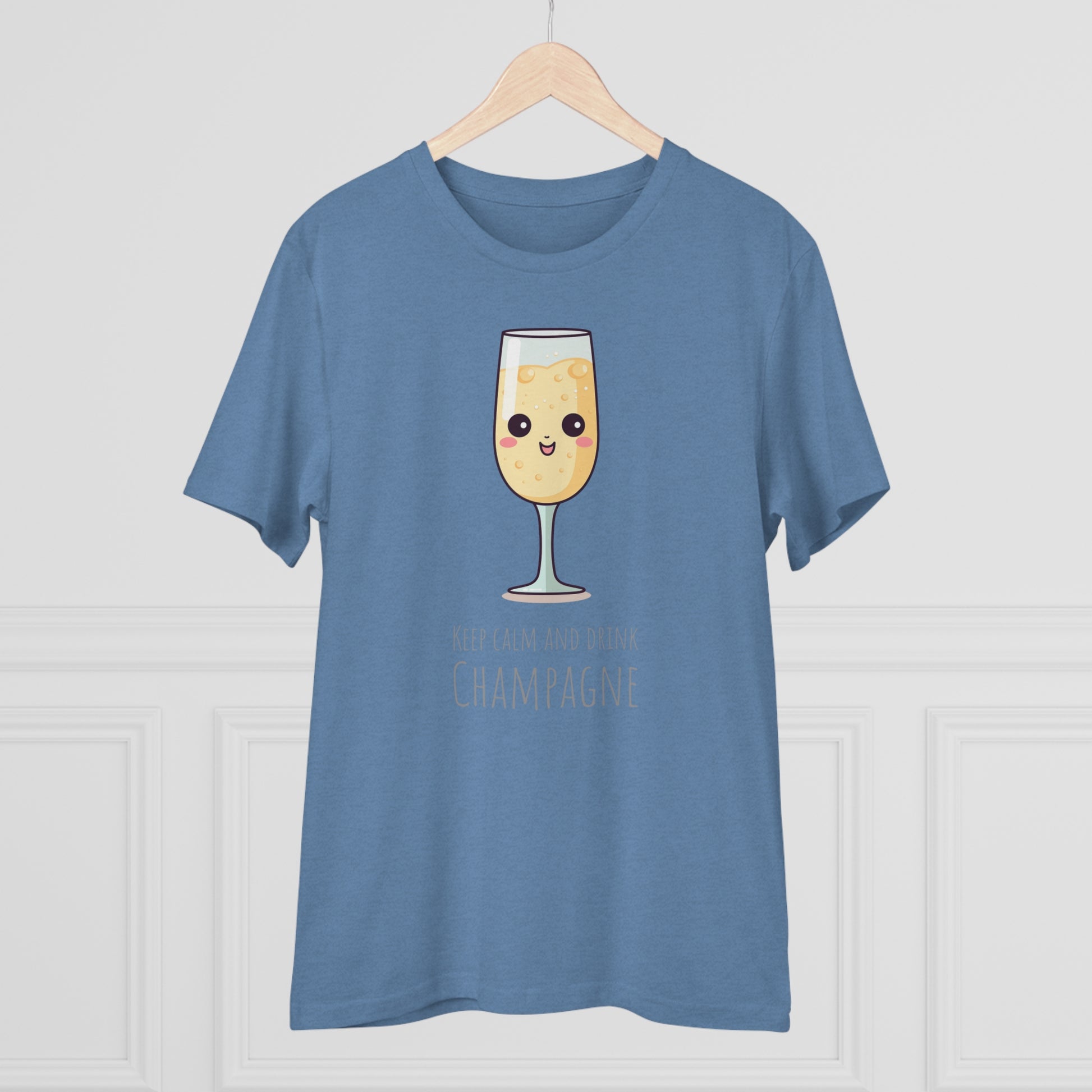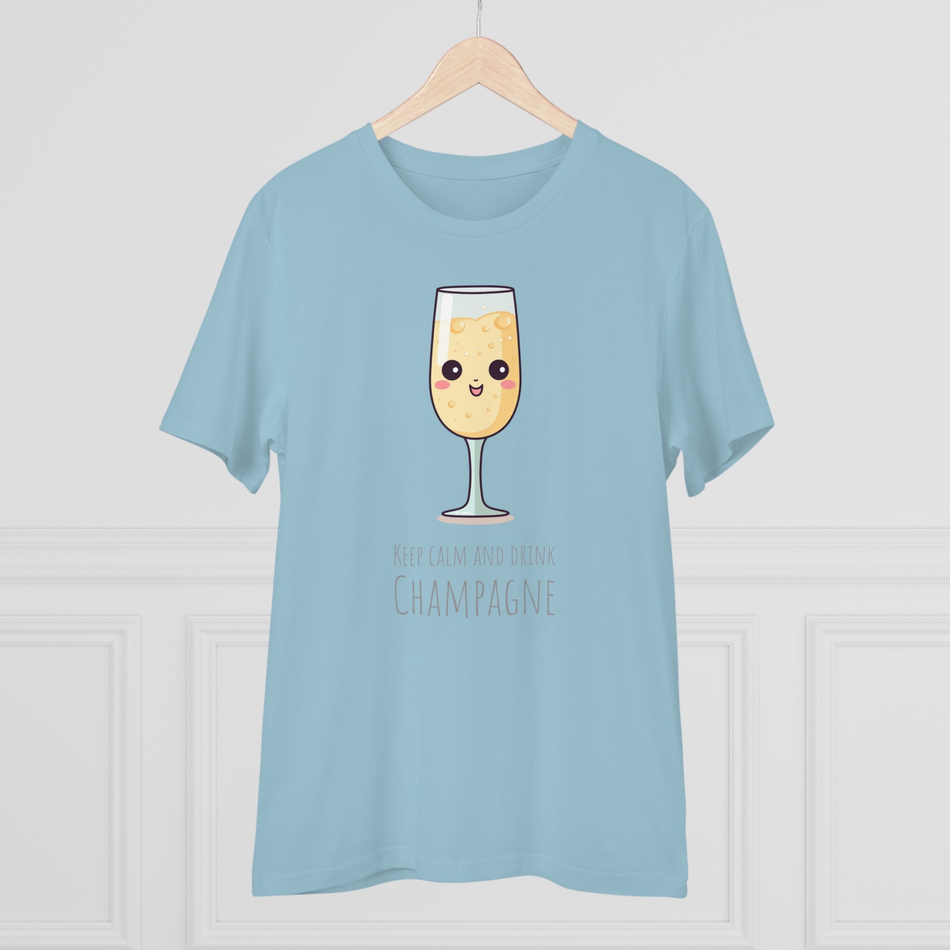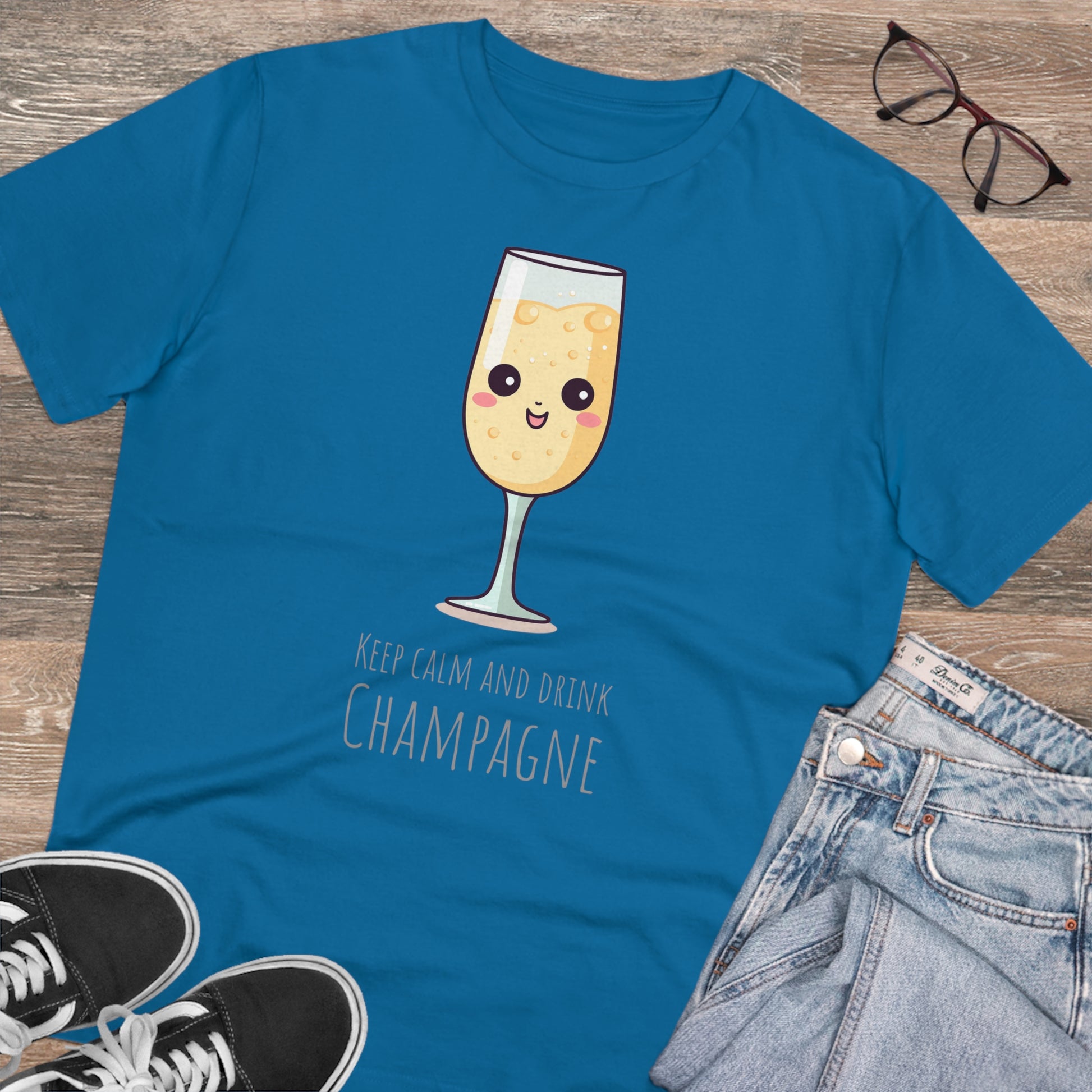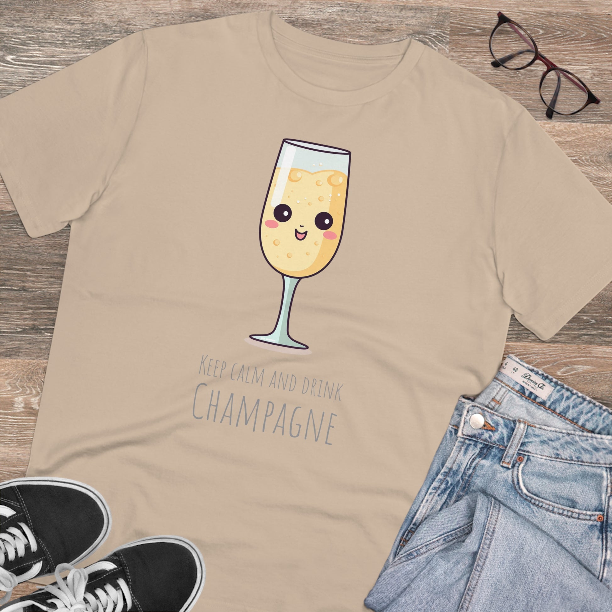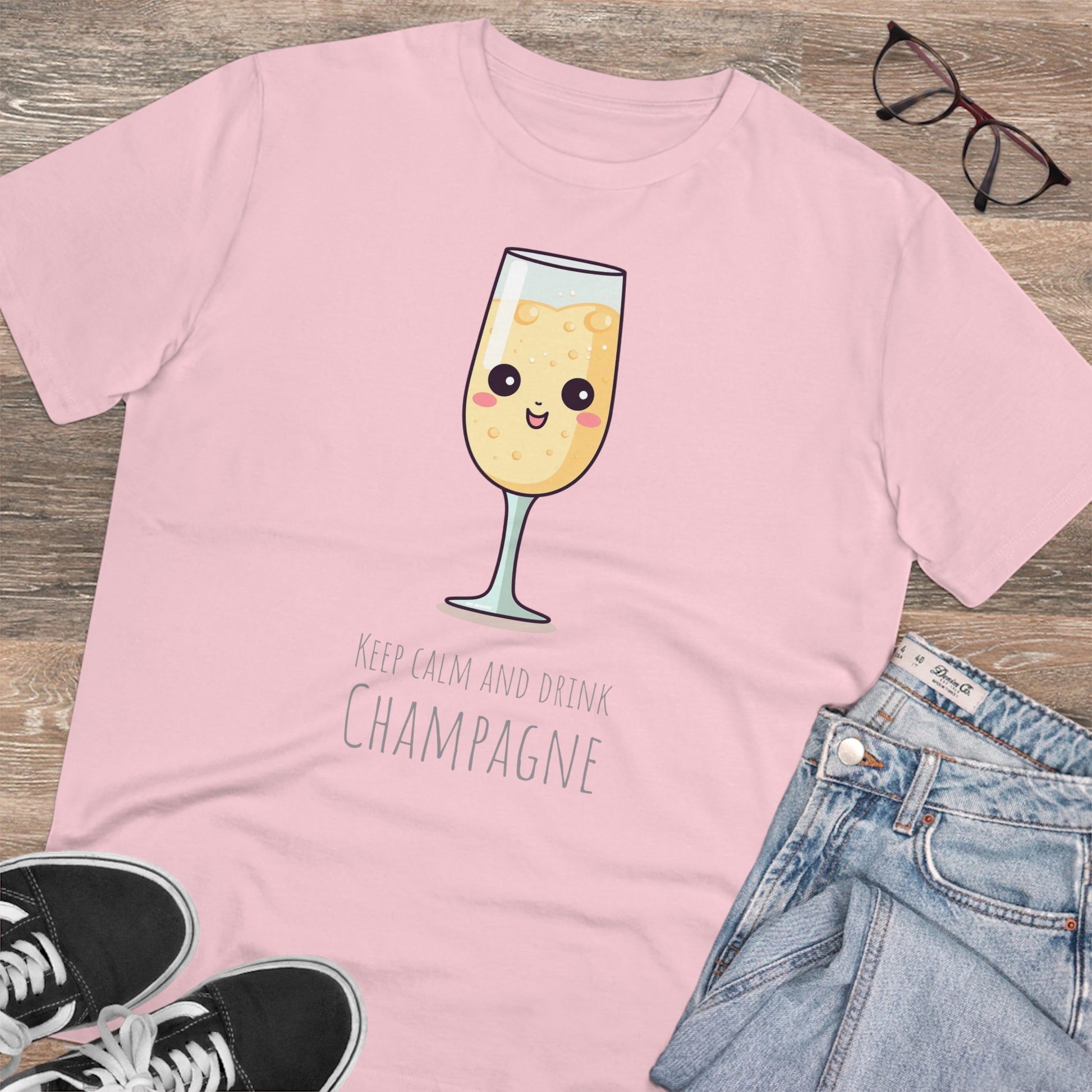 Keywords: Eco-friendly t-shirt, Sustainable fashion, Cute champagne glass, Keep calm and drink Champagne, Celebrate in style, Champagne lover, Sustainable clothing, Environmentally conscious, Eco-conscious design, Sustainable materials, Champagne celebrations, Eco-friendly apparel, Stylish and sustainable.