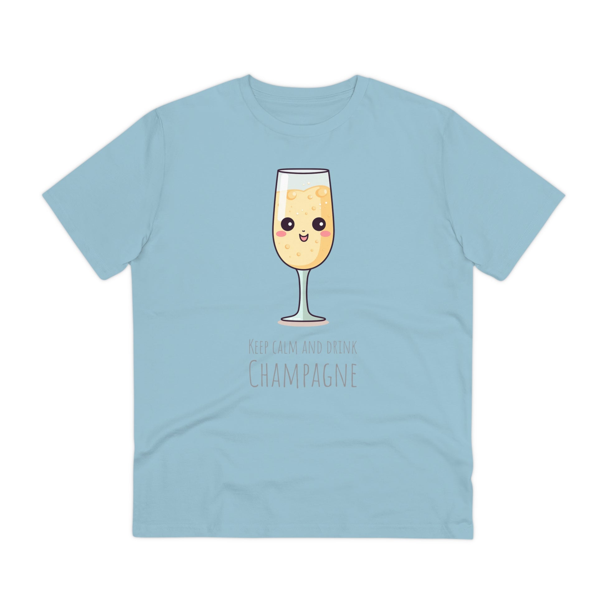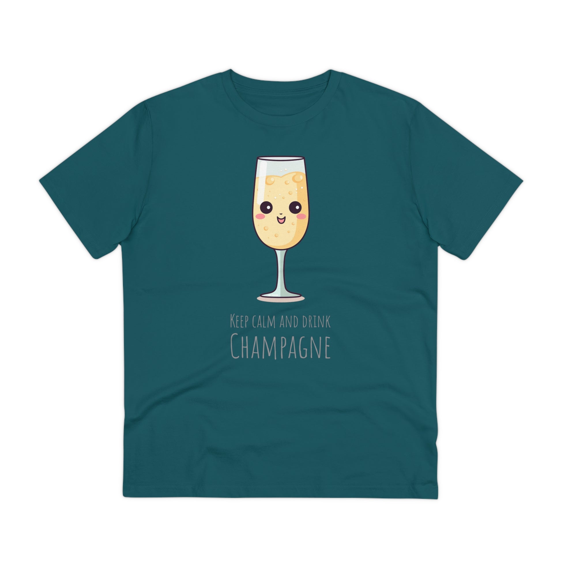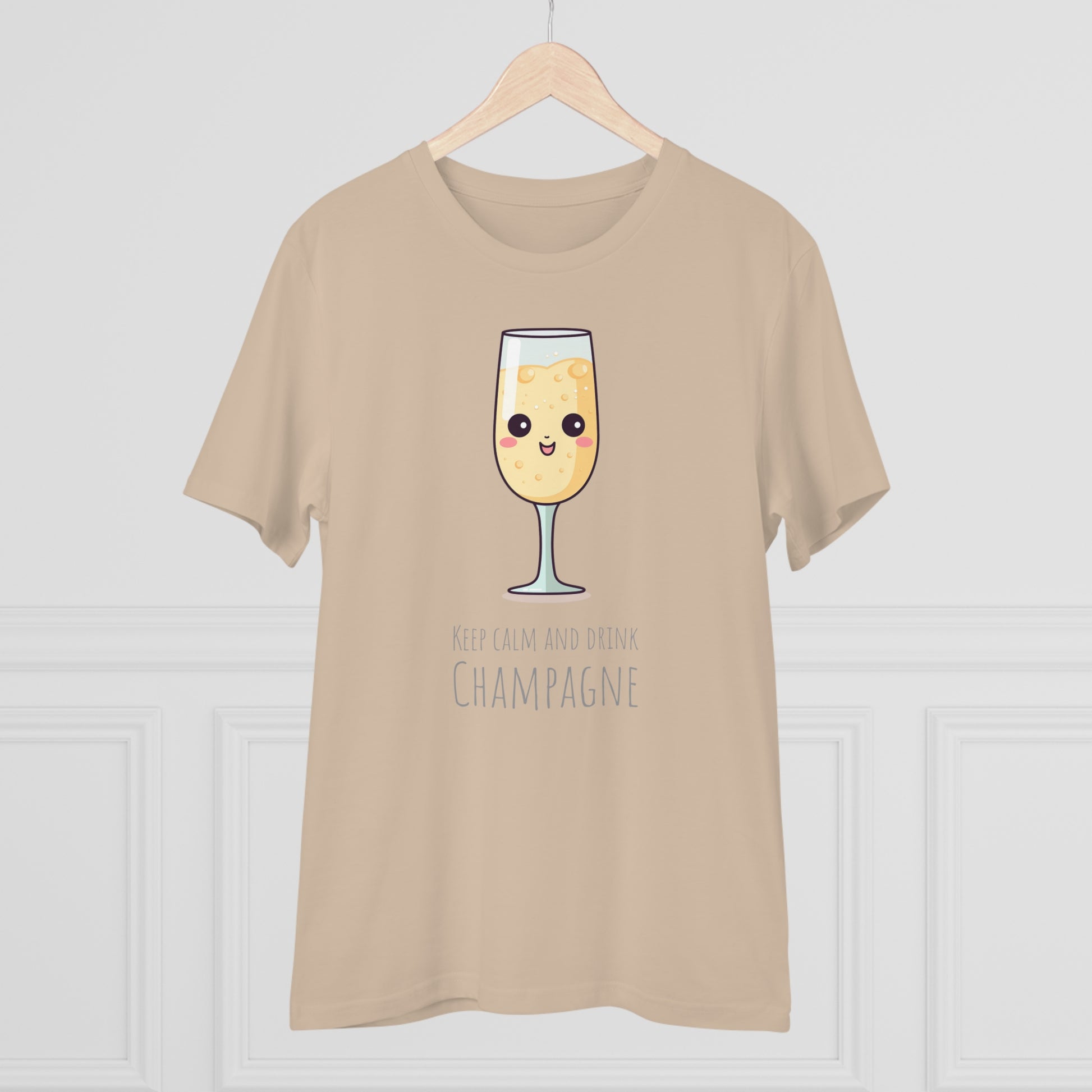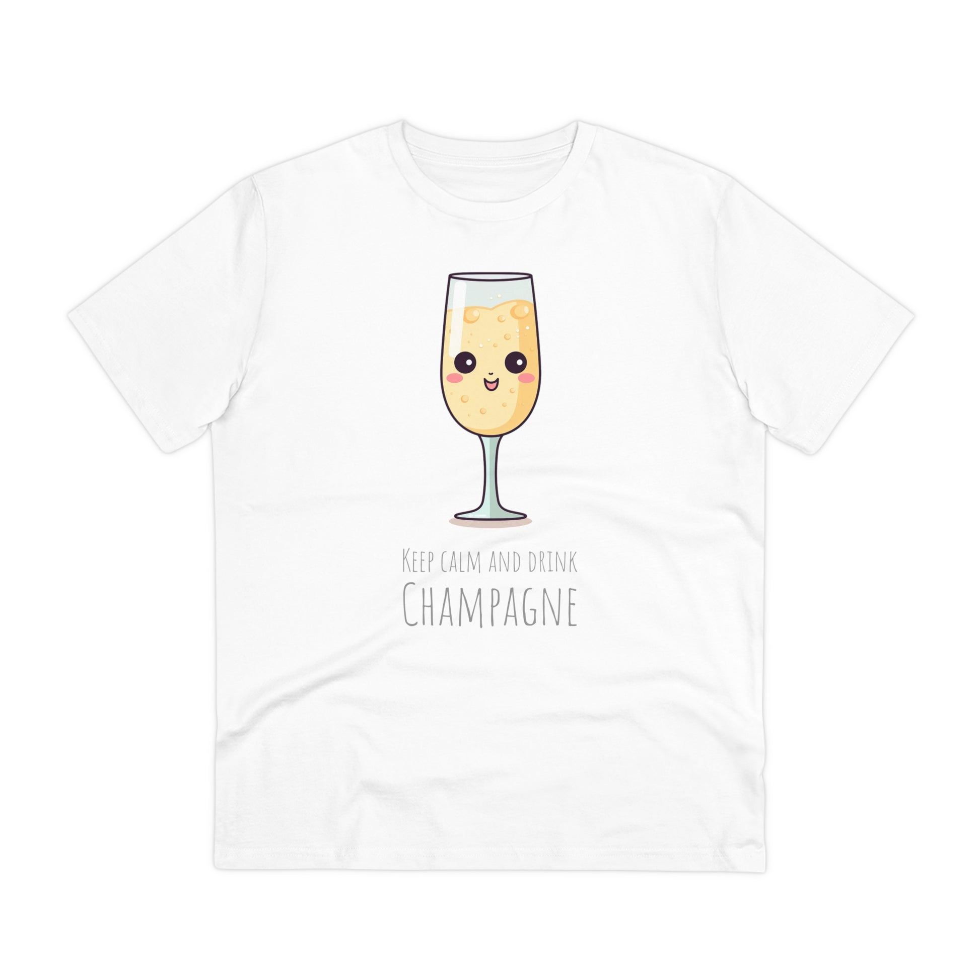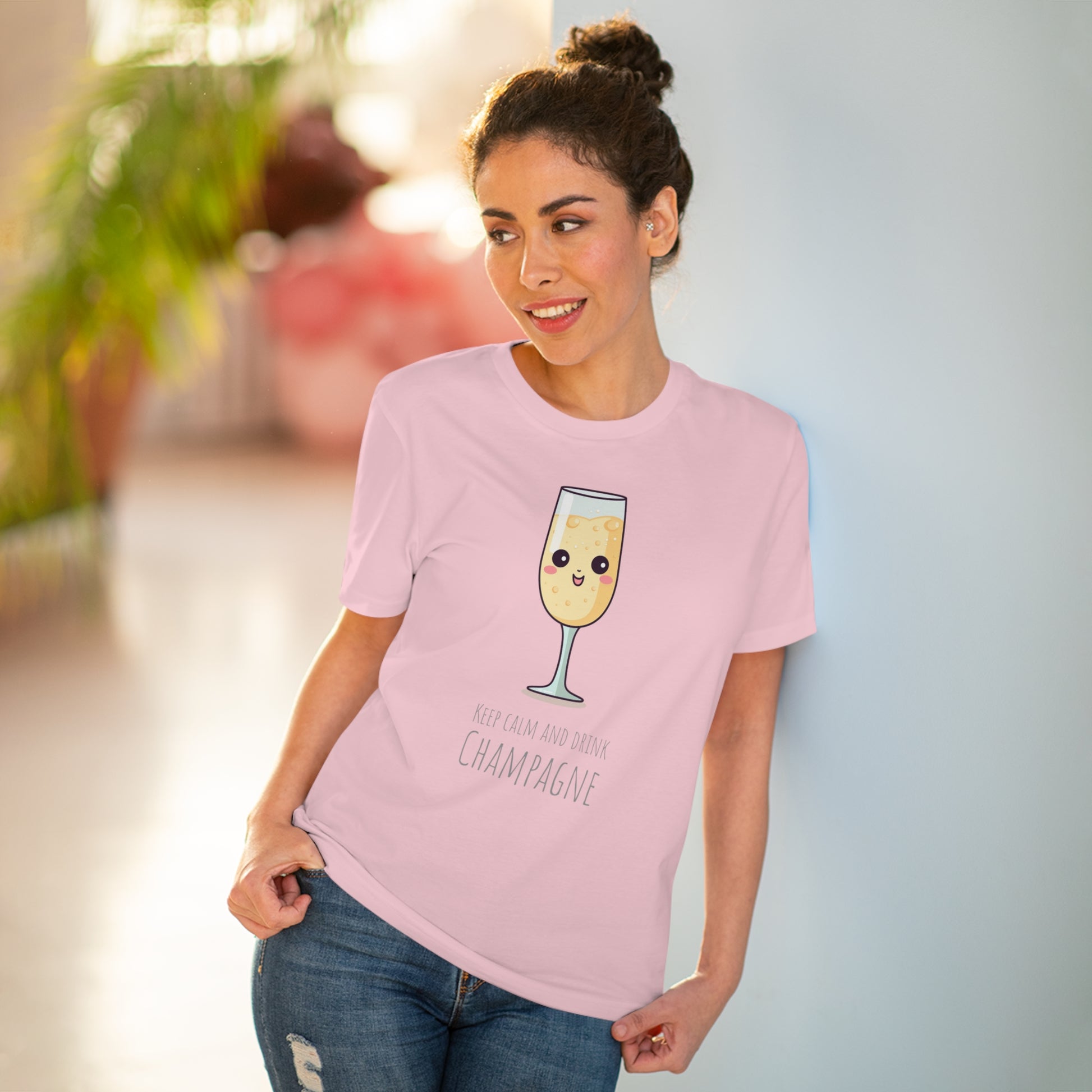 Keywords: Eco-friendly t-shirt, Sustainable fashion, Cute champagne glass, Keep calm and drink Champagne, Celebrate in style, Champagne lover, Sustainable clothing, Environmentally conscious, Eco-conscious design, Sustainable materials, Champagne celebrations, Eco-friendly apparel, Stylish and sustainable.