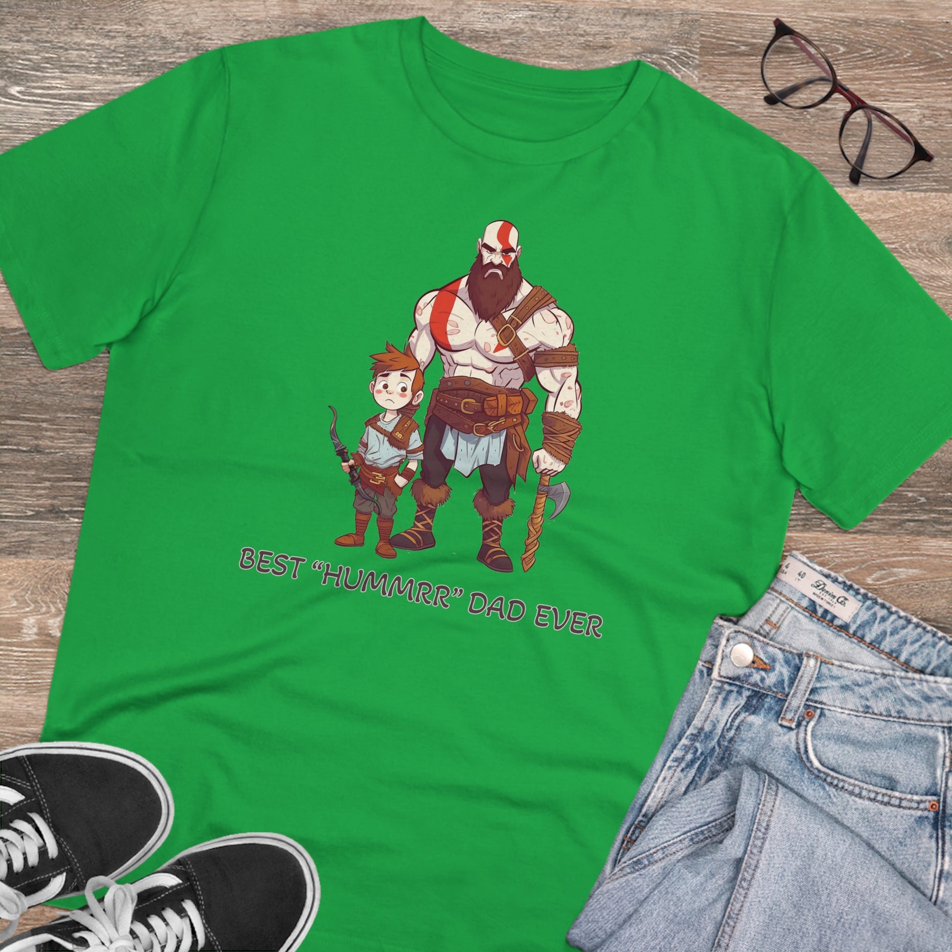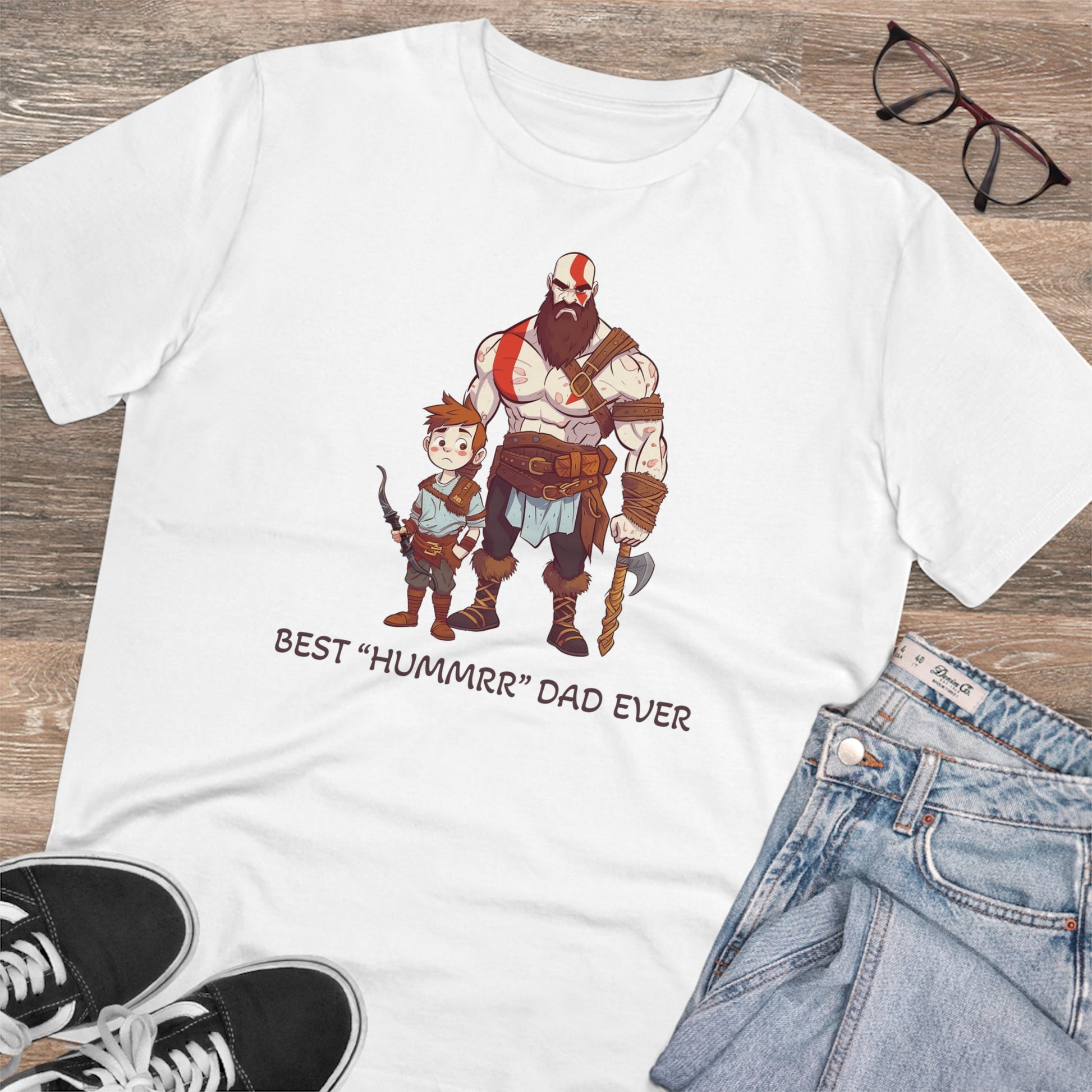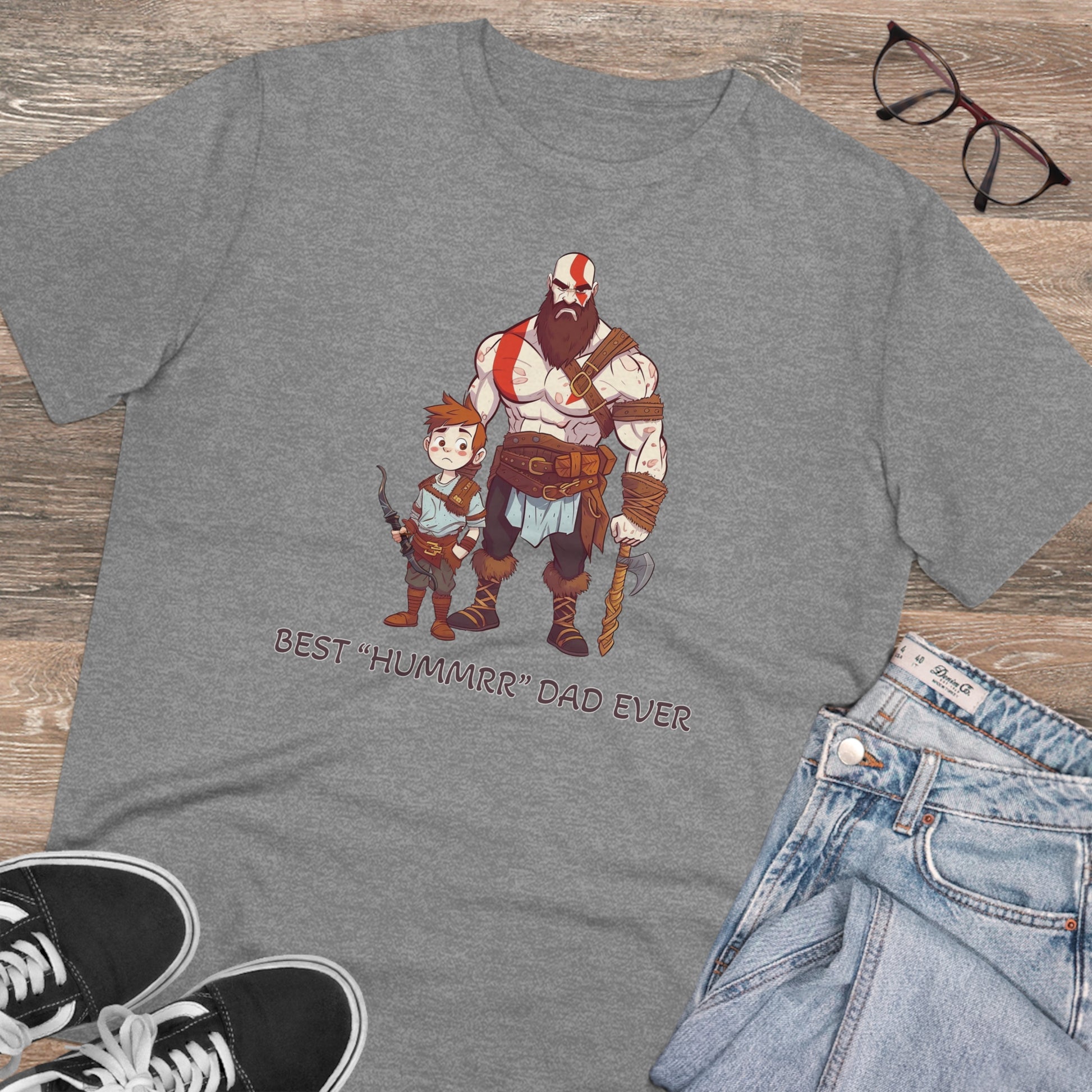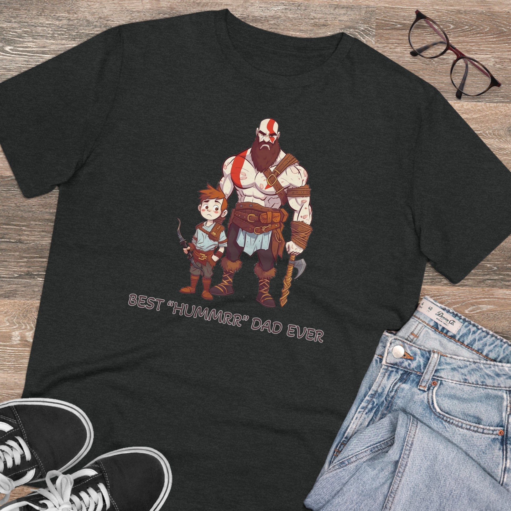 Keywords: Hummrr Dad t-shirt, Father's Day gift, eco-friendly fashion, sustainable materials, Cute Kratos and Atreus design, playful t-shirt, unisex fashion.