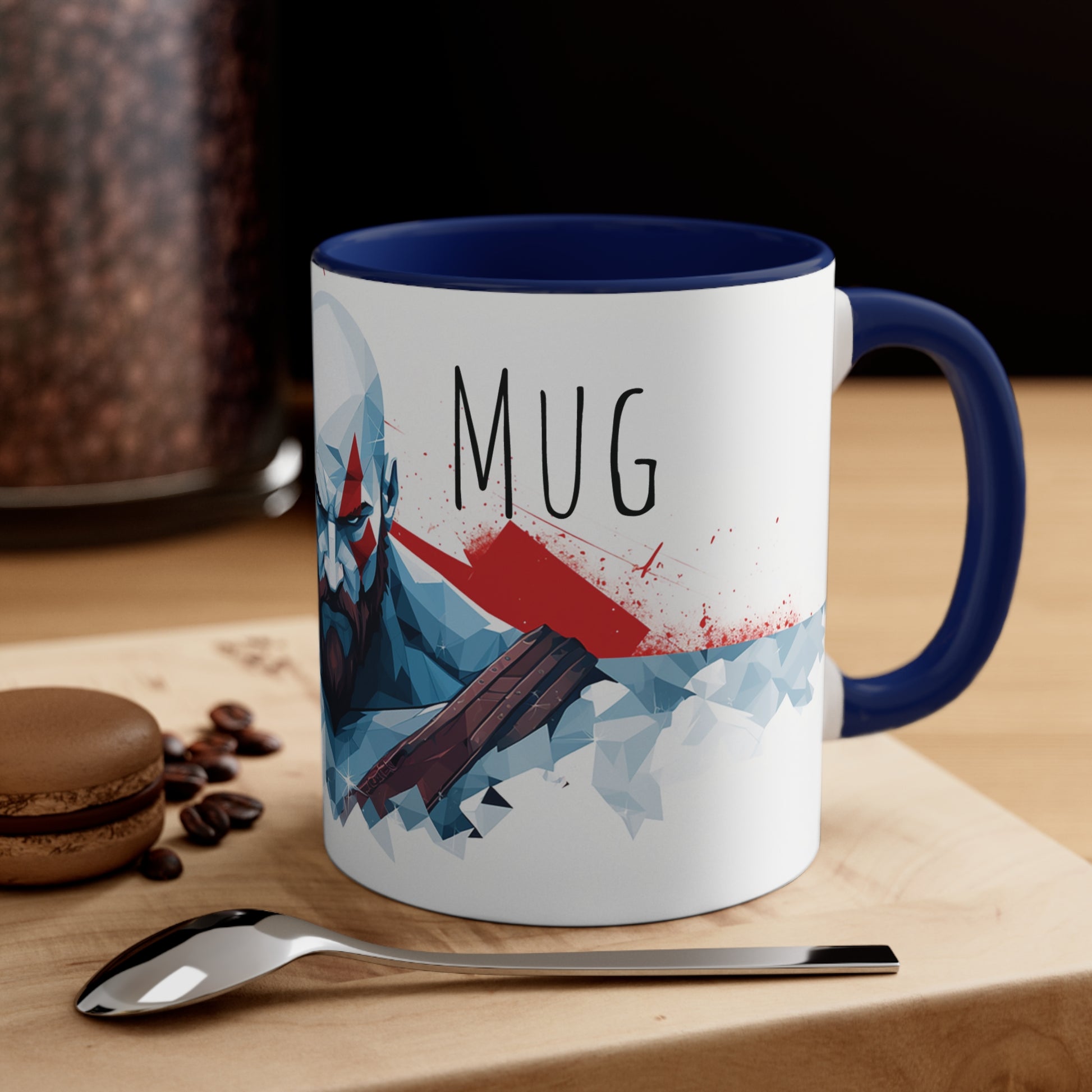Keywords: Kratos mug, geometric style, God of War, warrior, video game, collectible, high-quality, durable, daily use, iconic character, bold design, Kratos's Mug, fan merchandise, gaming accessory.