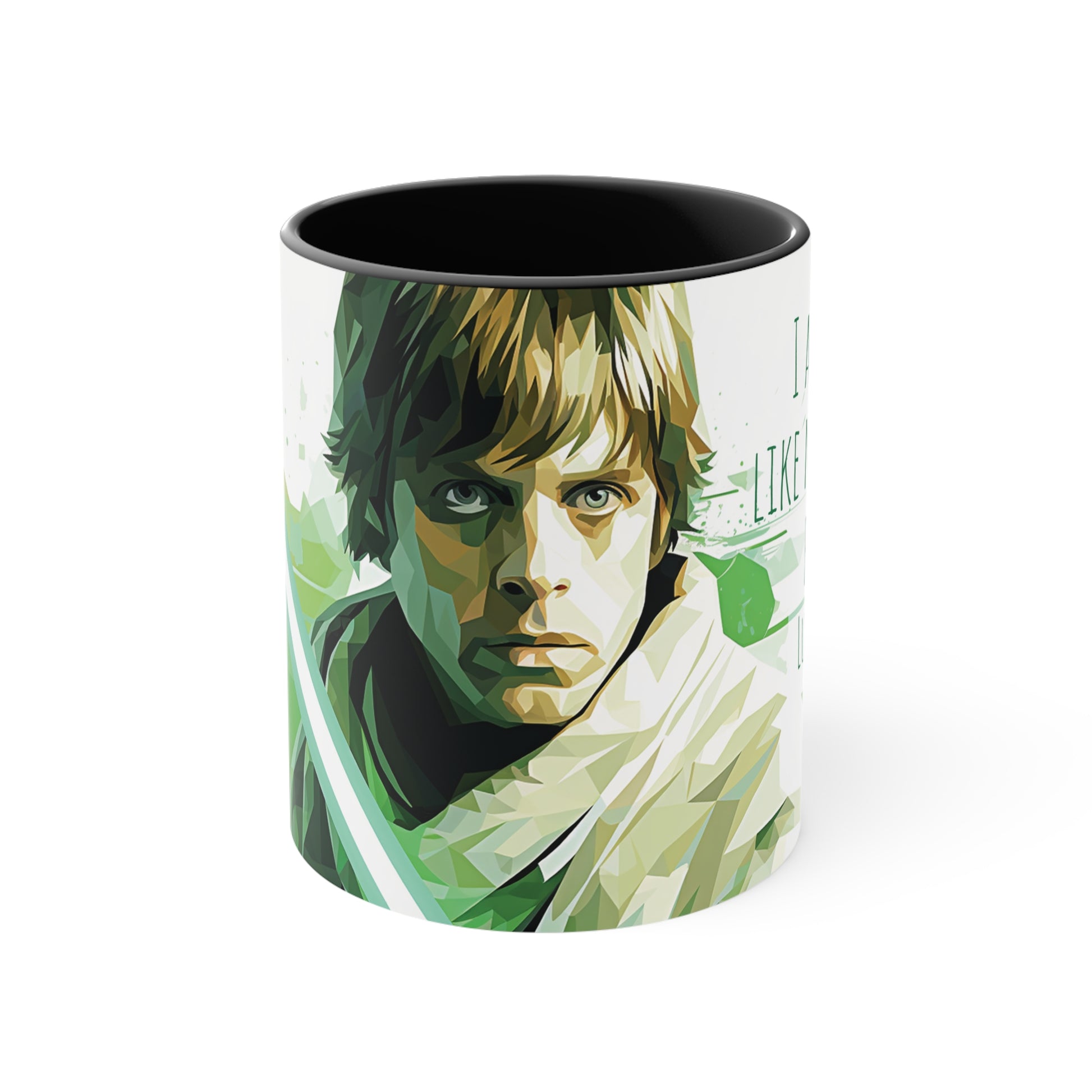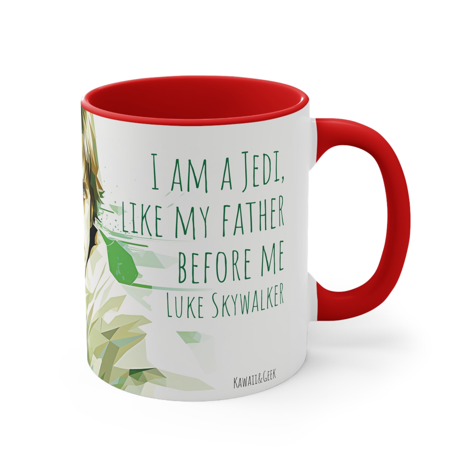 Keywords: Luke Skywalker mug, Geometric style, Bicolor design, I Am a Jedi, Legacy, Hero's journey, Skywalker lineage, Force awakening, Favorite beverage, Movie fan, Coffee or tea, Drinkware collectible, Star Wars fan.