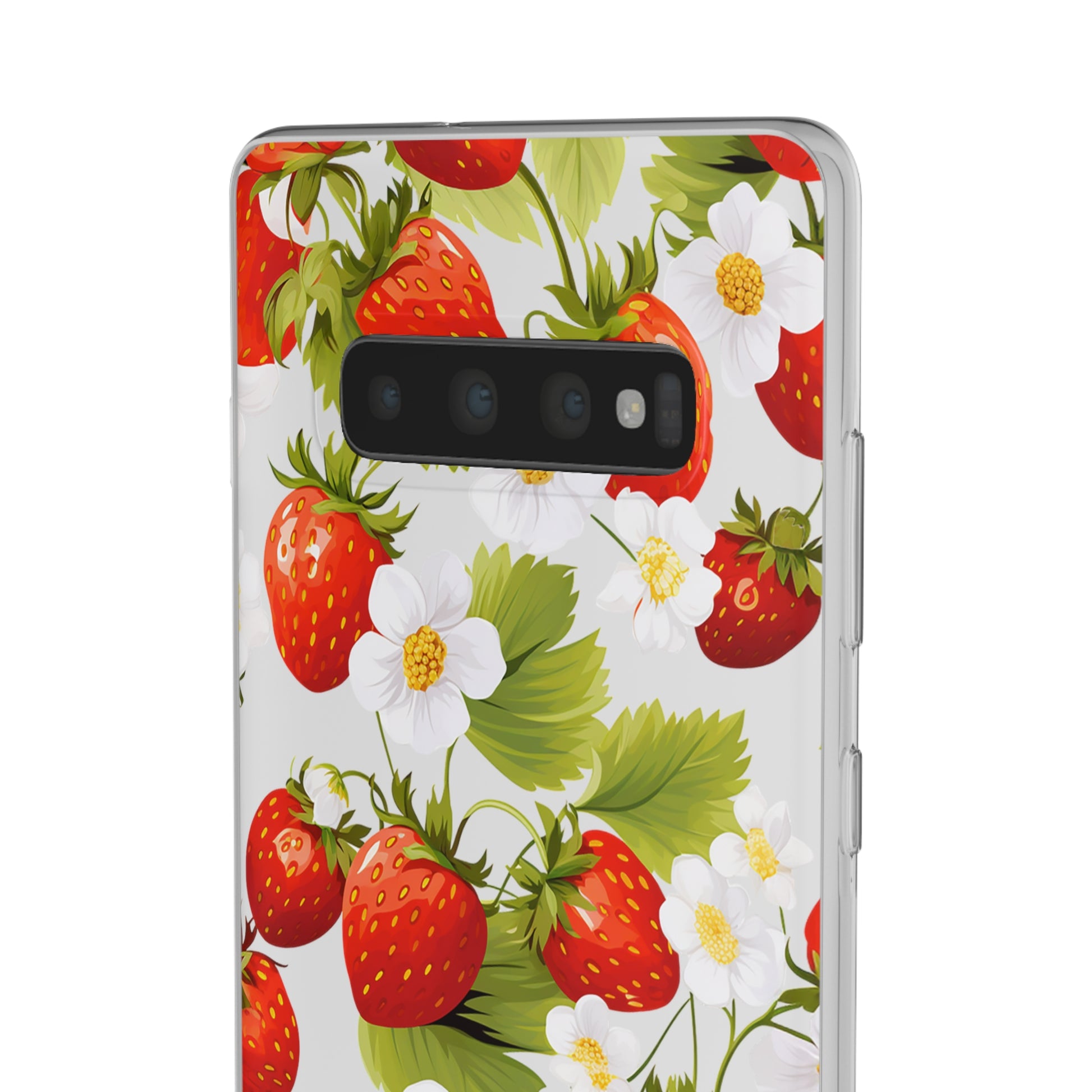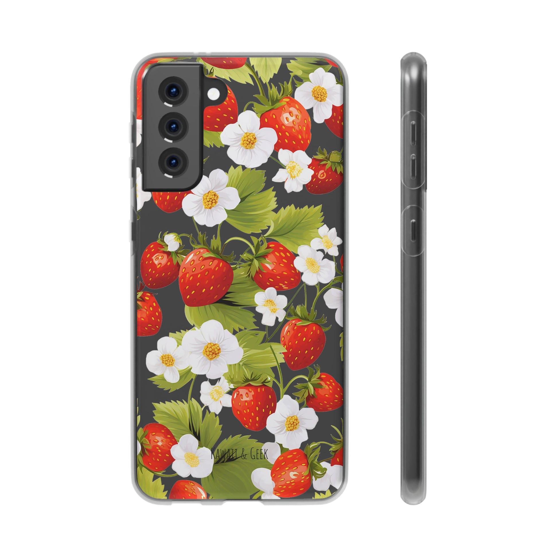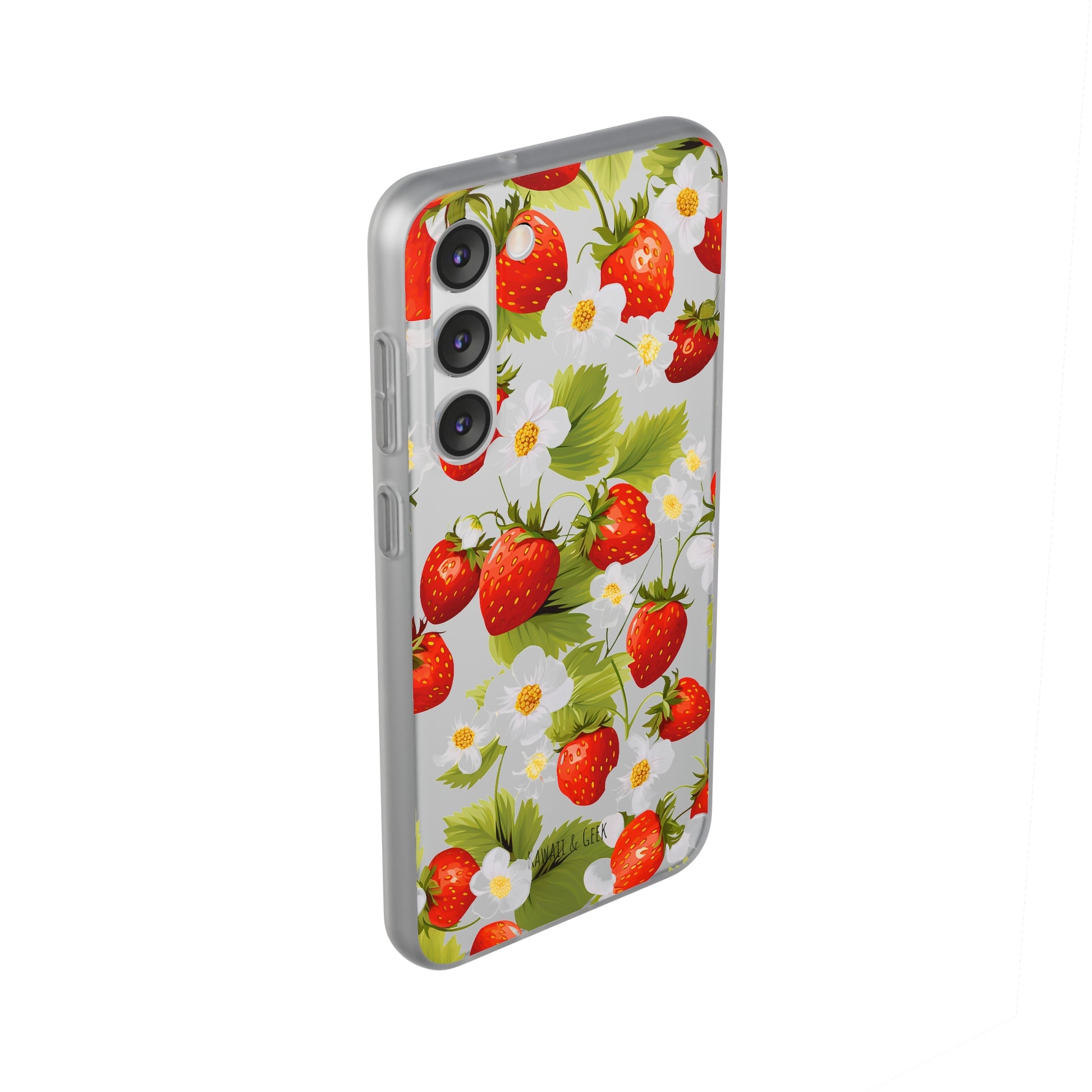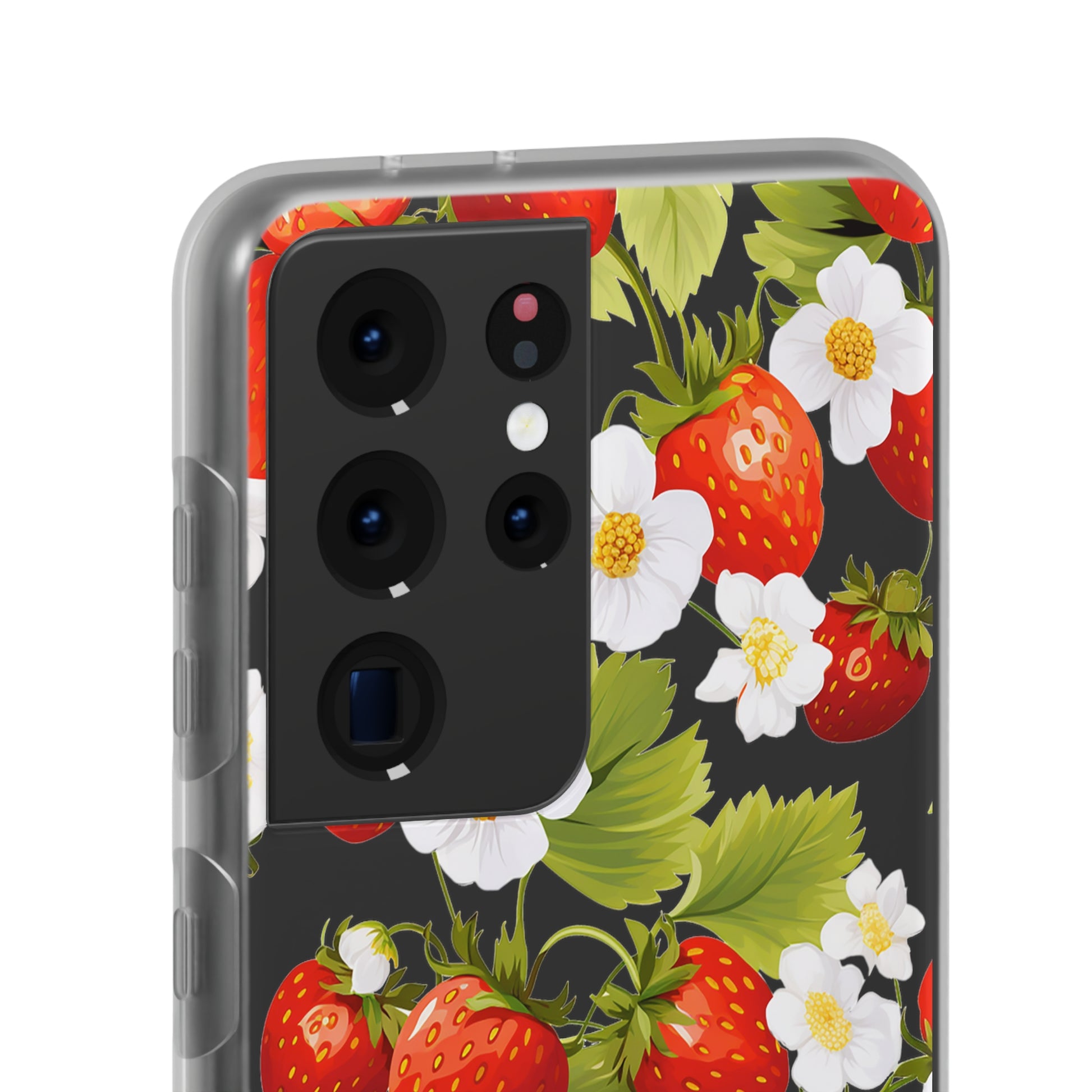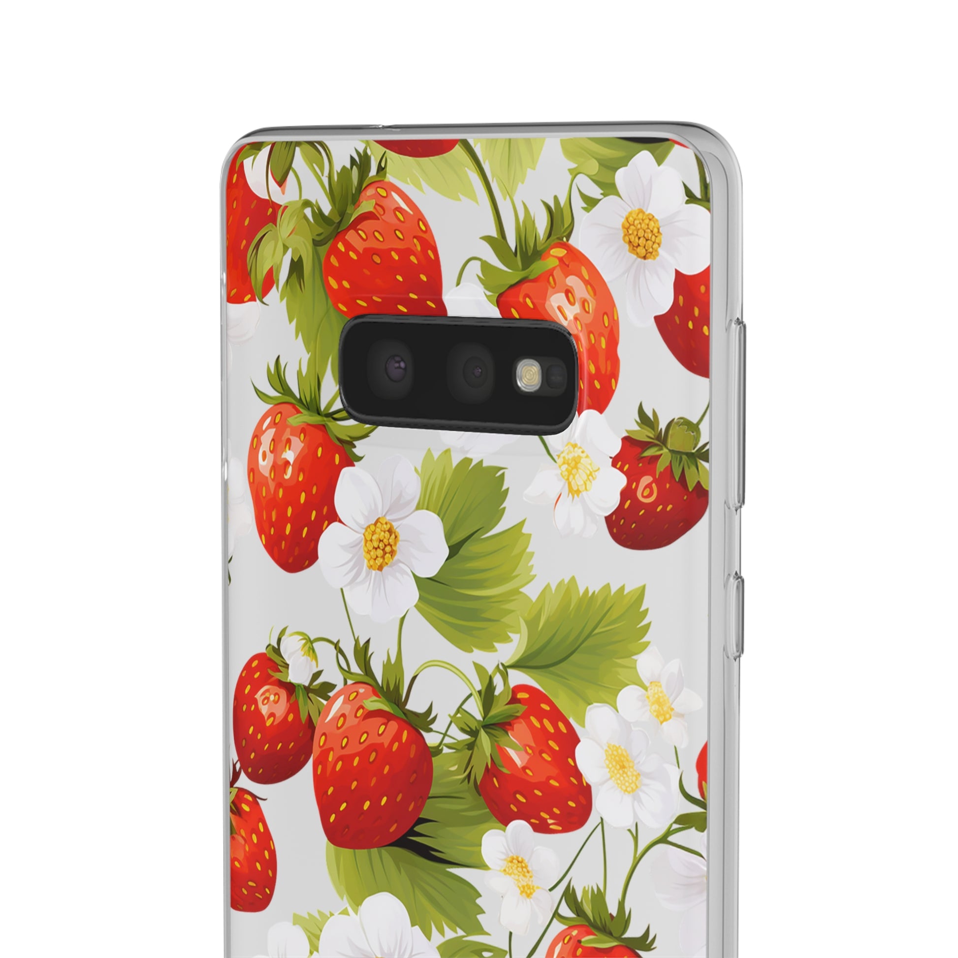 Keywords: Strawberry case, Floral design, Fruit cover, Transparent case, Nature phone case, Berries and blooms, Fresh design, Garden vibe, Phone accessory, Elegant protector, Fruit and flower, Berry aesthetic, Summer feeling.