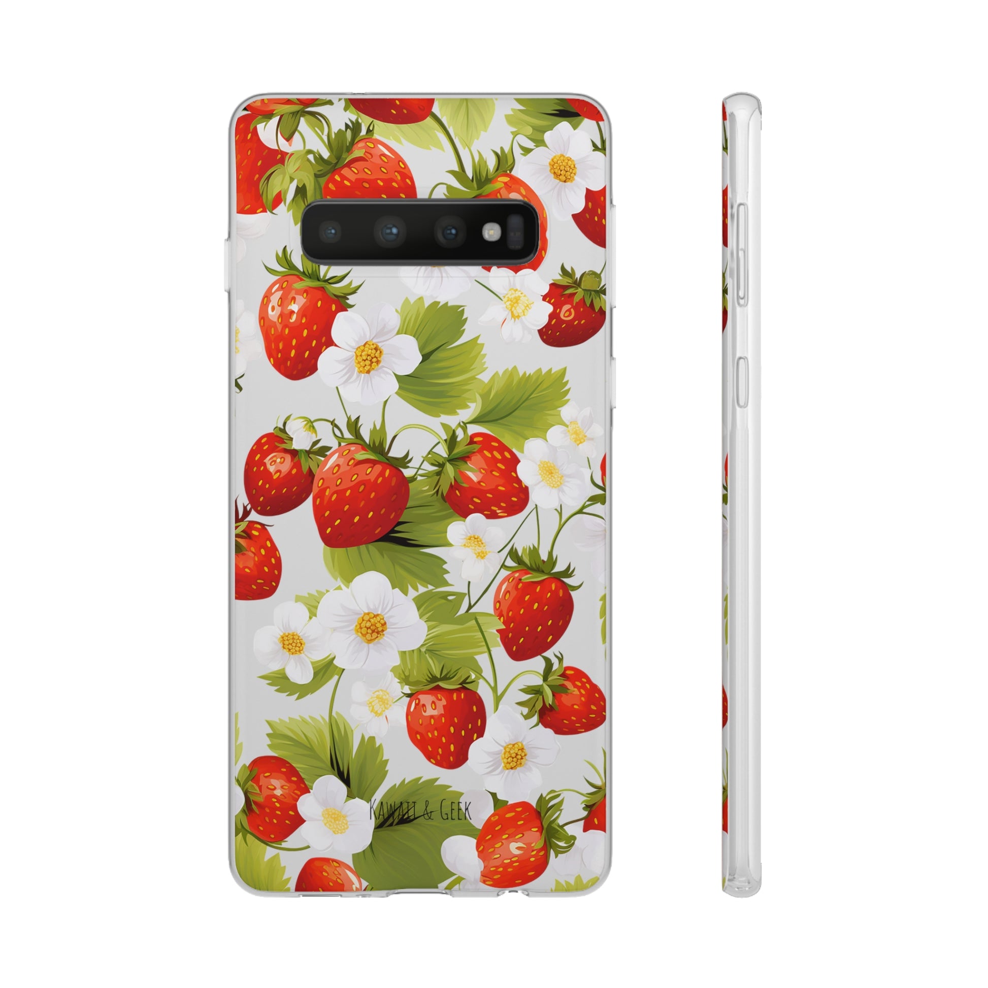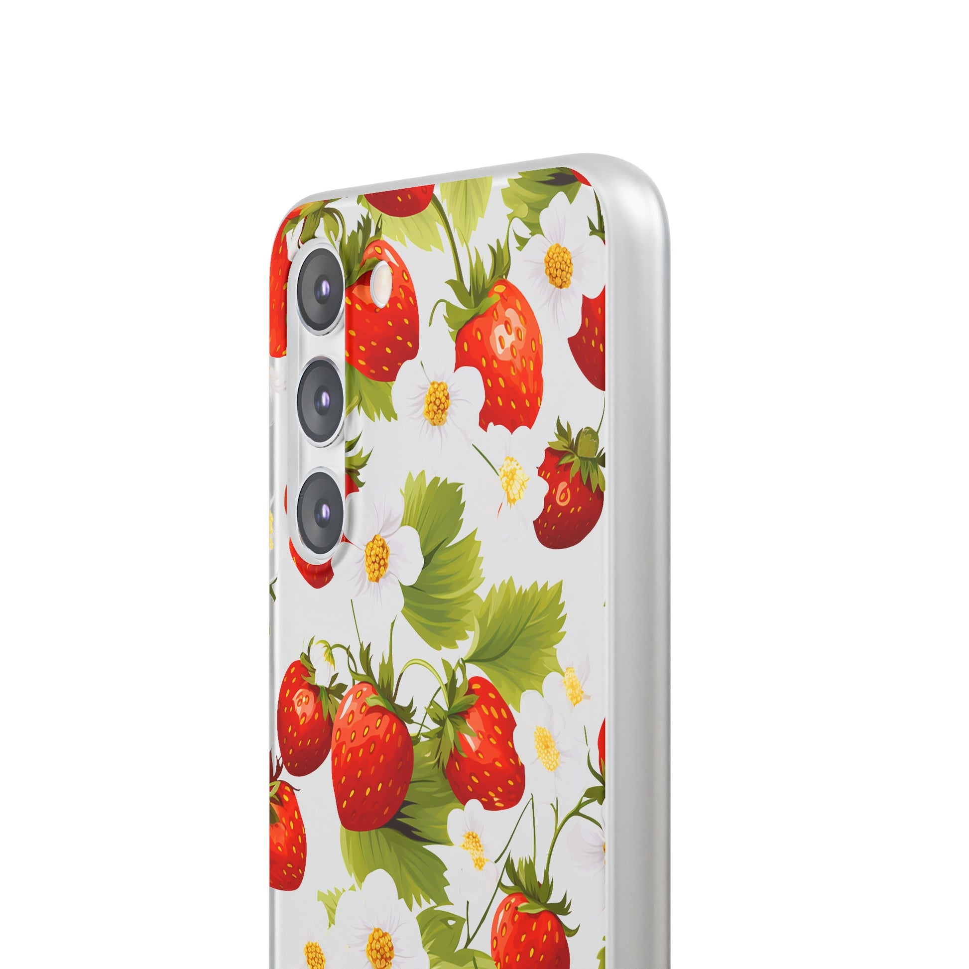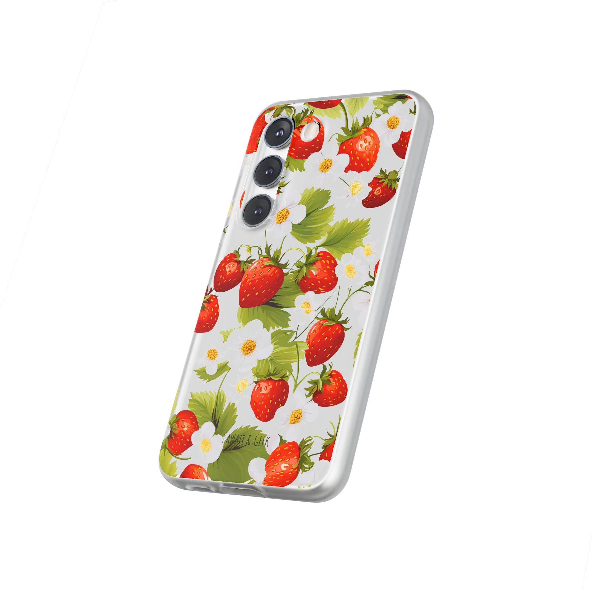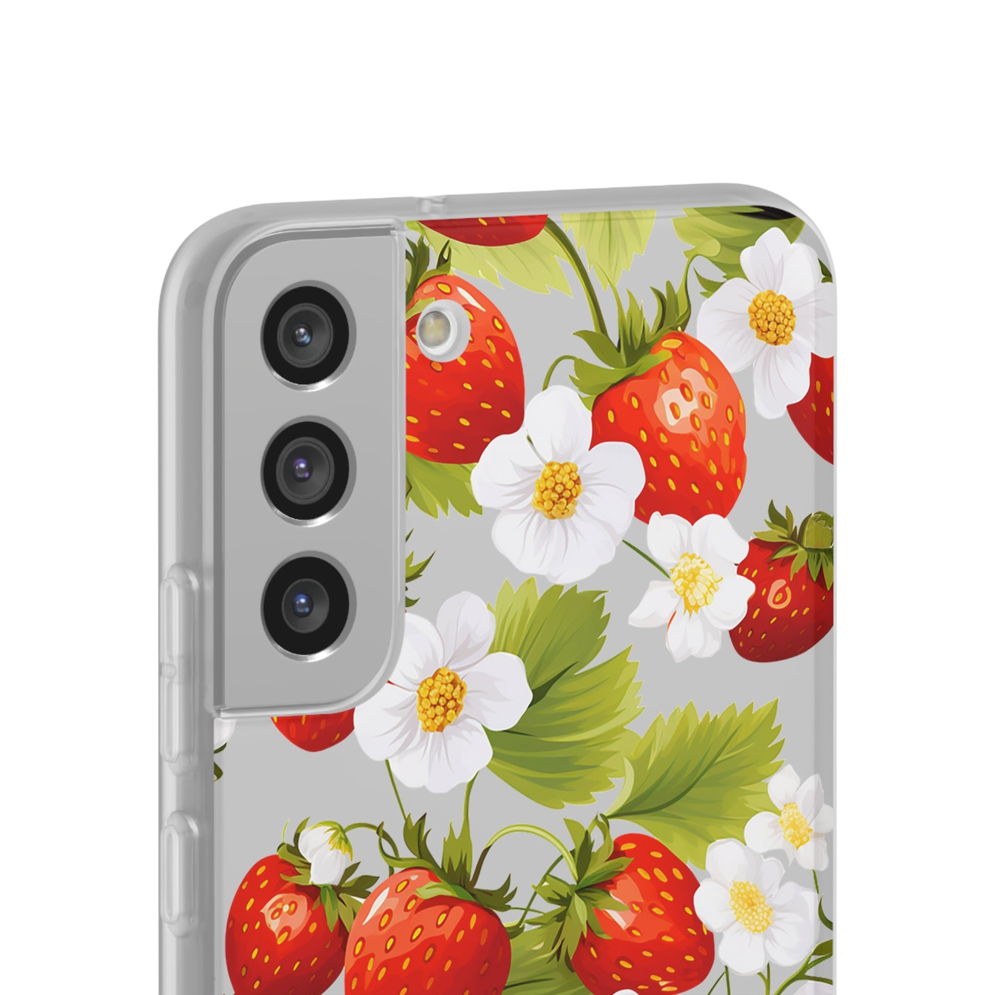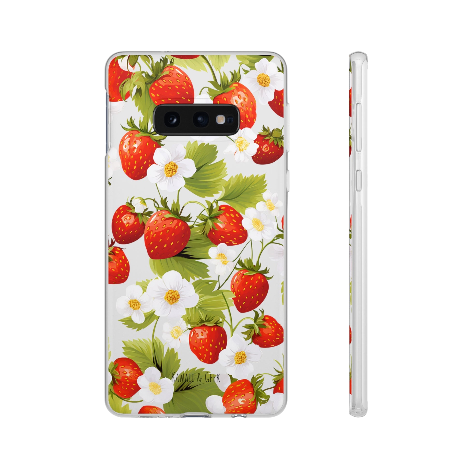 Keywords: Strawberry case, Floral design, Fruit cover, Transparent case, Nature phone case, Berries and blooms, Fresh design, Garden vibe, Phone accessory, Elegant protector, Fruit and flower, Berry aesthetic, Summer feeling.