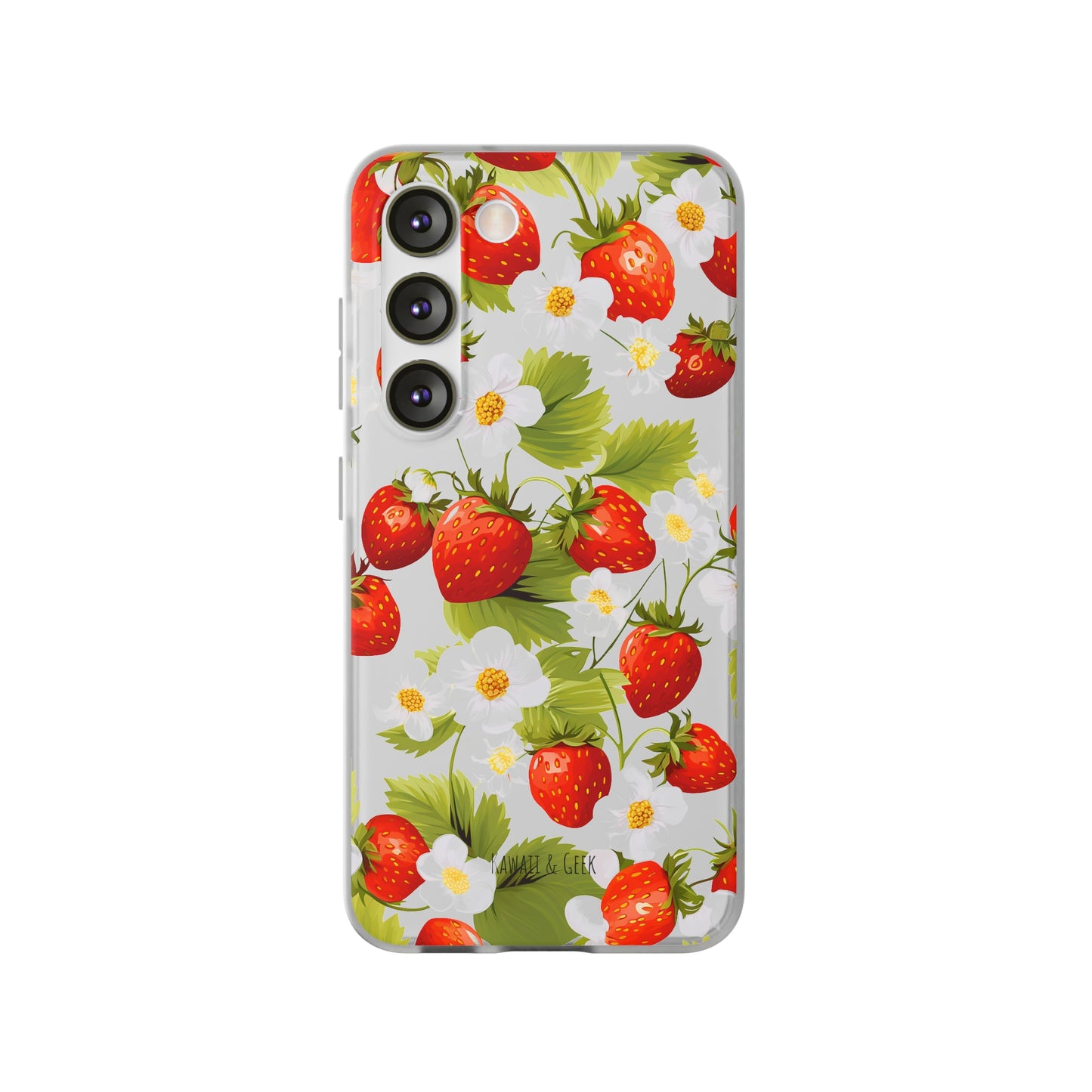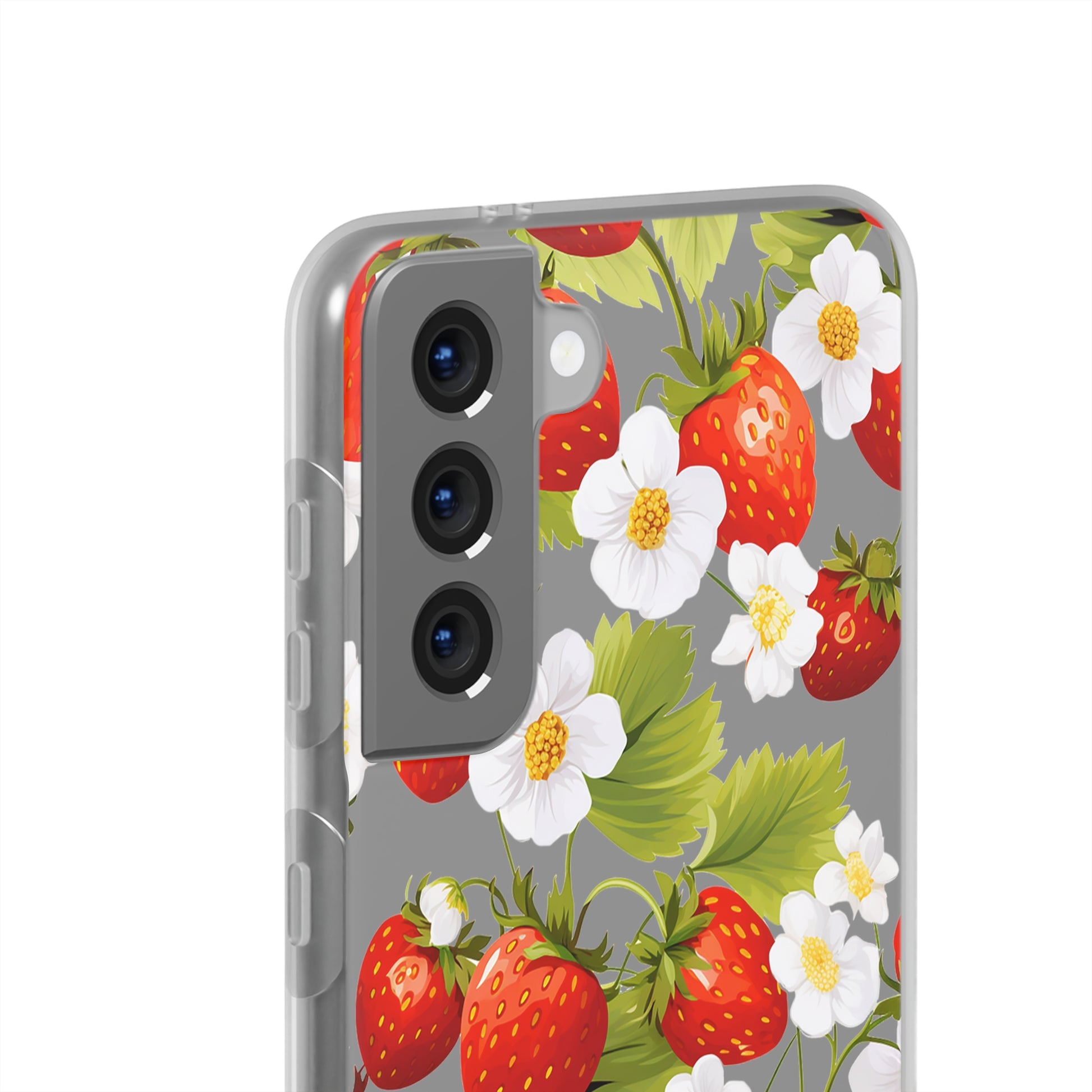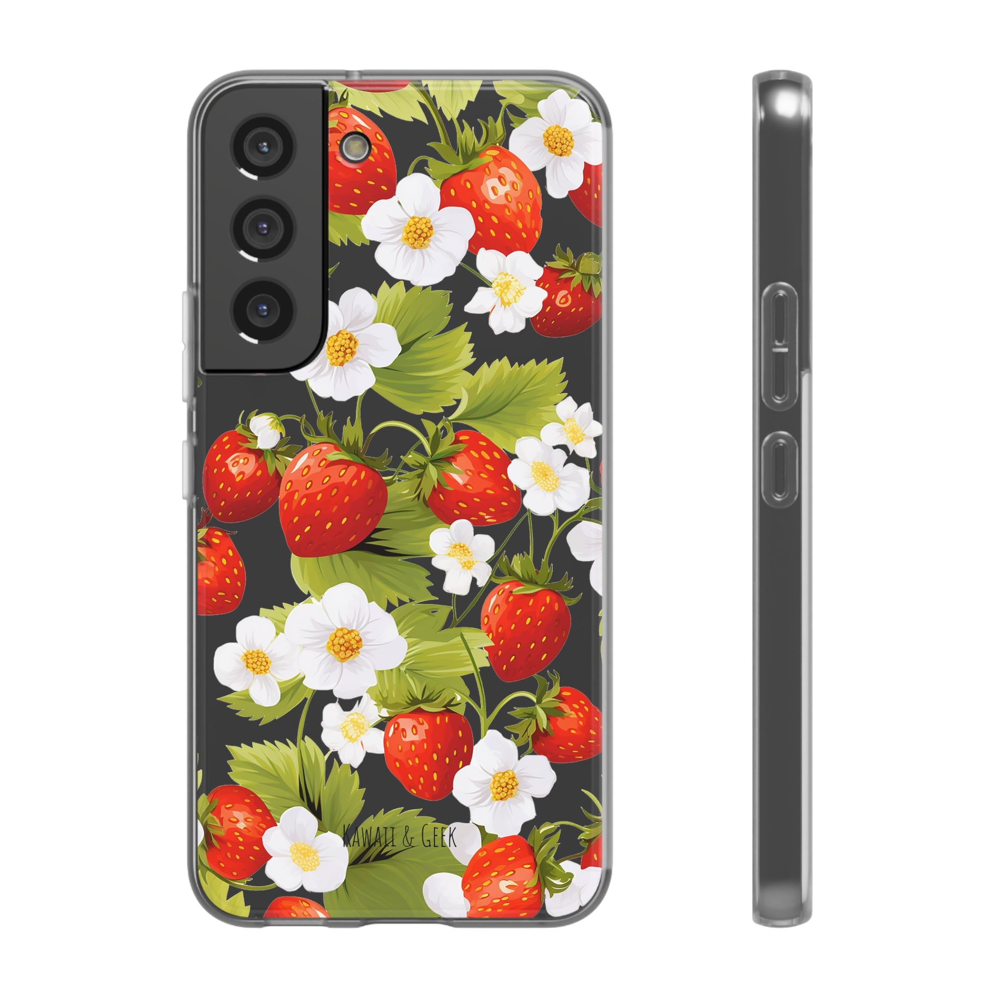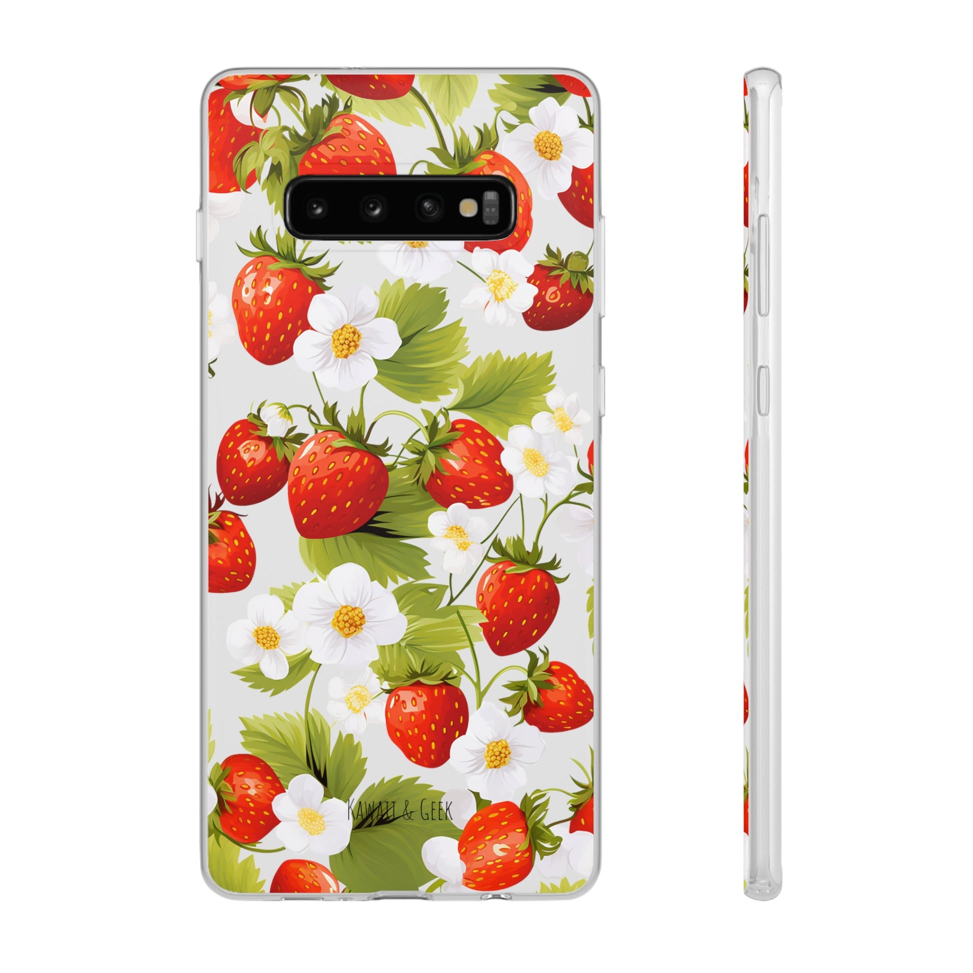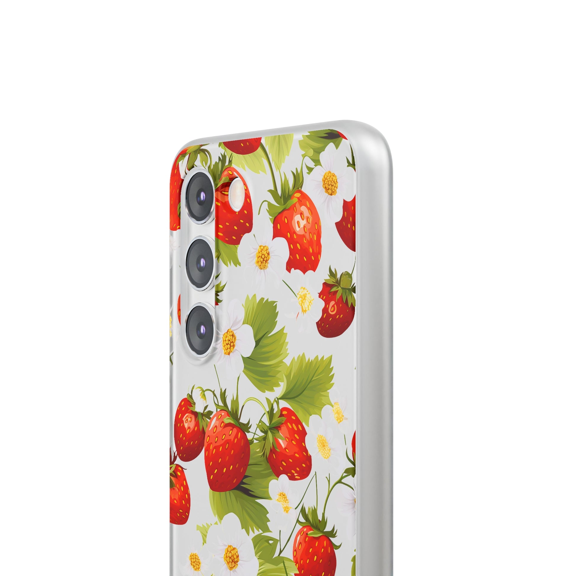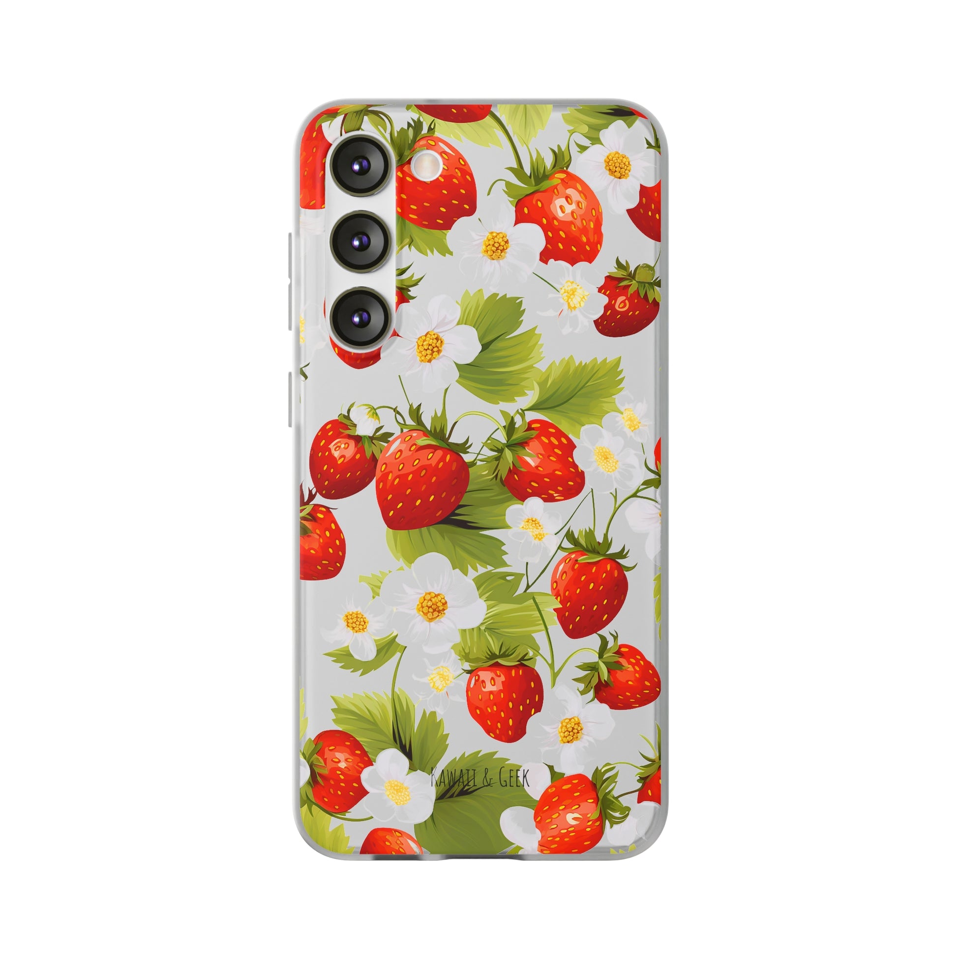 Keywords: Strawberry case, Floral design, Fruit cover, Transparent case, Nature phone case, Berries and blooms, Fresh design, Garden vibe, Phone accessory, Elegant protector, Fruit and flower, Berry aesthetic, Summer feeling.