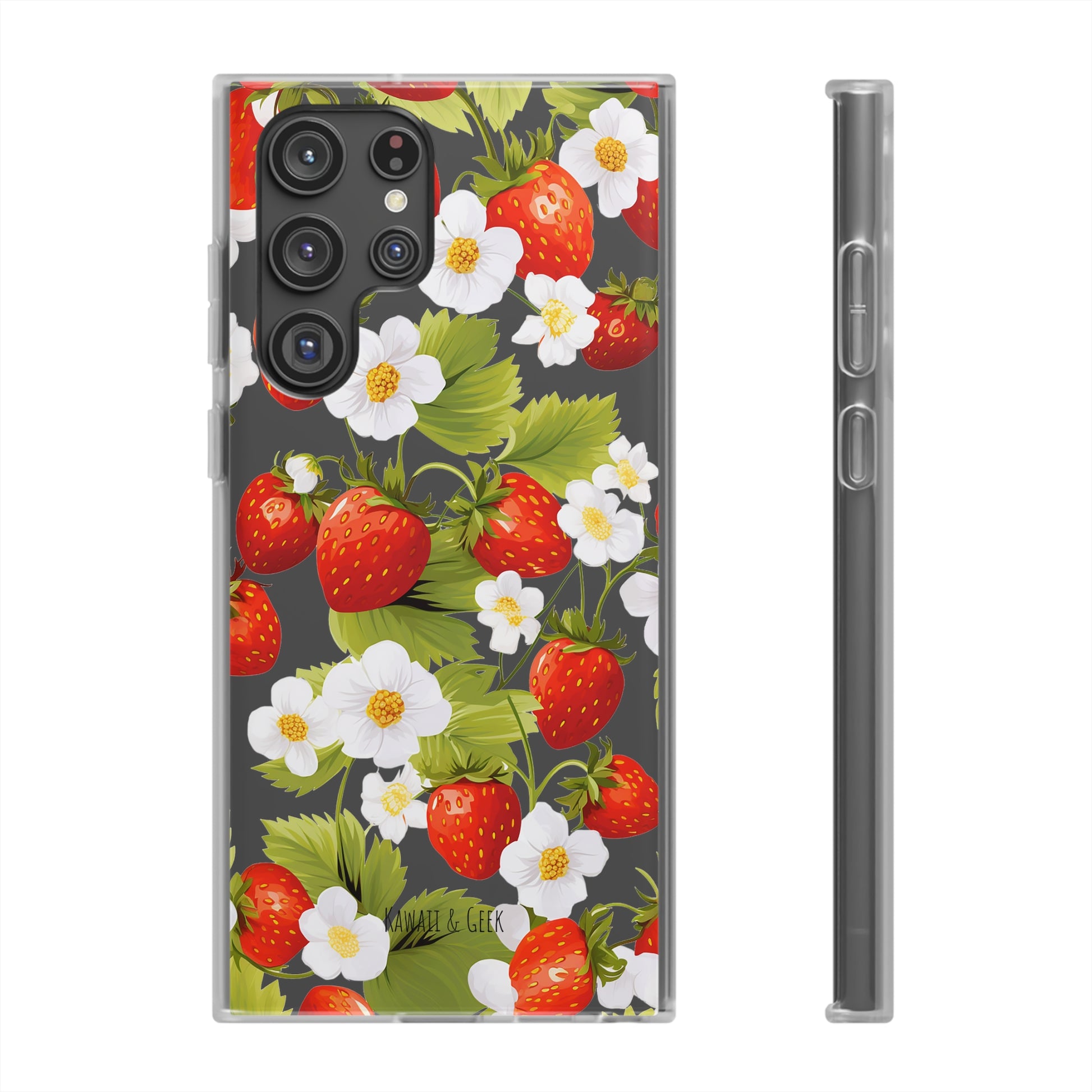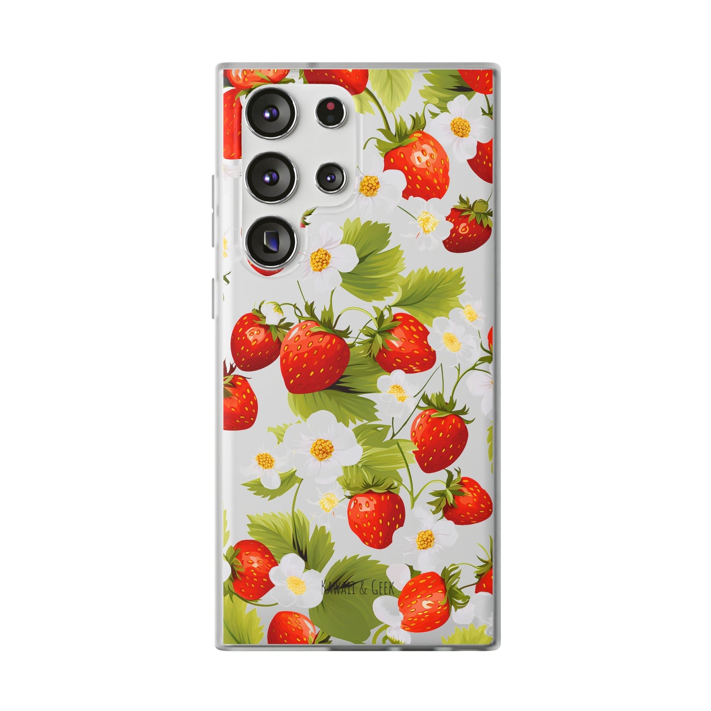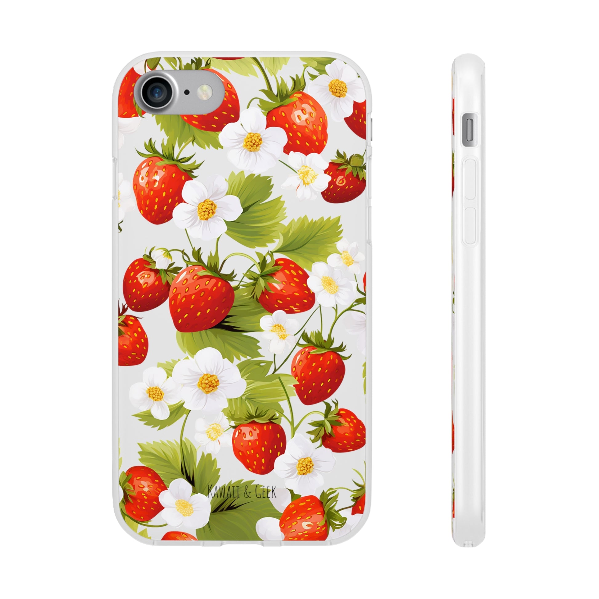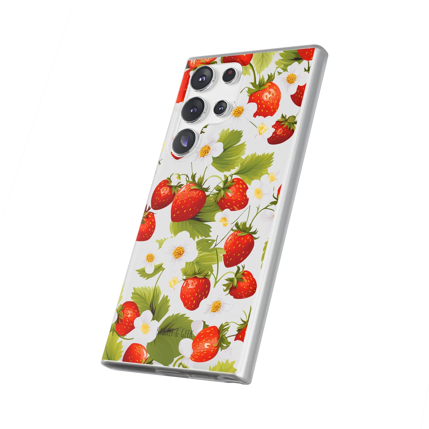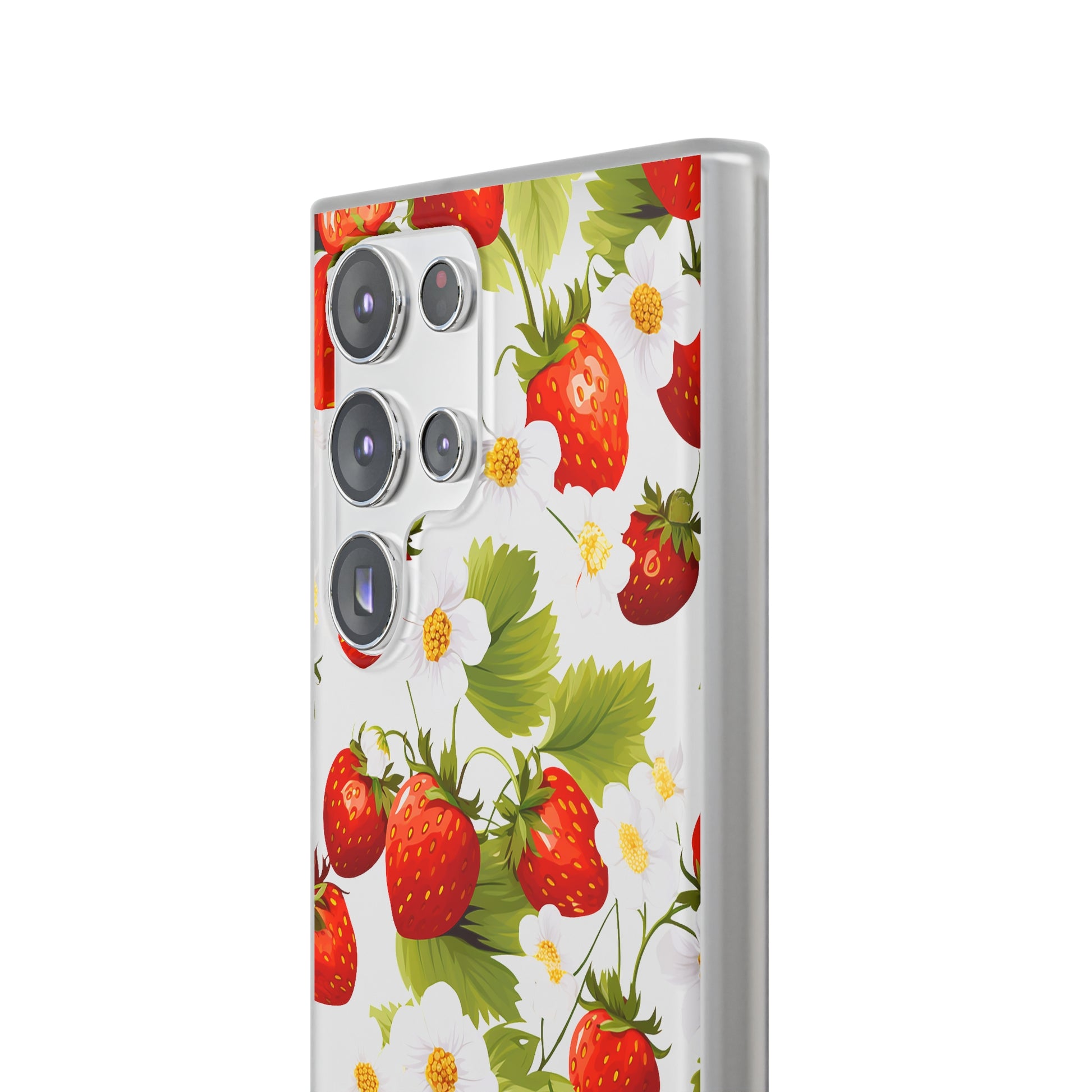 Keywords: Strawberry case, Floral design, Fruit cover, Transparent case, Nature phone case, Berries and blooms, Fresh design, Garden vibe, Phone accessory, Elegant protector, Fruit and flower, Berry aesthetic, Summer feeling.