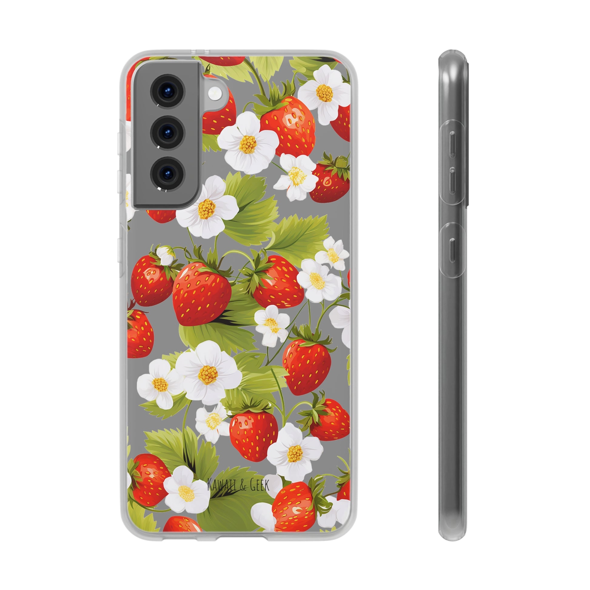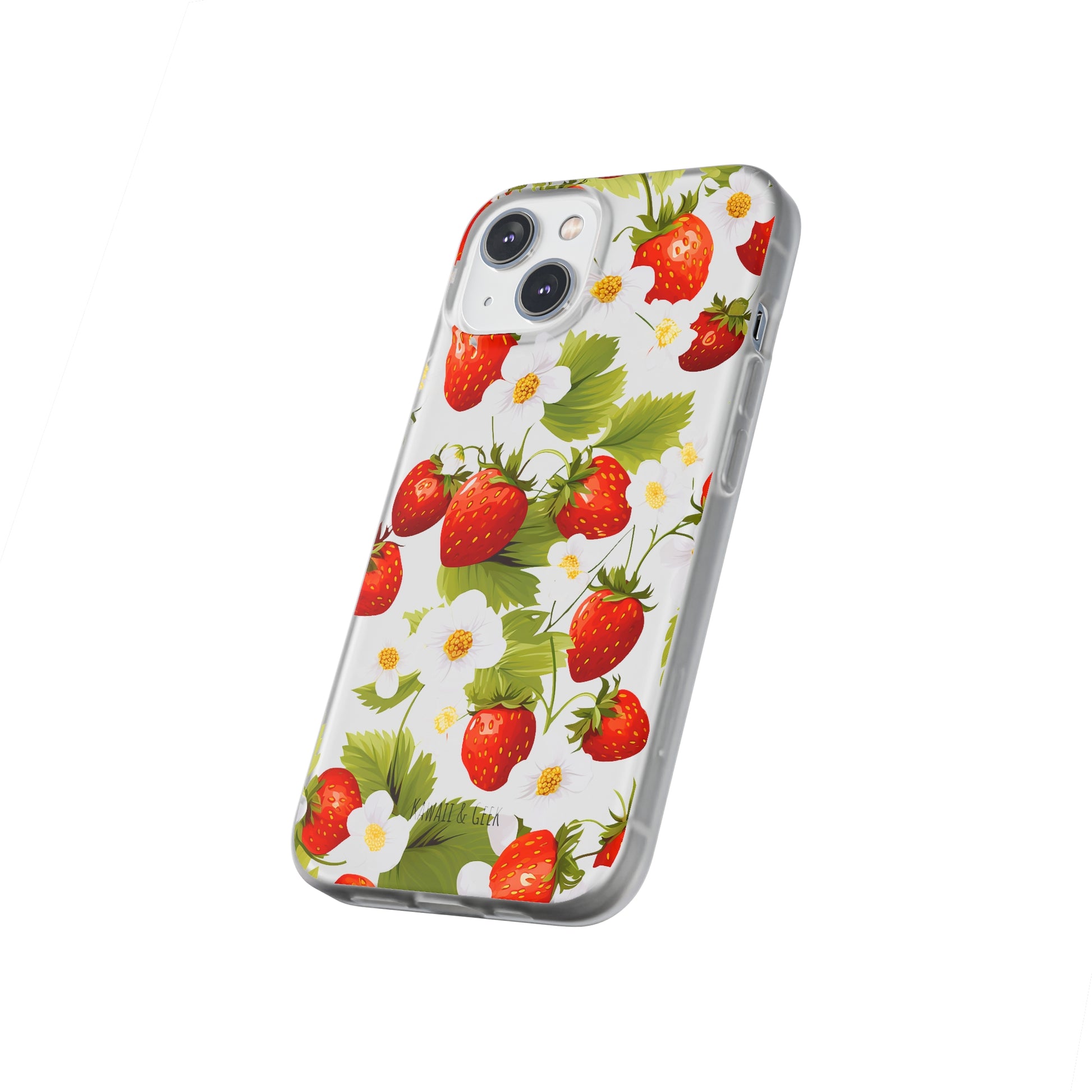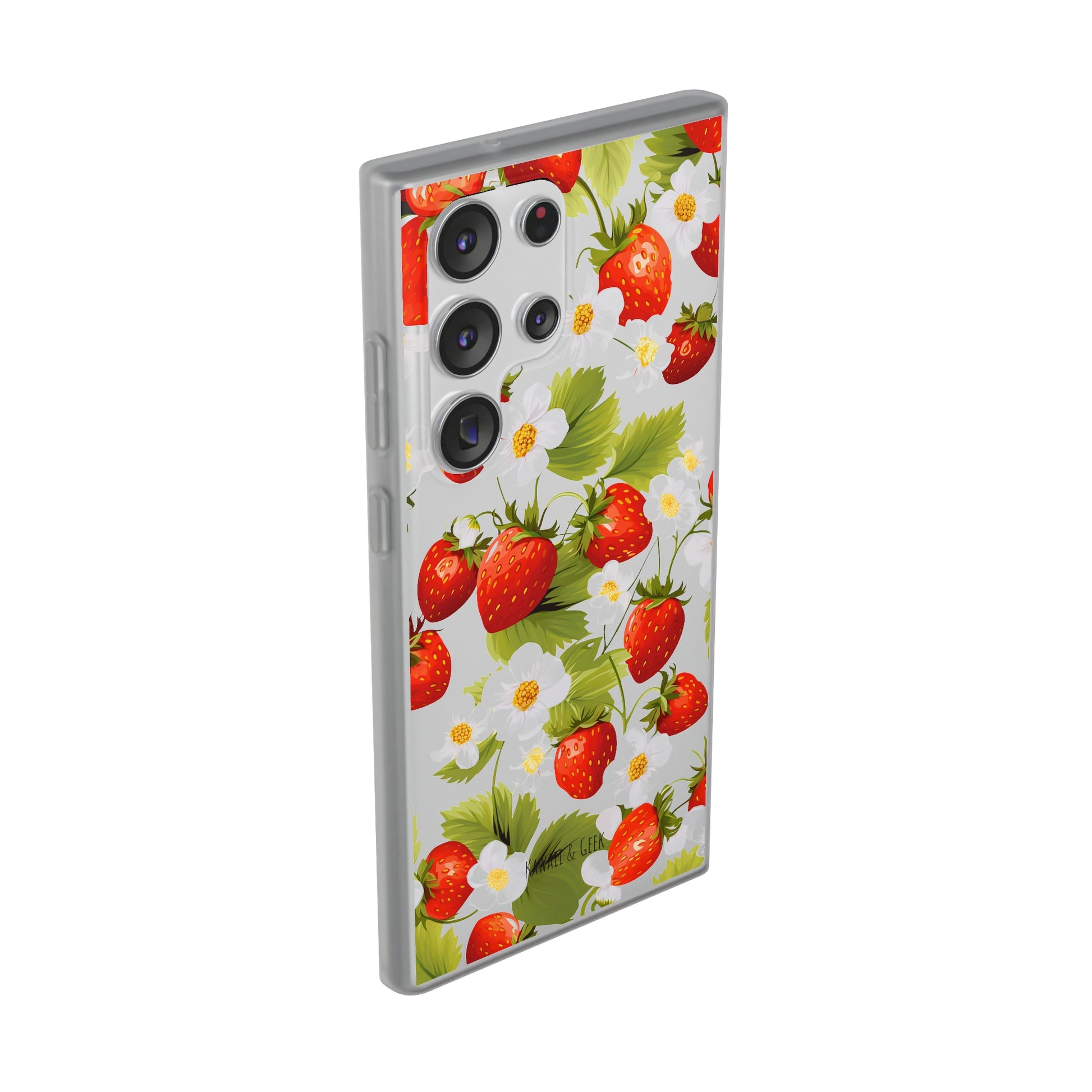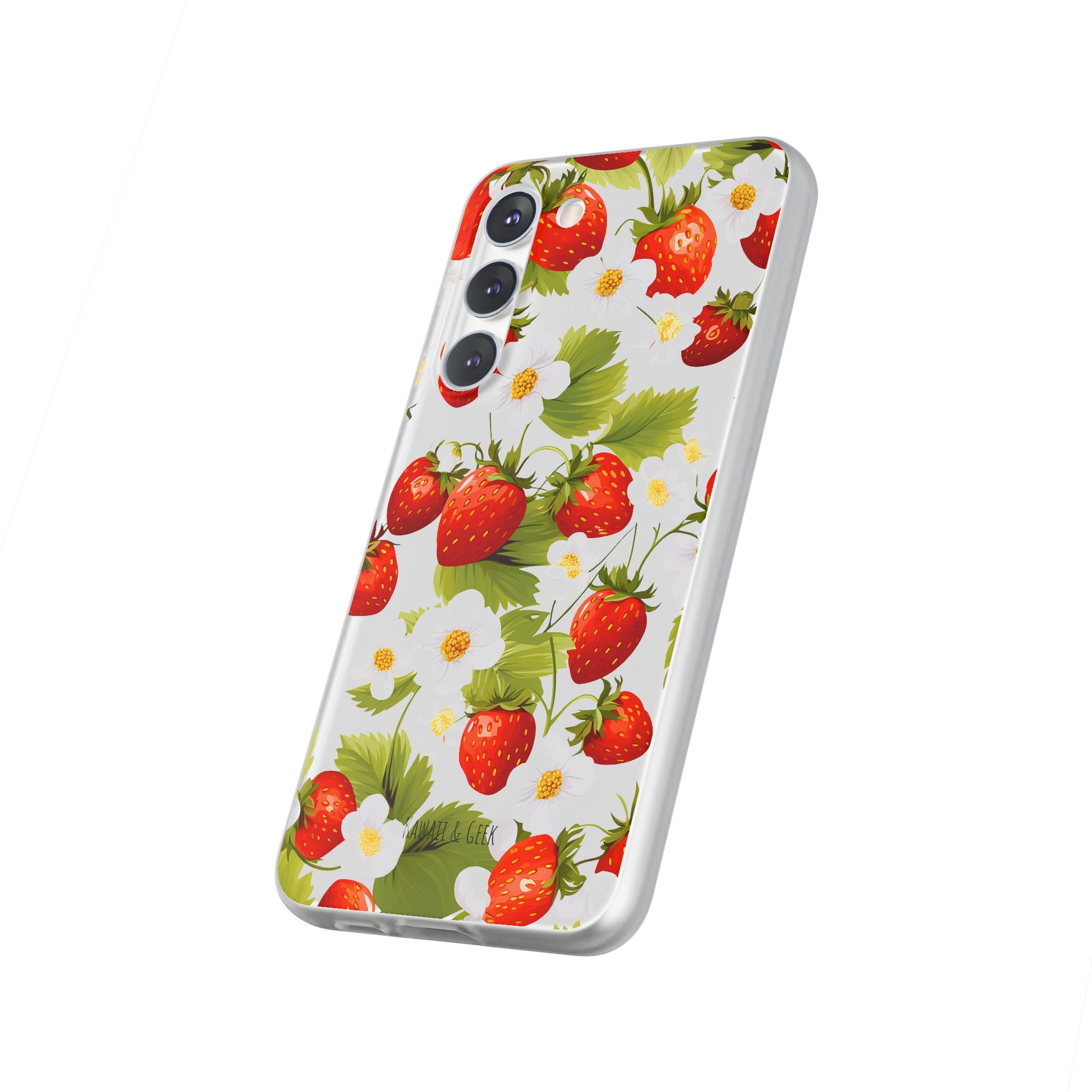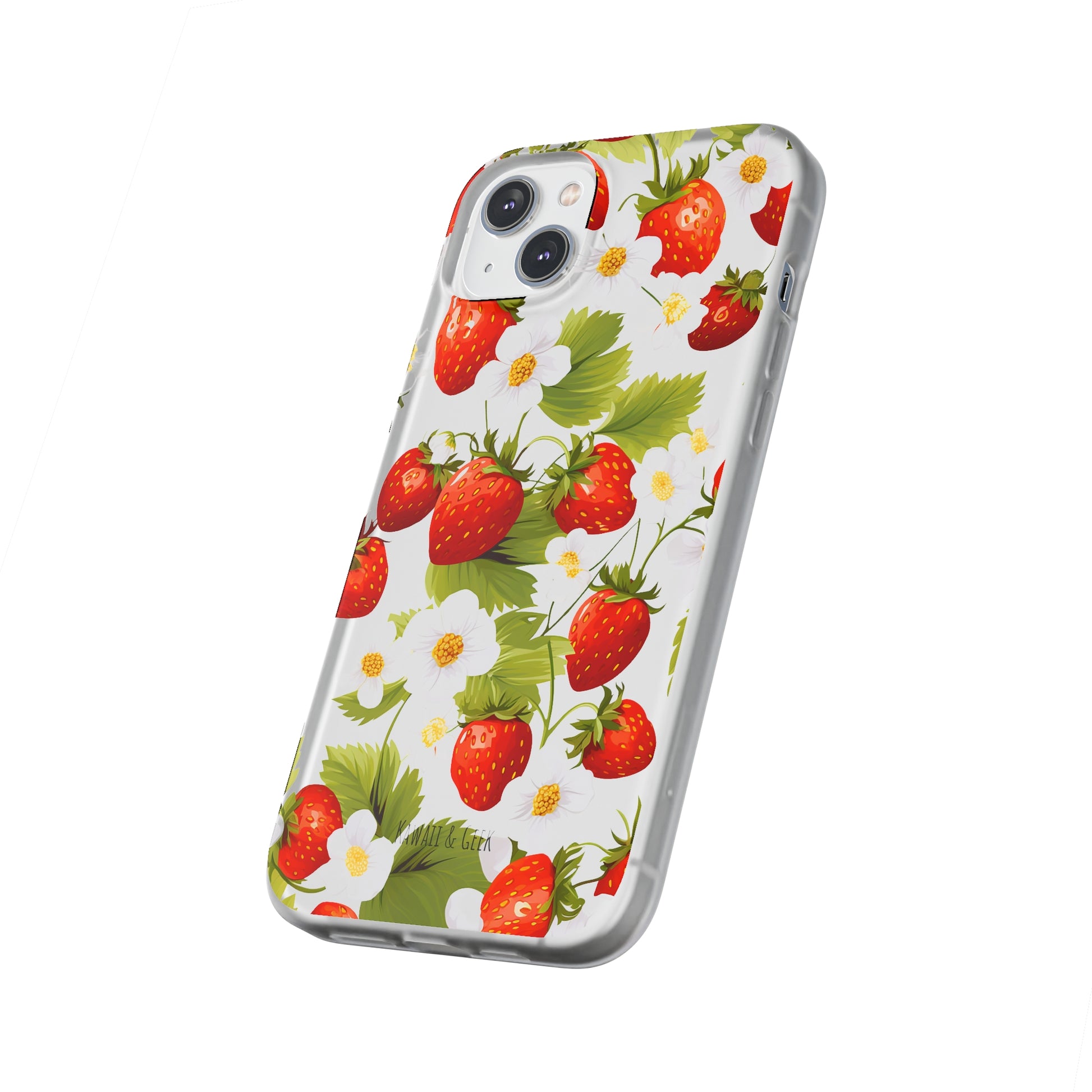 Keywords: Strawberry case, Floral design, Fruit cover, Transparent case, Nature phone case, Berries and blooms, Fresh design, Garden vibe, Phone accessory, Elegant protector, Fruit and flower, Berry aesthetic, Summer feeling.