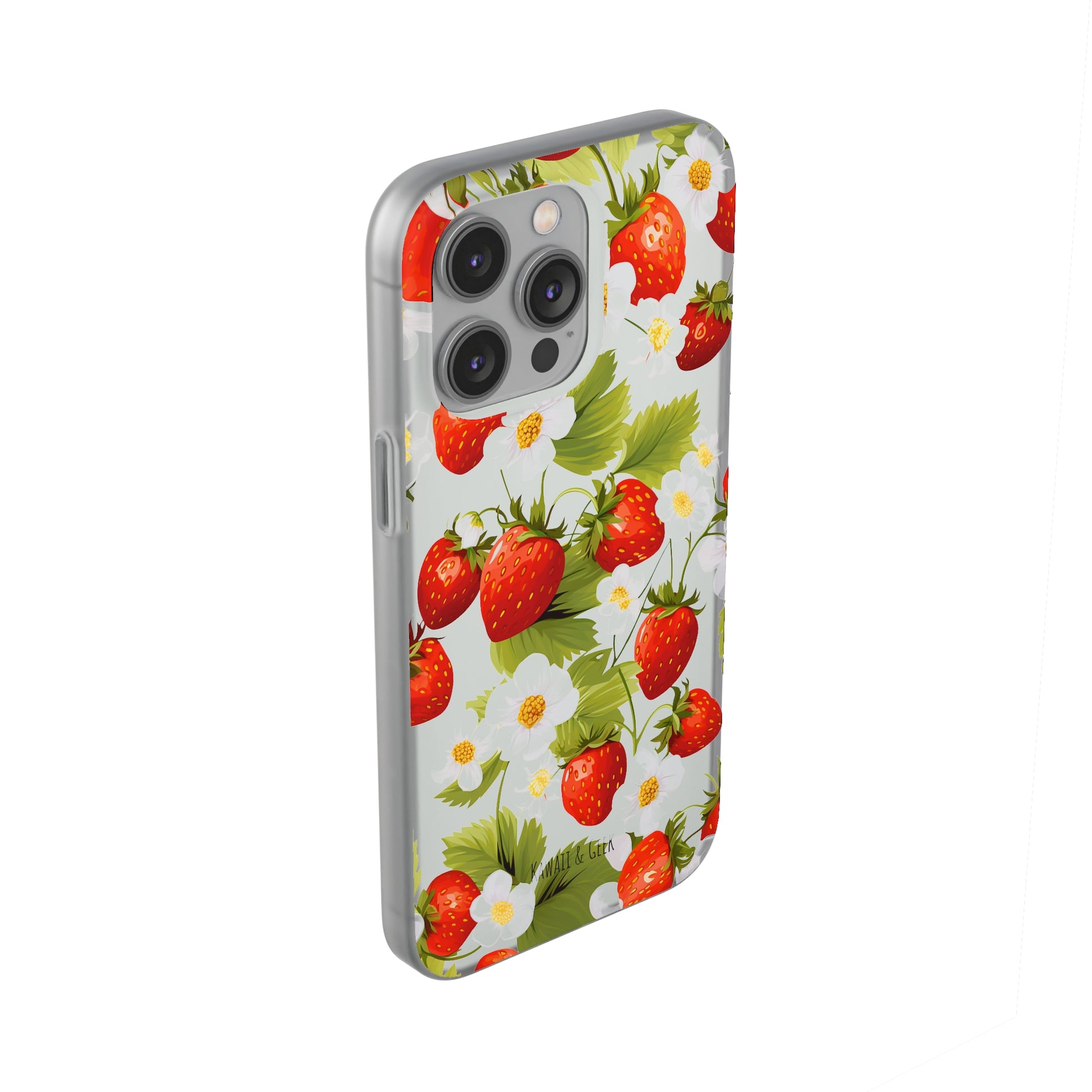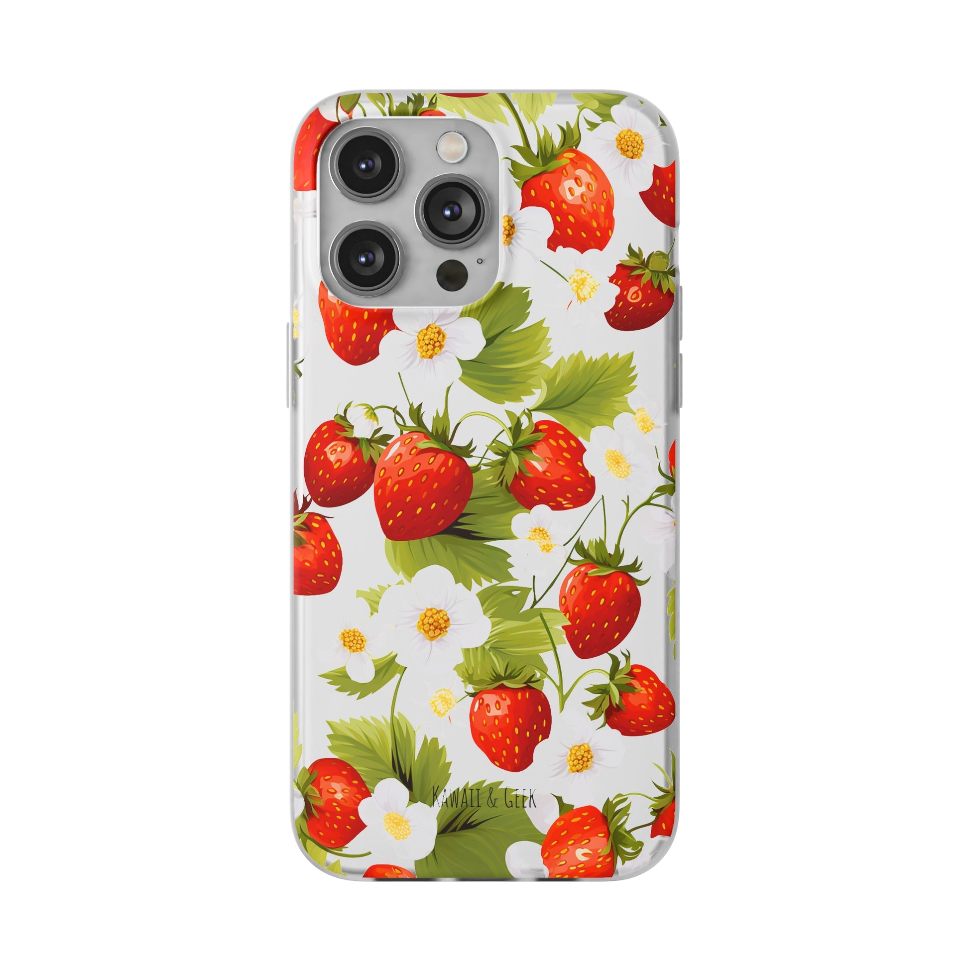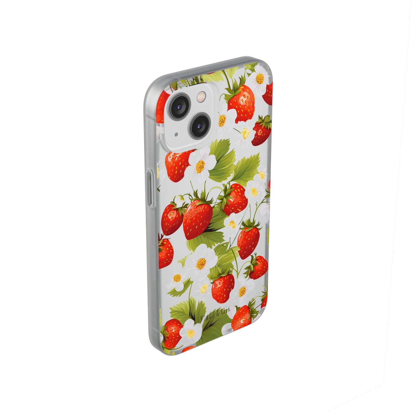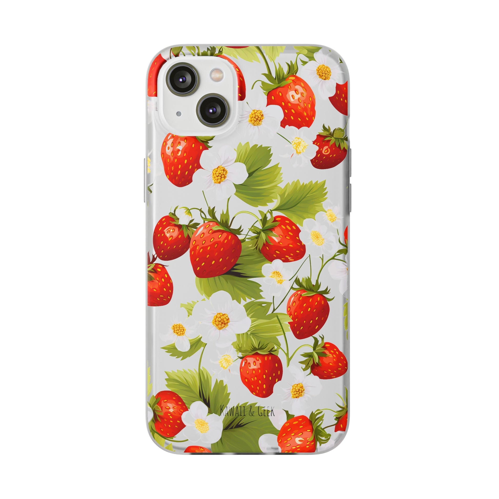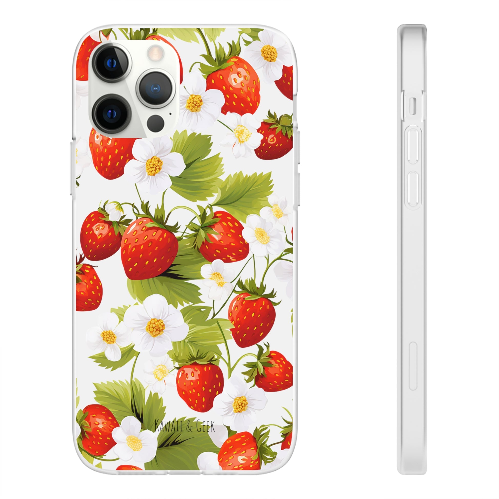 Keywords: Strawberry case, Floral design, Fruit cover, Transparent case, Nature phone case, Berries and blooms, Fresh design, Garden vibe, Phone accessory, Elegant protector, Fruit and flower, Berry aesthetic, Summer feeling.