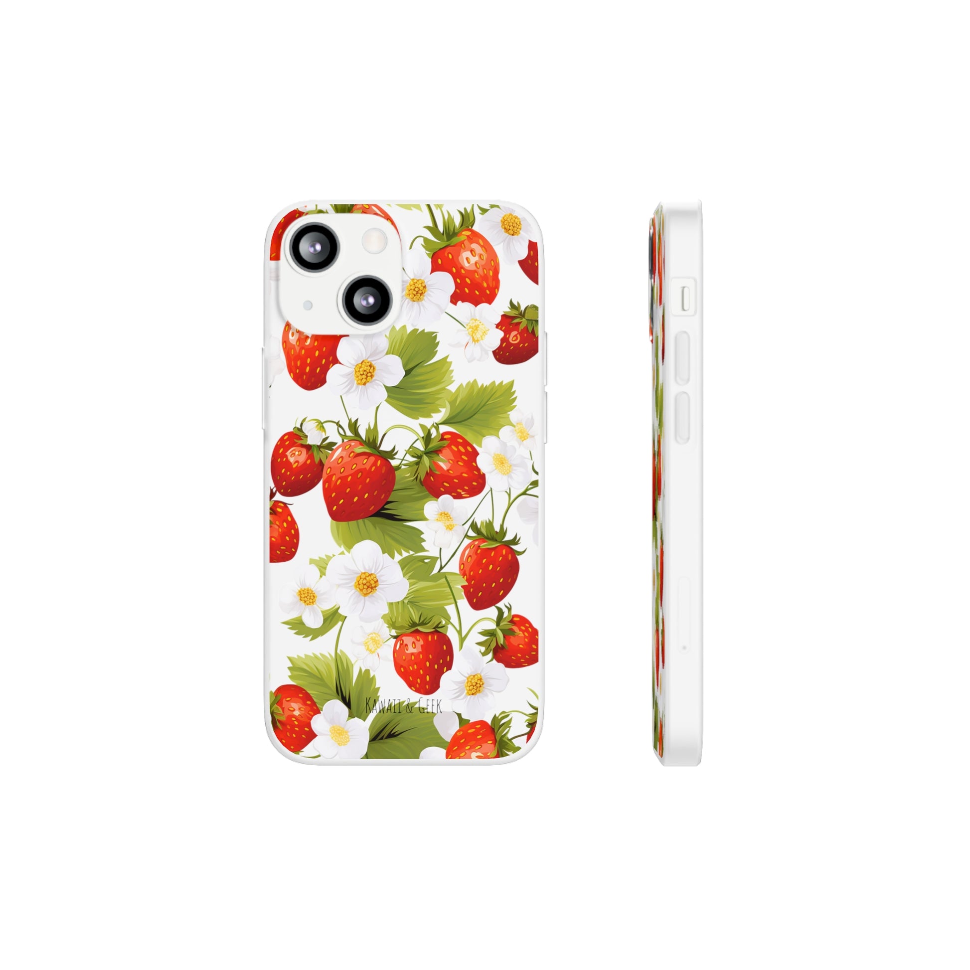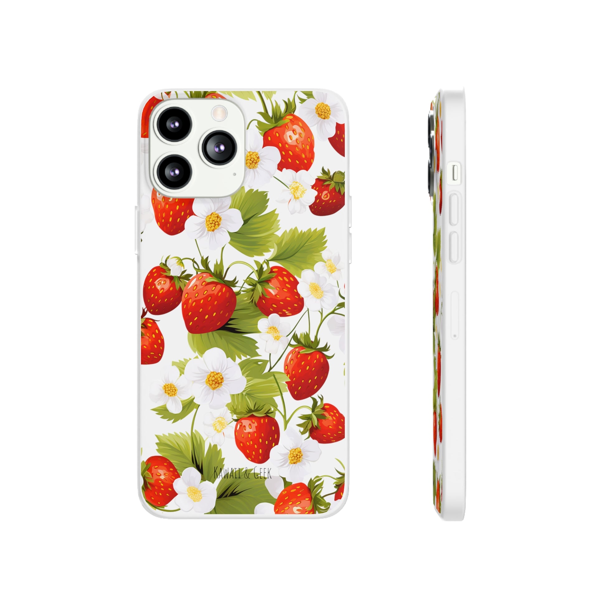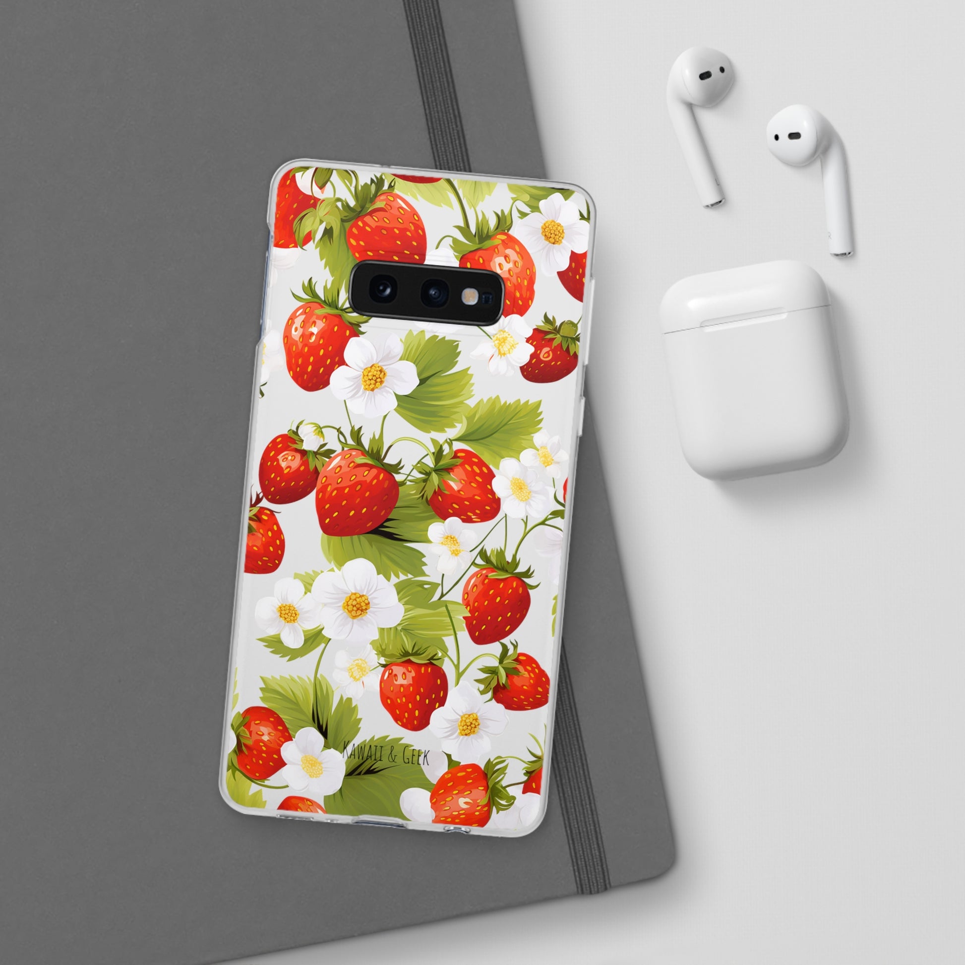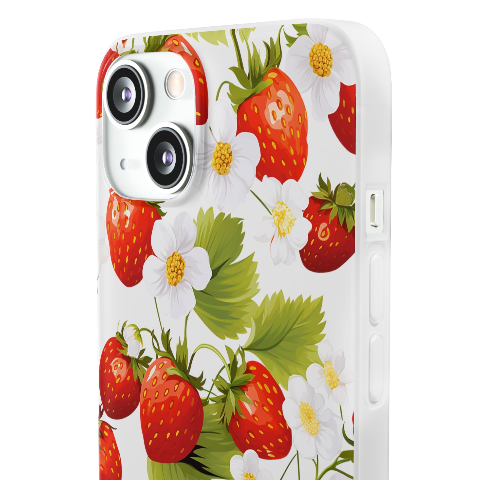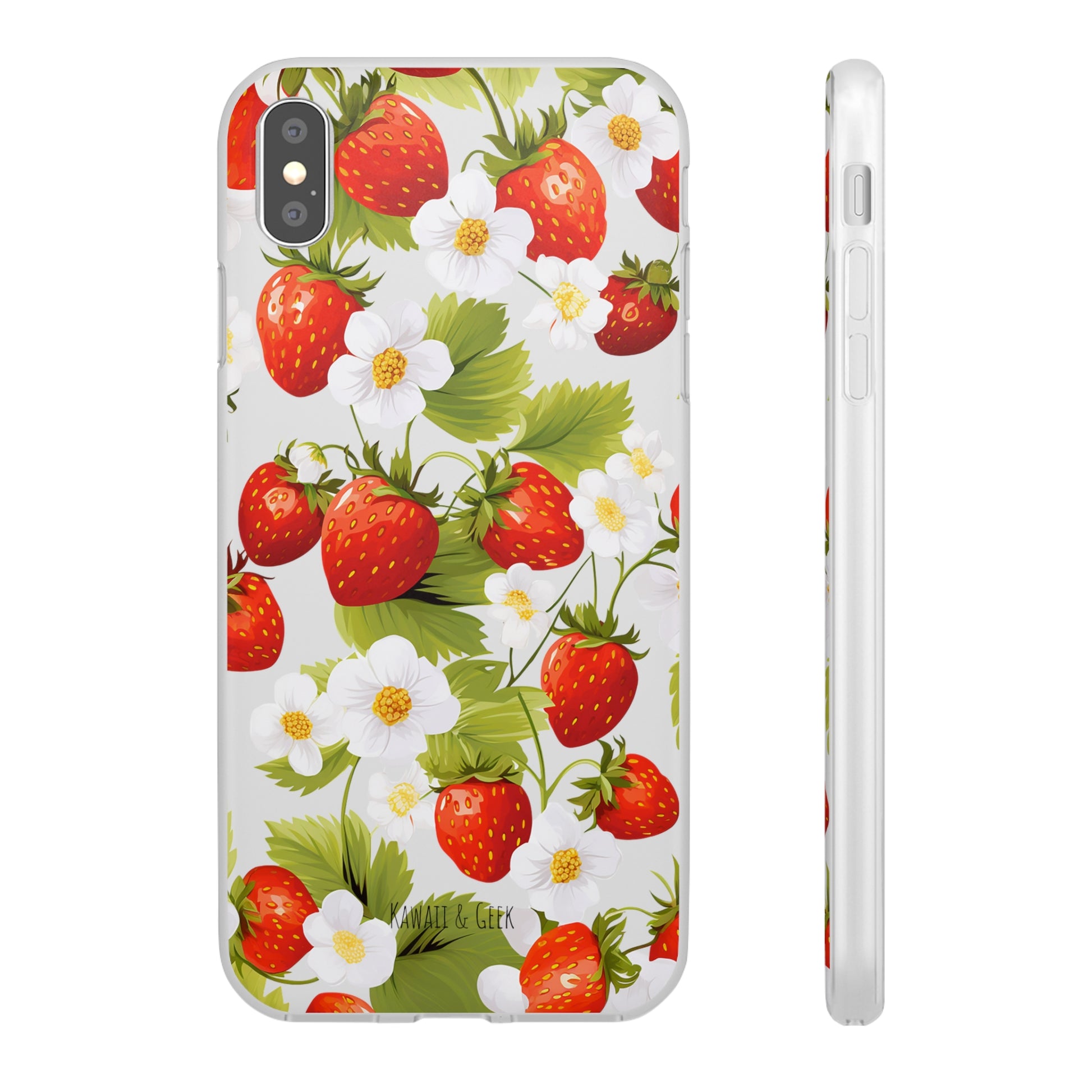 Keywords: Strawberry case, Floral design, Fruit cover, Transparent case, Nature phone case, Berries and blooms, Fresh design, Garden vibe, Phone accessory, Elegant protector, Fruit and flower, Berry aesthetic, Summer feeling.
