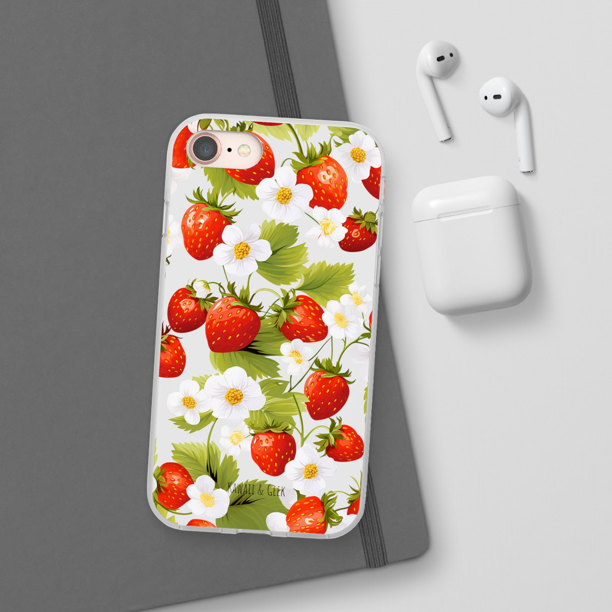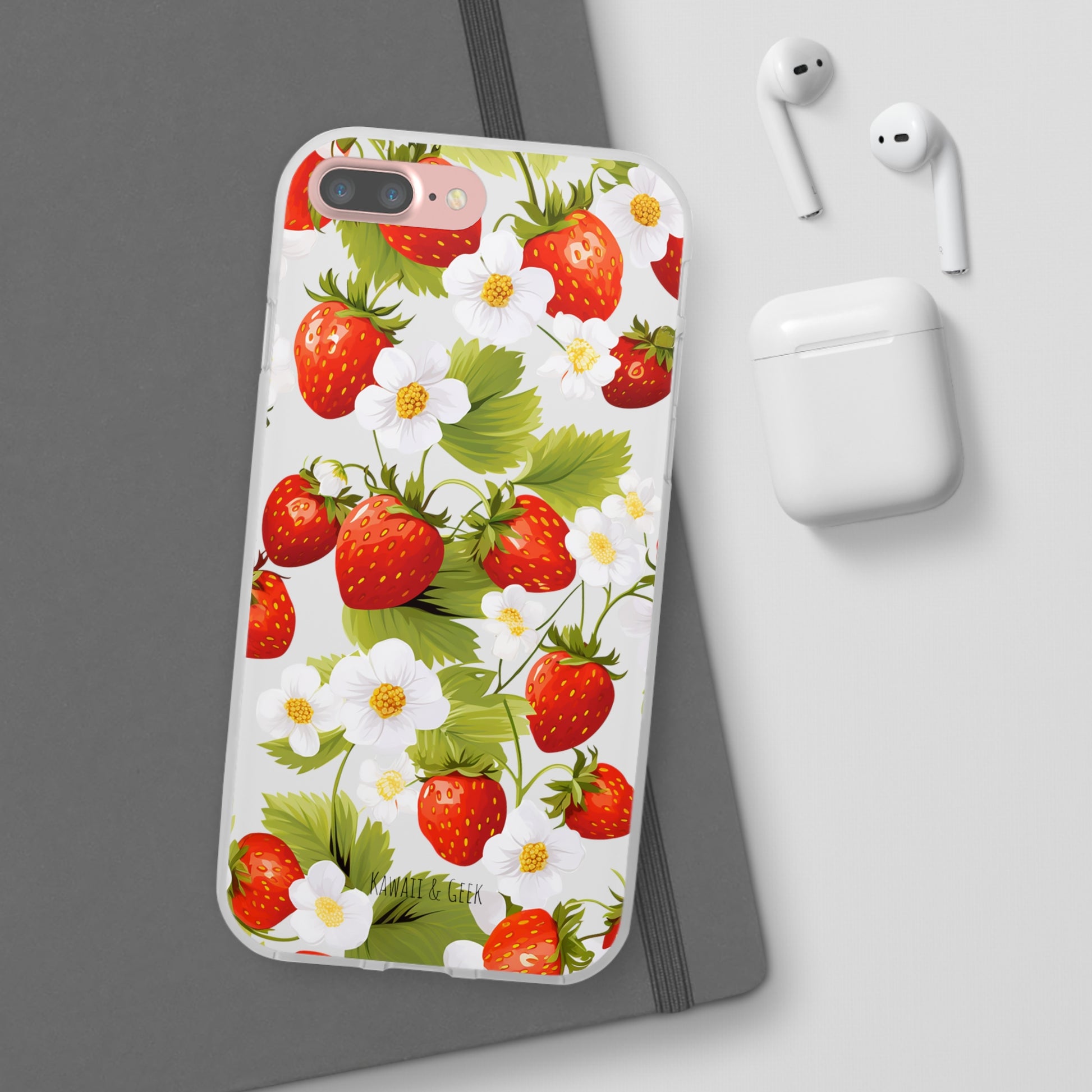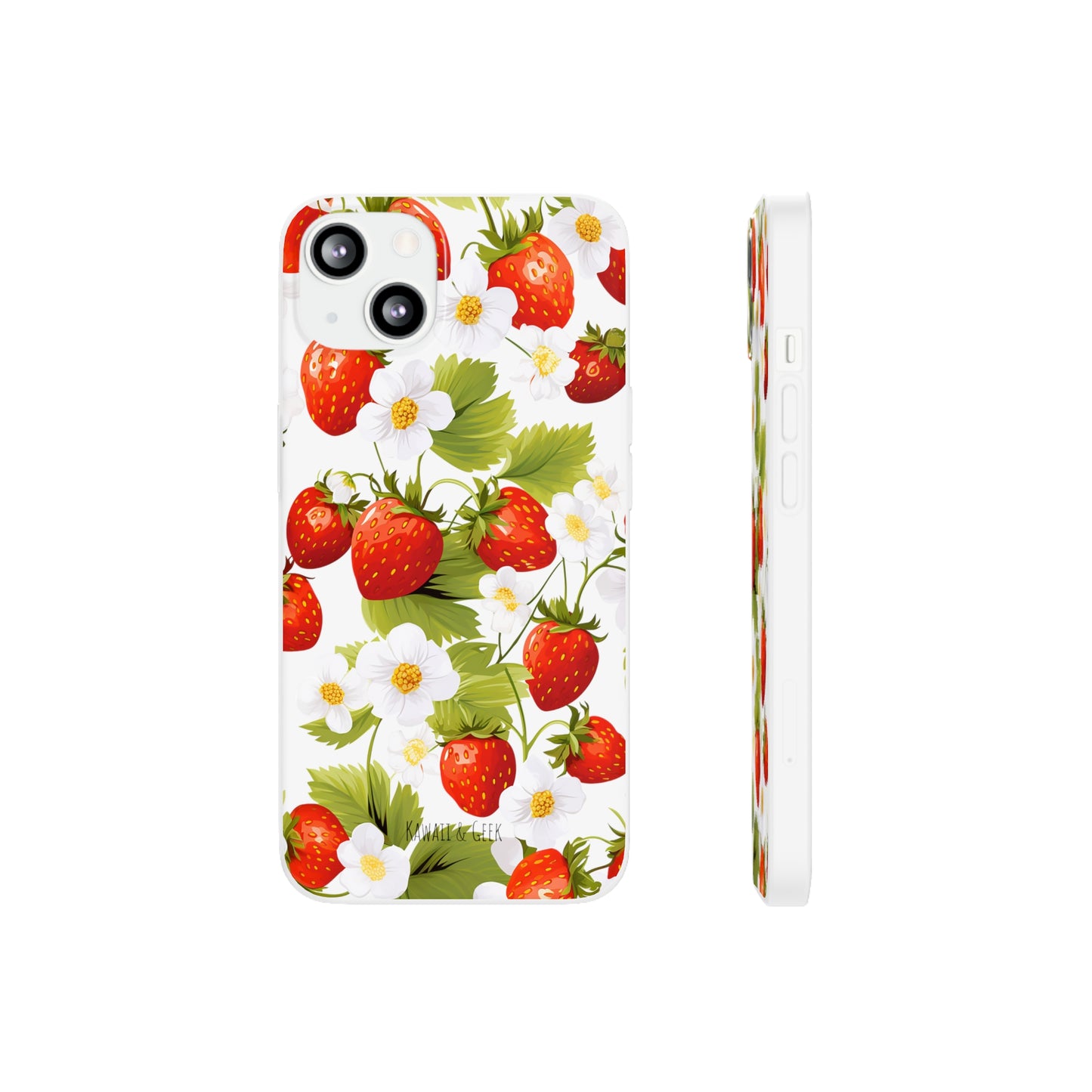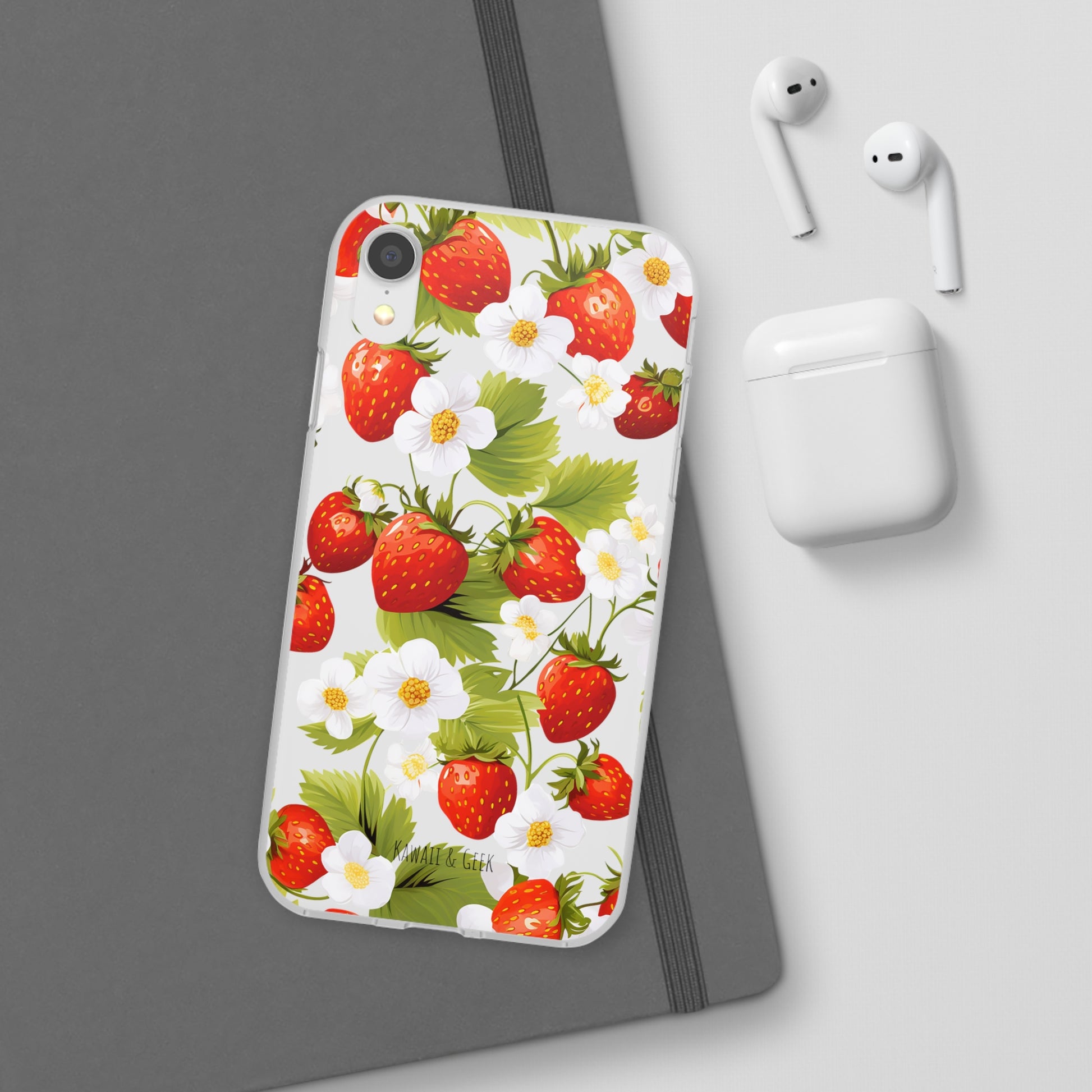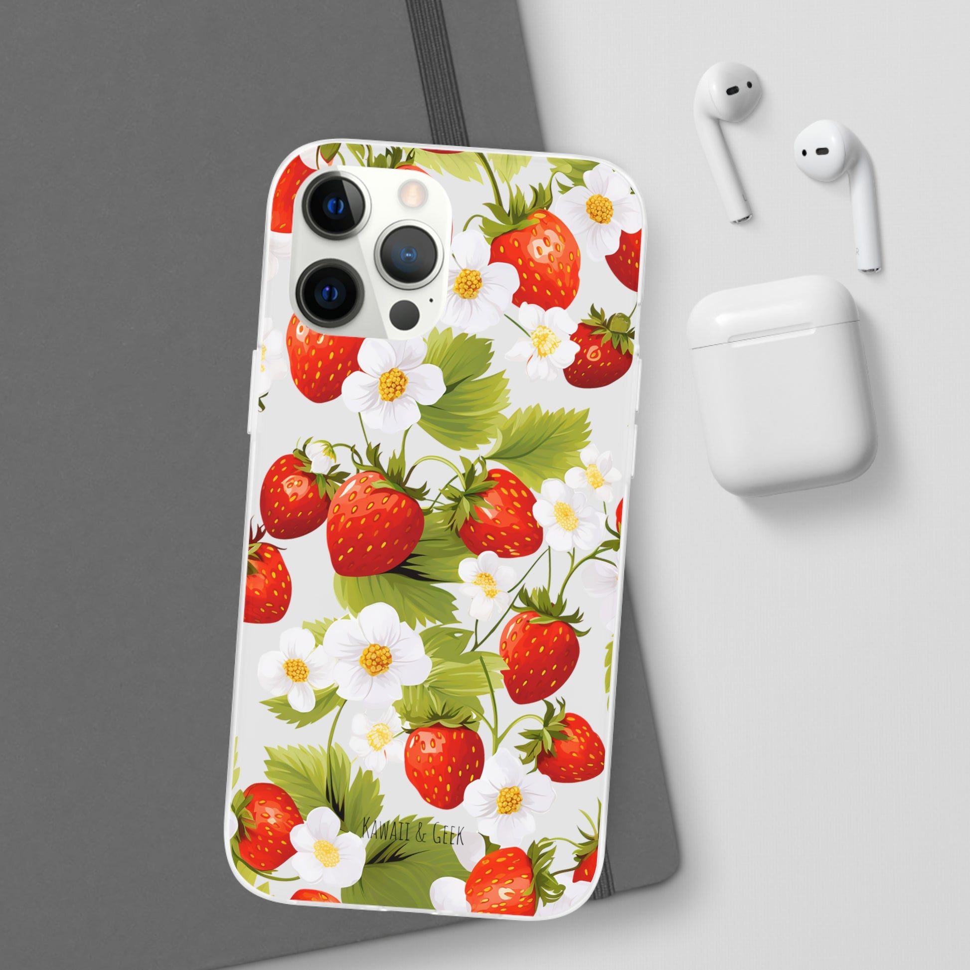 Keywords: Strawberry case, Floral design, Fruit cover, Transparent case, Nature phone case, Berries and blooms, Fresh design, Garden vibe, Phone accessory, Elegant protector, Fruit and flower, Berry aesthetic, Summer feeling.