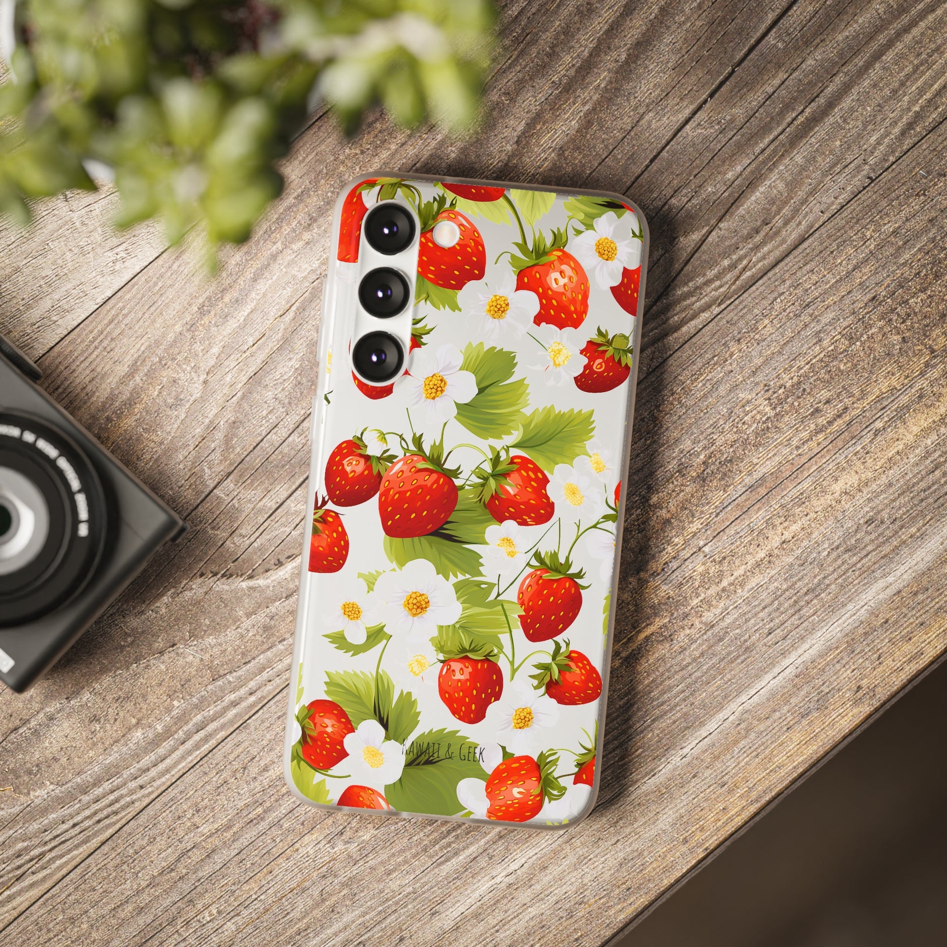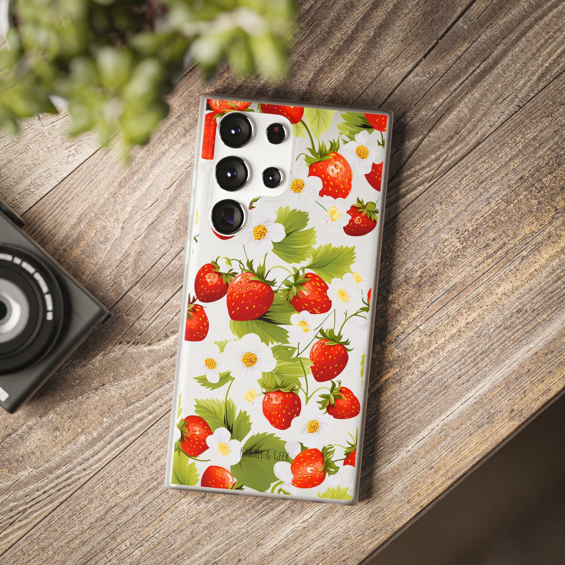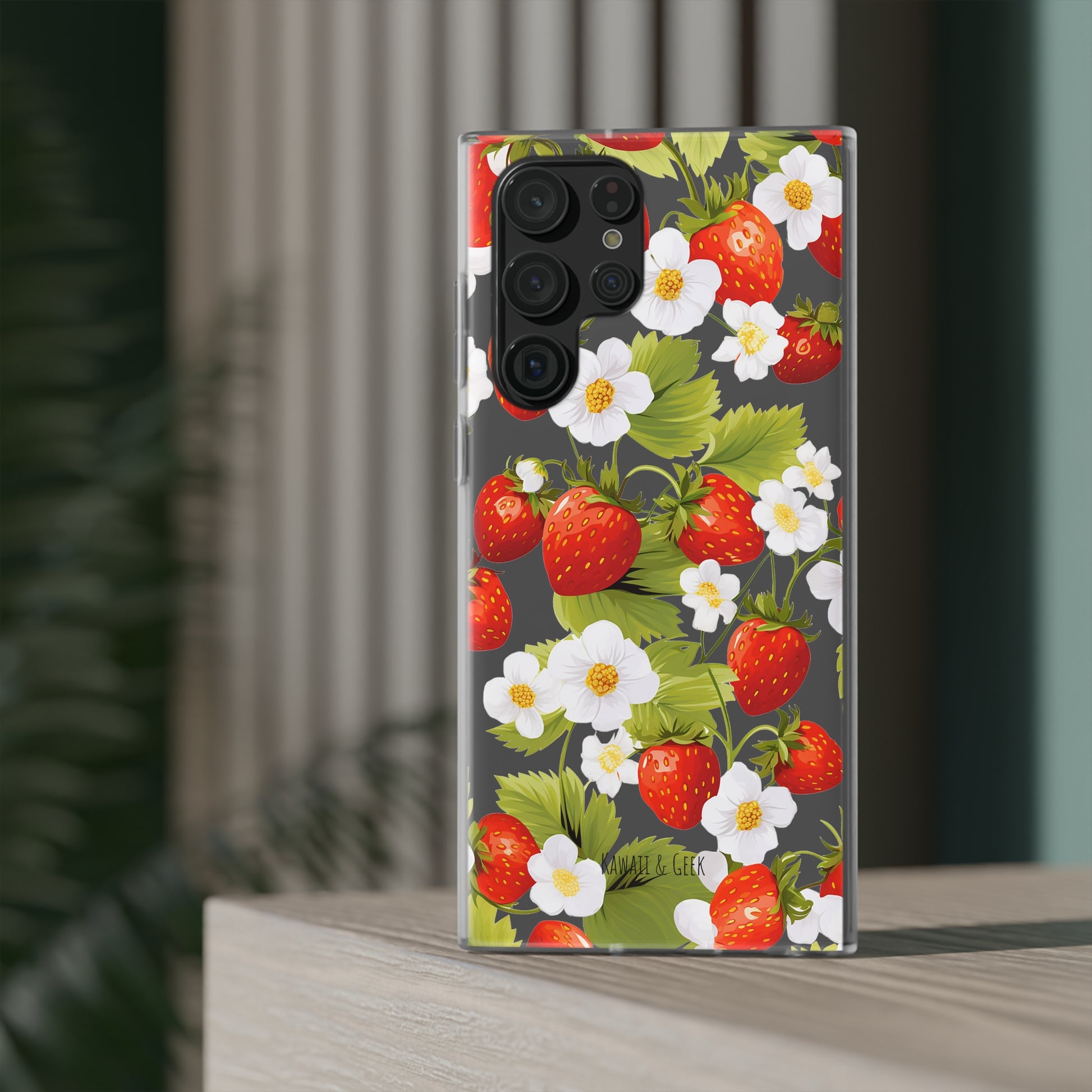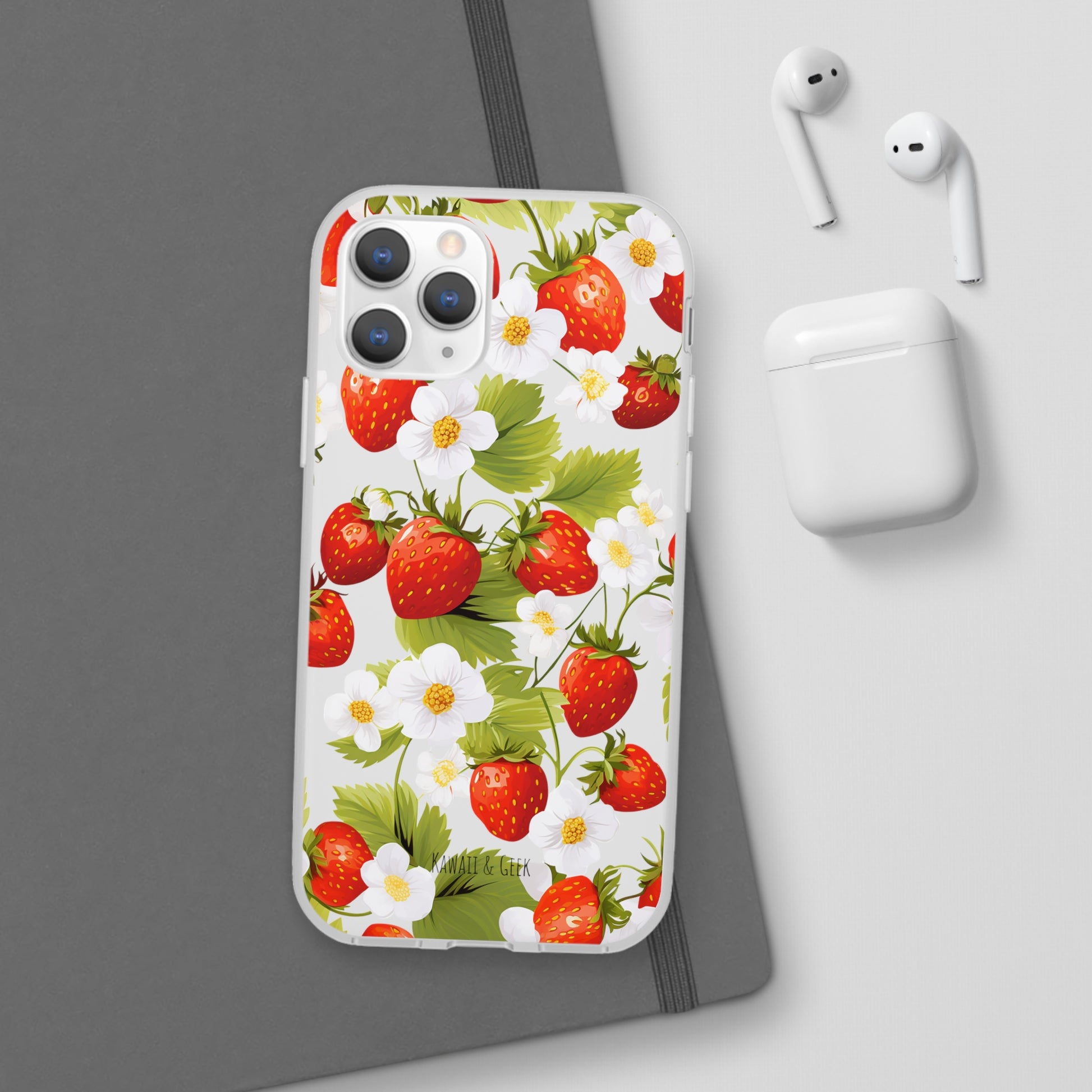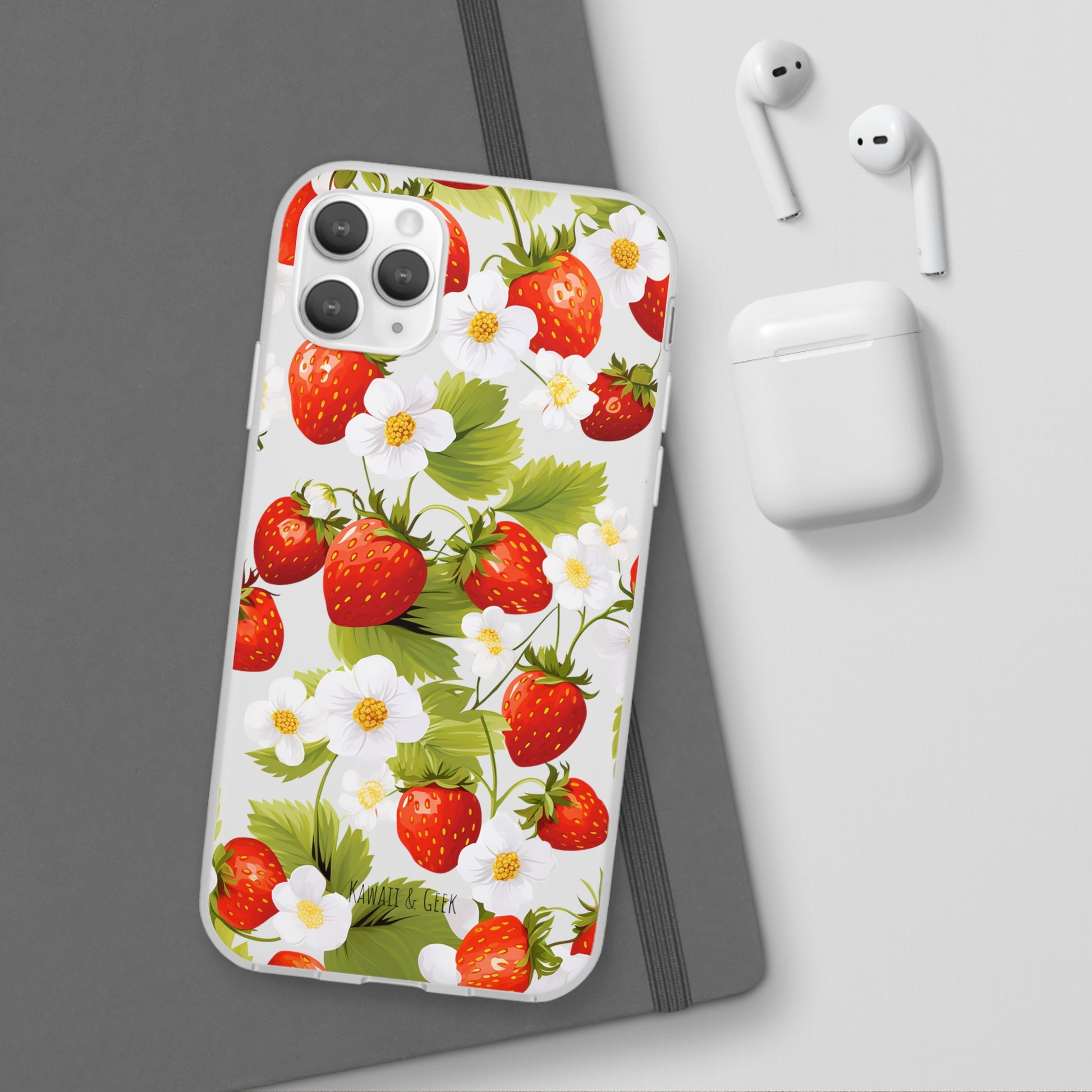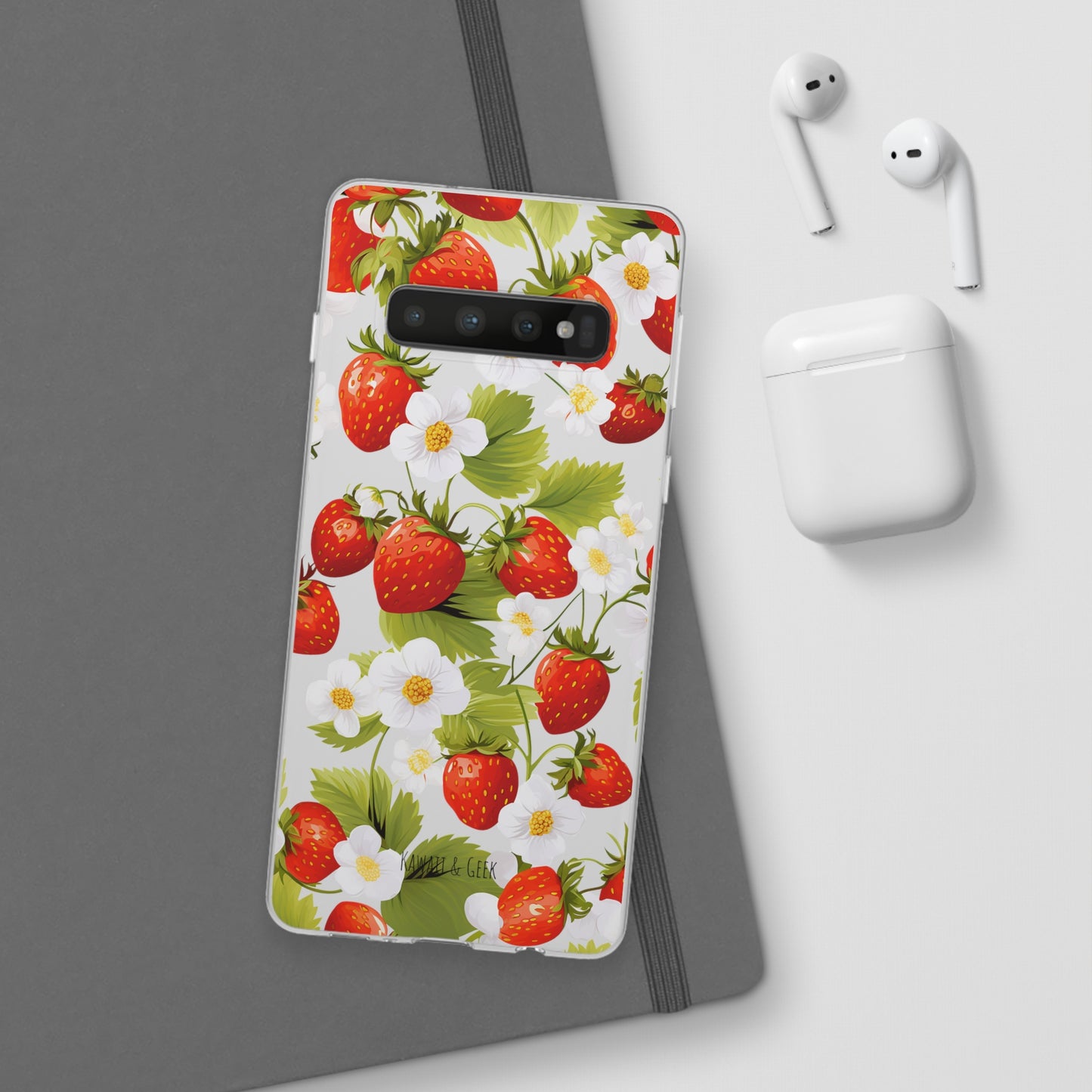 Keywords: Strawberry case, Floral design, Fruit cover, Transparent case, Nature phone case, Berries and blooms, Fresh design, Garden vibe, Phone accessory, Elegant protector, Fruit and flower, Berry aesthetic, Summer feeling.