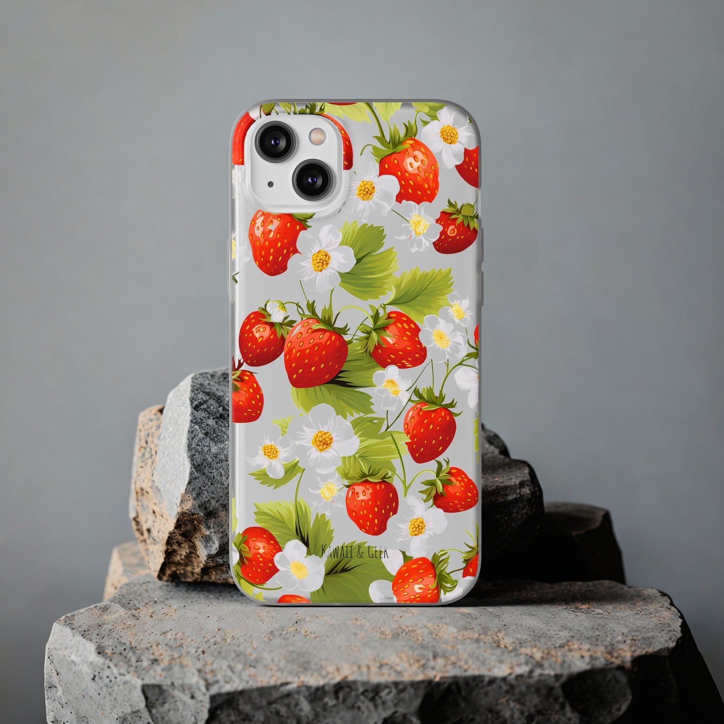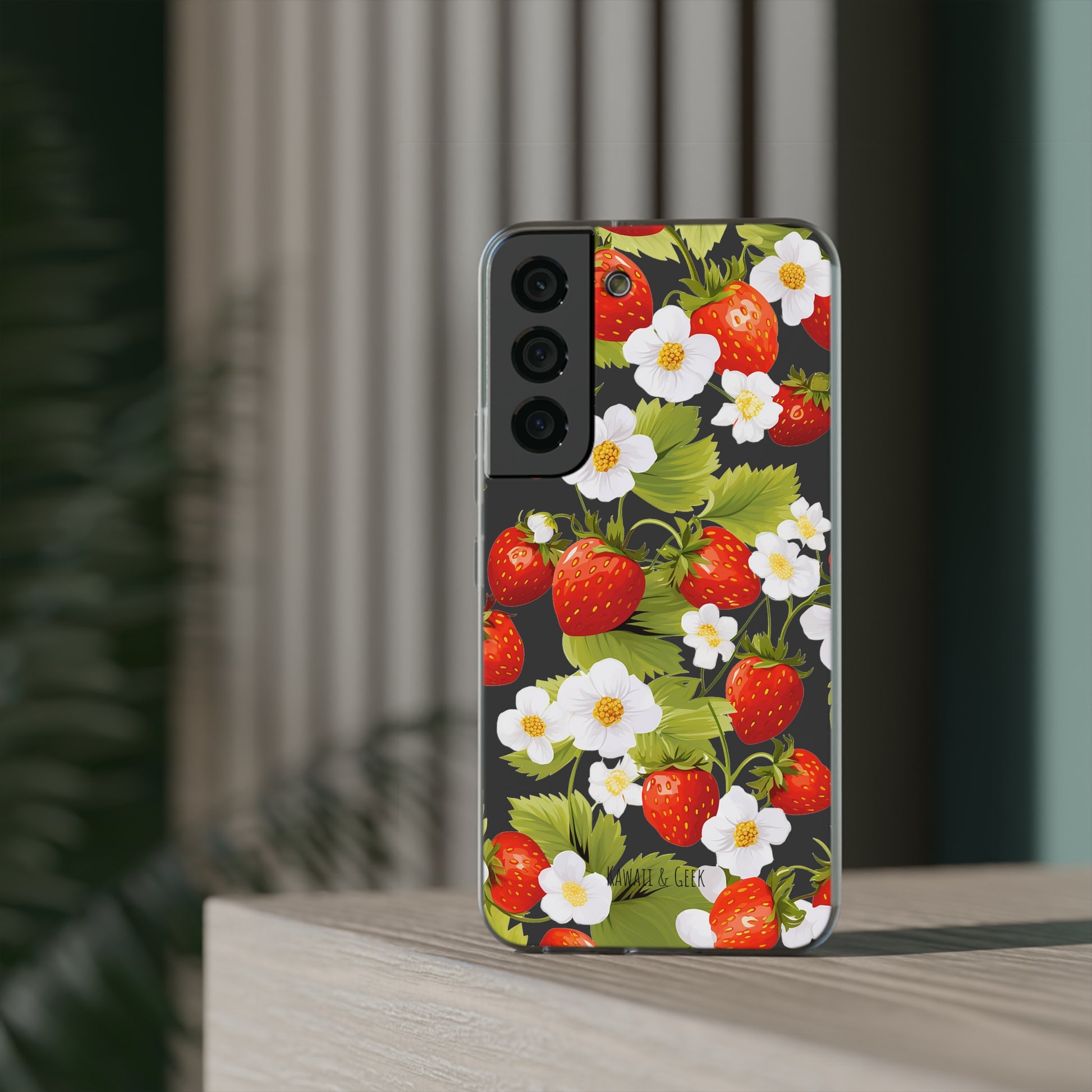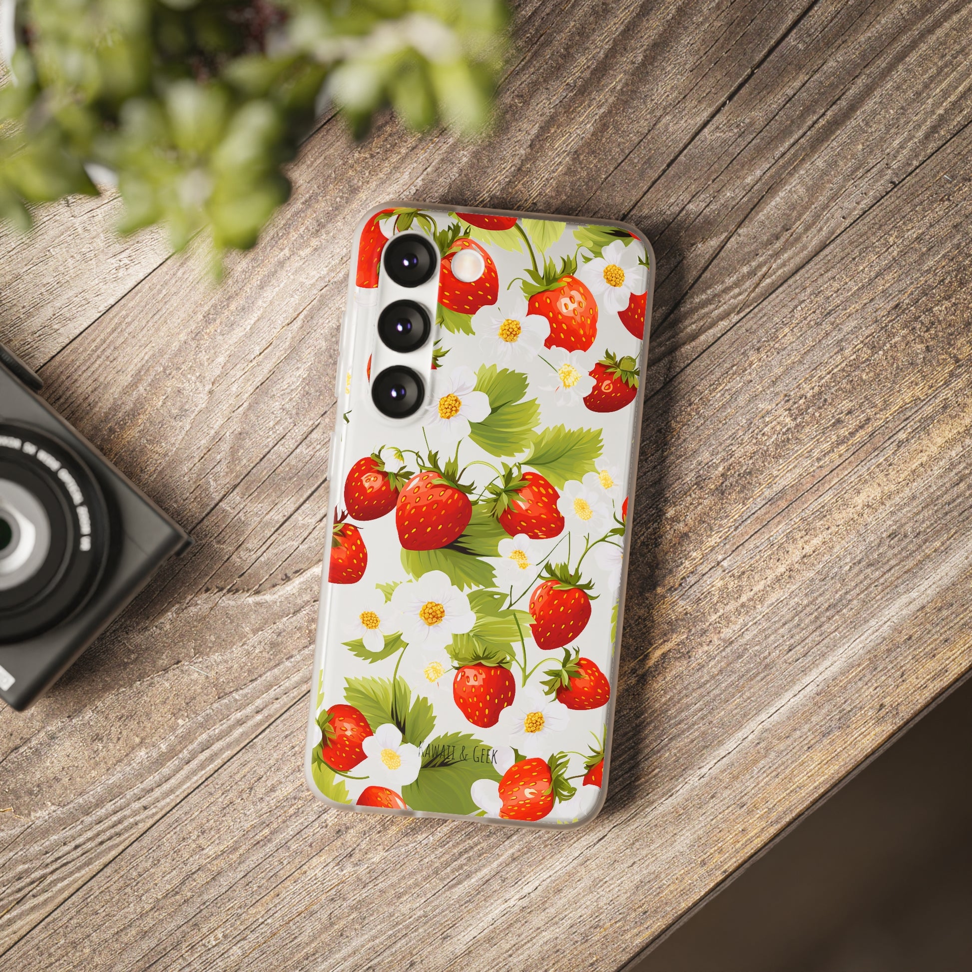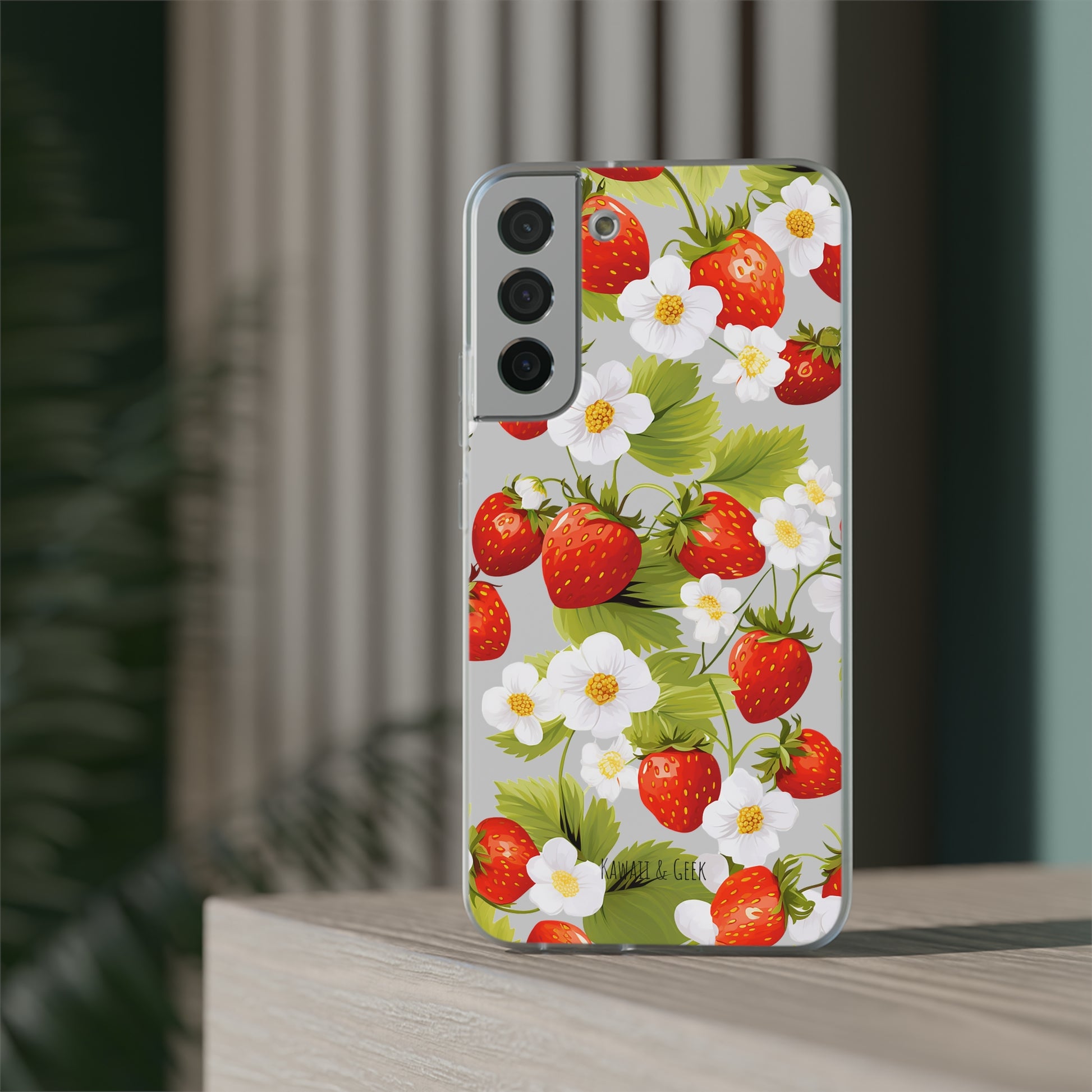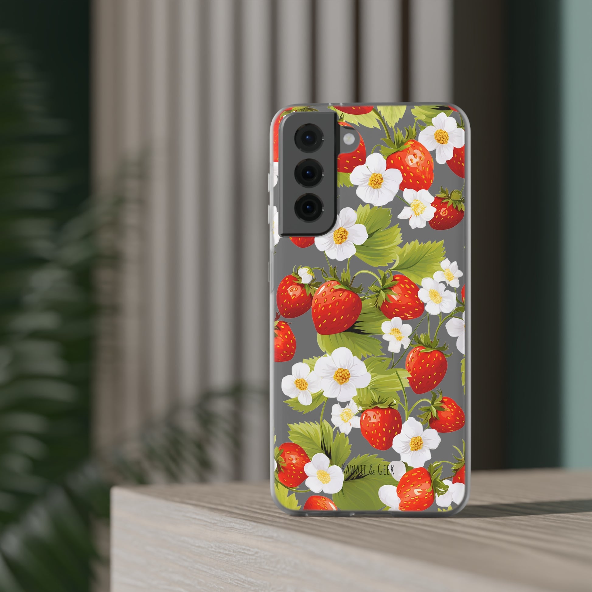 Keywords: Strawberry case, Floral design, Fruit cover, Transparent case, Nature phone case, Berries and blooms, Fresh design, Garden vibe, Phone accessory, Elegant protector, Fruit and flower, Berry aesthetic, Summer feeling.