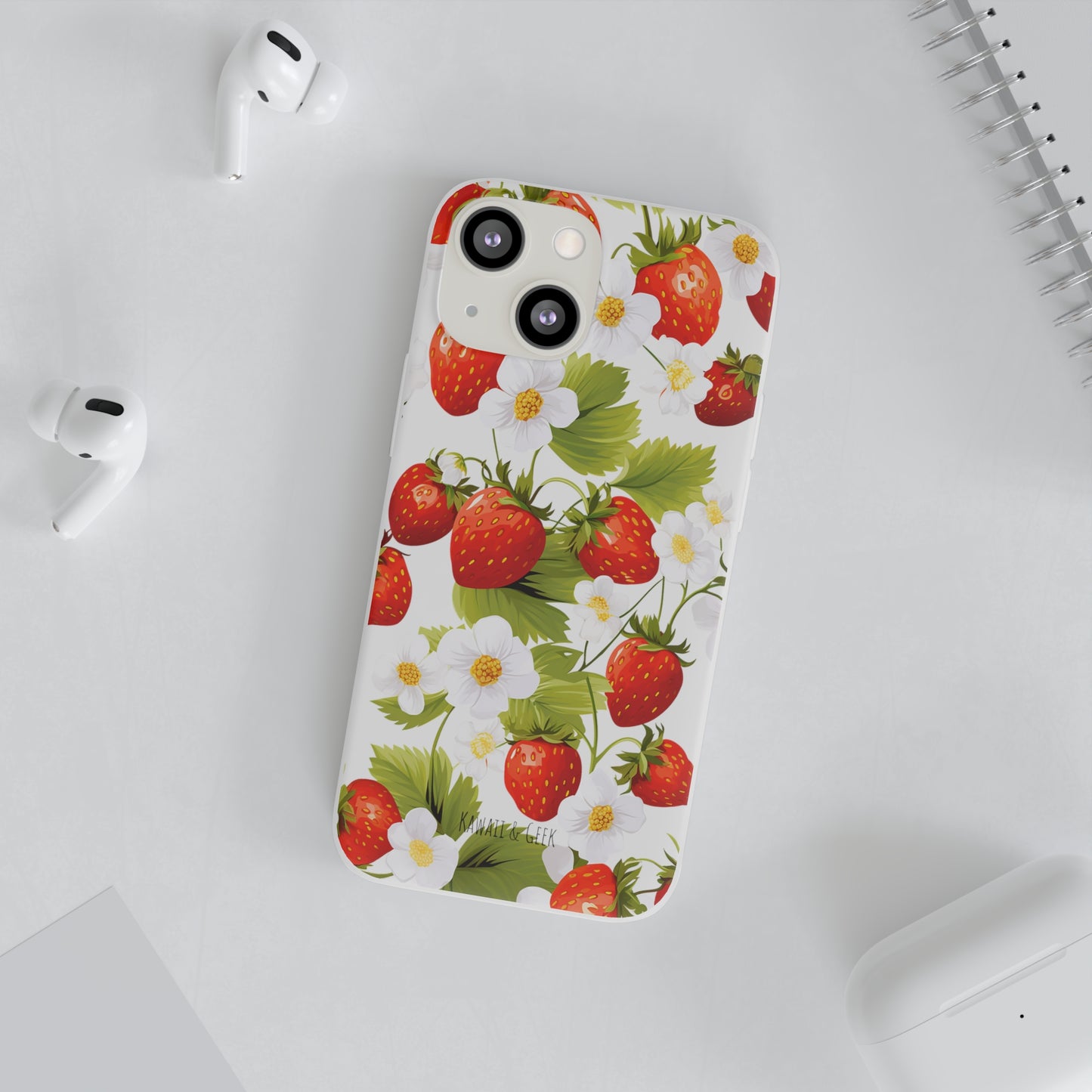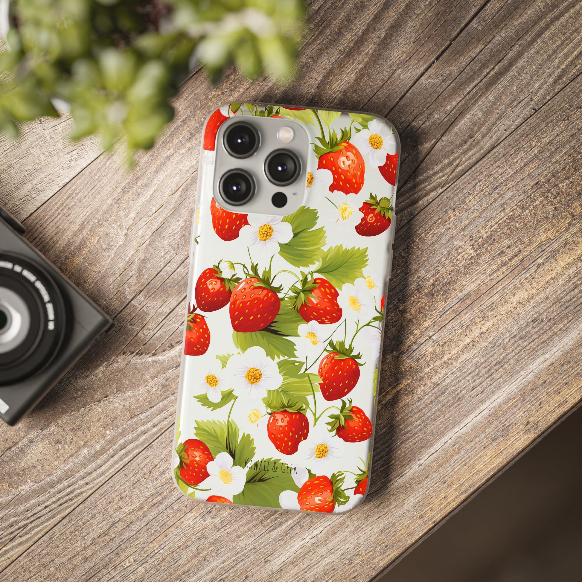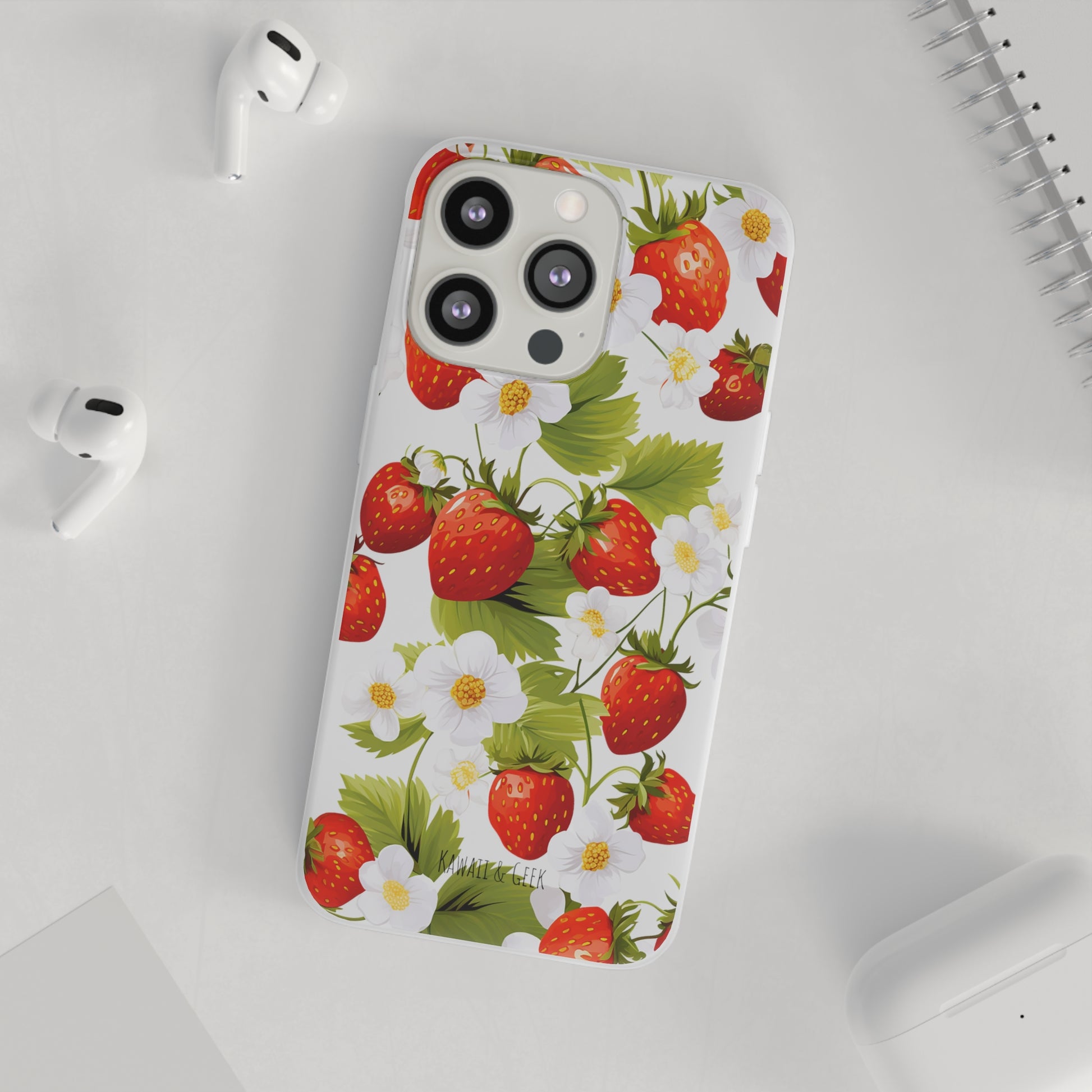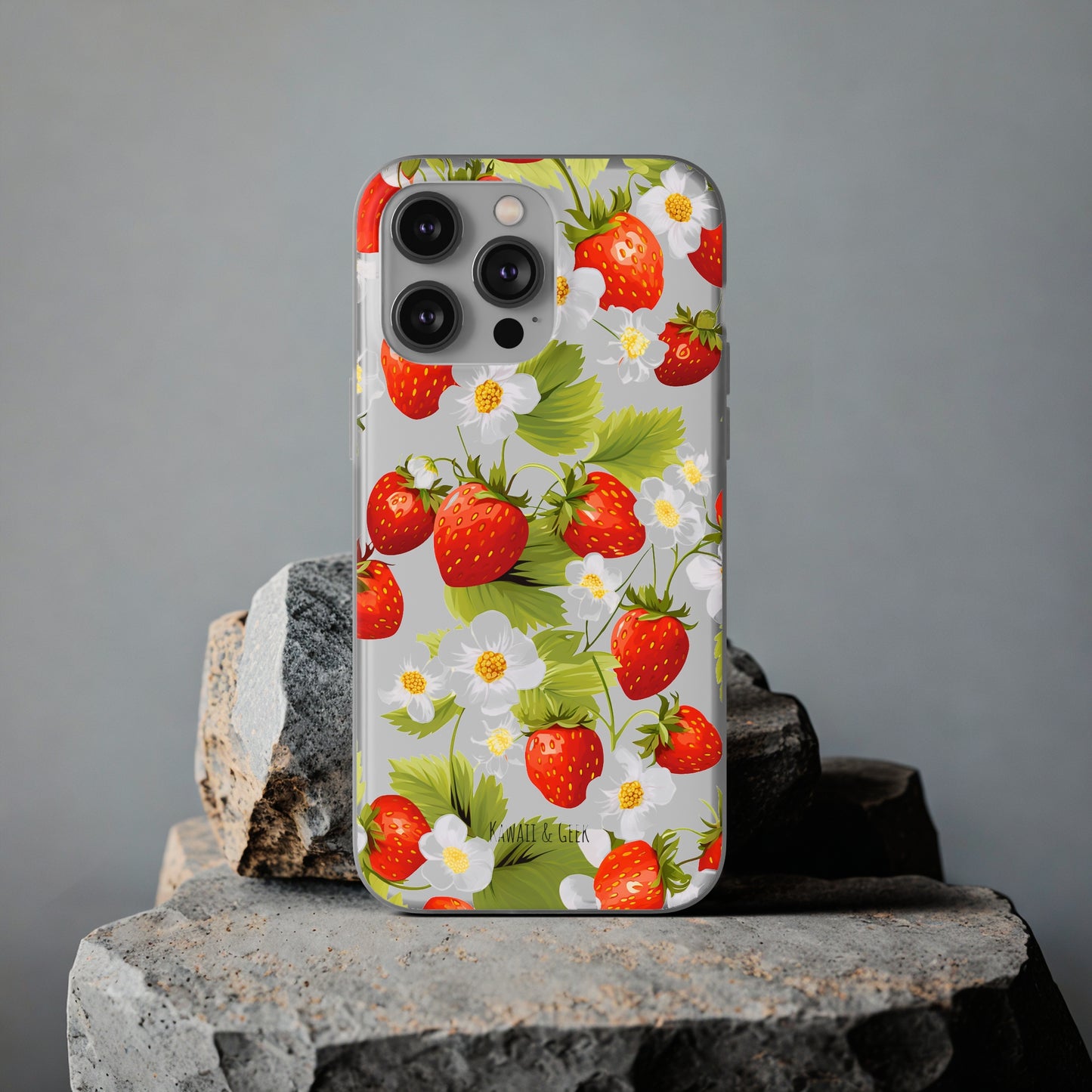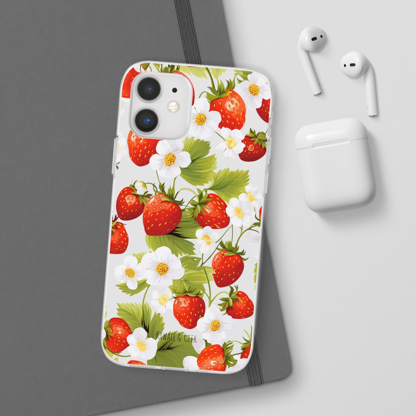 Keywords: Strawberry case, Floral design, Fruit cover, Transparent case, Nature phone case, Berries and blooms, Fresh design, Garden vibe, Phone accessory, Elegant protector, Fruit and flower, Berry aesthetic, Summer feeling.
