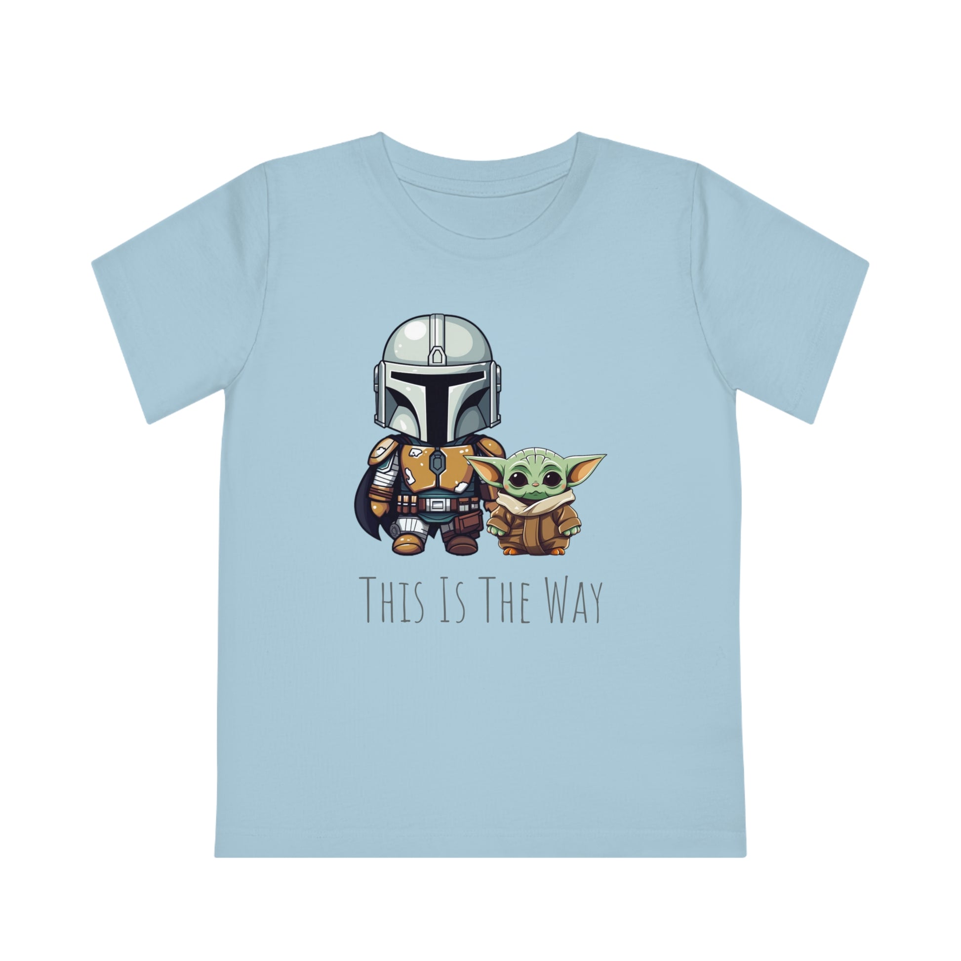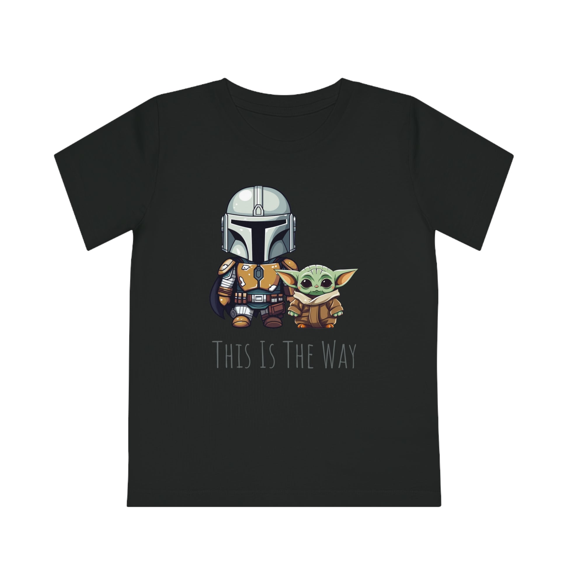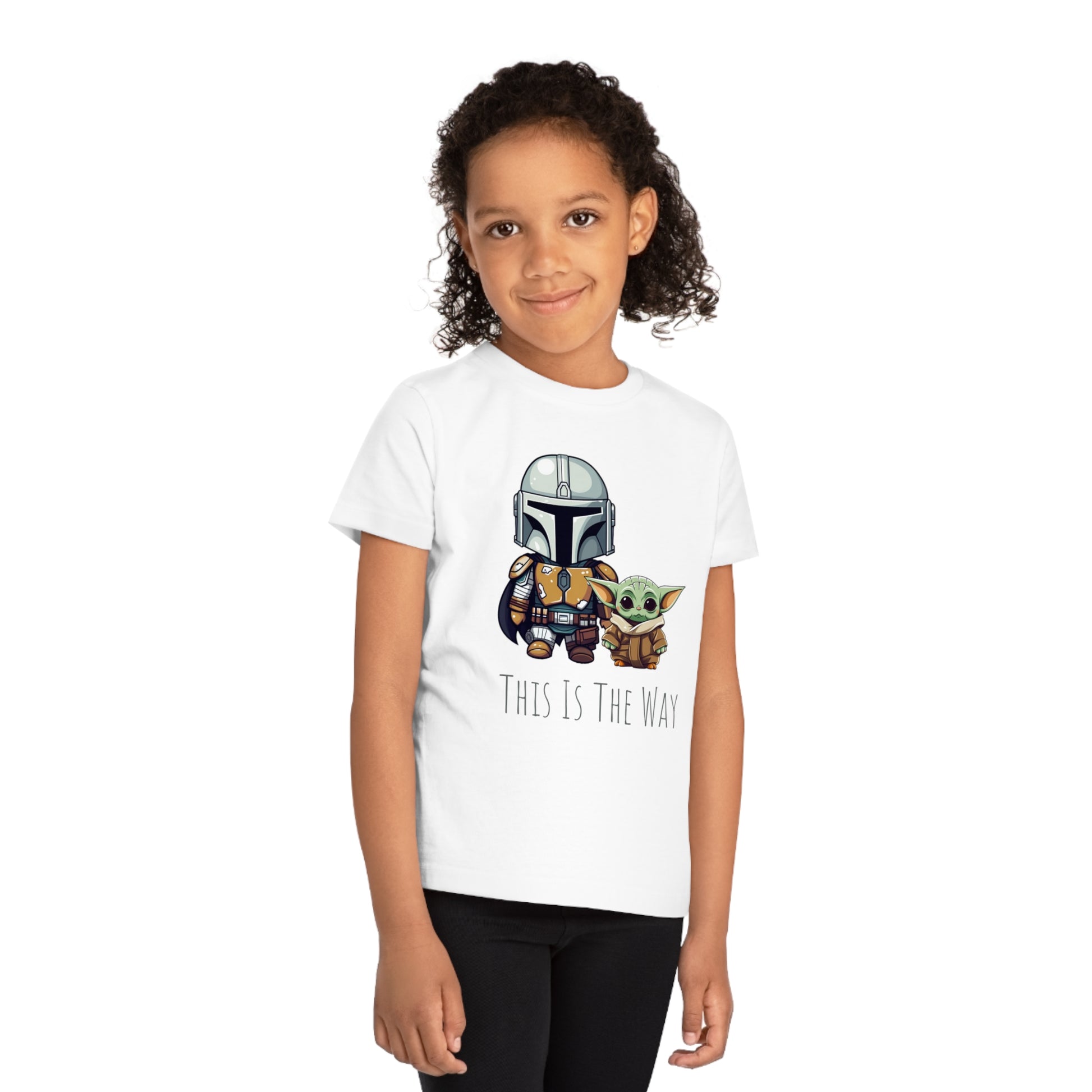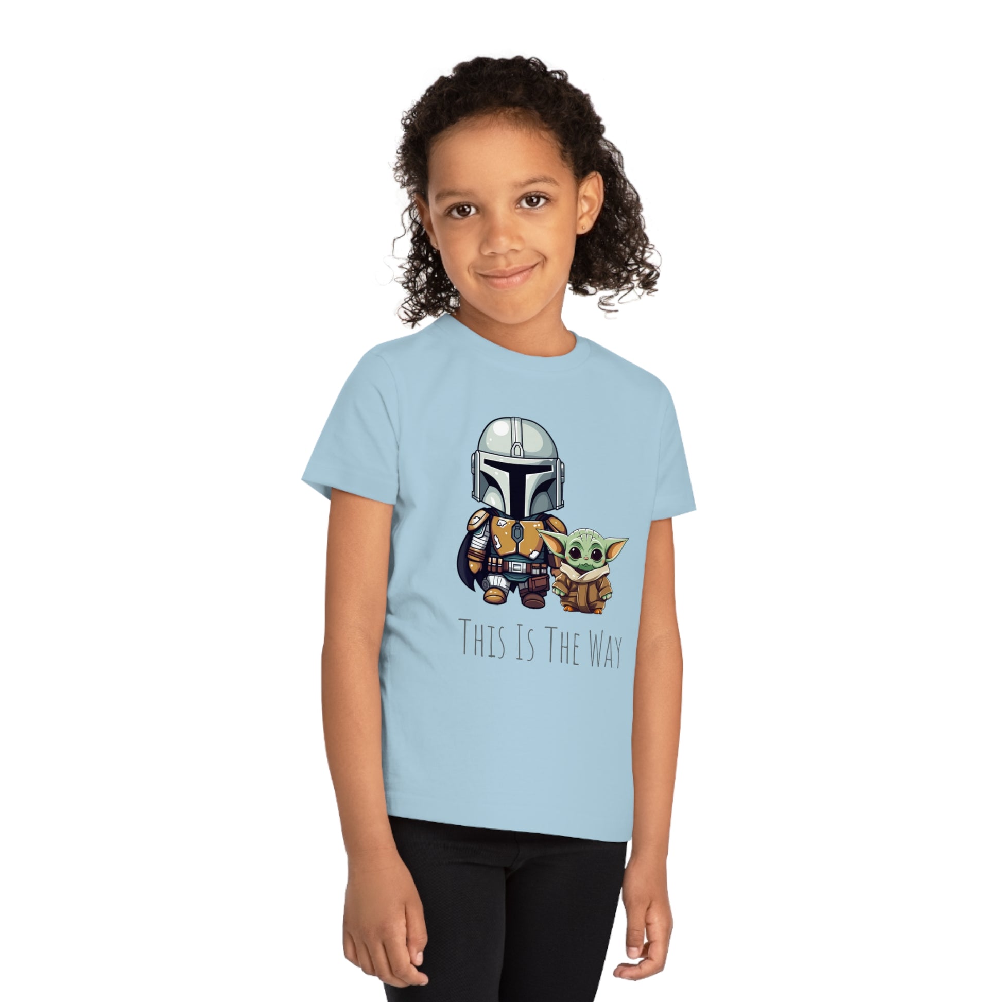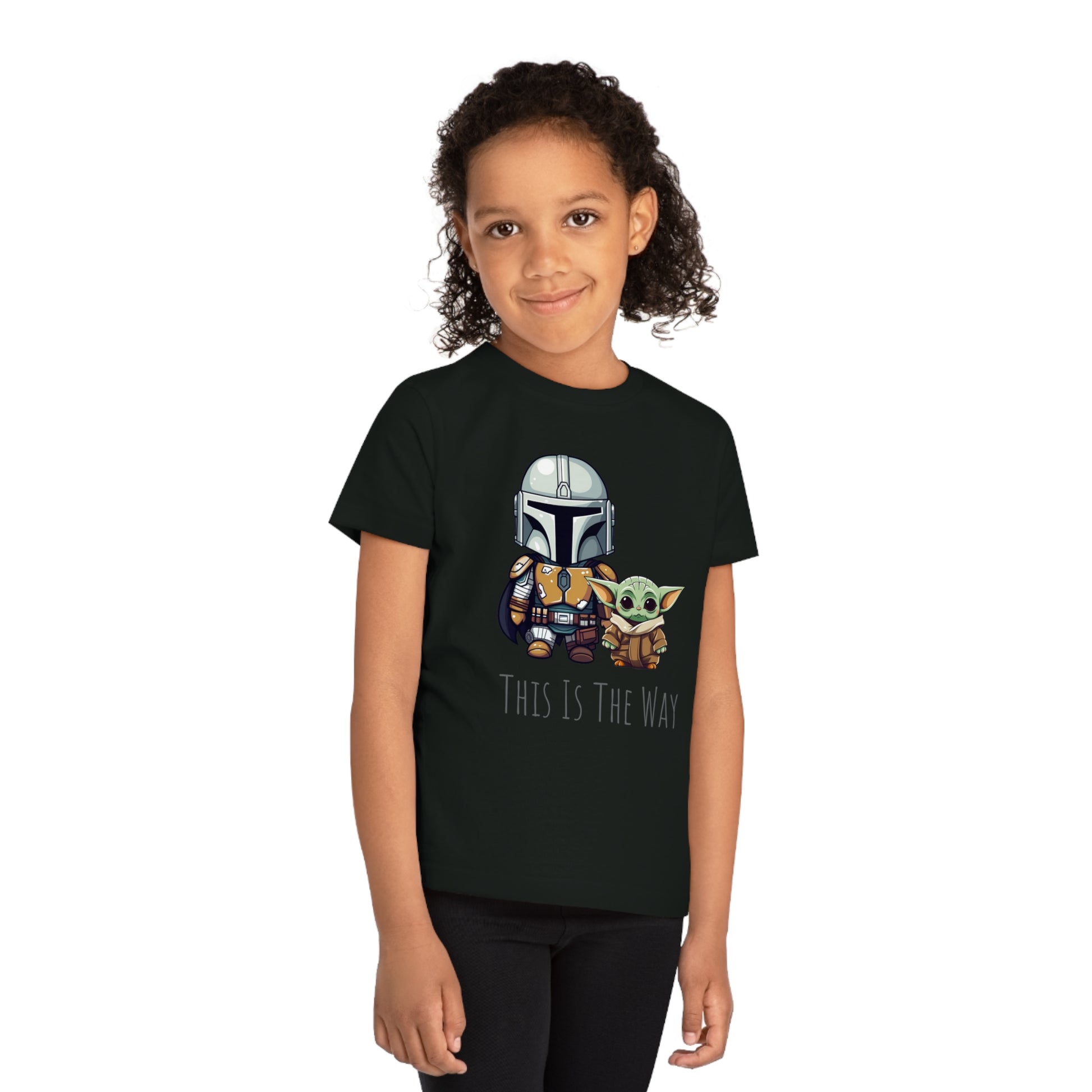 Keywords: Kids eco-friendly t-shirt, Baby Yoda and Mandalorian design, "This is the Way" phrase, sustainable materials, Star Wars fans, galactic adventures, high-quality print, eco-conscious fashion.