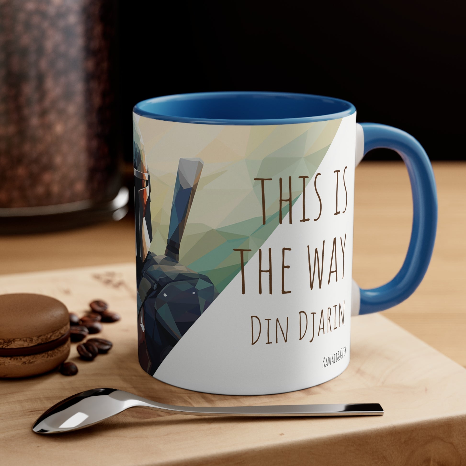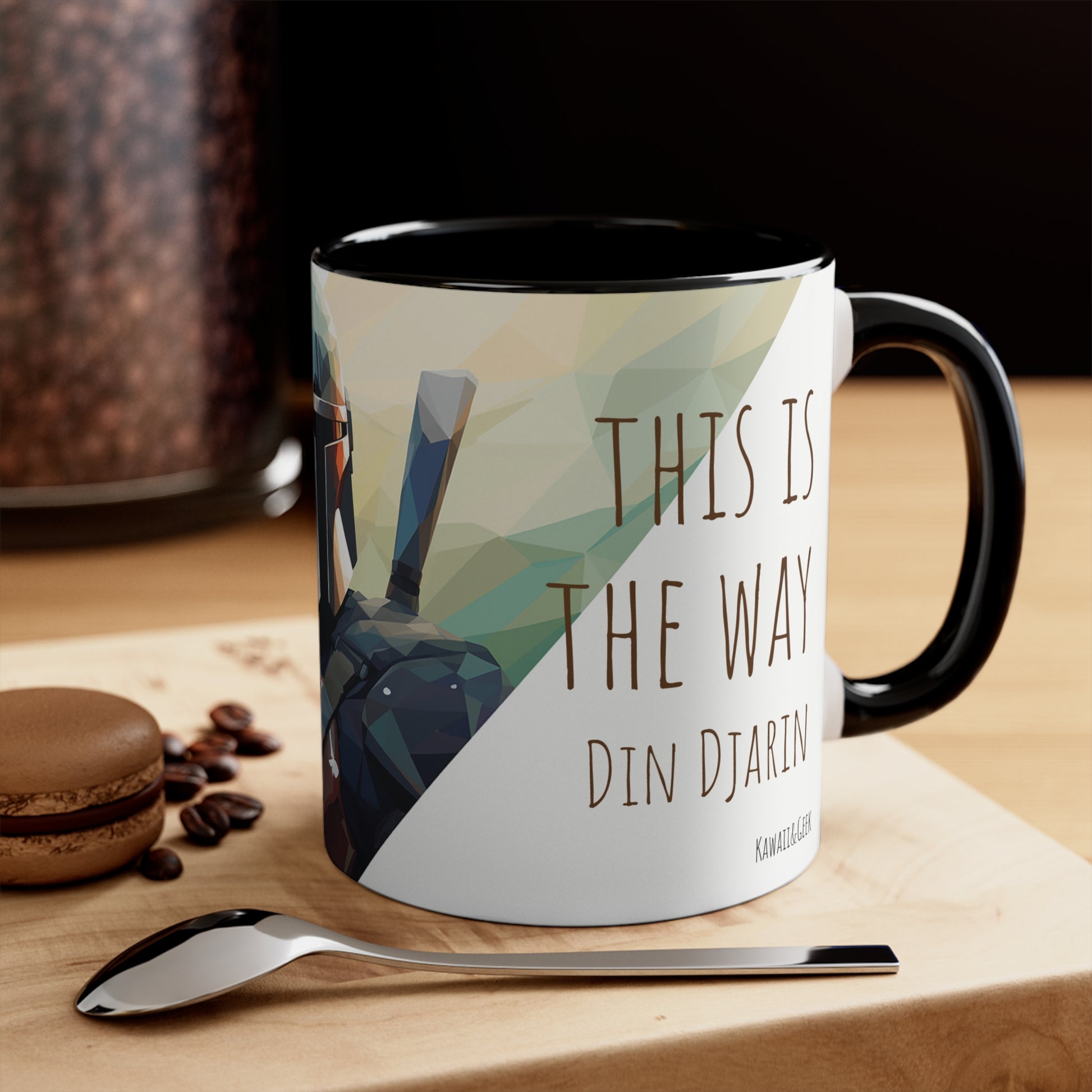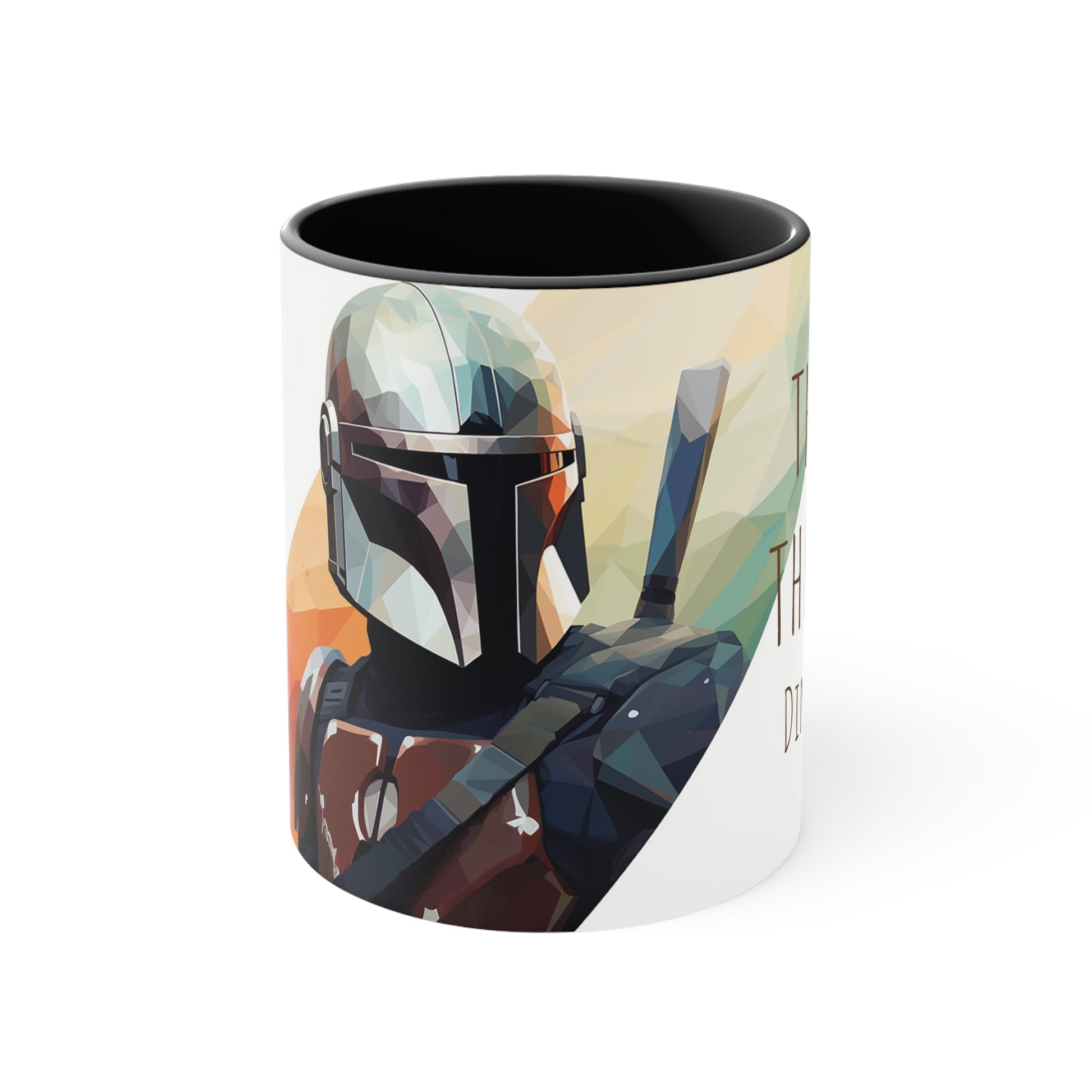 Keywords: The Mandalorian mug, Geometric style, Bicolor design, This is the Way, Bounty hunter's path, Iconic phrase, Honor and resilience, Legendary character, Galactic adventure, Favorite beverage, Devoted fans, Coffee or tea, Drinkware collectible, Star Wars vibes.