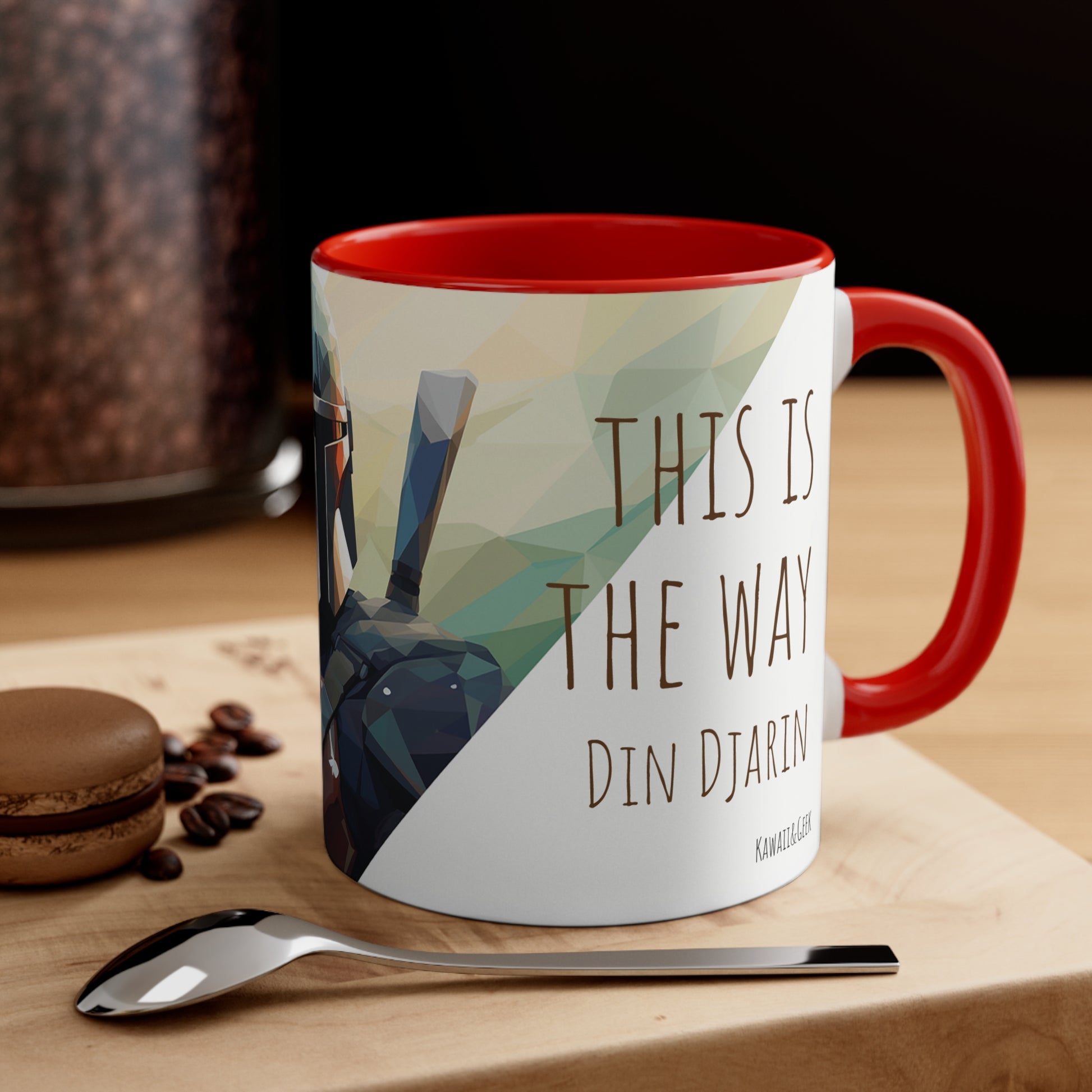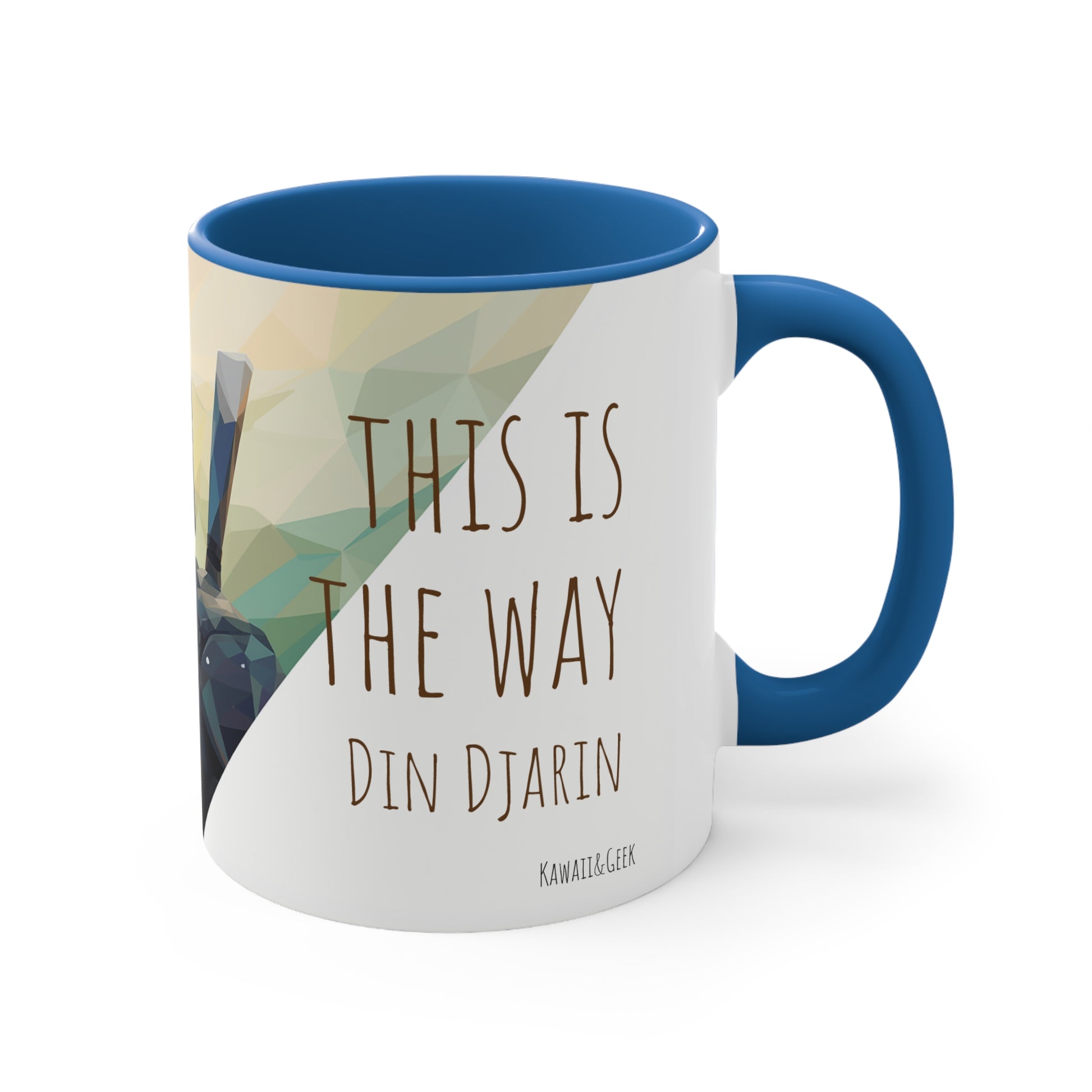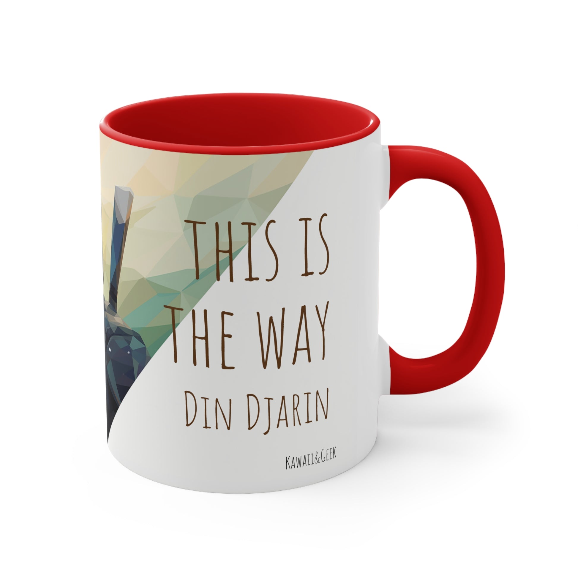 Keywords: The Mandalorian mug, Geometric style, Bicolor design, This is the Way, Bounty hunter's path, Iconic phrase, Honor and resilience, Legendary character, Galactic adventure, Favorite beverage, Devoted fans, Coffee or tea, Drinkware collectible, Star Wars vibes.