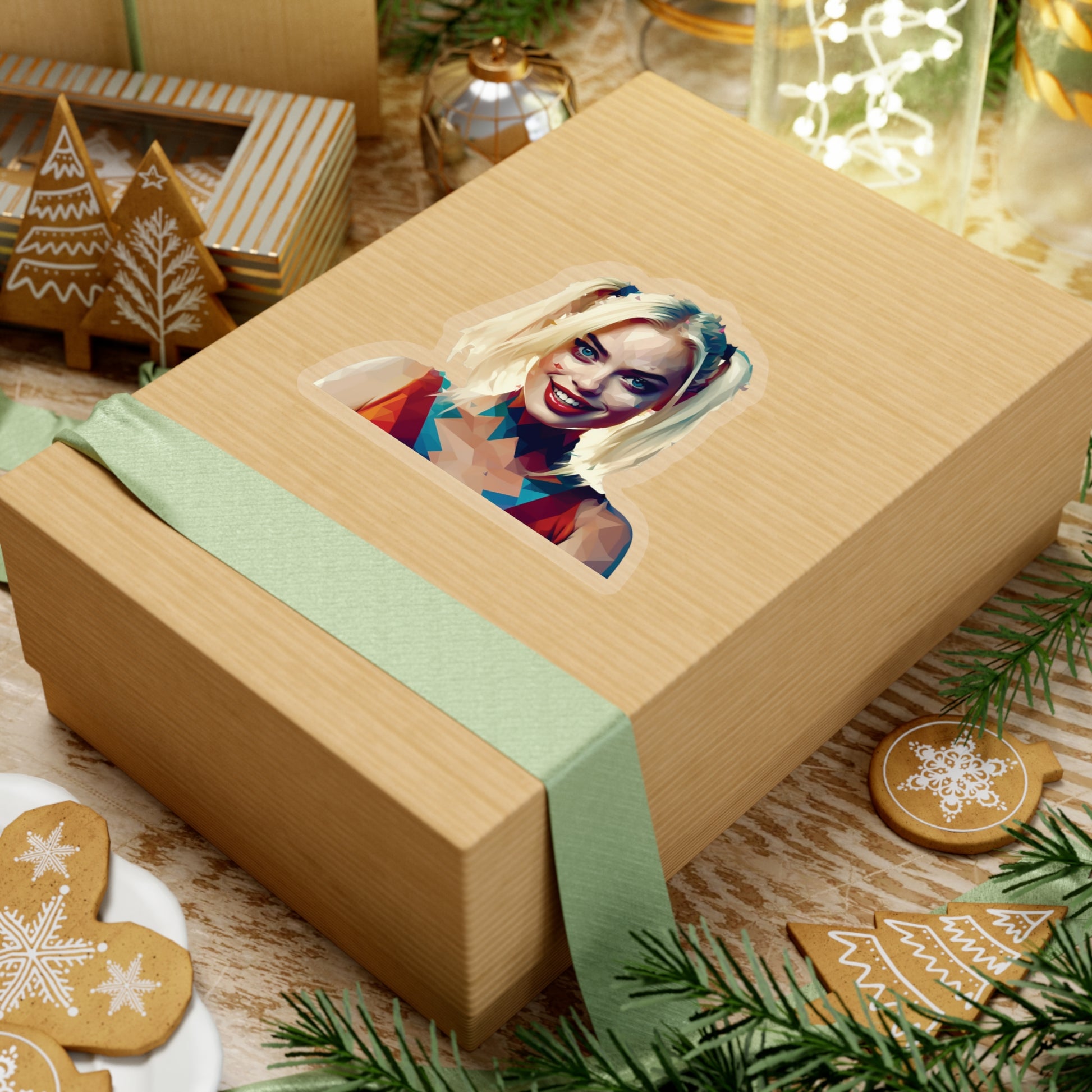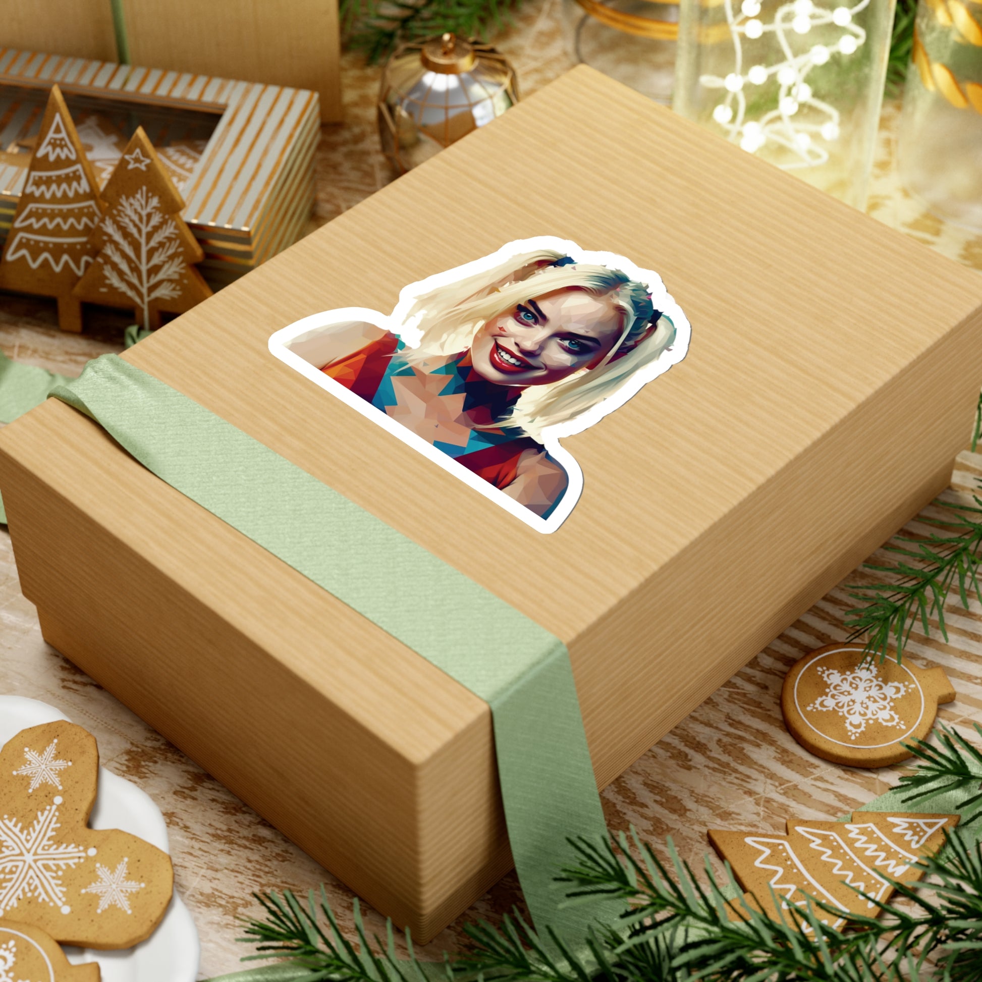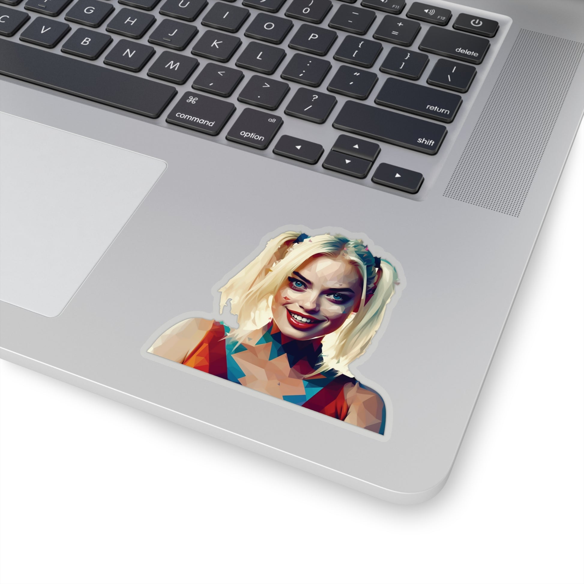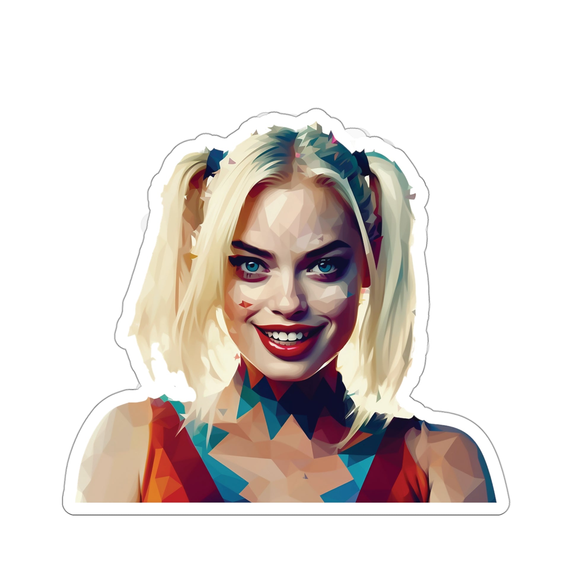 Keywords: Geometric sticker, Margot Robbie, Harley Quinn, Faceted design, Tribute, Vibrant character, Unpredictable, Unique, Artistic, Queen of Chaos, Wild and colorful, Artistic masterpiece, Captivating portrayal