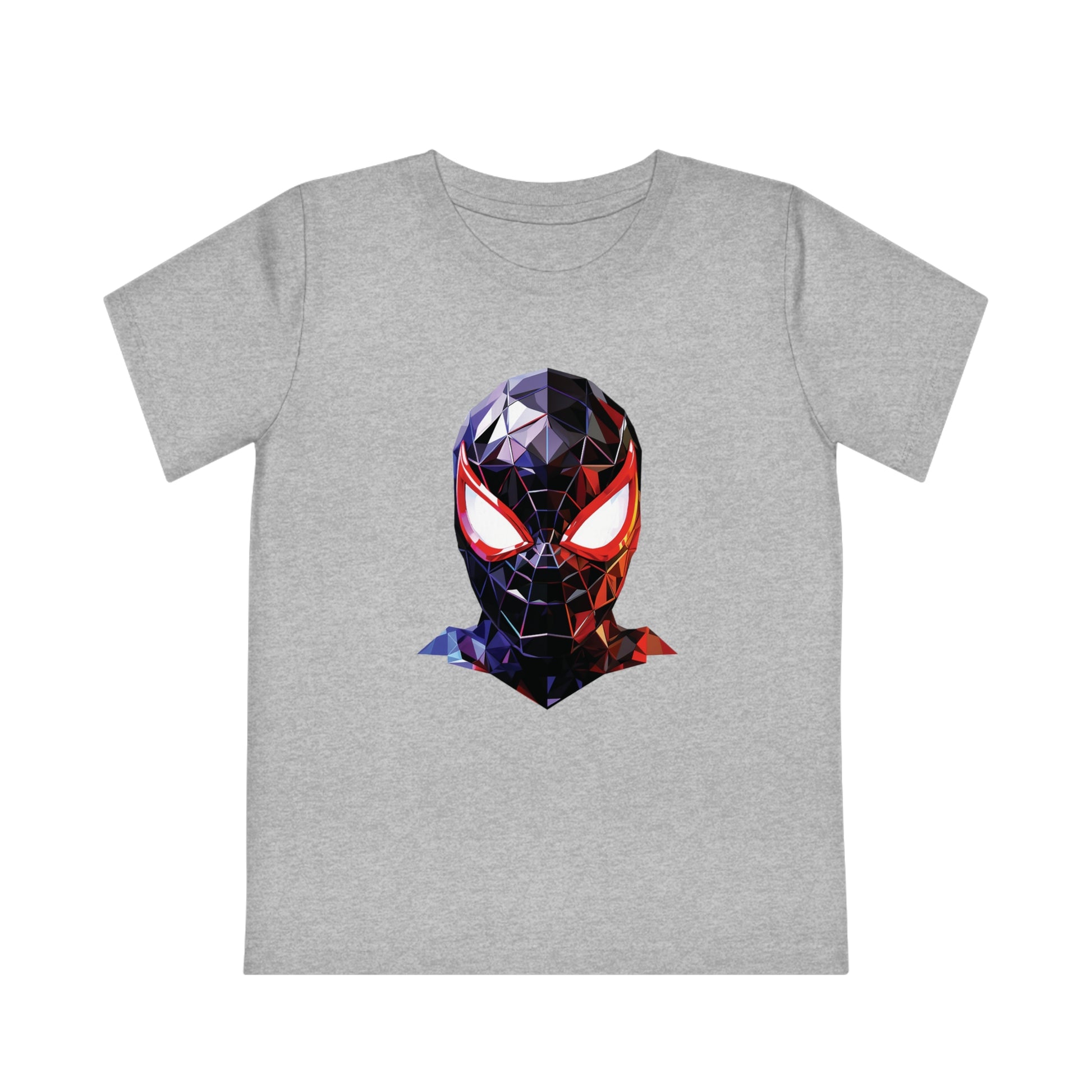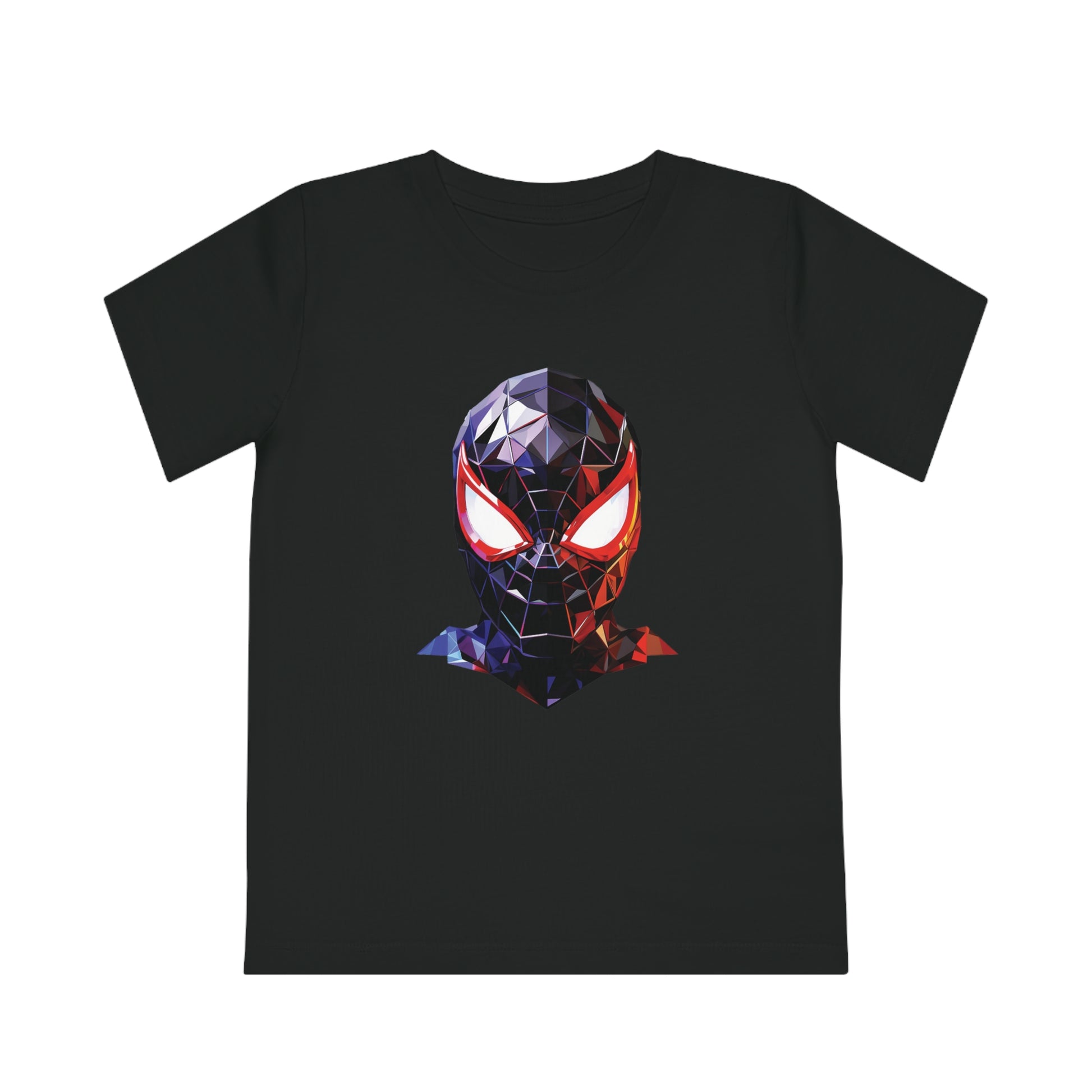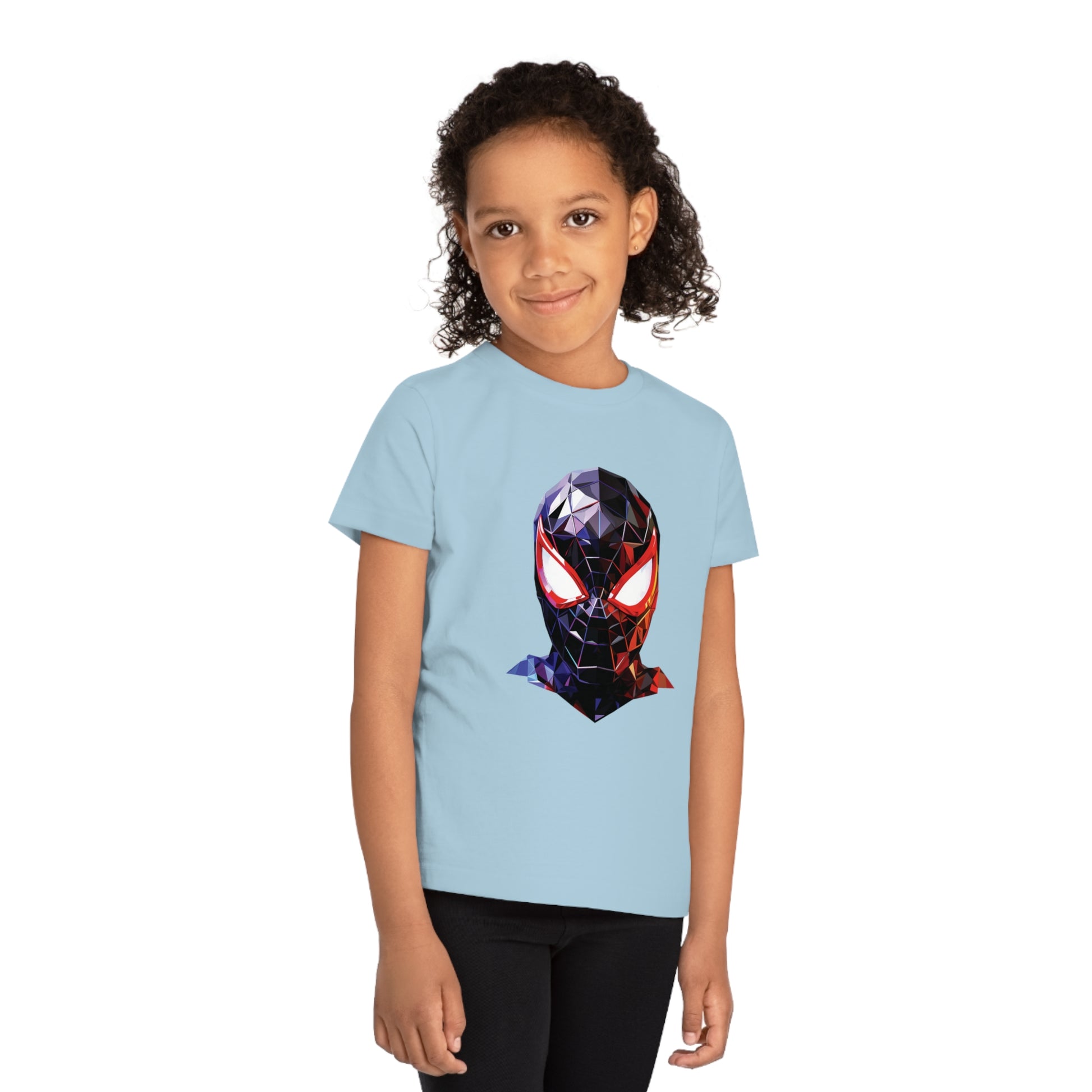 Keywords: Miles Morales kids t-shirt, polygonal geometric style, eco-friendly materials, Spidey style, dynamic design, unique style, superhero enthusiast, sustainable fashion.