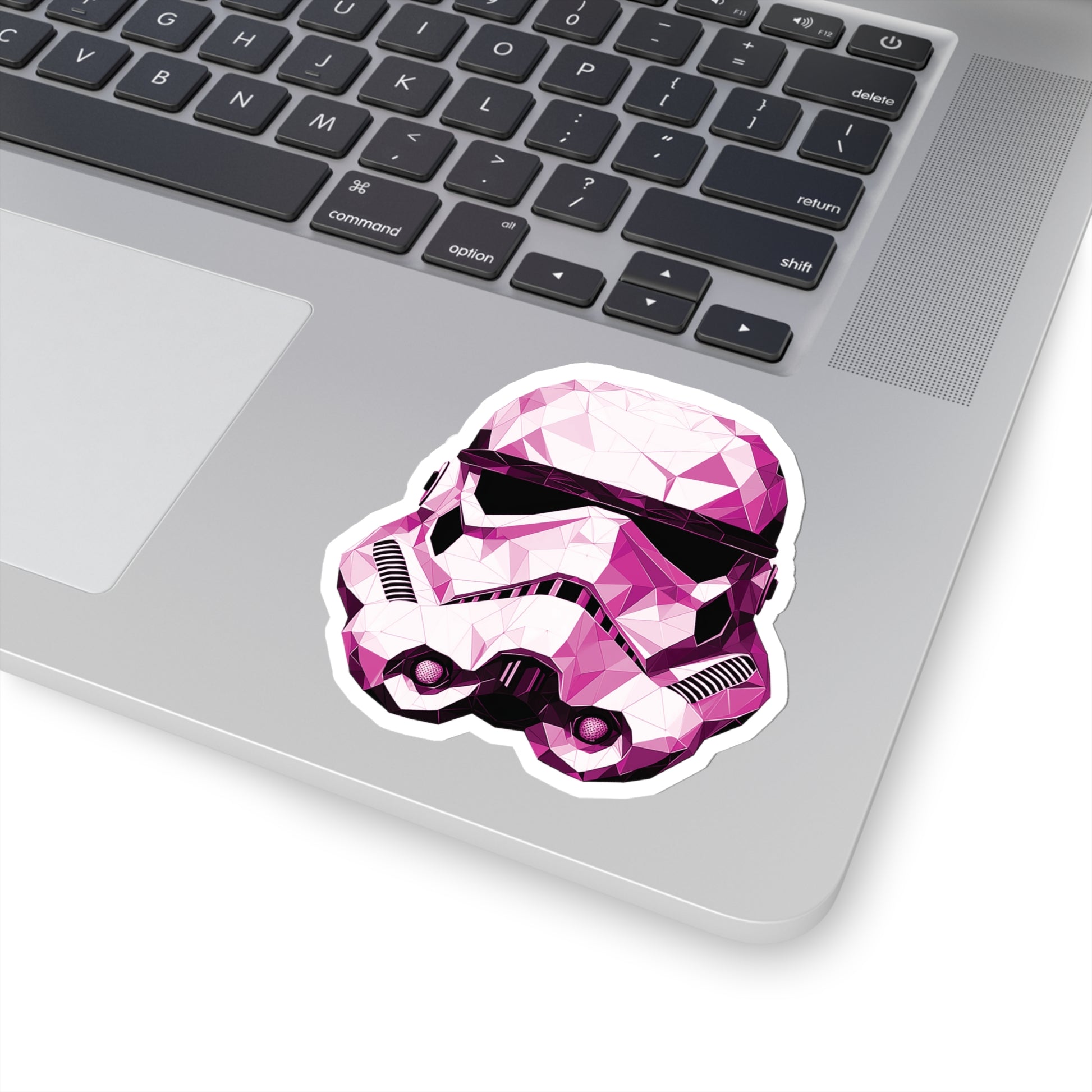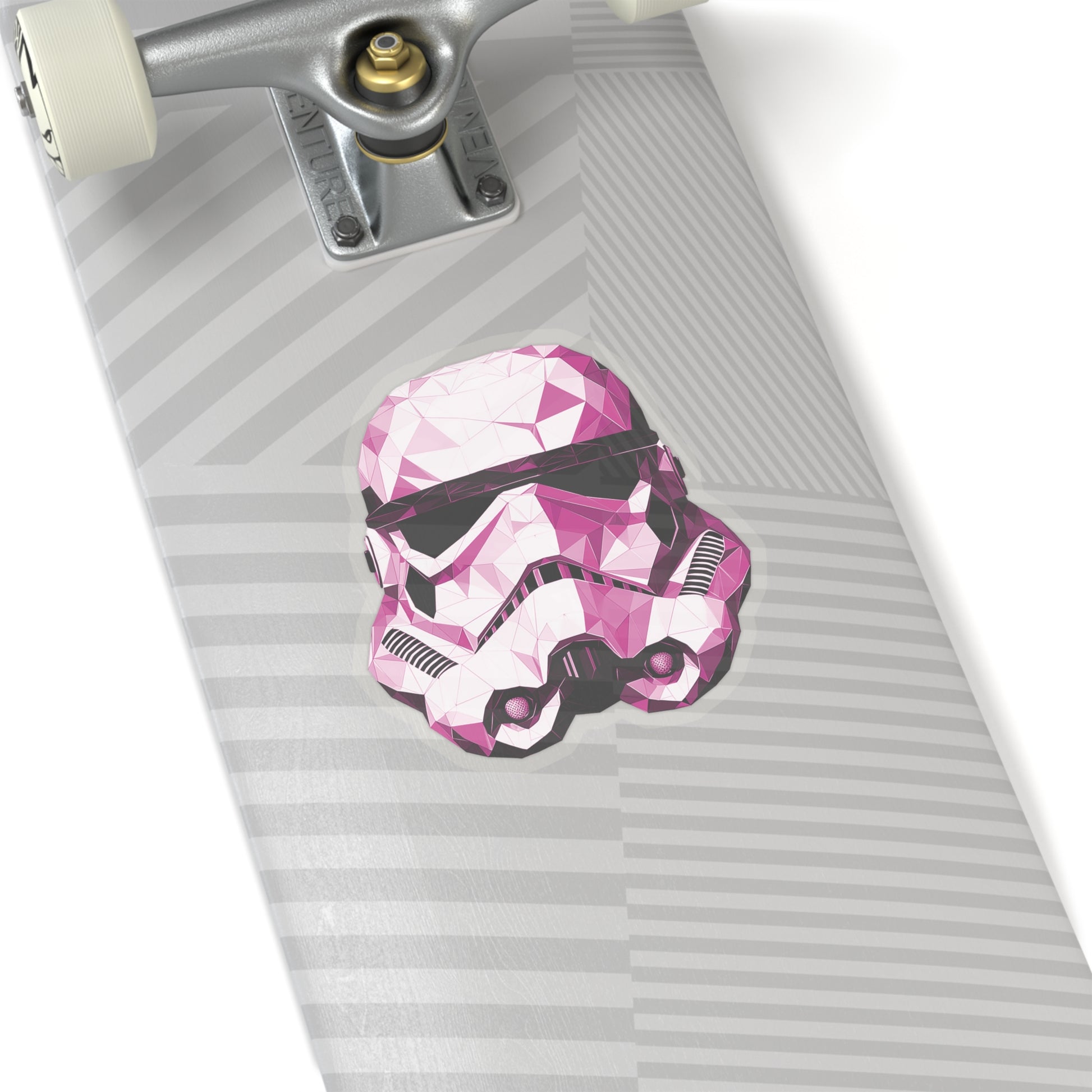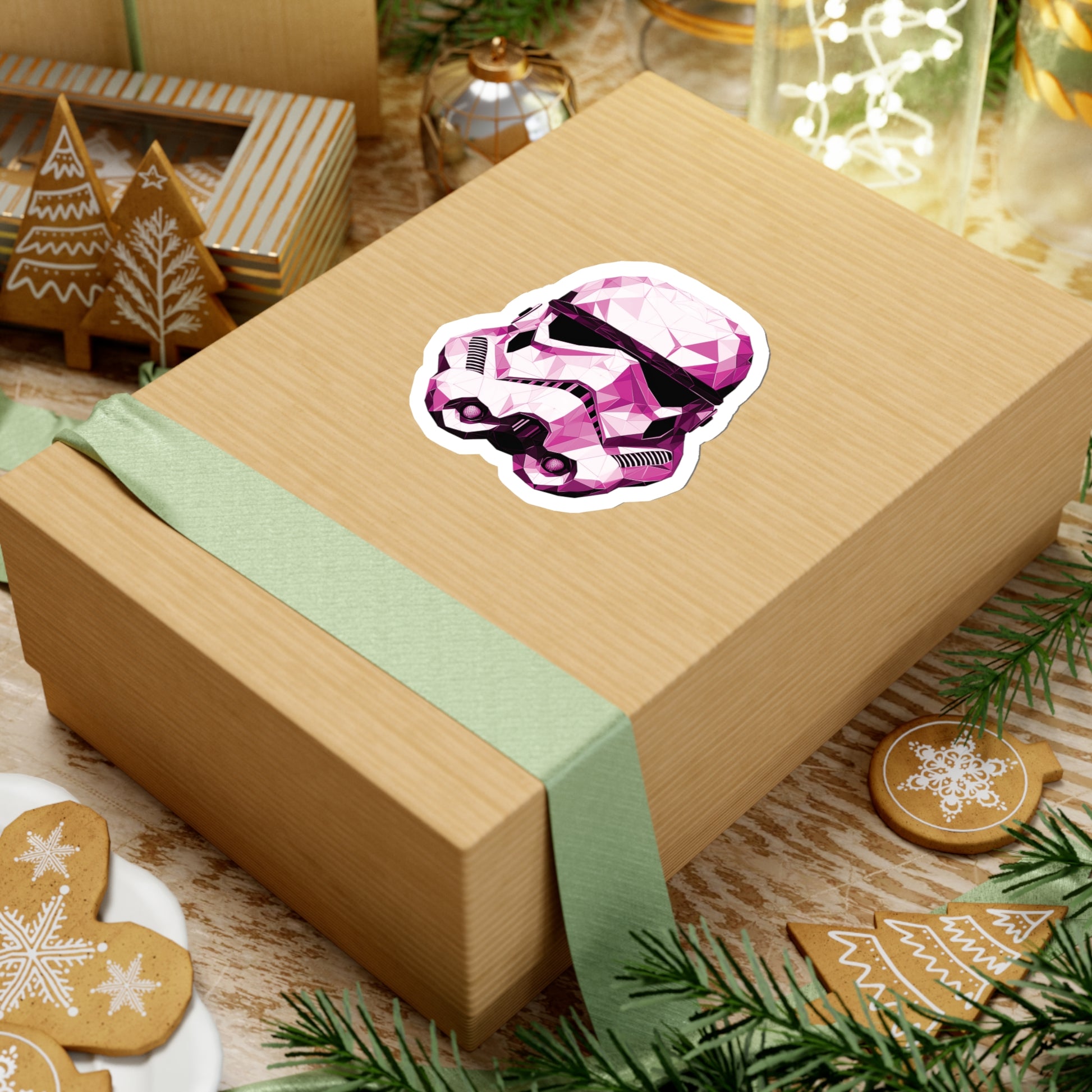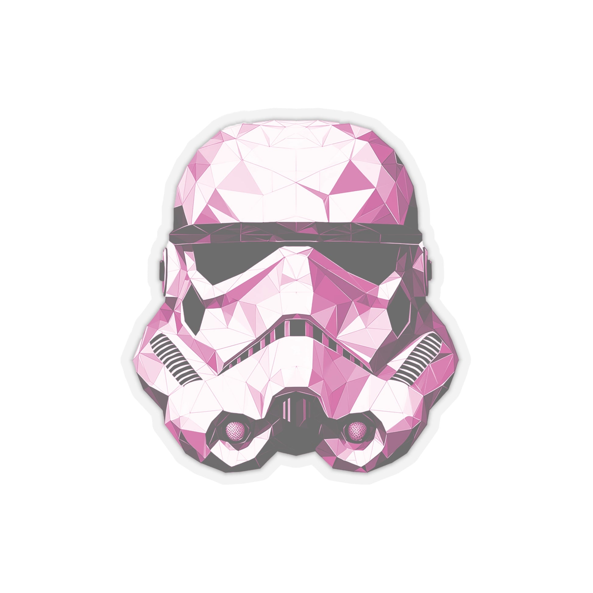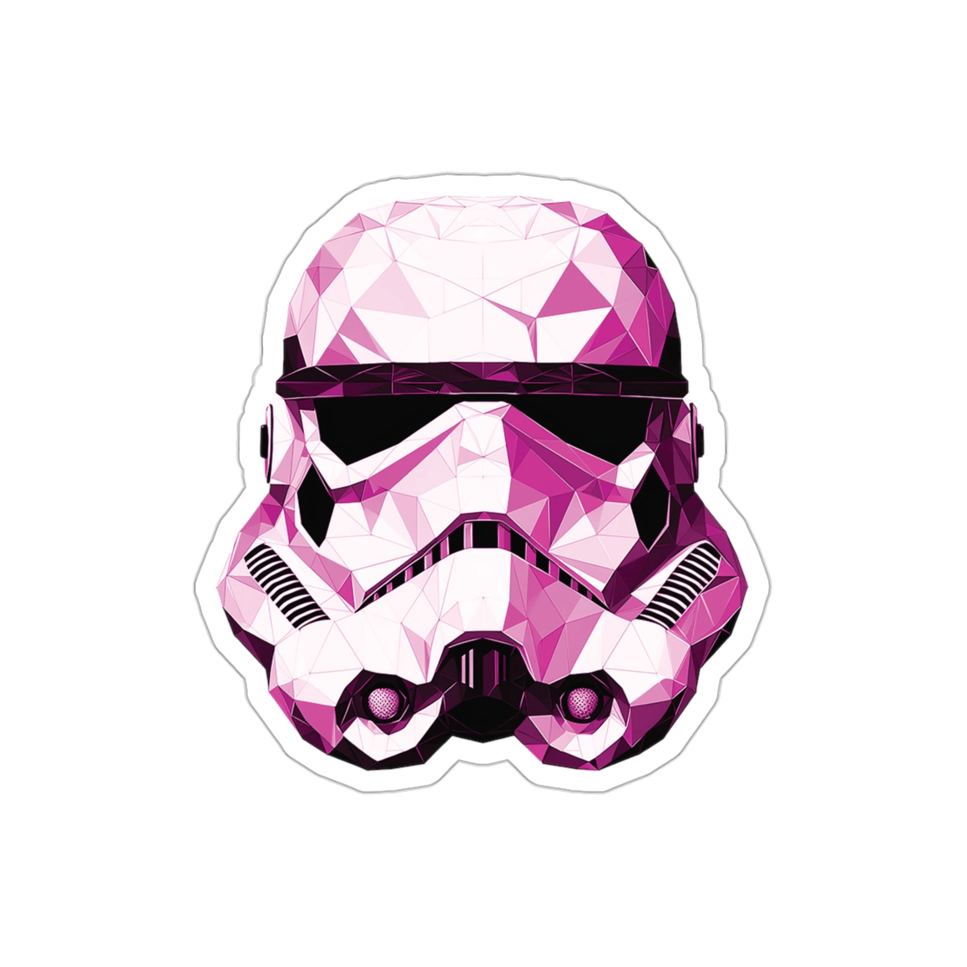 Keywords: Pink Stormtrooper sticker, geometric style, vector design, galactic elegance, delicate color, intricate shapes, modern and captivating, Star Wars fan..