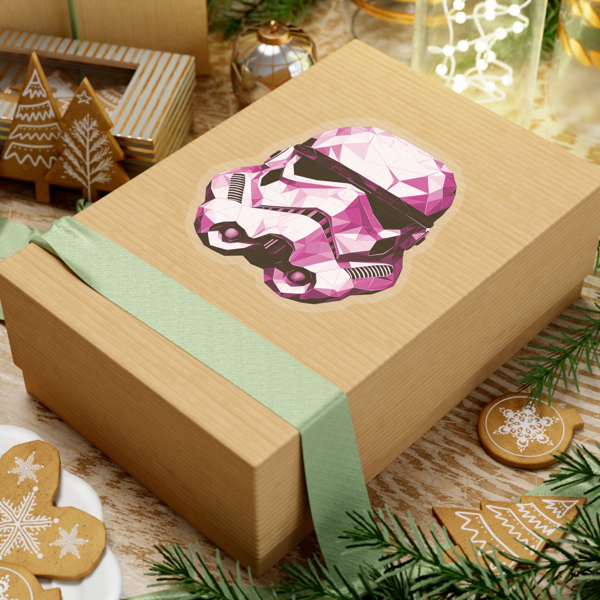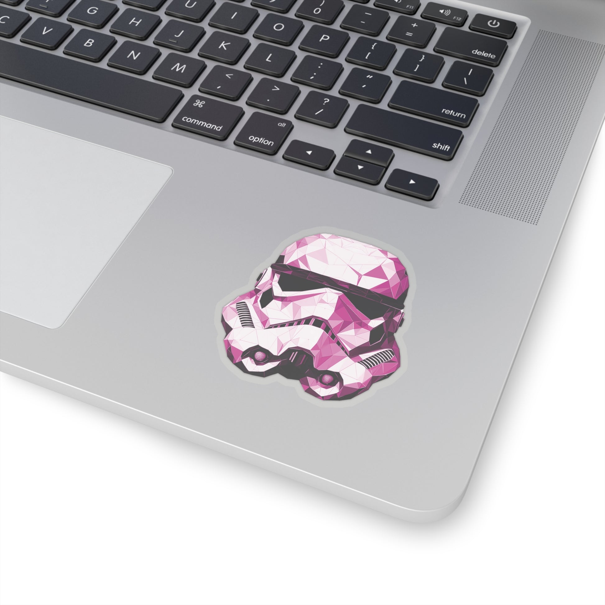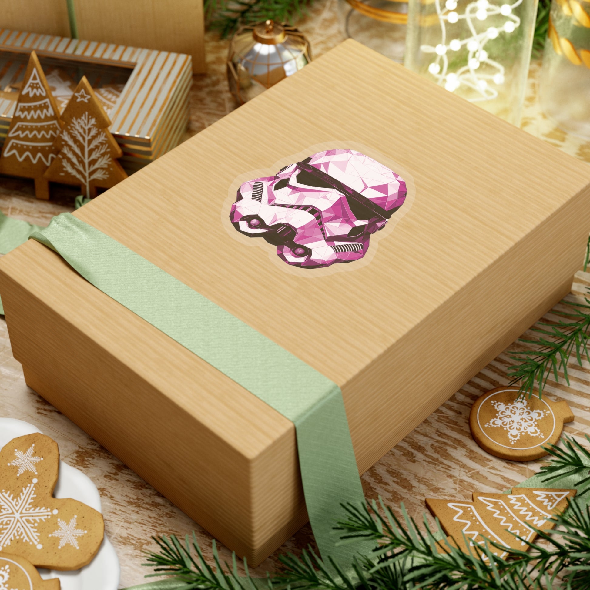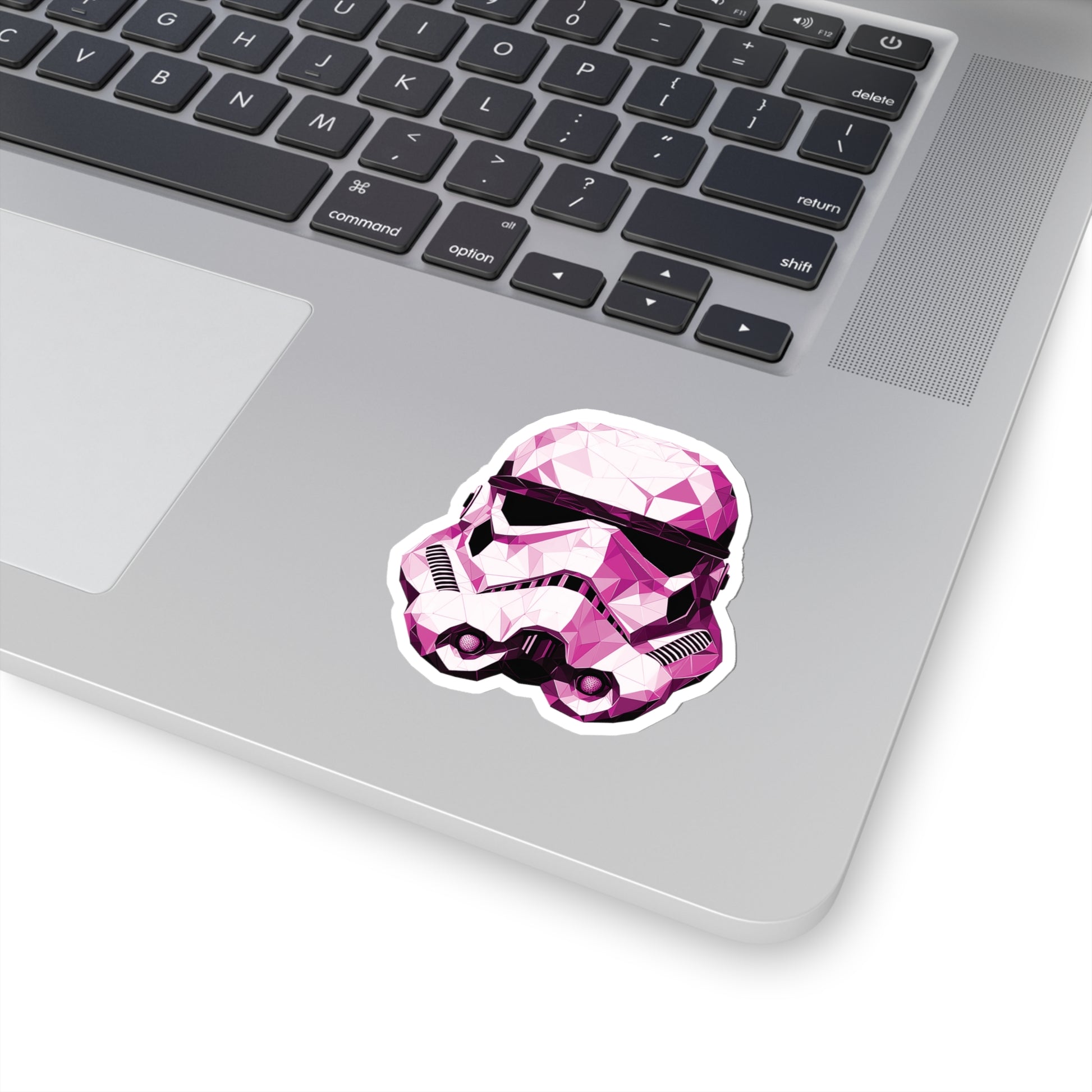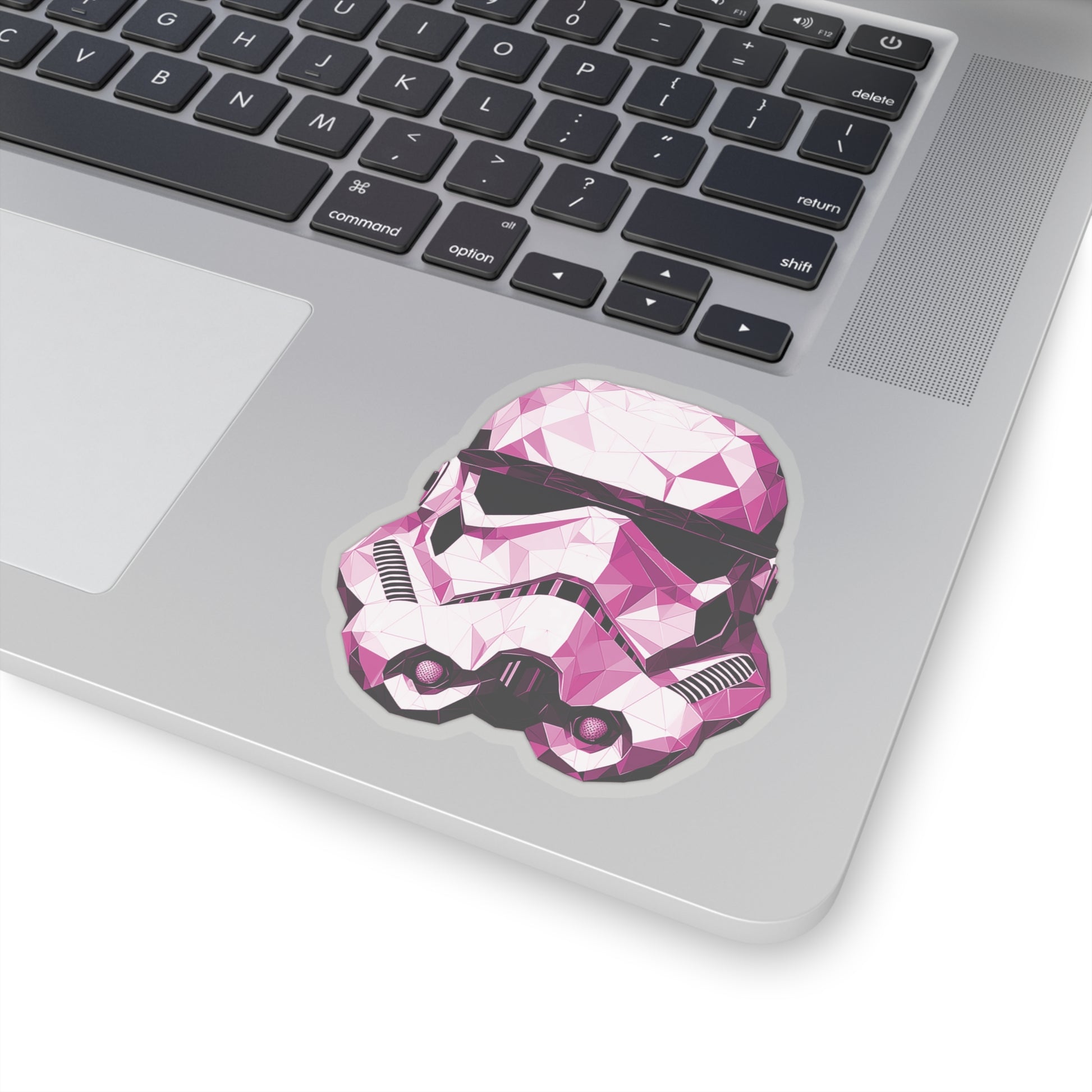 Keywords: Pink Stormtrooper sticker, geometric style, vector design, galactic elegance, delicate color, intricate shapes, modern and captivating, Star Wars fan..