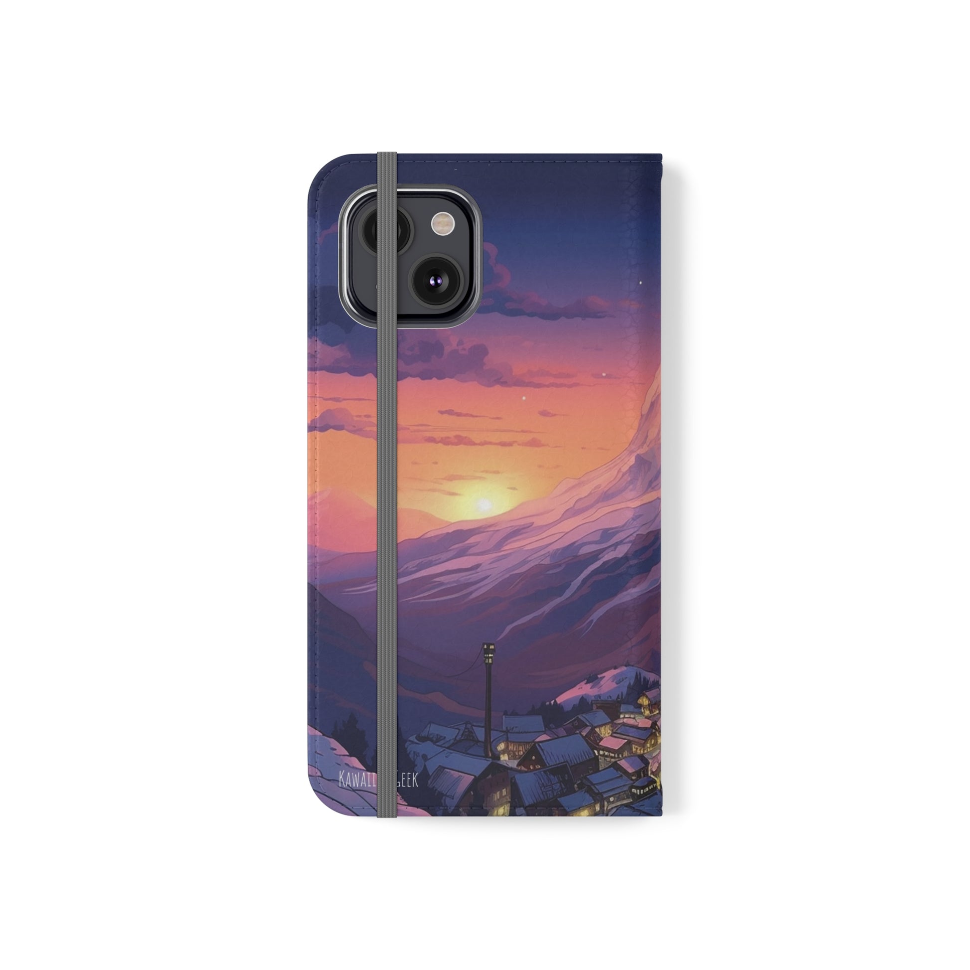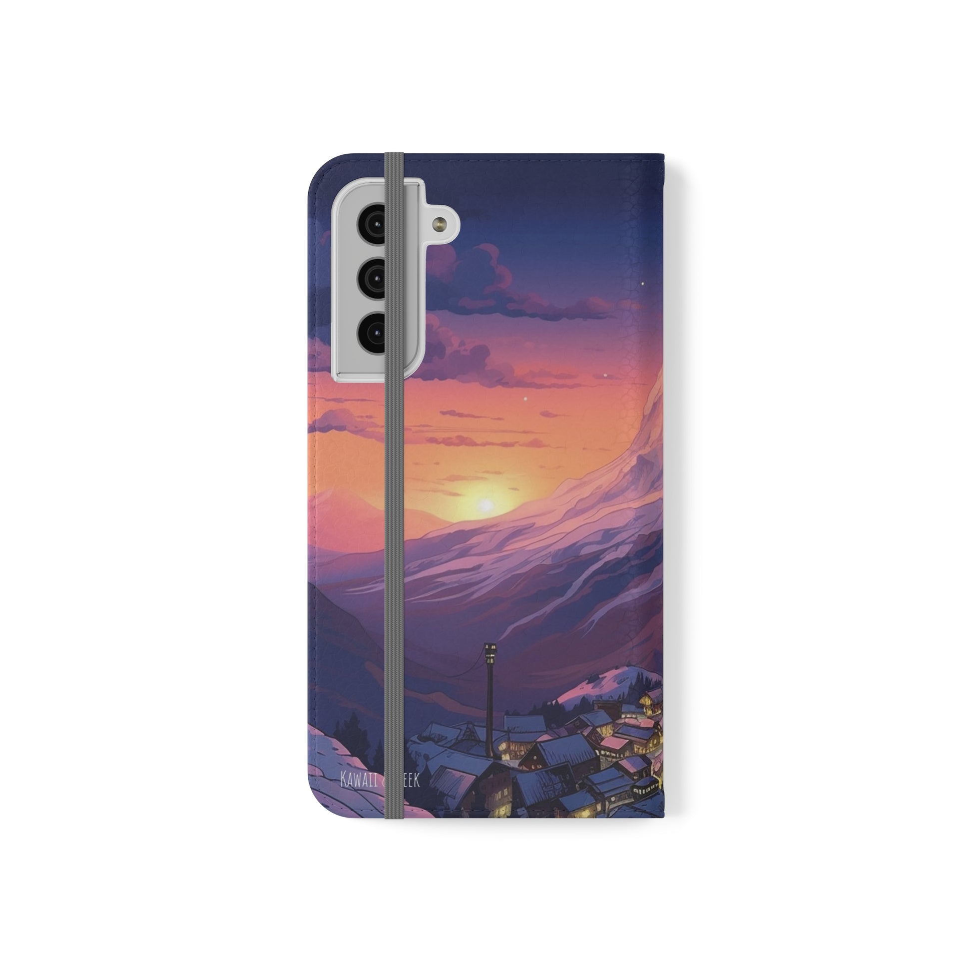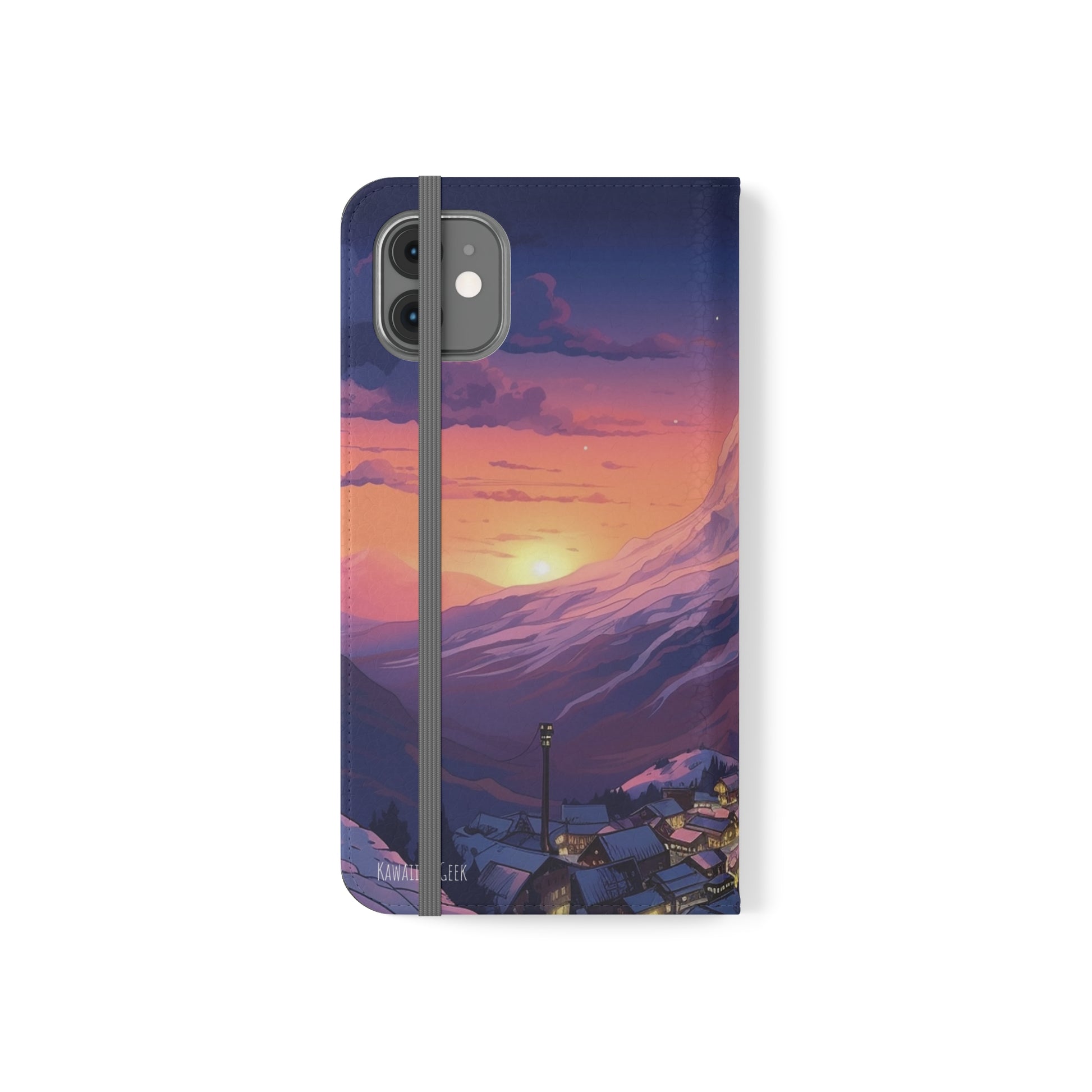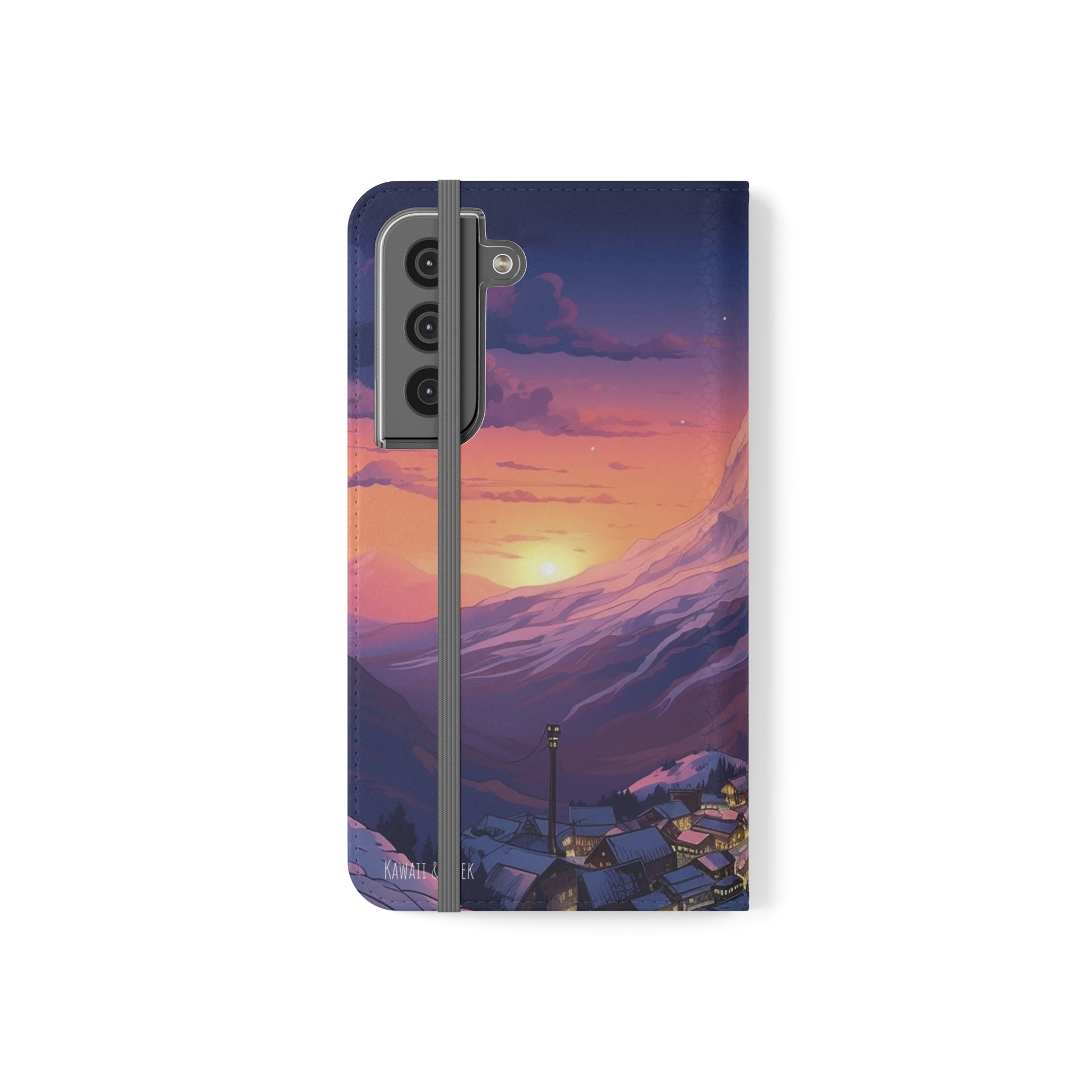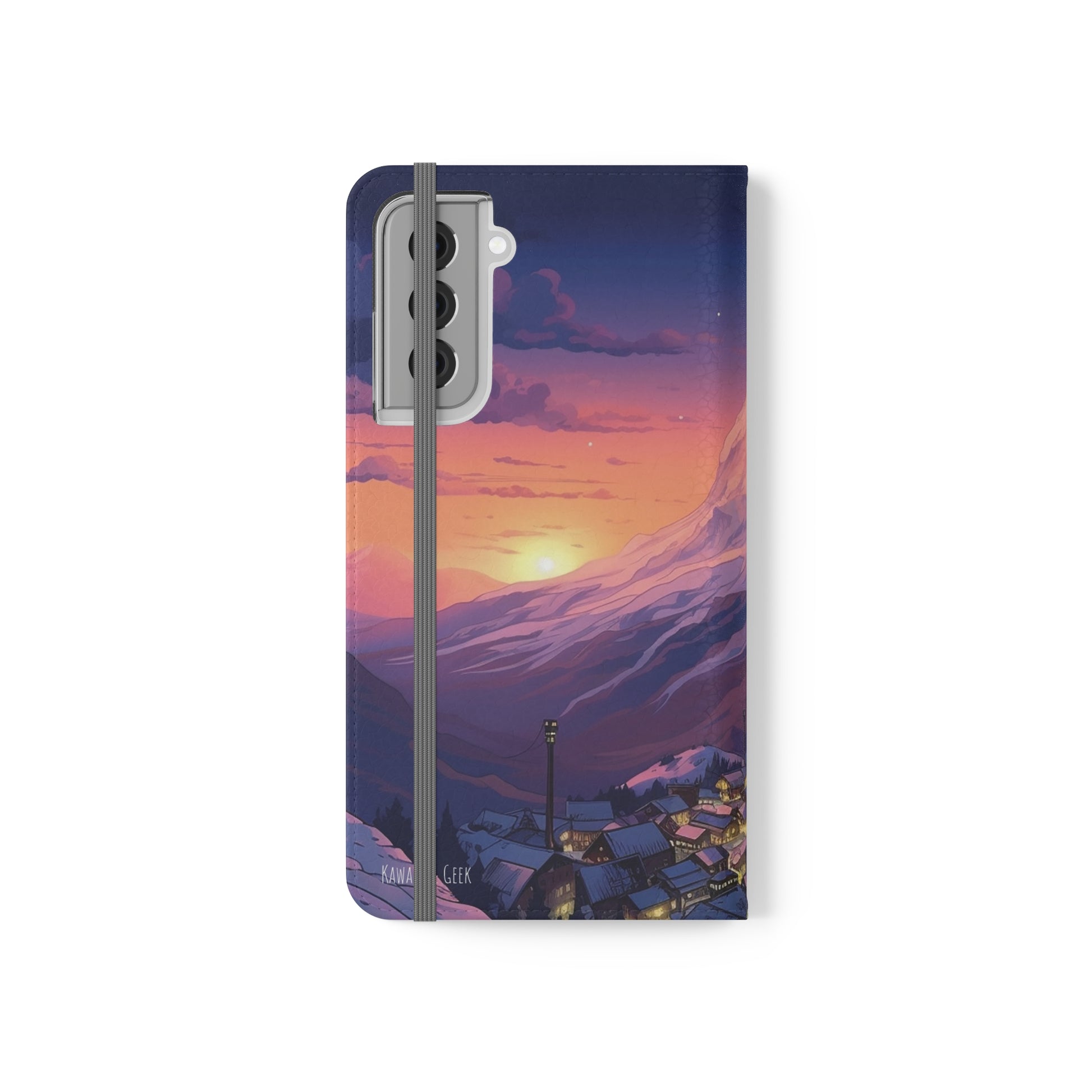 Snowy Mountain Landscape Sunset Flip Phone Case - Discover Serenity with a Charming Mountain Village
