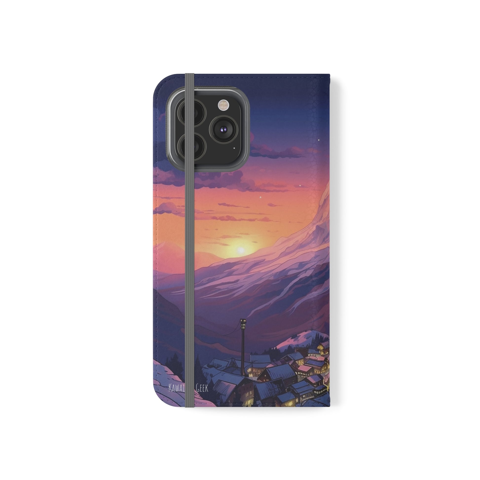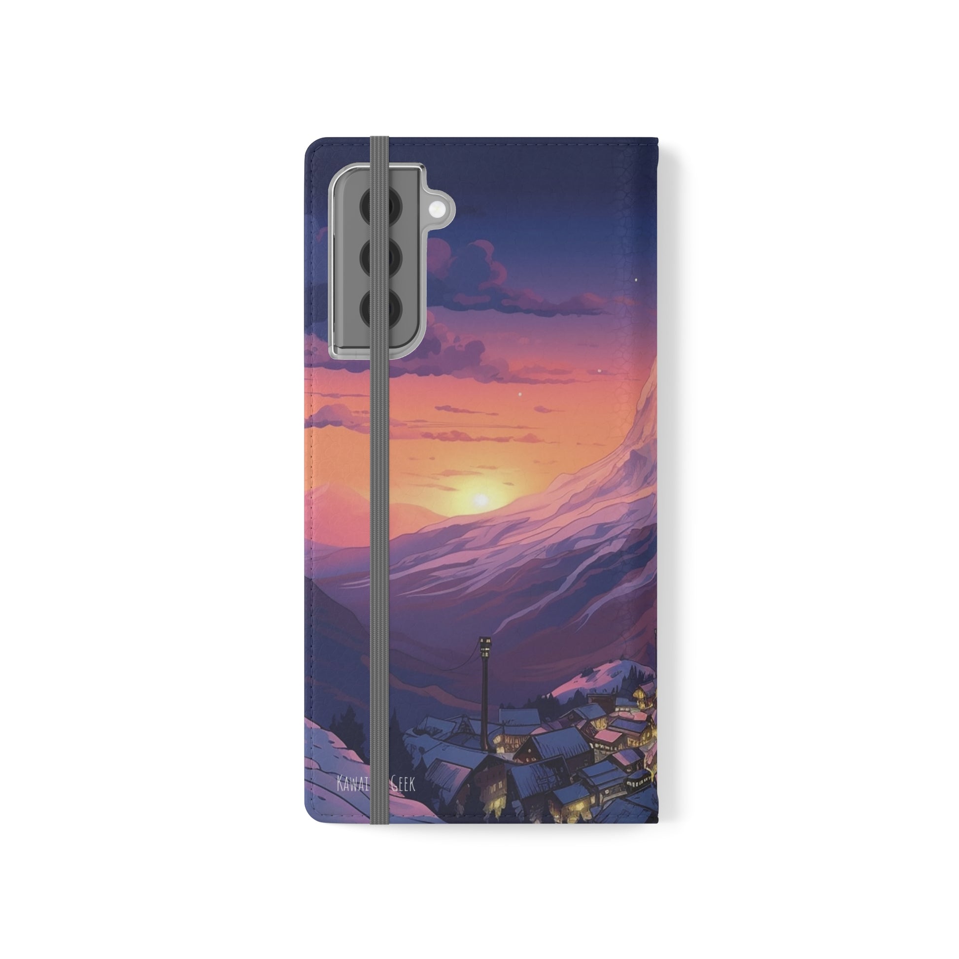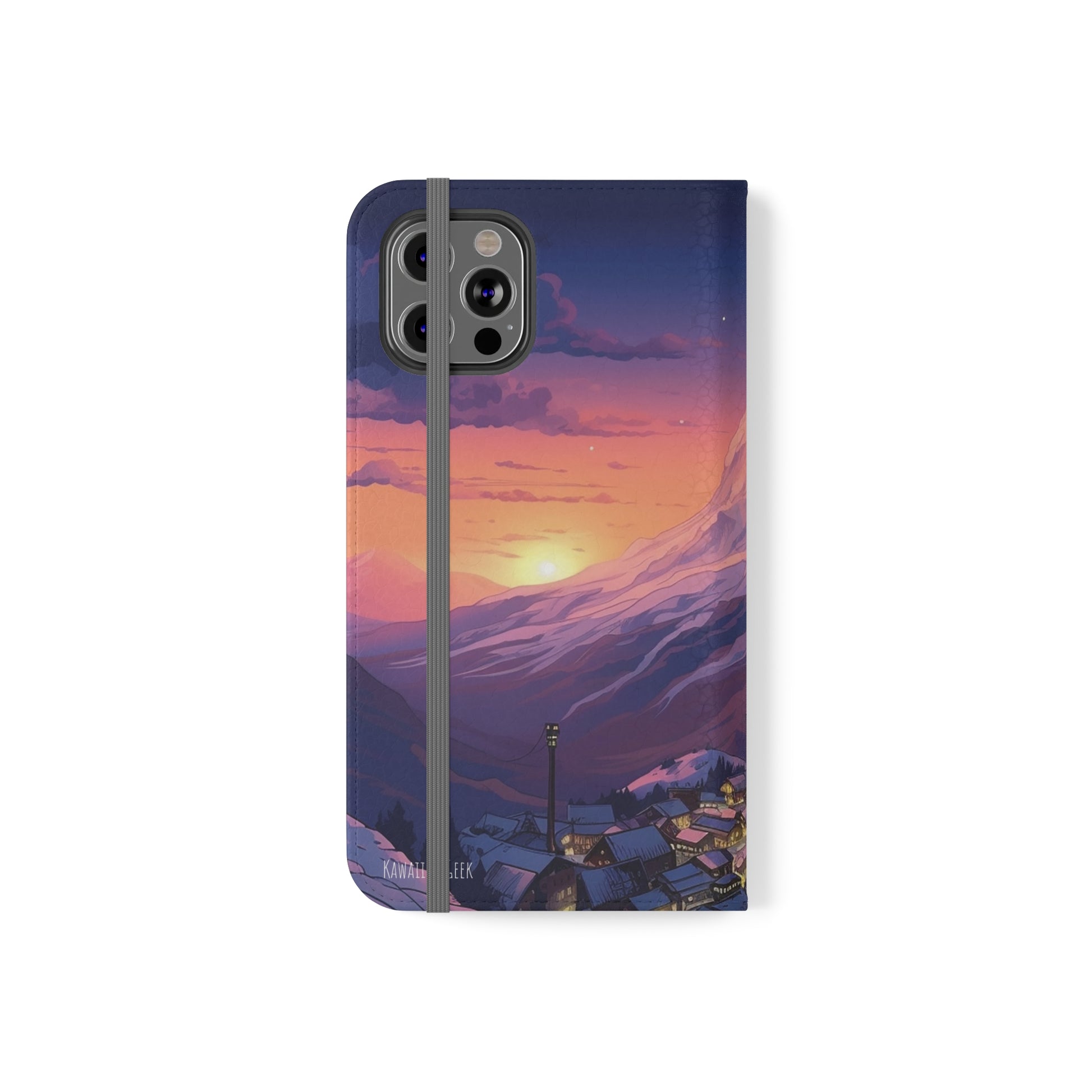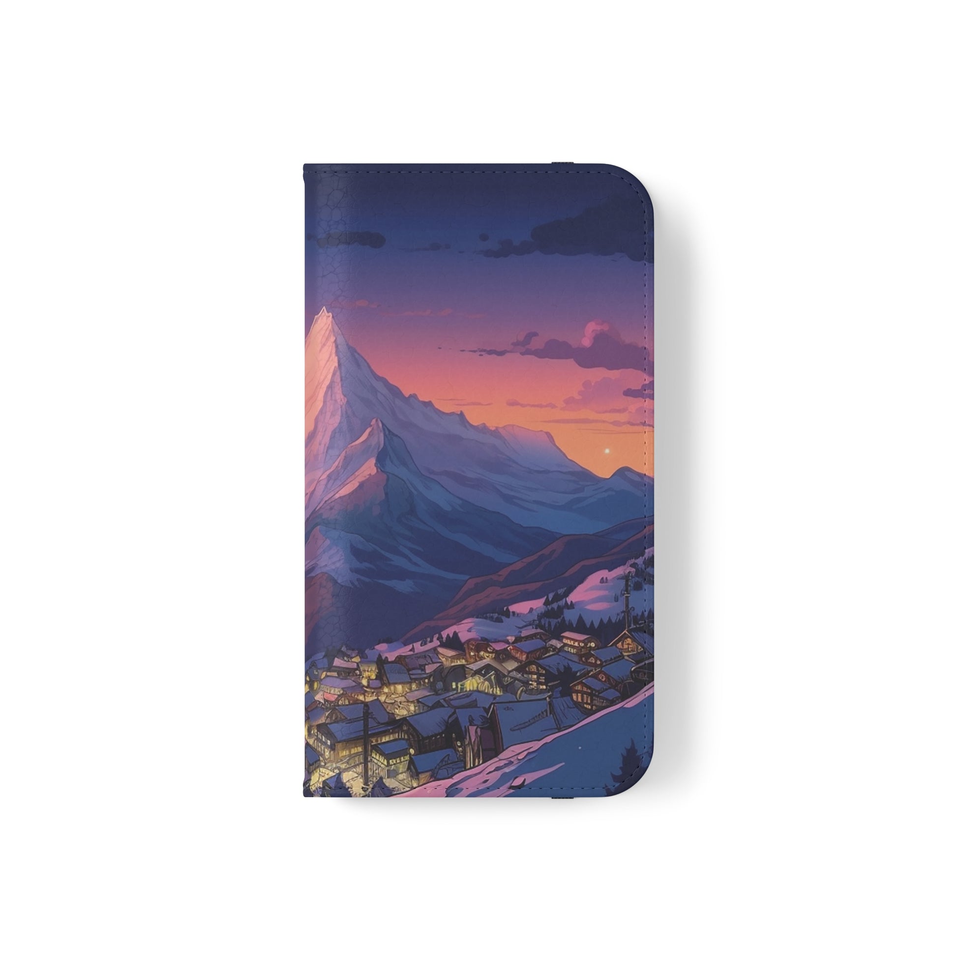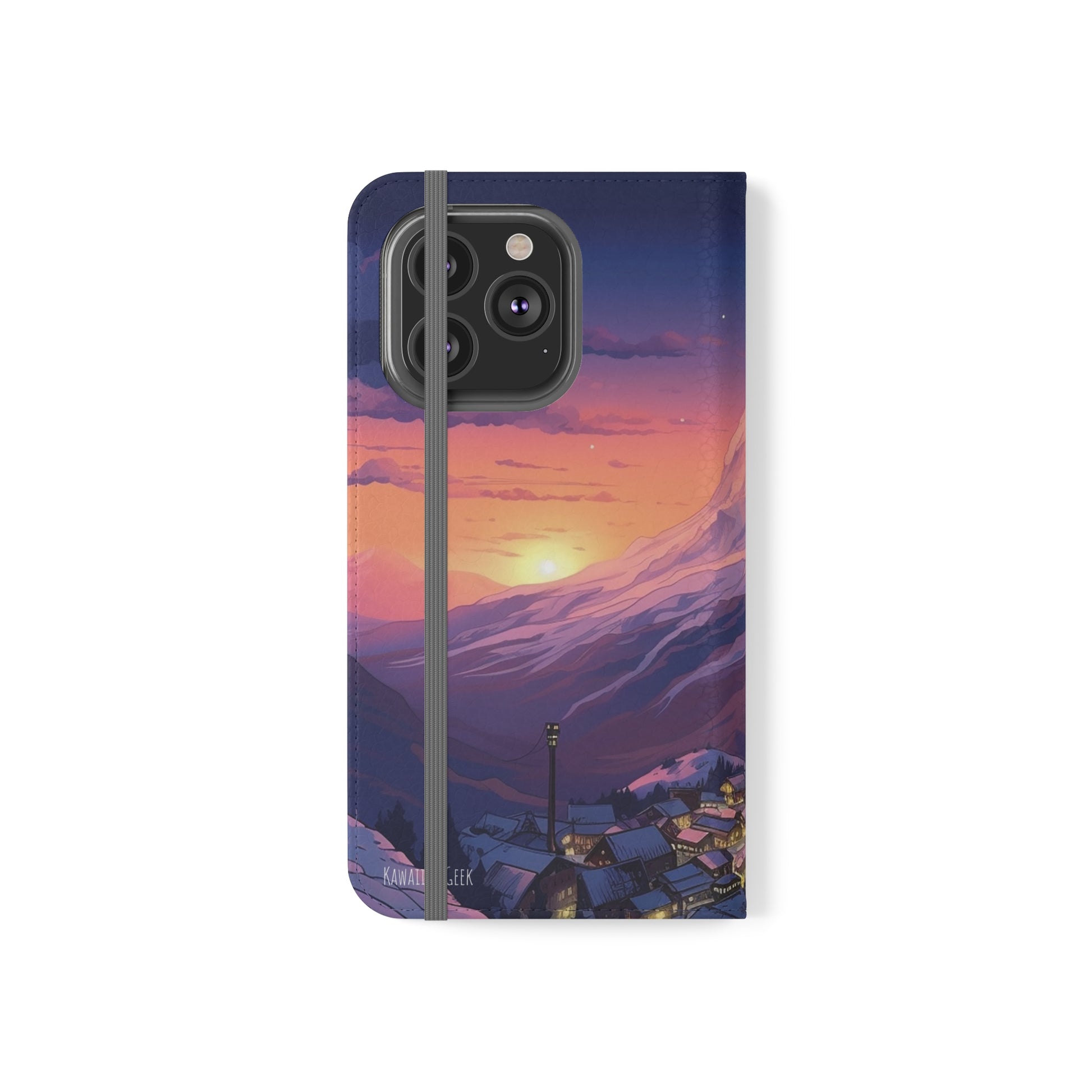 Snowy Mountain Landscape Sunset Flip Phone Case - Discover Serenity with a Charming Mountain Village