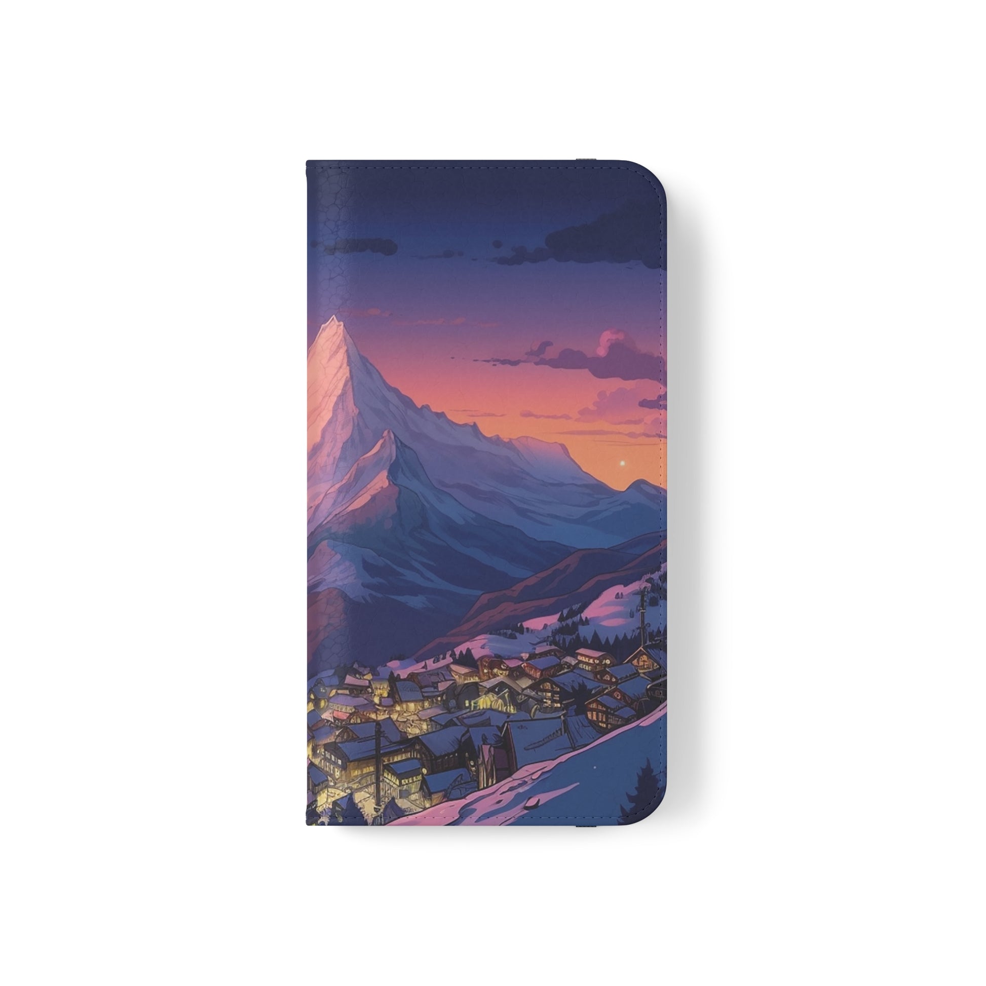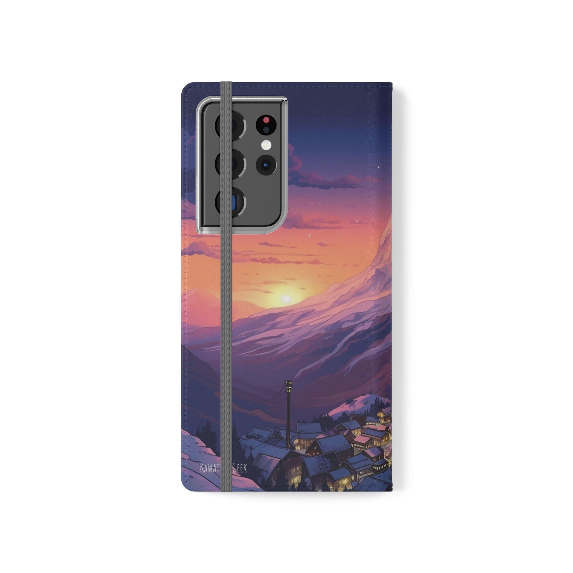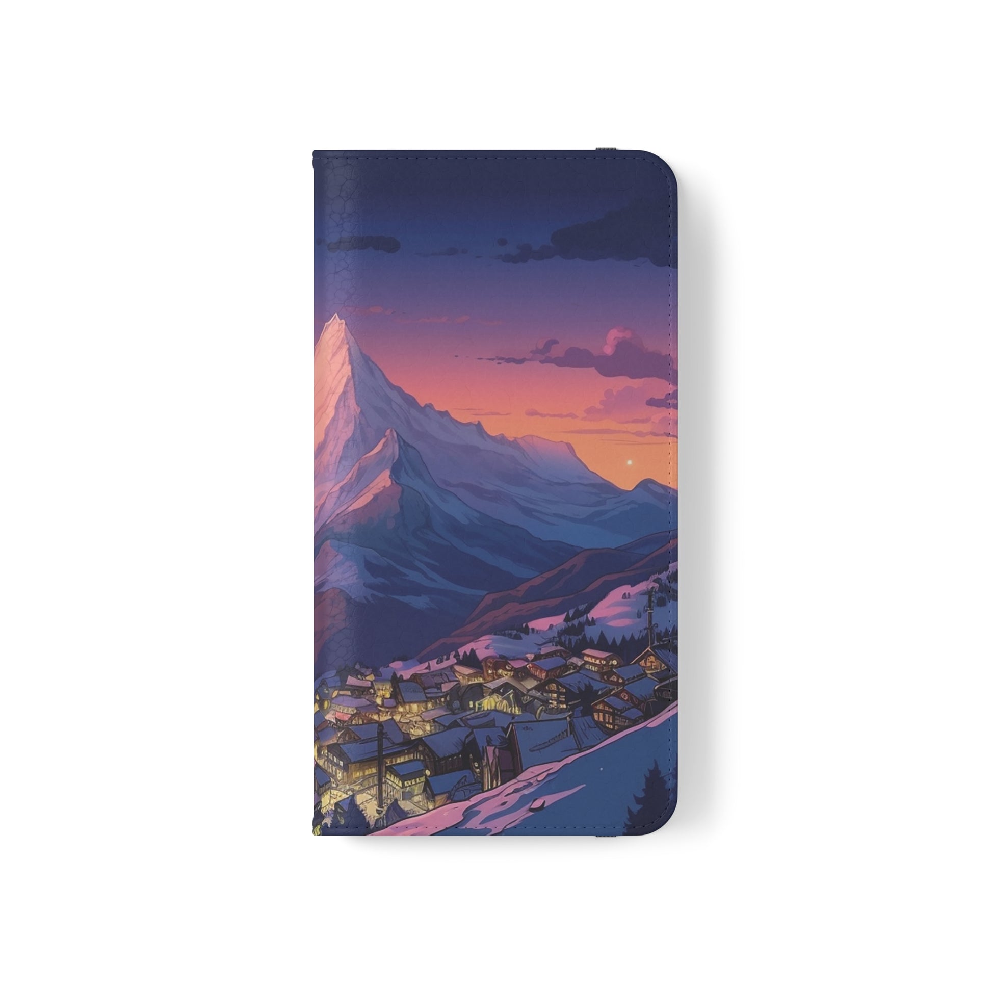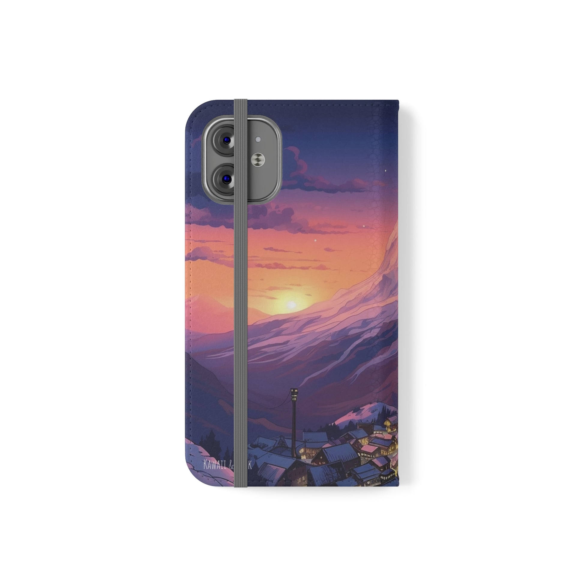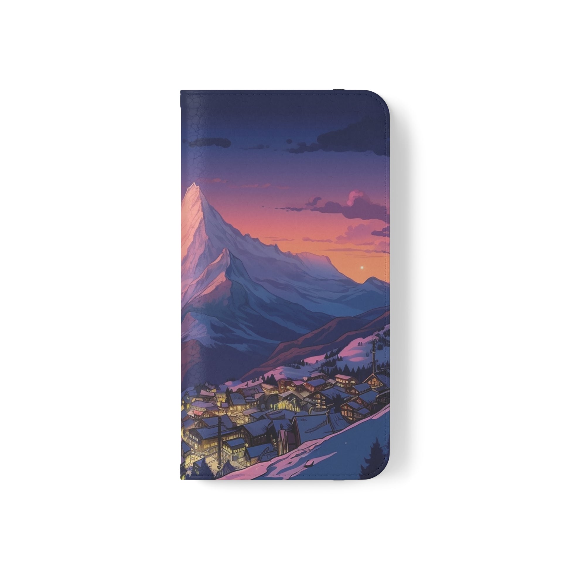 Snowy Mountain Landscape Sunset Flip Phone Case - Discover Serenity with a Charming Mountain Village