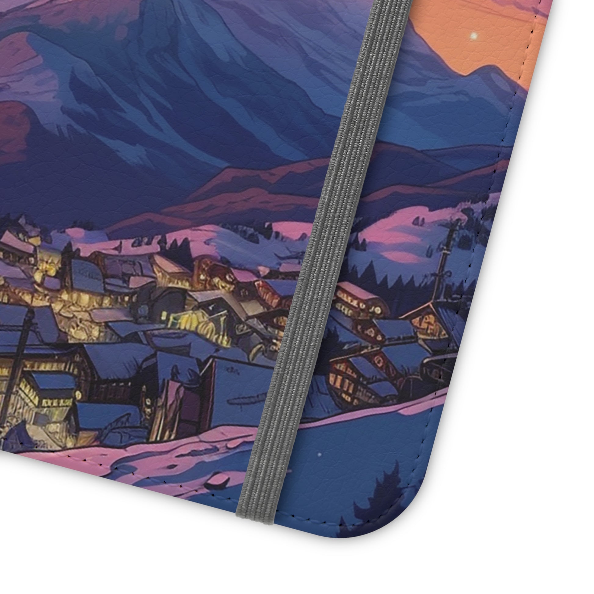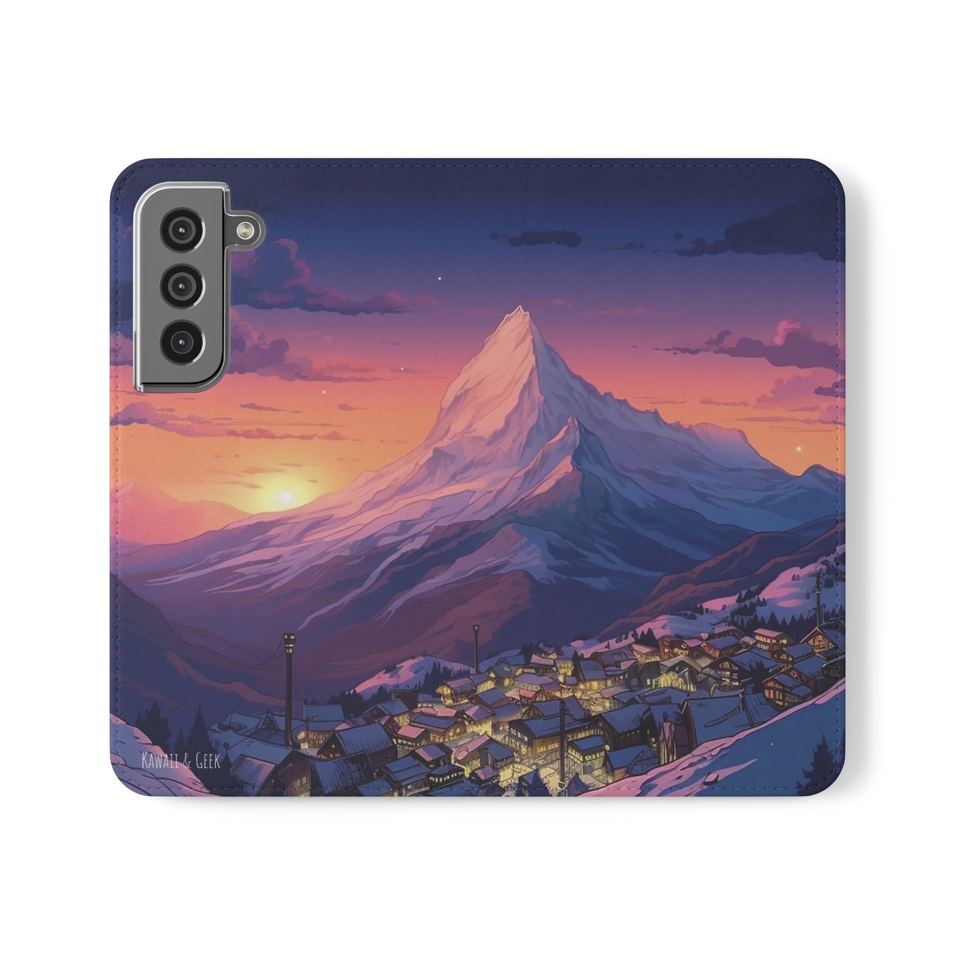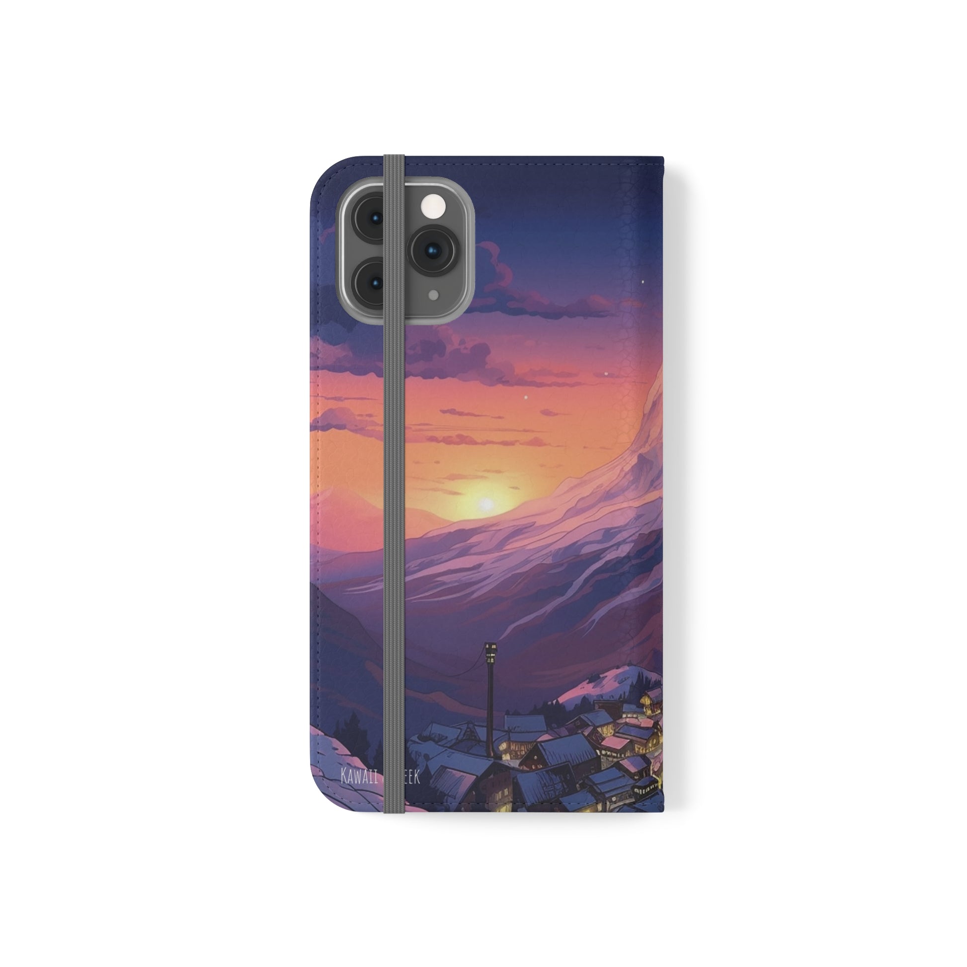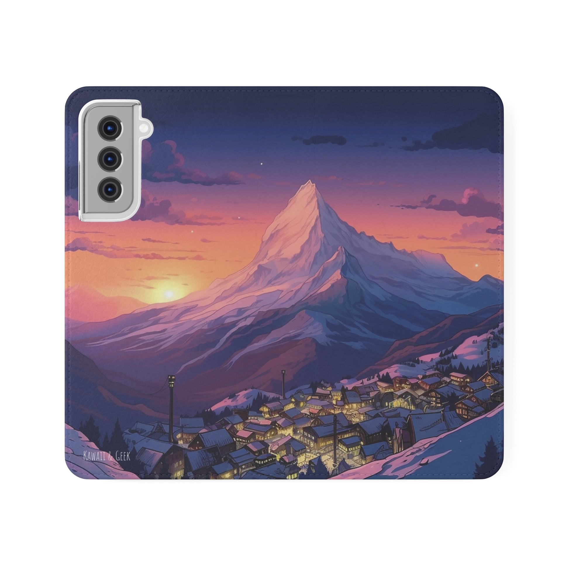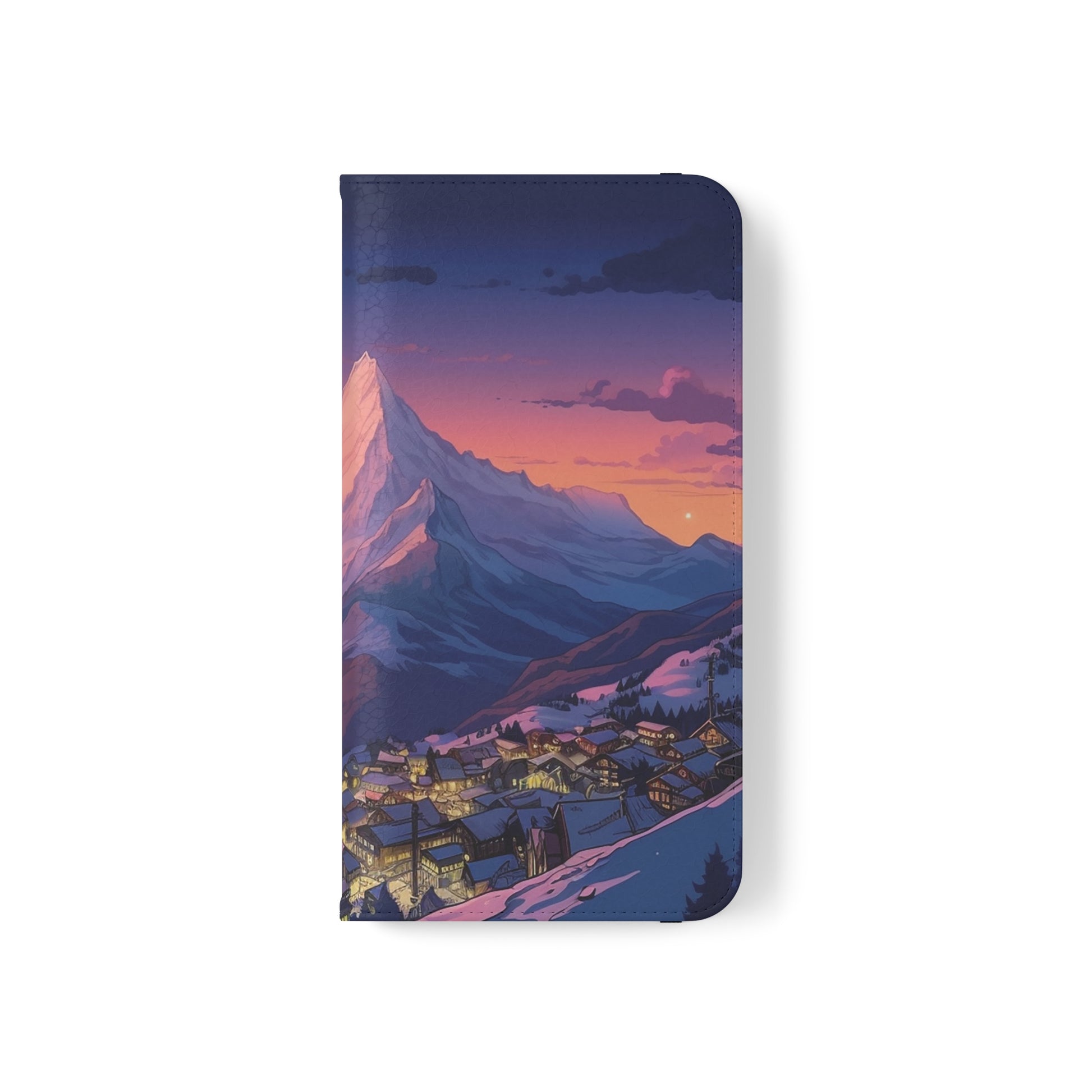 Snowy Mountain Landscape Sunset Flip Phone Case - Discover Serenity with a Charming Mountain Village