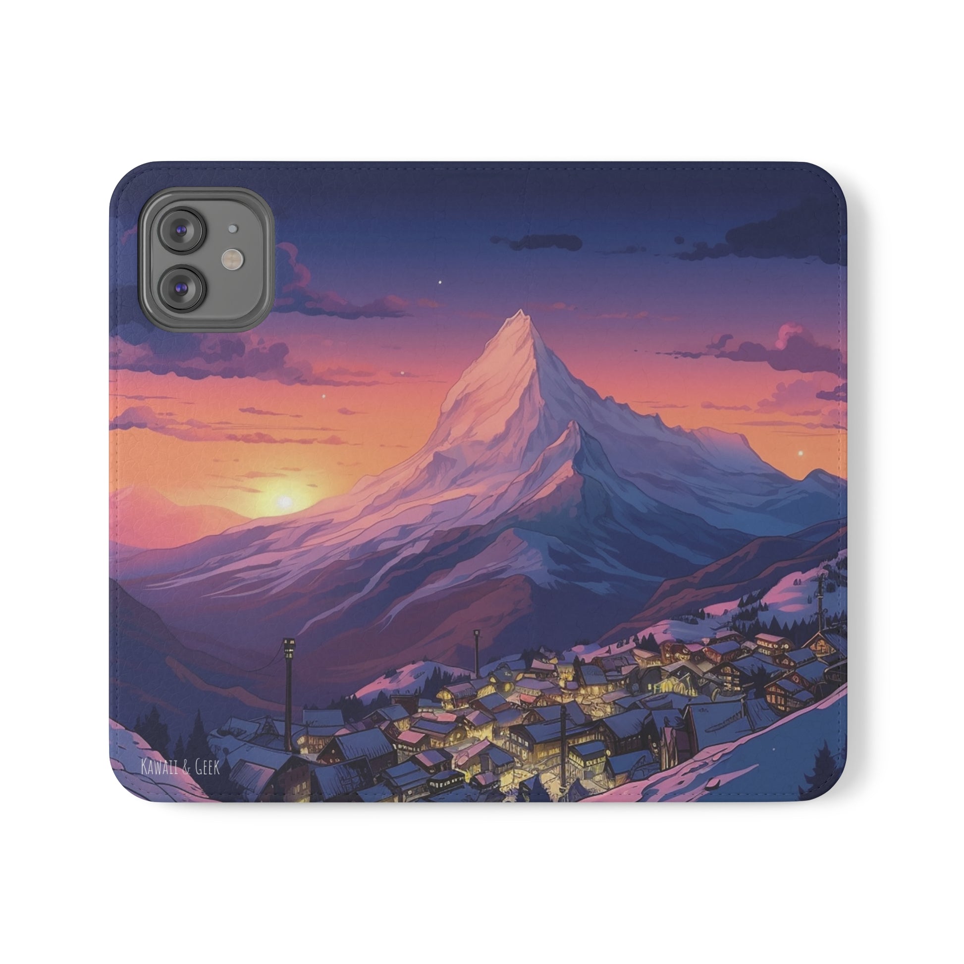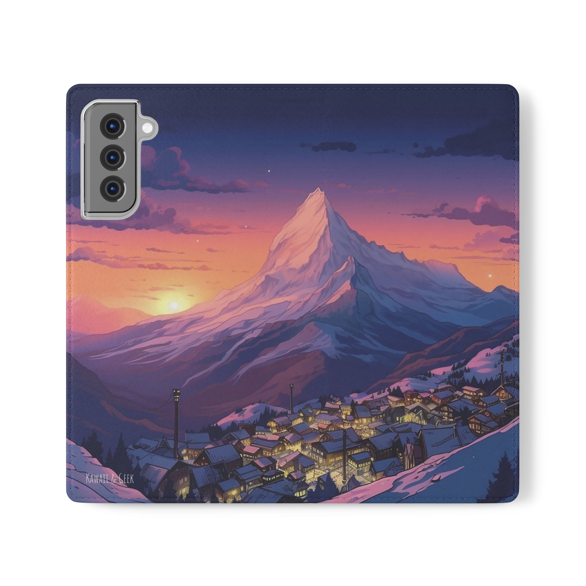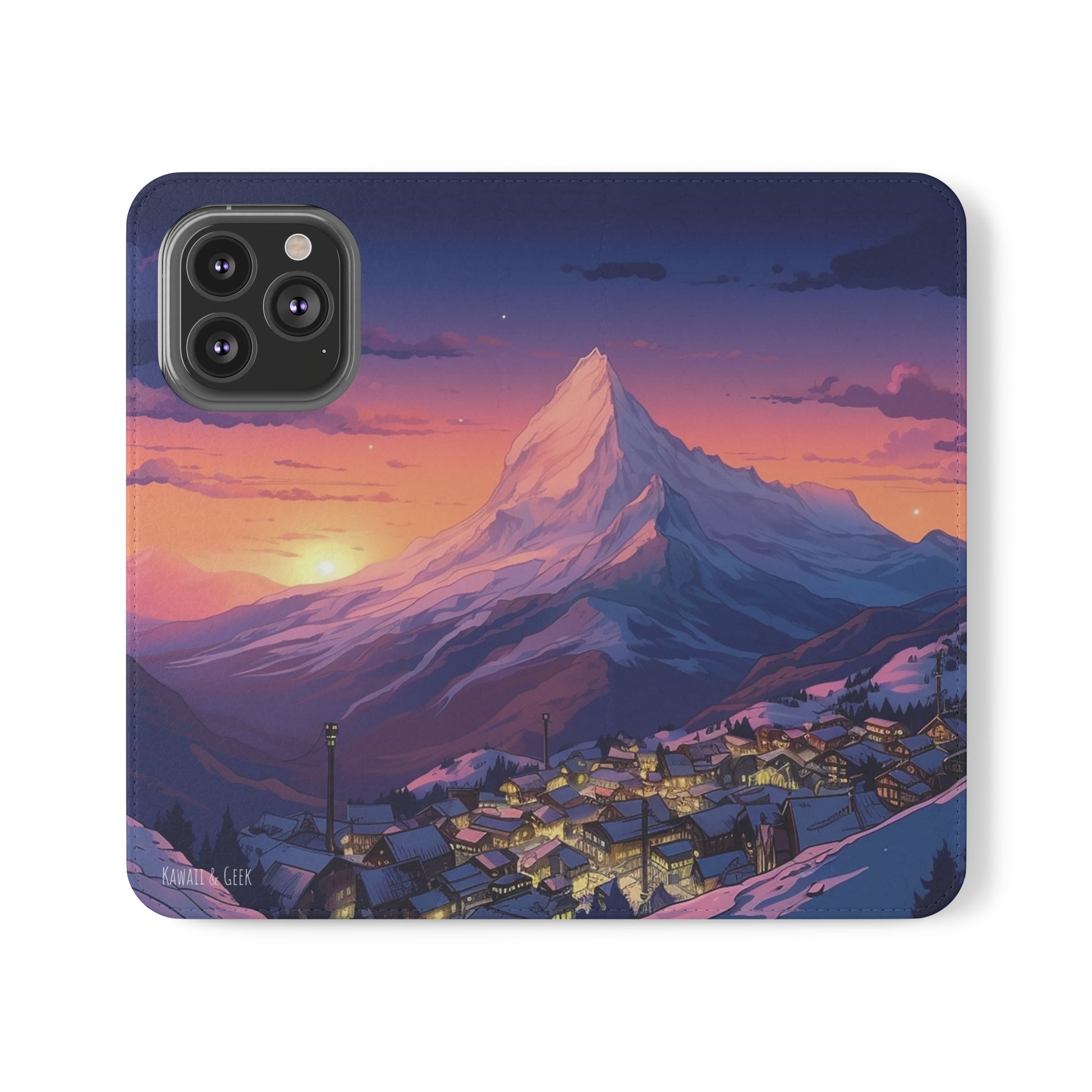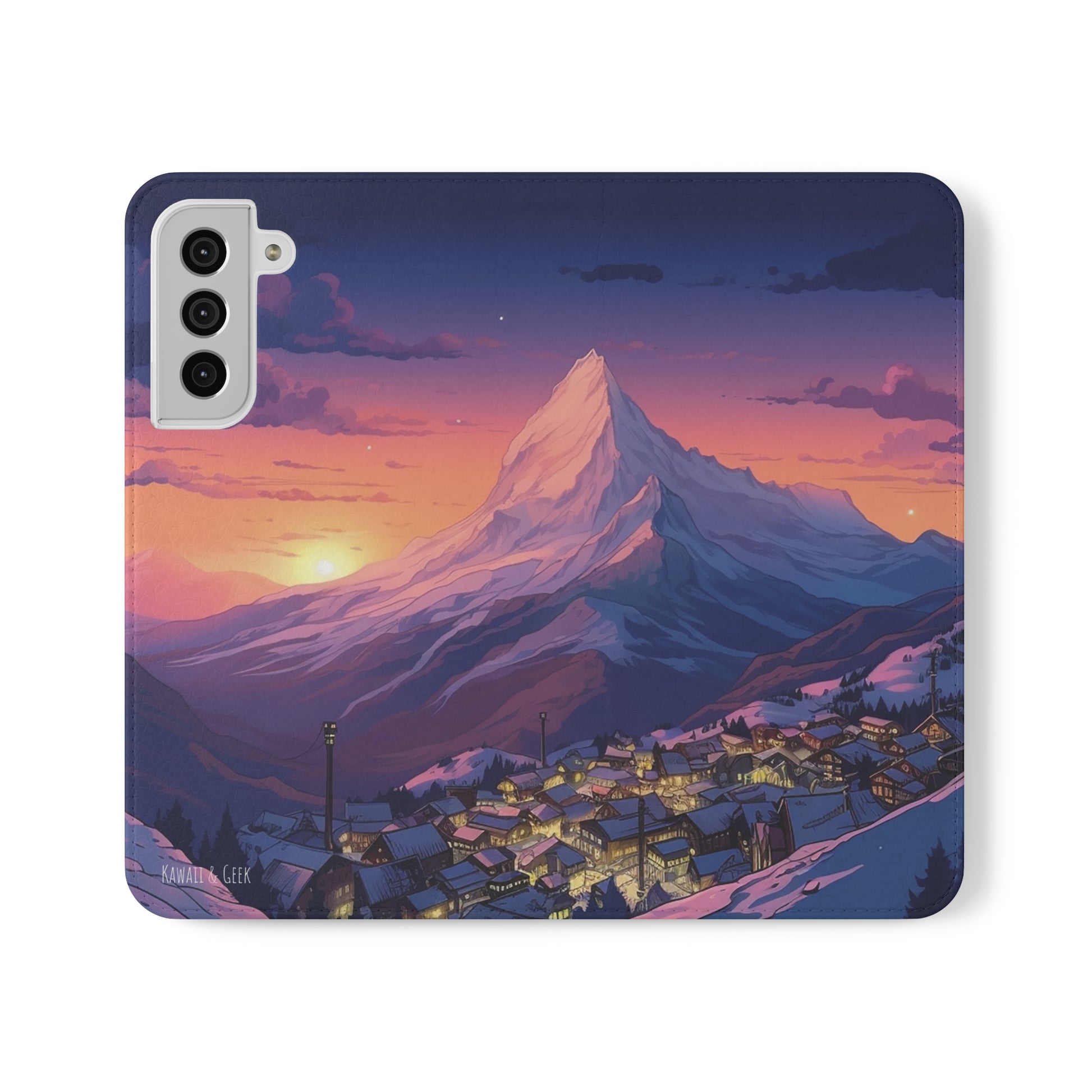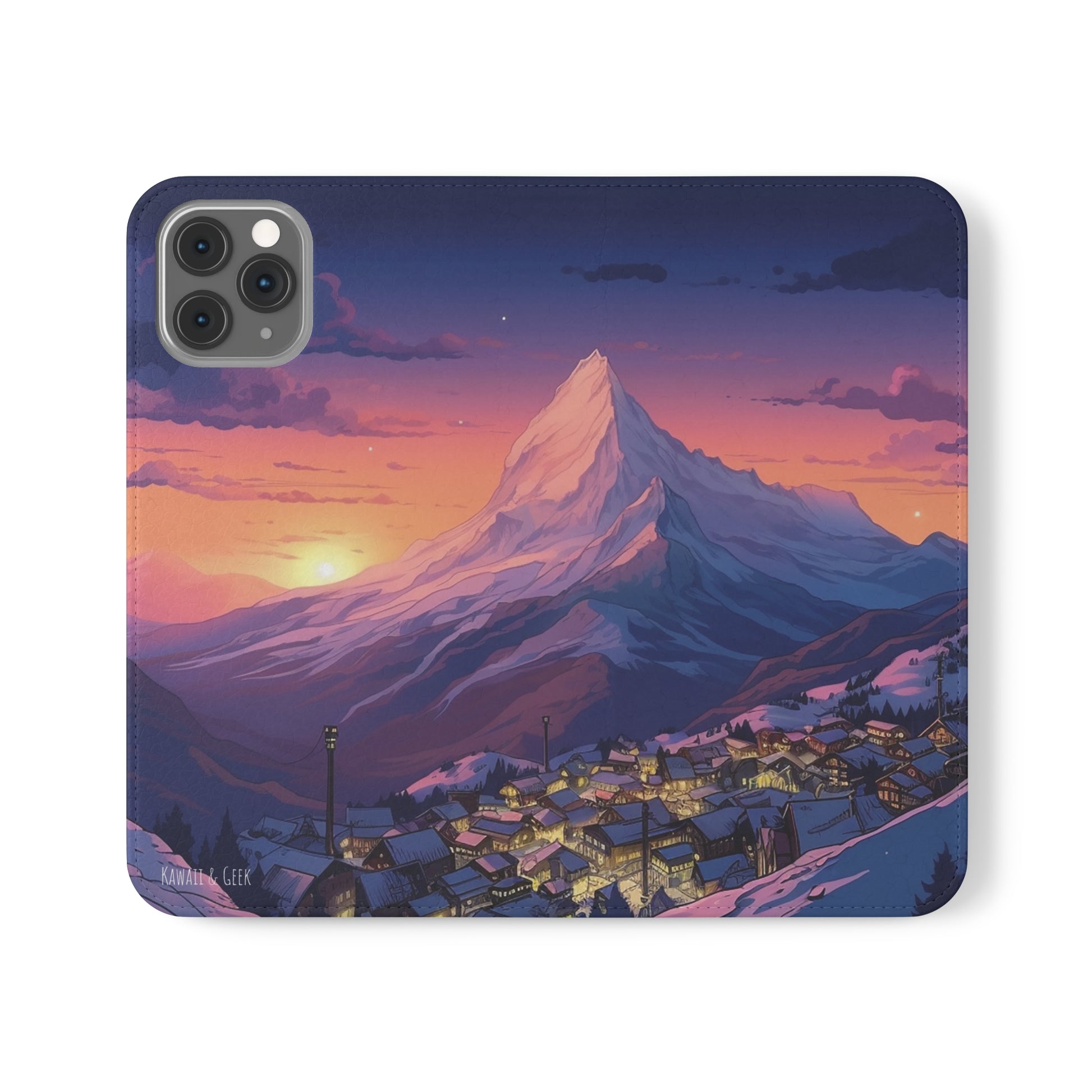 Snowy Mountain Landscape Sunset Flip Phone Case - Discover Serenity with a Charming Mountain Village