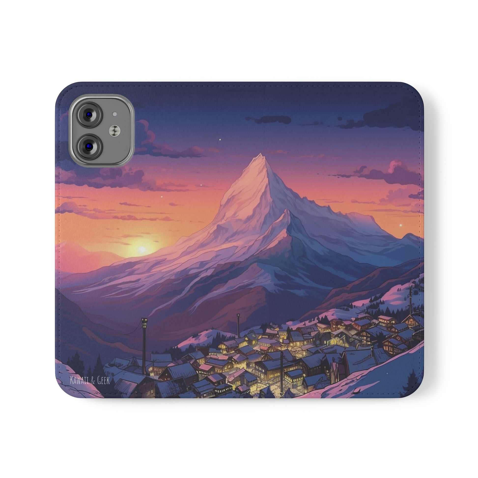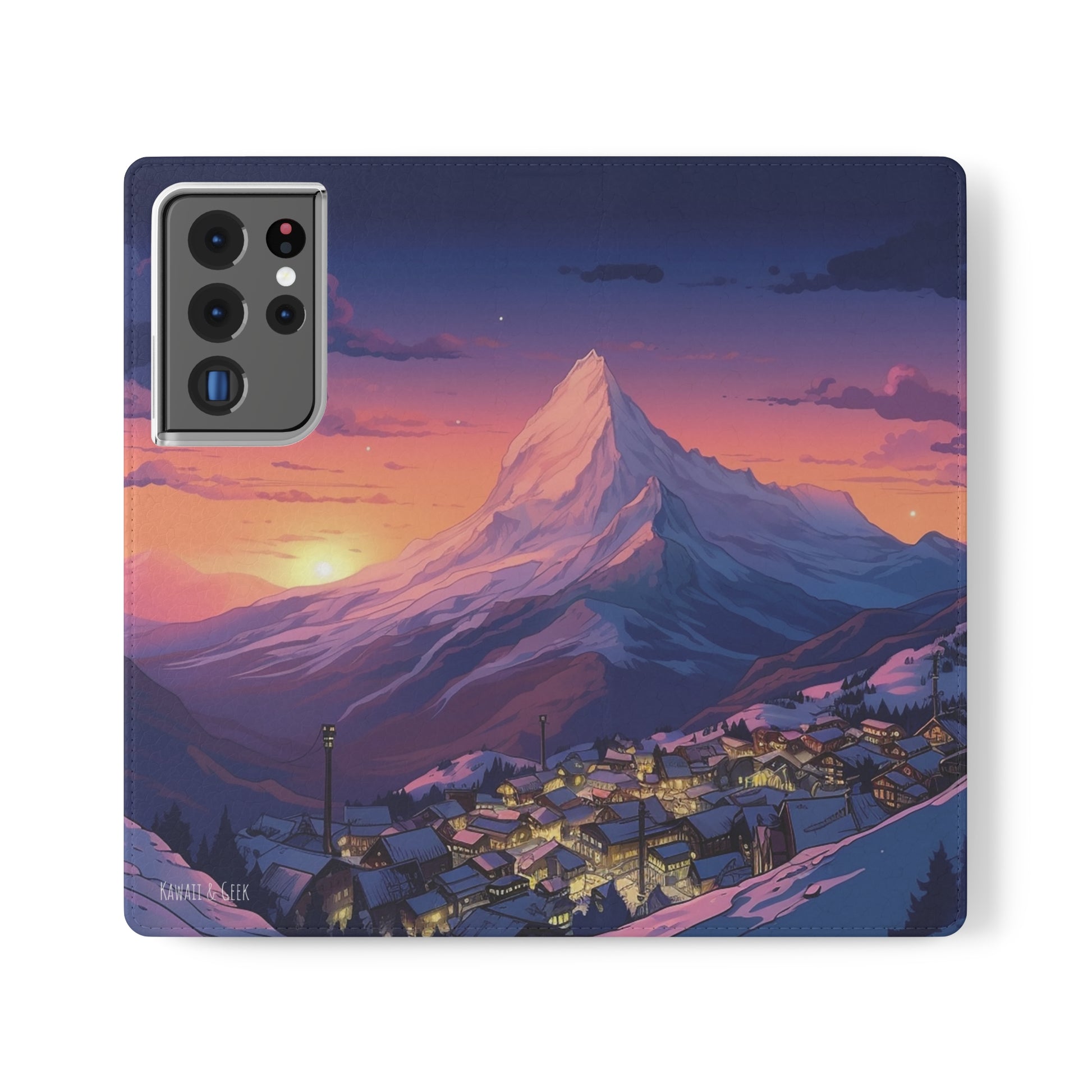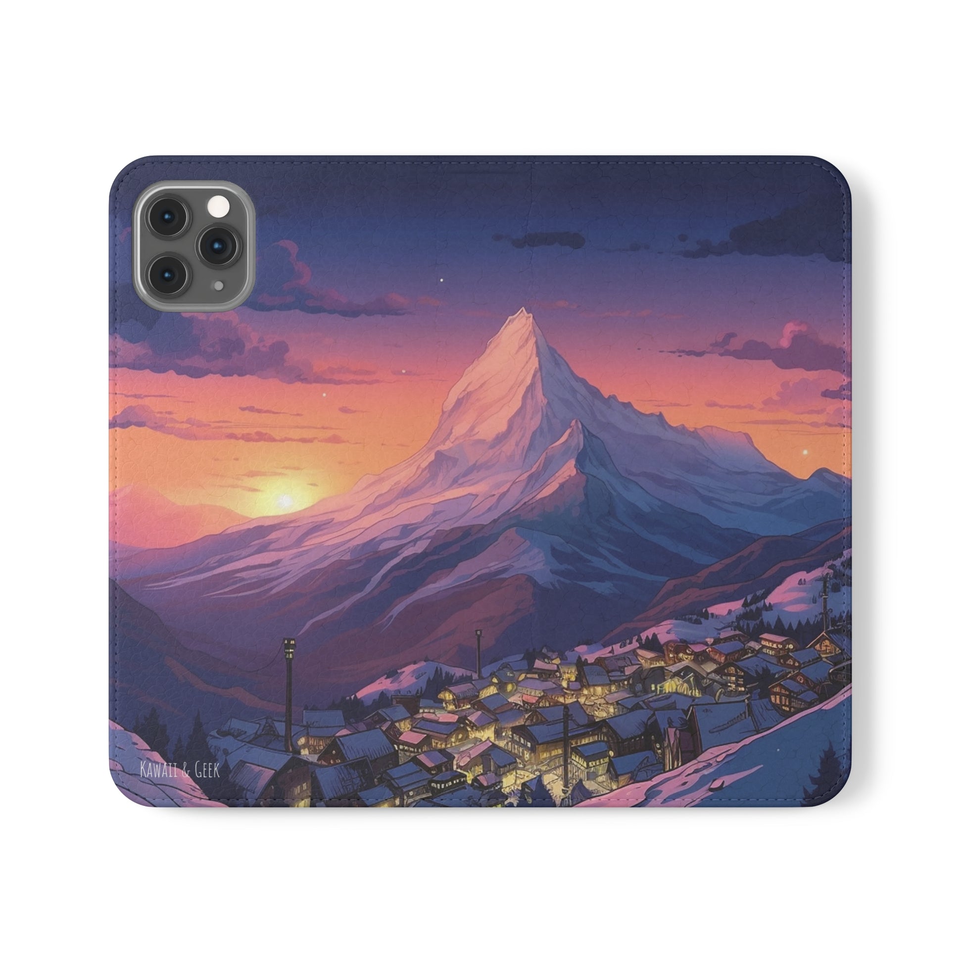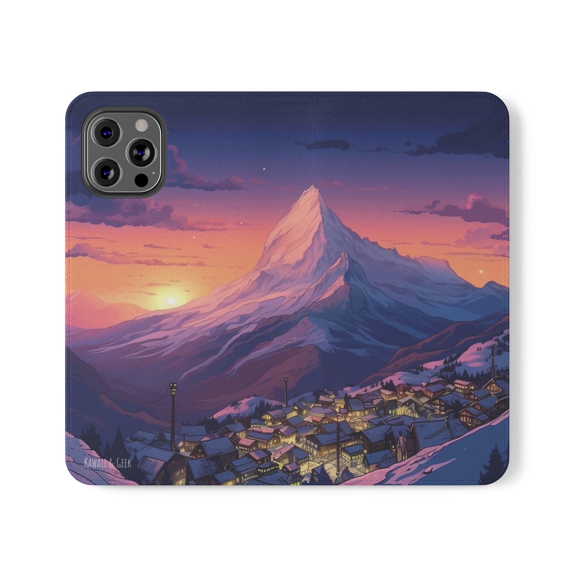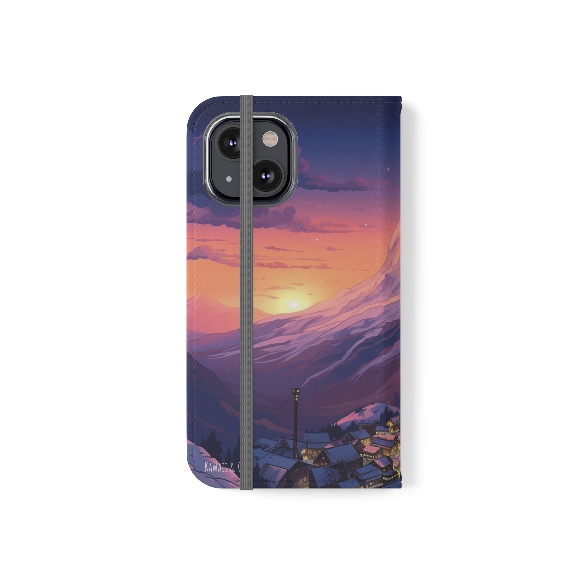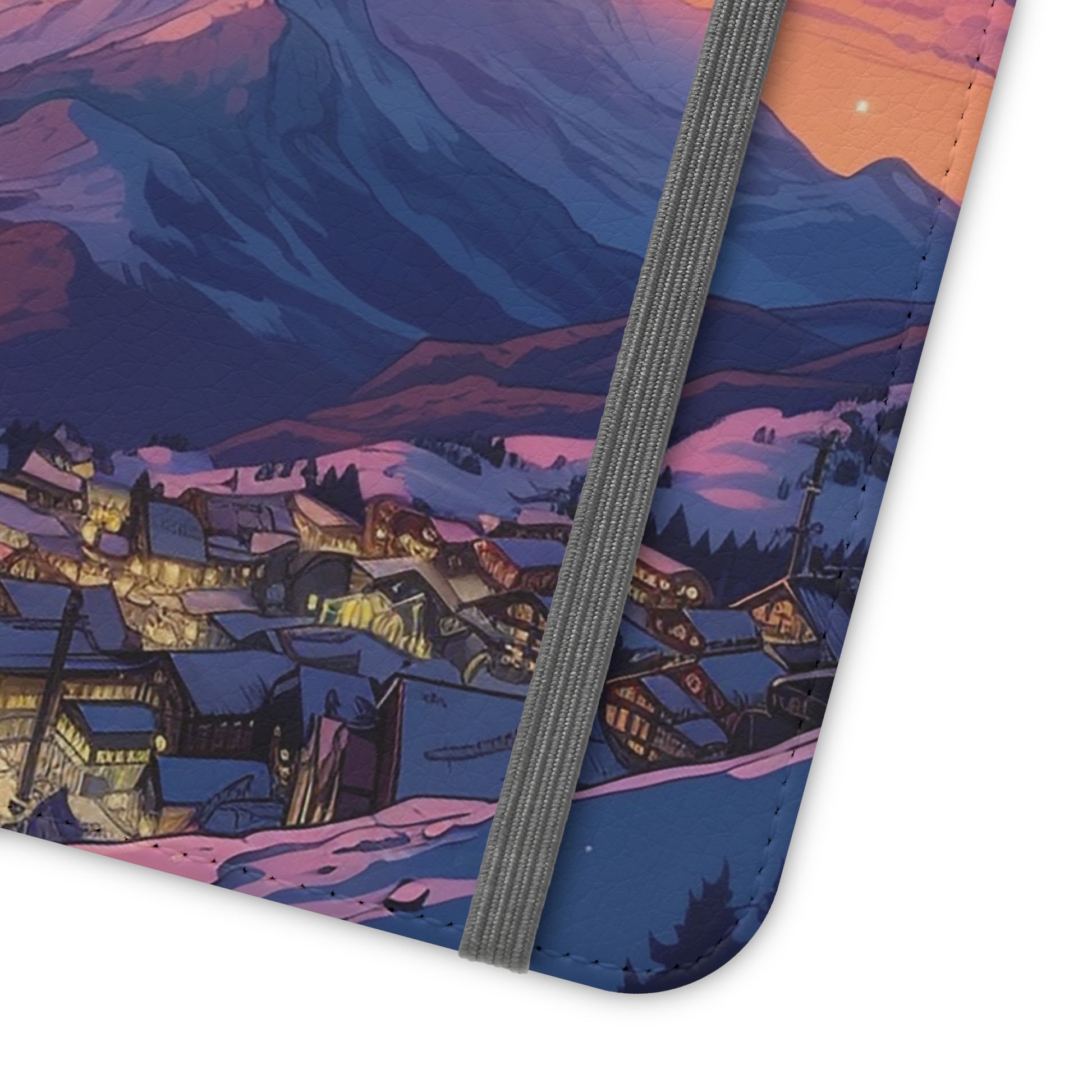 Snowy Mountain Landscape Sunset Flip Phone Case - Discover Serenity with a Charming Mountain Village