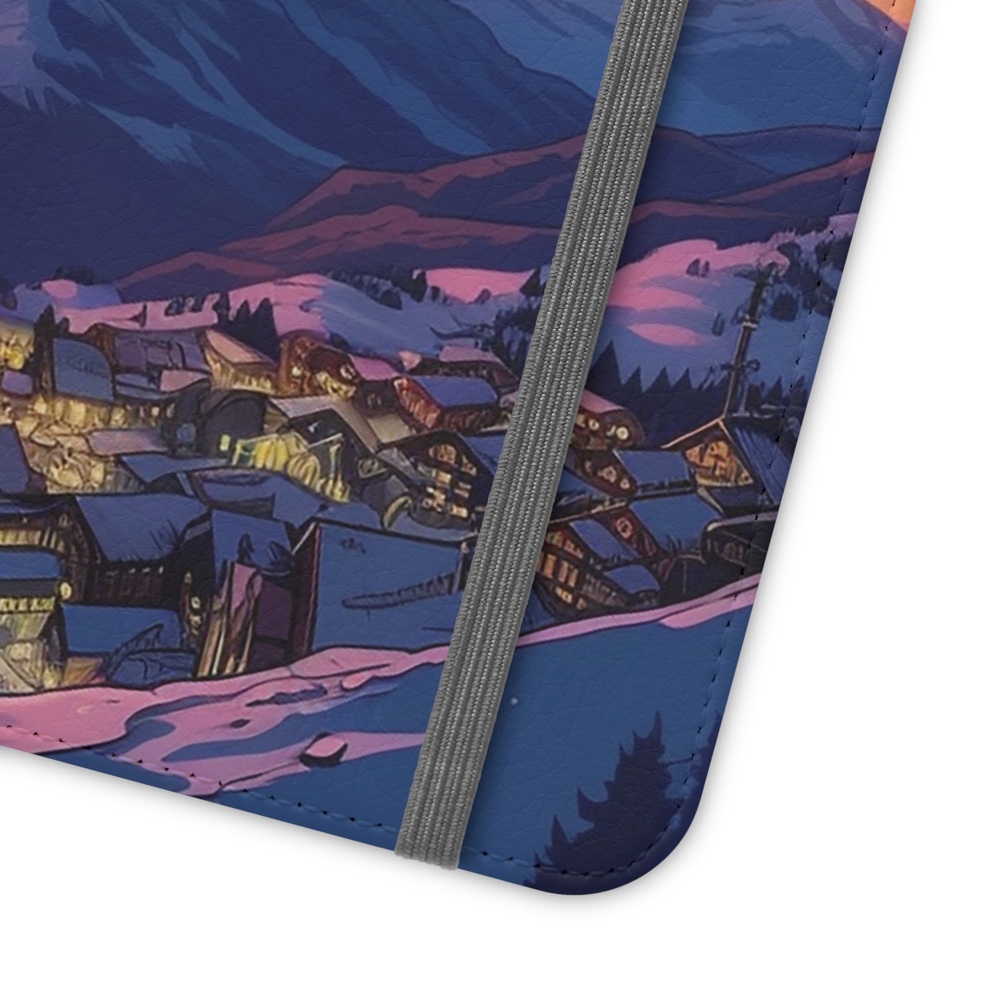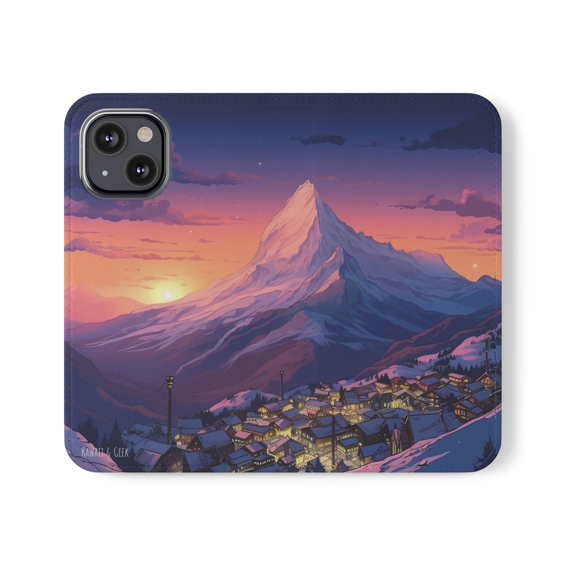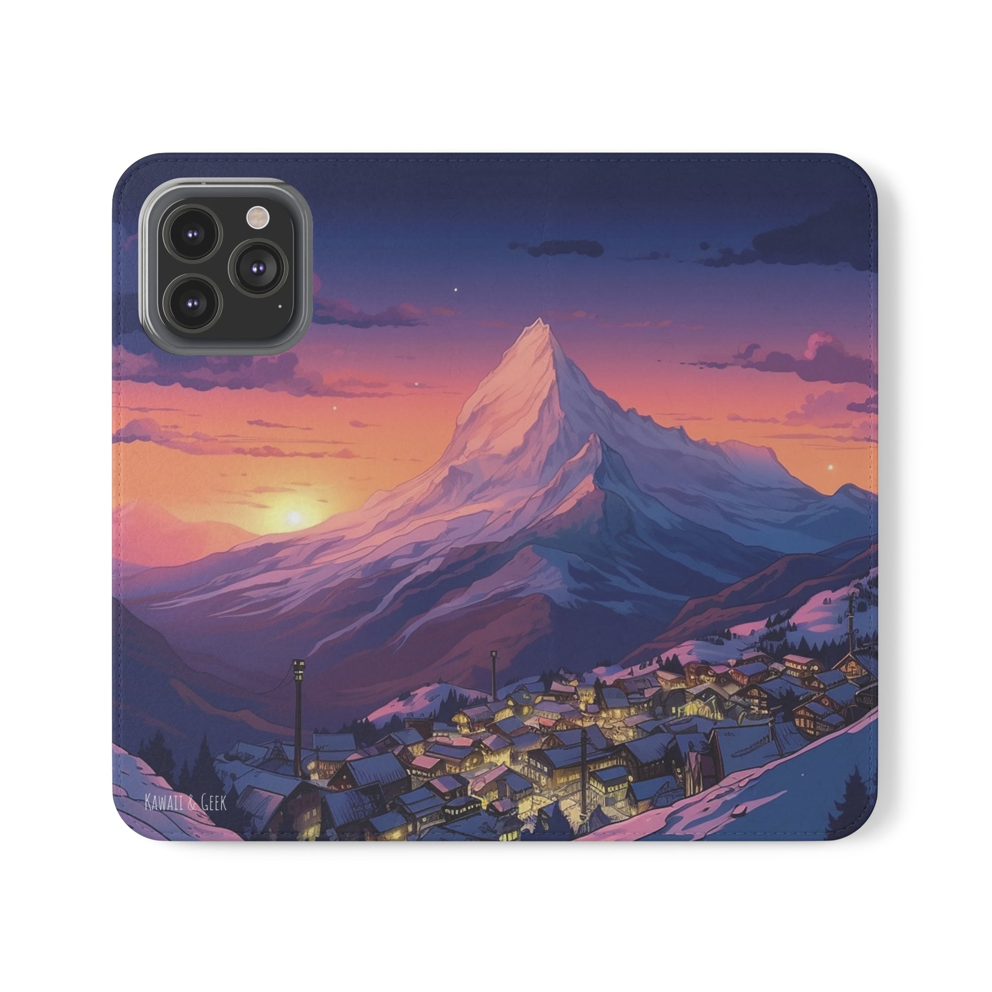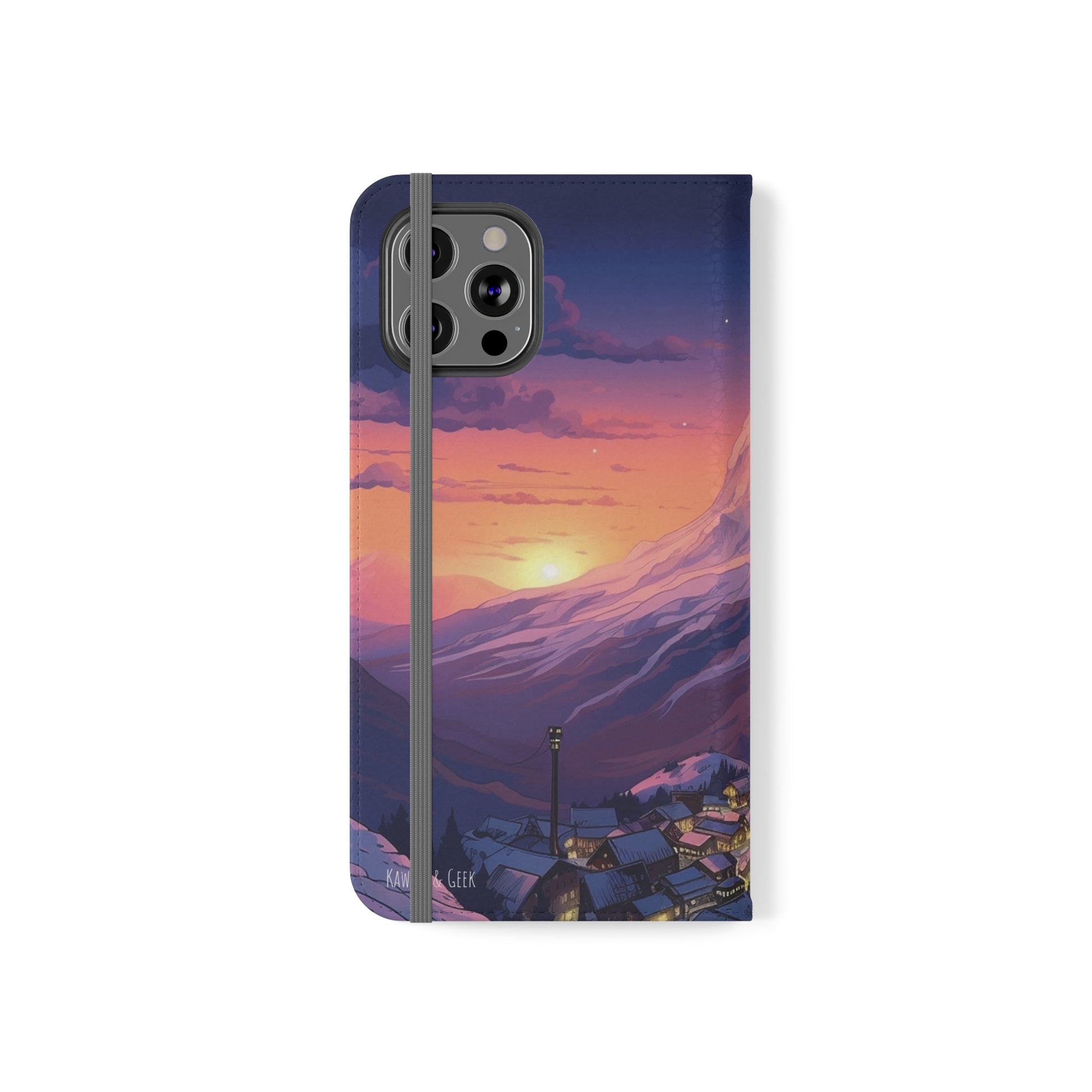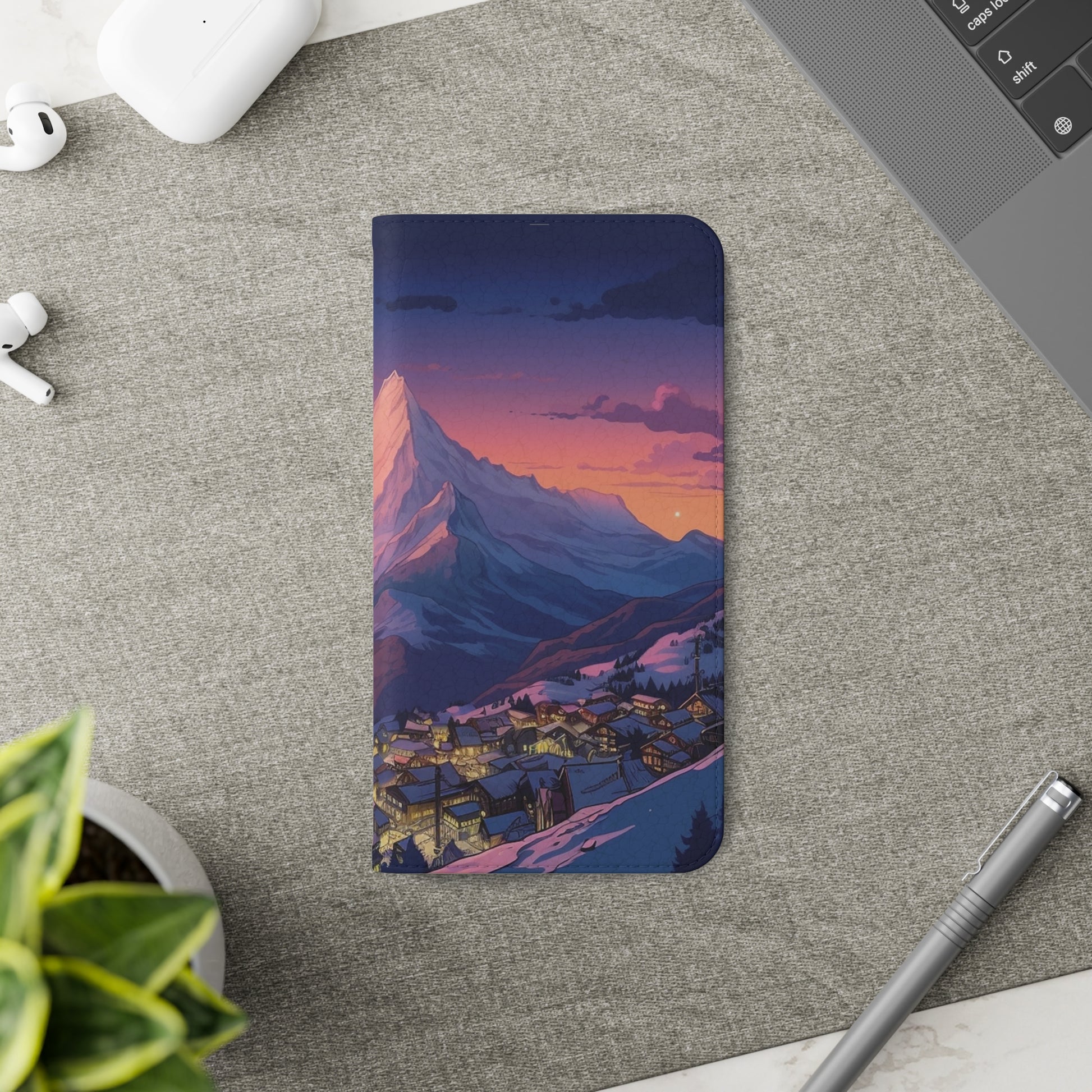 Snowy Mountain Landscape Sunset Flip Phone Case - Discover Serenity with a Charming Mountain Village