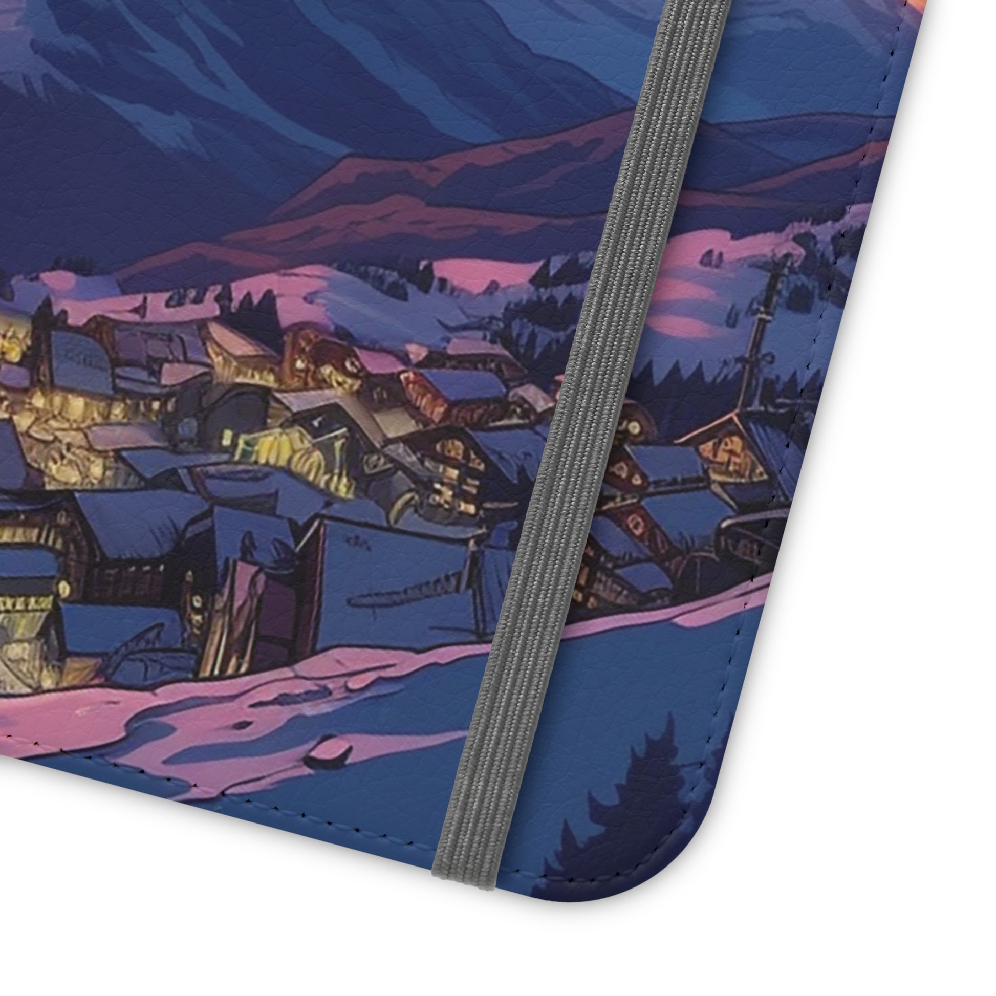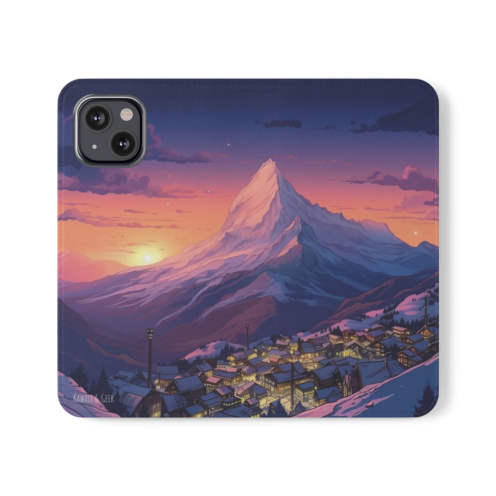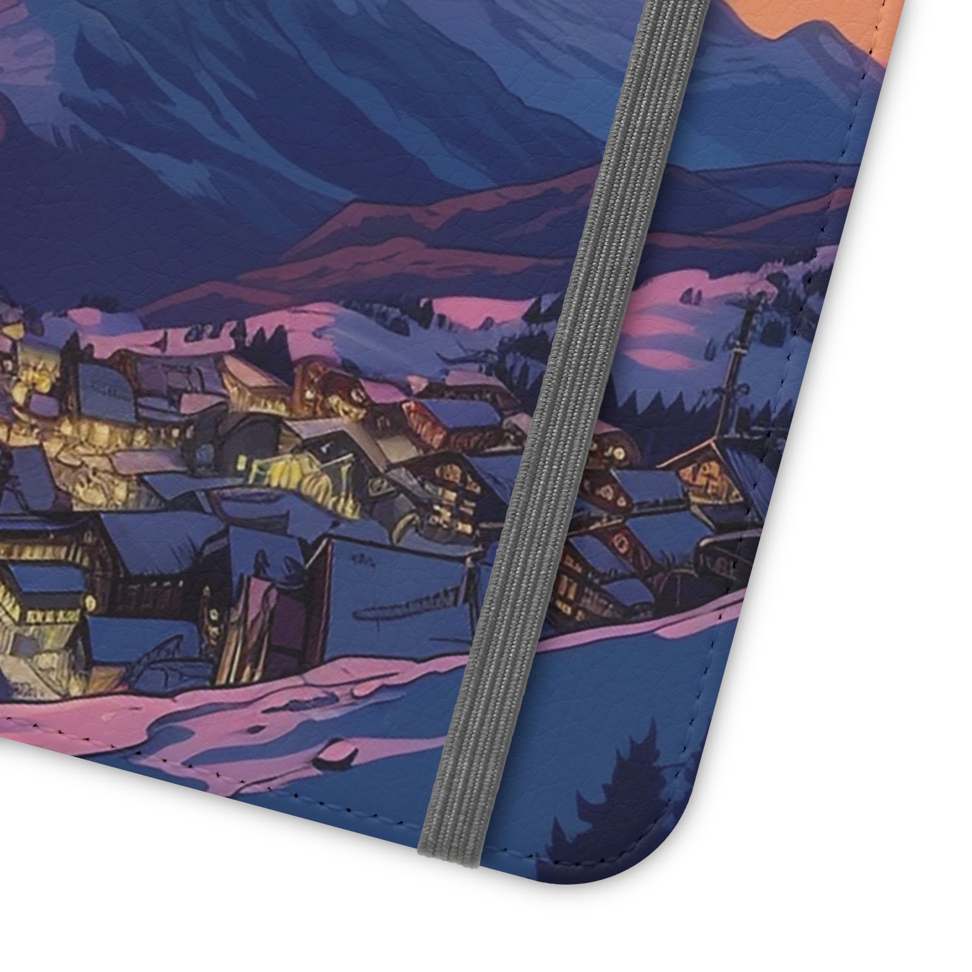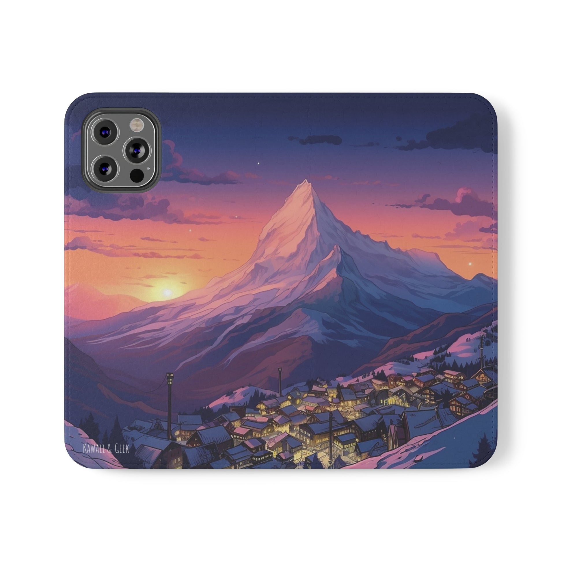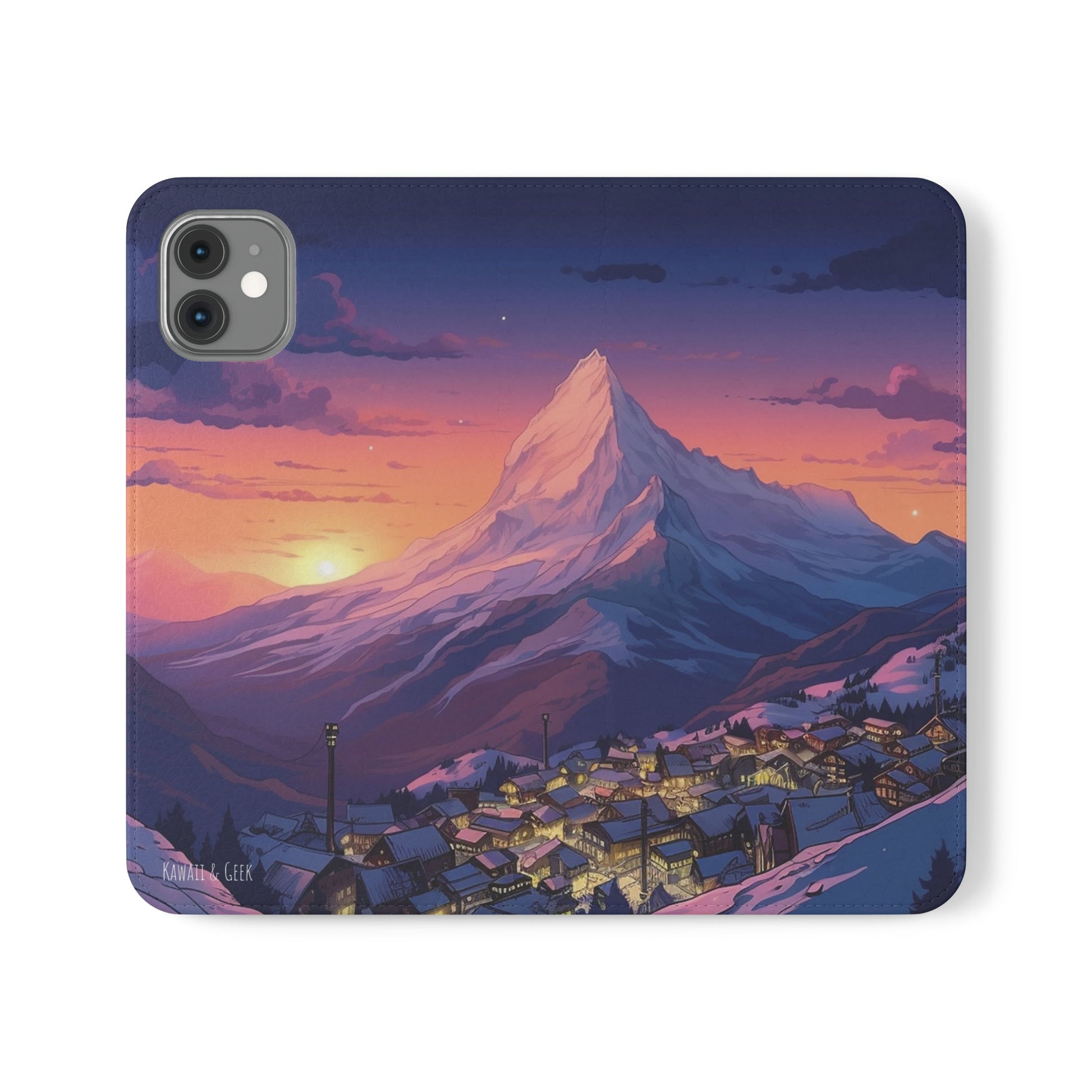 Snowy Mountain Landscape Sunset Flip Phone Case - Discover Serenity with a Charming Mountain Village