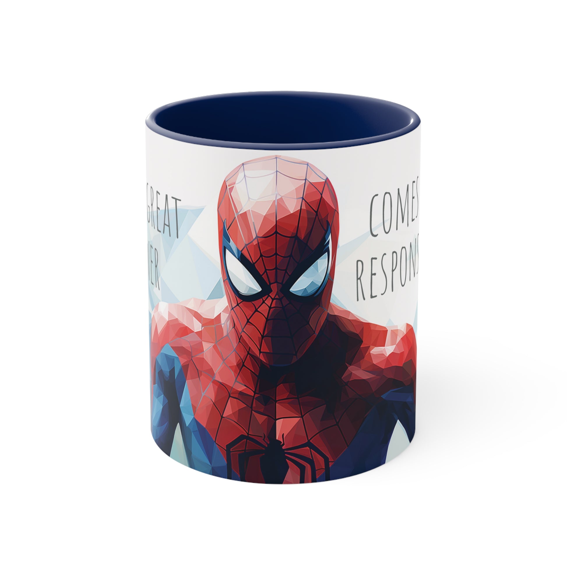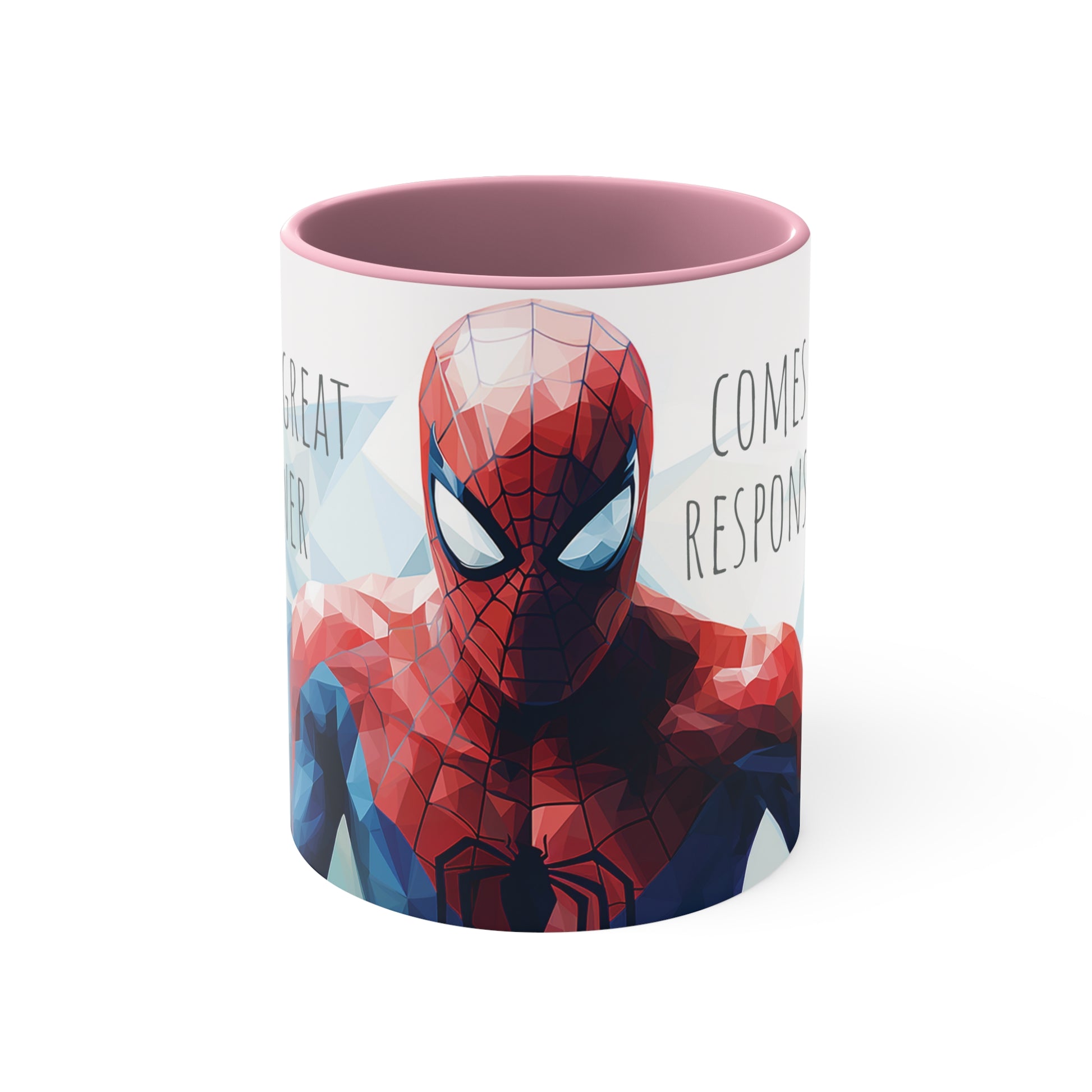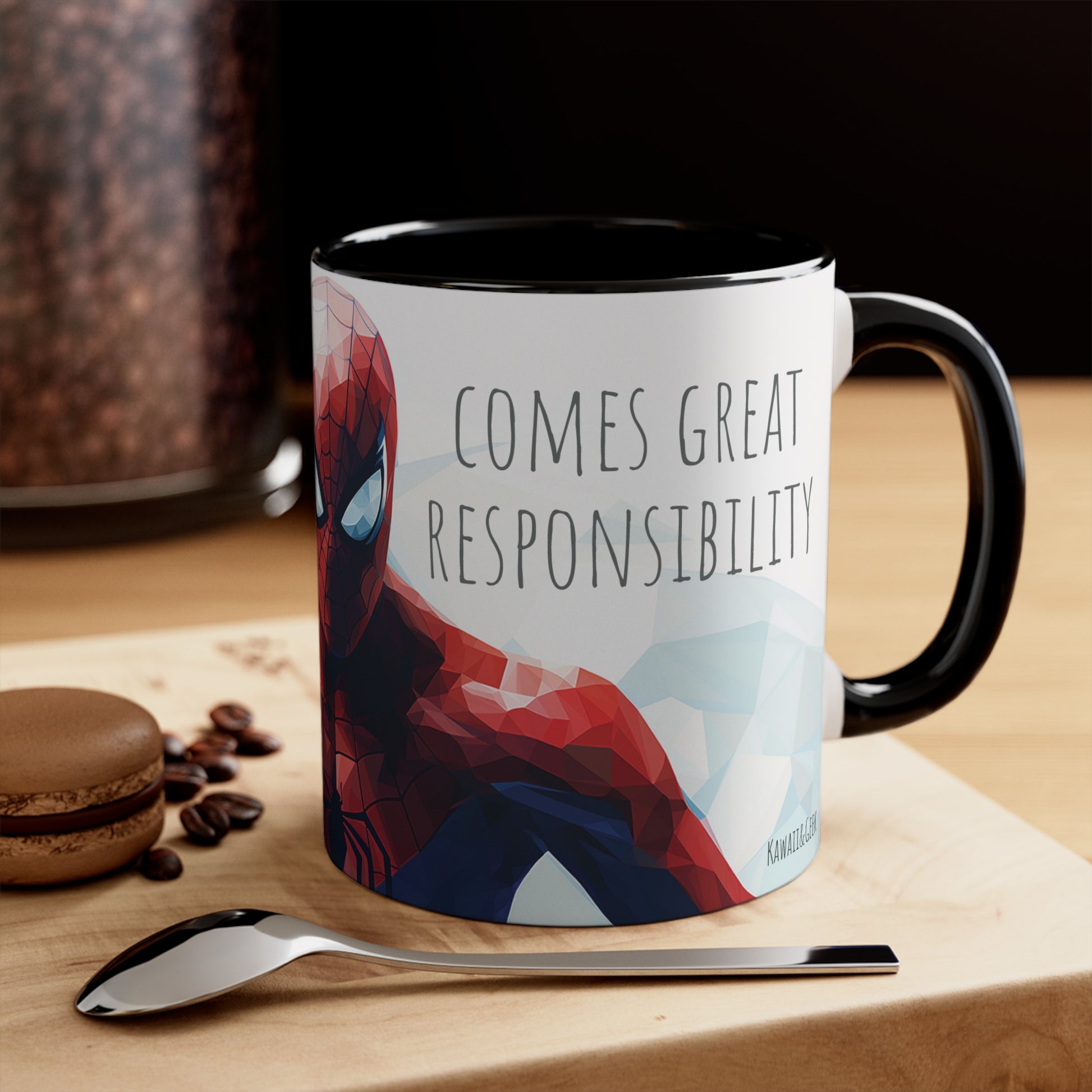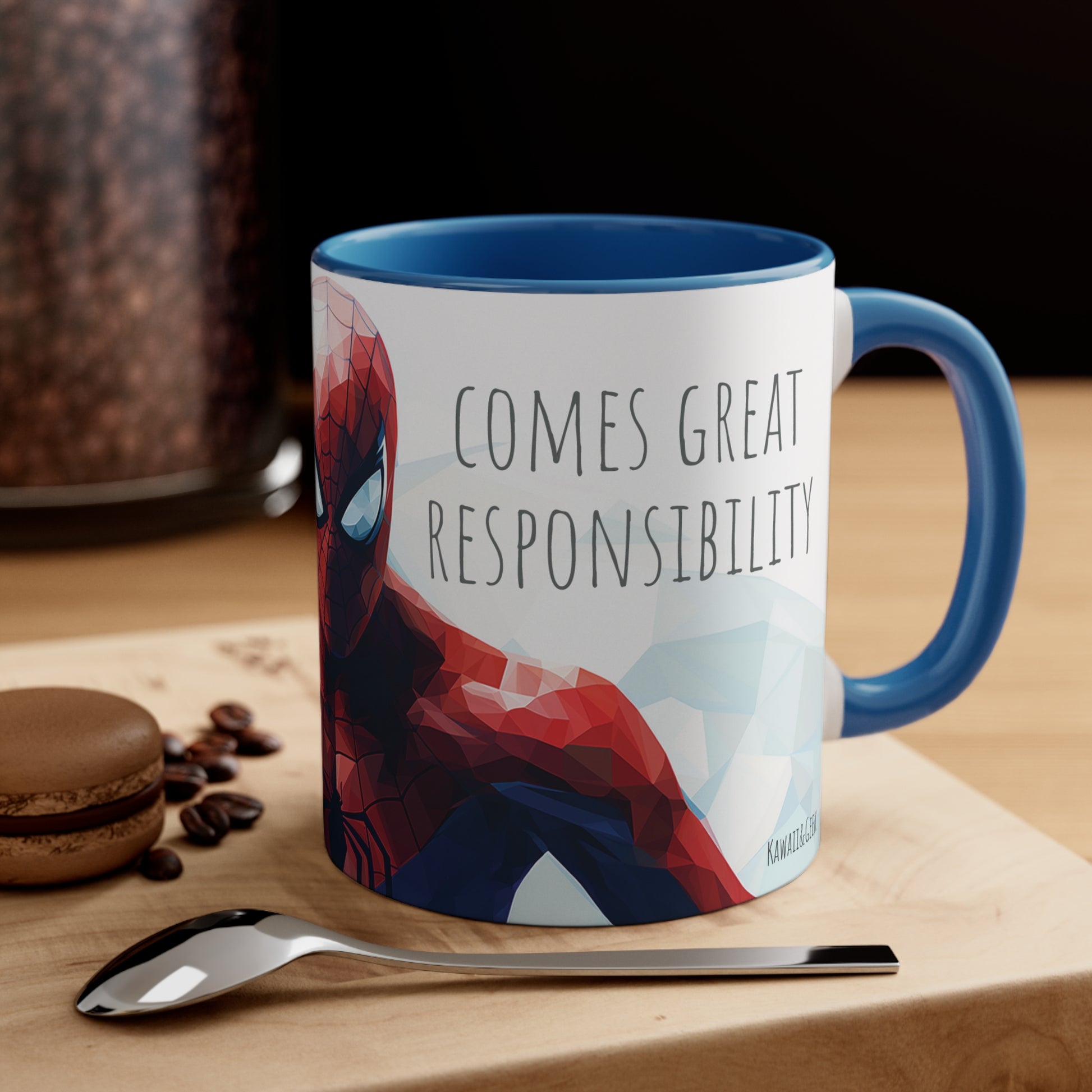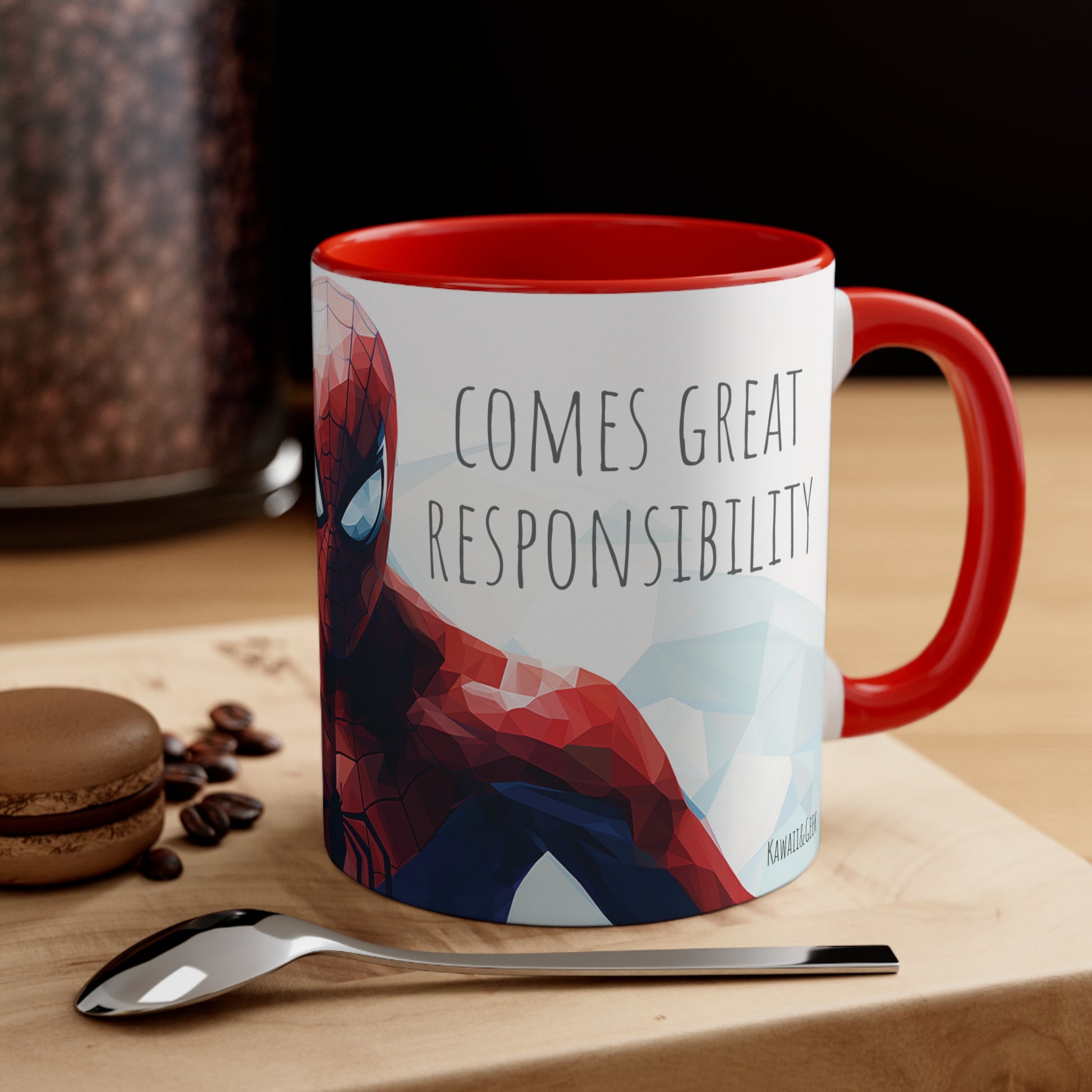 Keywords: Spider-Man mug, Geometric style, Bicolor design, Great power, Responsibility, Iconic words, Web-slinging superhero, Heroic values, Daily reminder, Make a difference, Favorite beverage, Unleash your inner hero, Coffee or tea, Drinkware collectible, Superhero vibes.