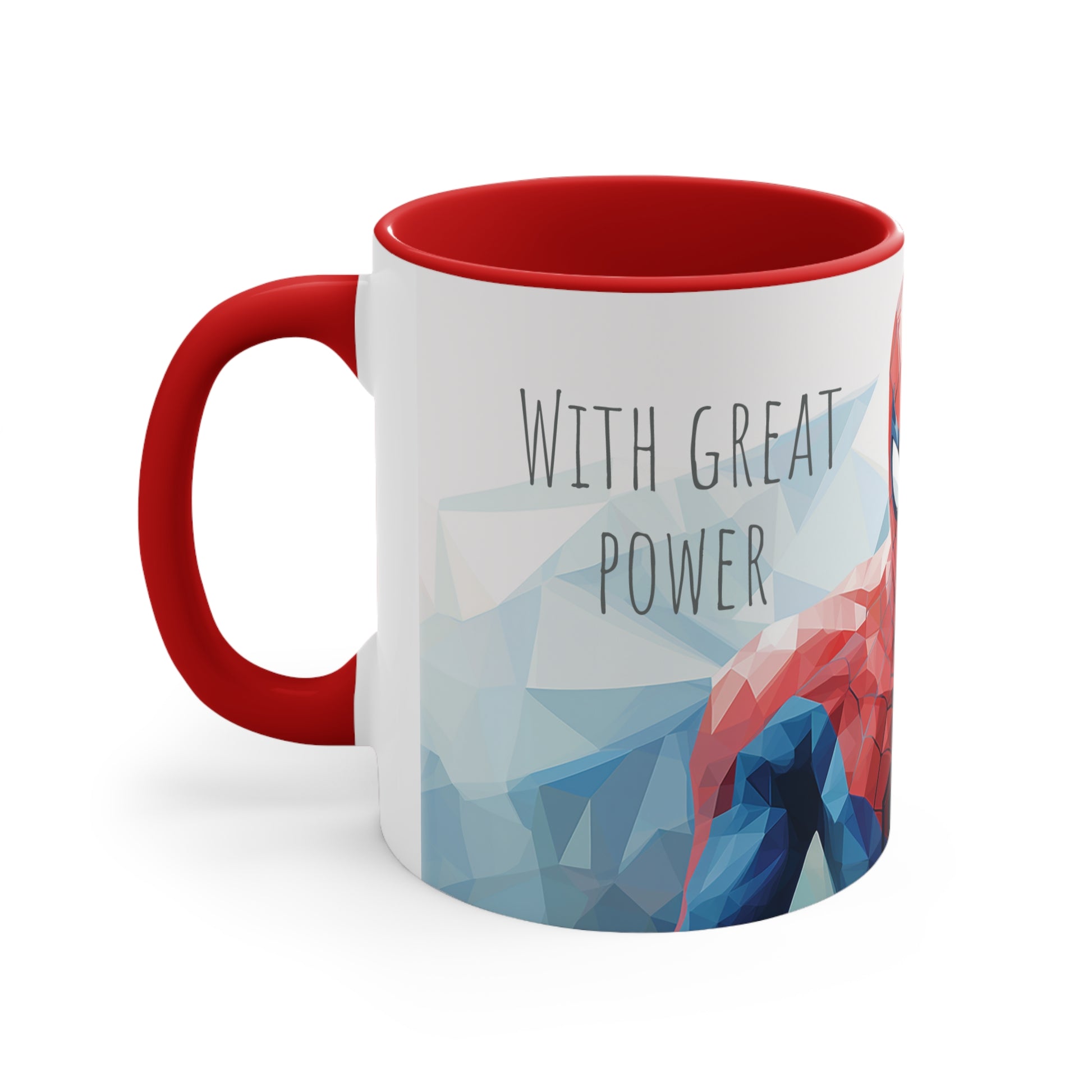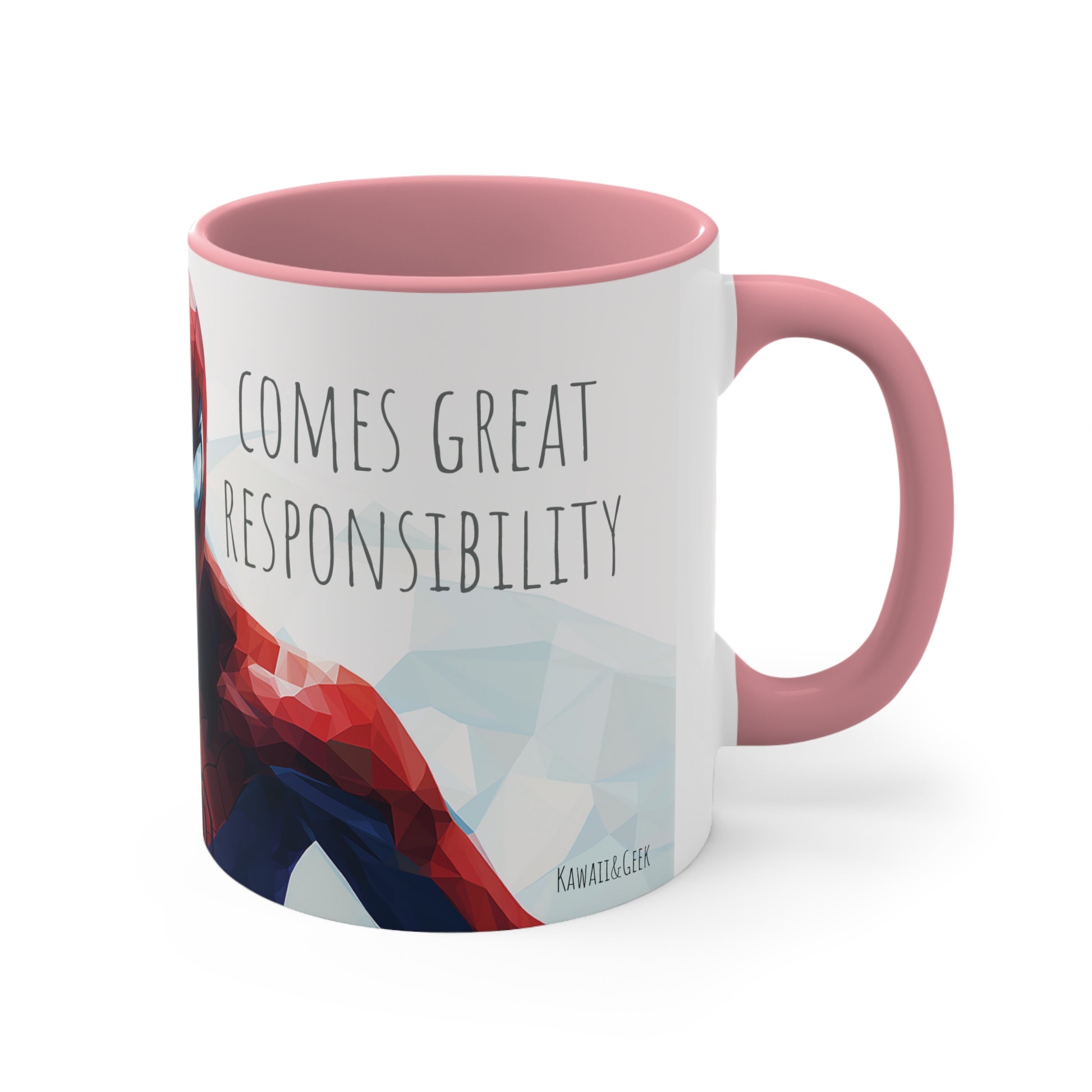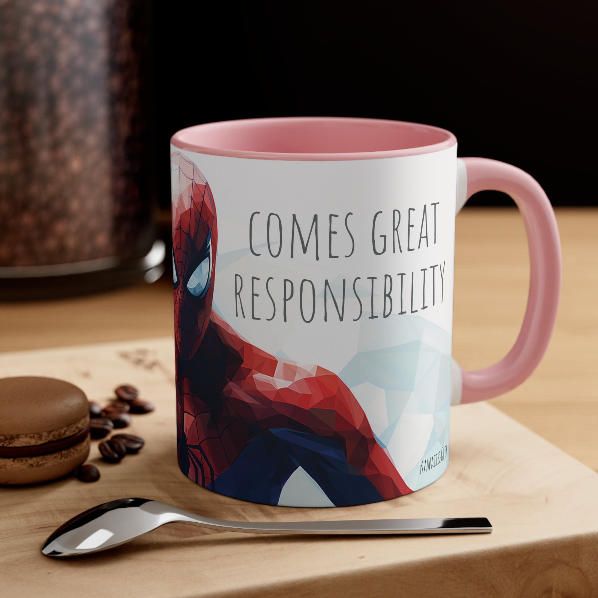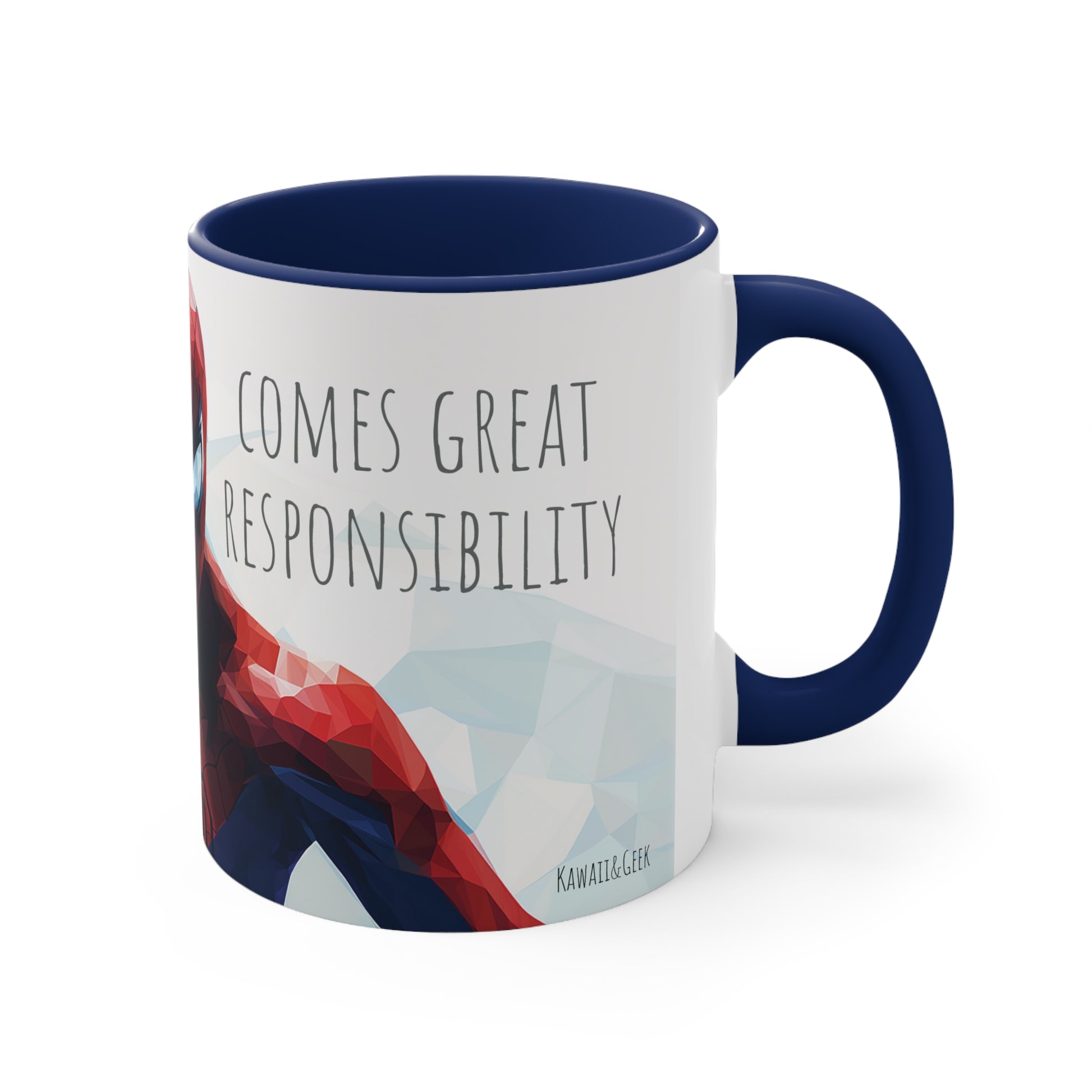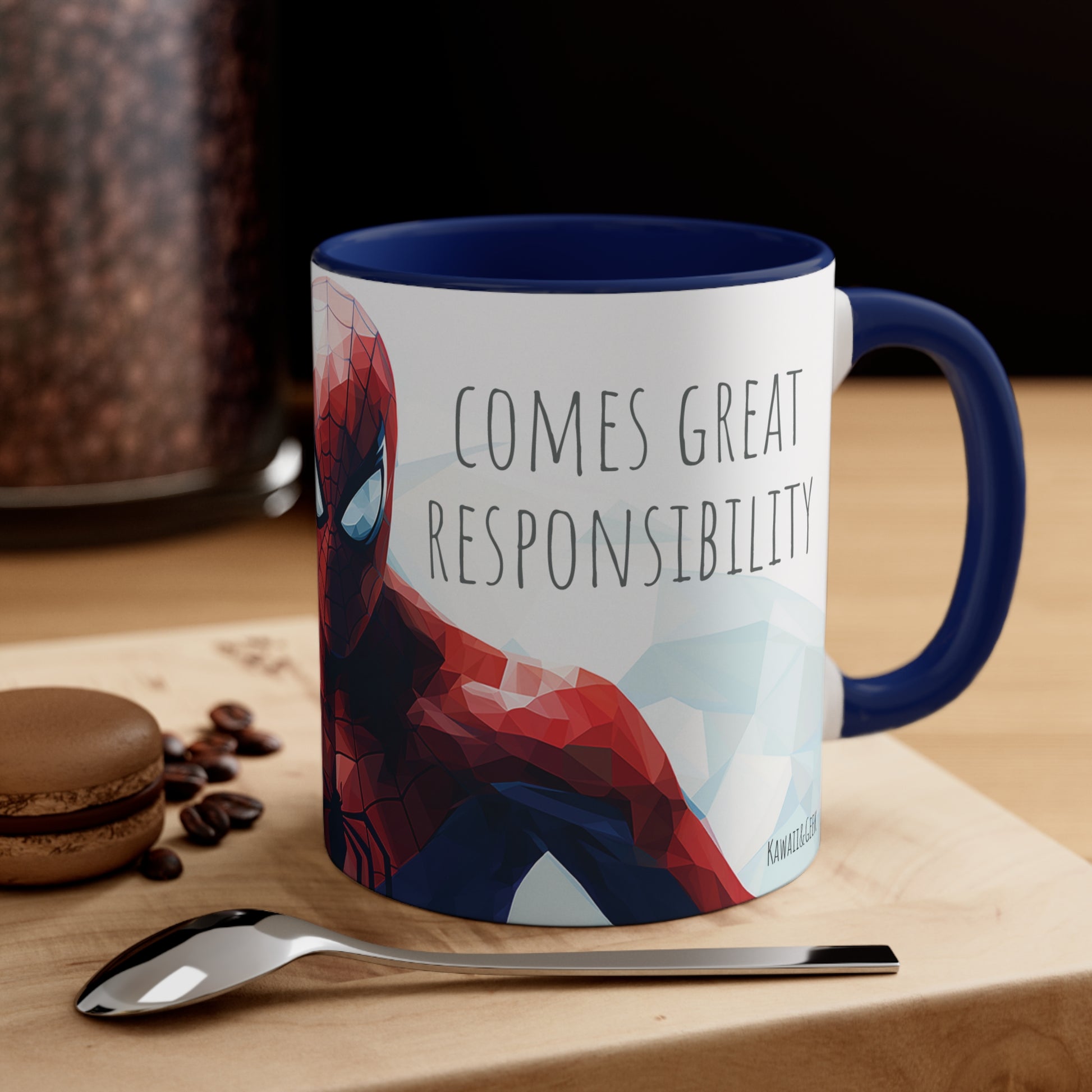 Keywords: Spider-Man mug, Geometric style, Bicolor design, Great power, Responsibility, Iconic words, Web-slinging superhero, Heroic values, Daily reminder, Make a difference, Favorite beverage, Unleash your inner hero, Coffee or tea, Drinkware collectible, Superhero vibes.