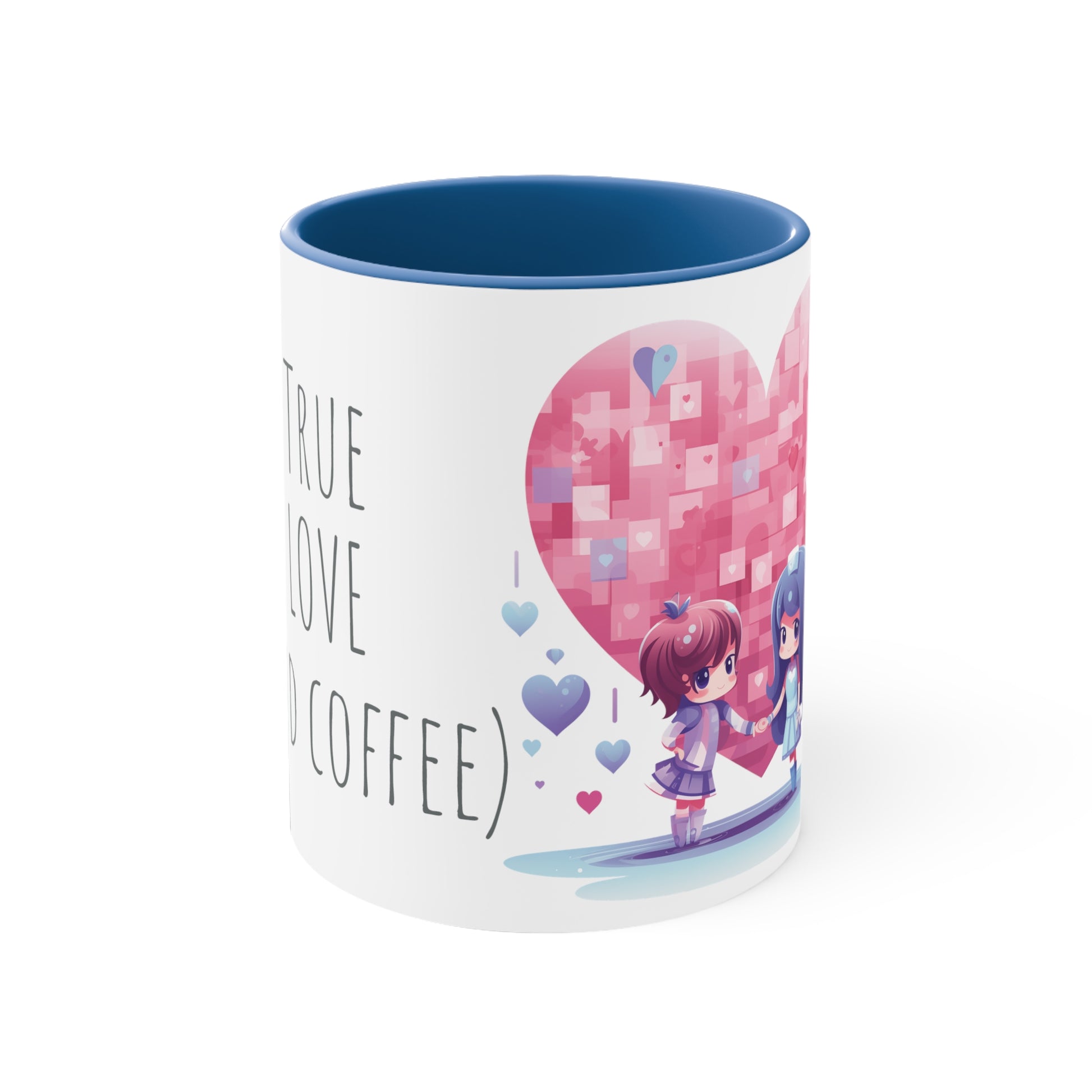 Start your day with a heartwarming sip from our 'True Love & Coffee' bicolor mug. This charming 11 oz mug features a delightful illustration of a kawaii girls couple standing before a giant pixel heart, capturing the essence of true love in a playful, digital art style. The phrase 'True Love (and Coffee)' adds a whimsical touch, perfect for those who cherish both their relationships and their caffeine. Made from high-quality materials, this mug is both durable and delightful, ensuring your beverages are enjoyed in style. The vibrant, kawaii-themed design is a joy to behold, bringing a splash of color and affection to your daily routine. Ideal for gifting to your special someone or adding a cute touch to your own mug collection, it's a celebration of love, friendship, and good coffee.