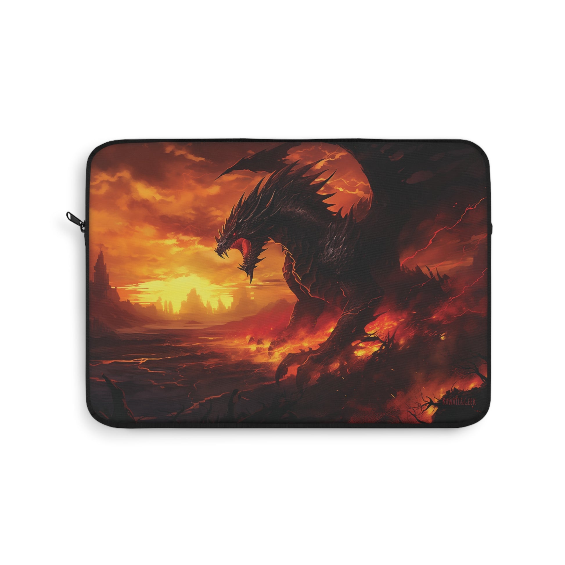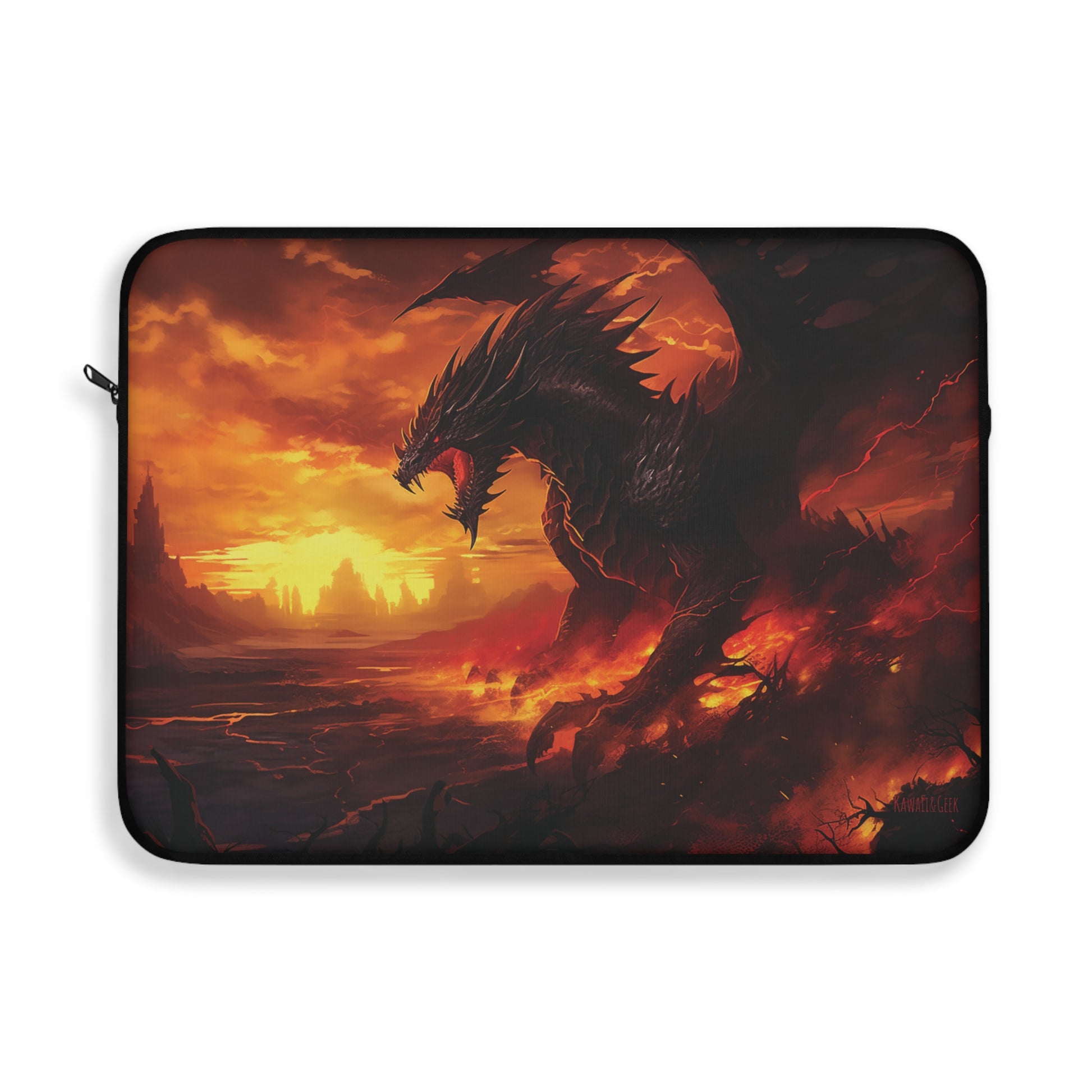 Keywords: Gigantic fire dragon, Laptop sleeve, Fantasy artwork, Maximum protection, Durable materials, Snug fit, Water-resistant, Captivating design, Safeguard device, Sleek accessory, Fearless power, Kingdom's threat, Digital conquest, Fearsome dragon.